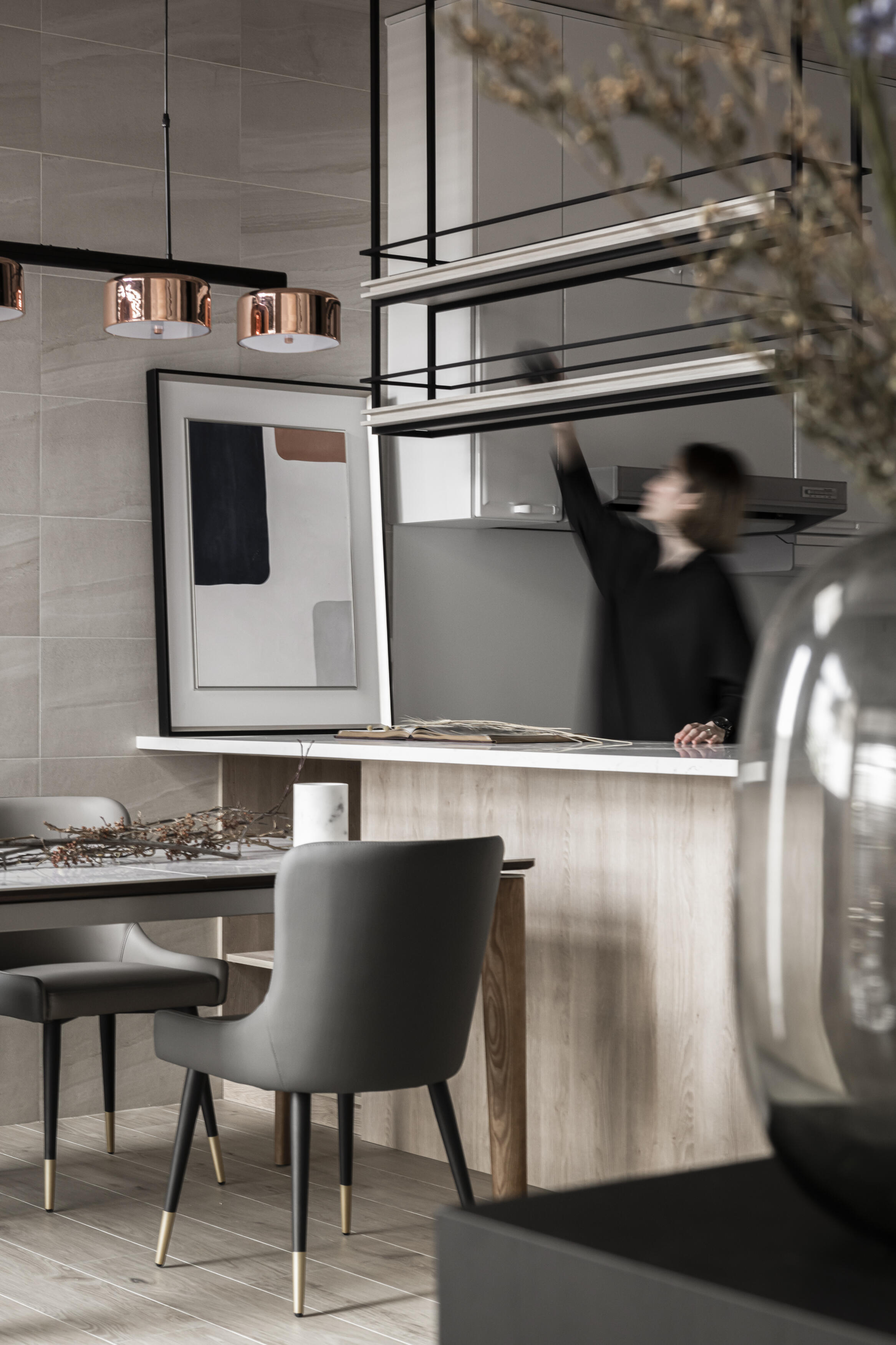 設計師透過石材、木質、鍍鈦金屬等多種異材質的巧妙運用,勾勒出層次分明的視覺效果。細膩的鍍鈦金屬收邊,不僅為空間增添了精緻感,更在簡約的線條中,點綴出低調的奢華。特別值得一提的是,石材的創意切割與燈光的精心佈置,不僅烘托出溫馨的居家氛圍,更賦予了空間獨特的生命力,讓每一道光影都成為設計的一部分。