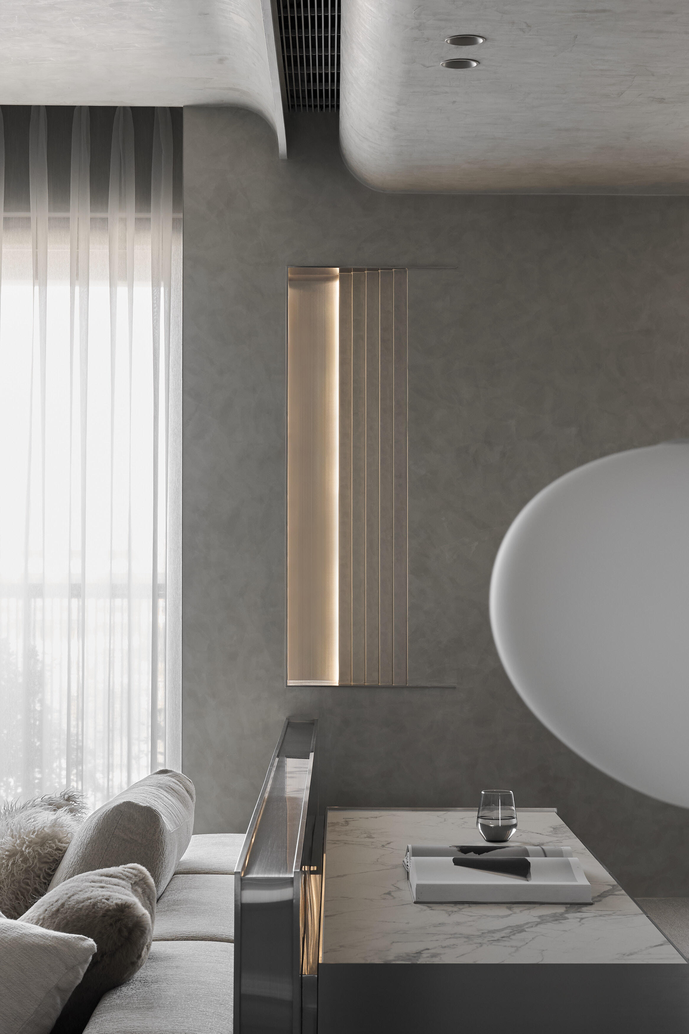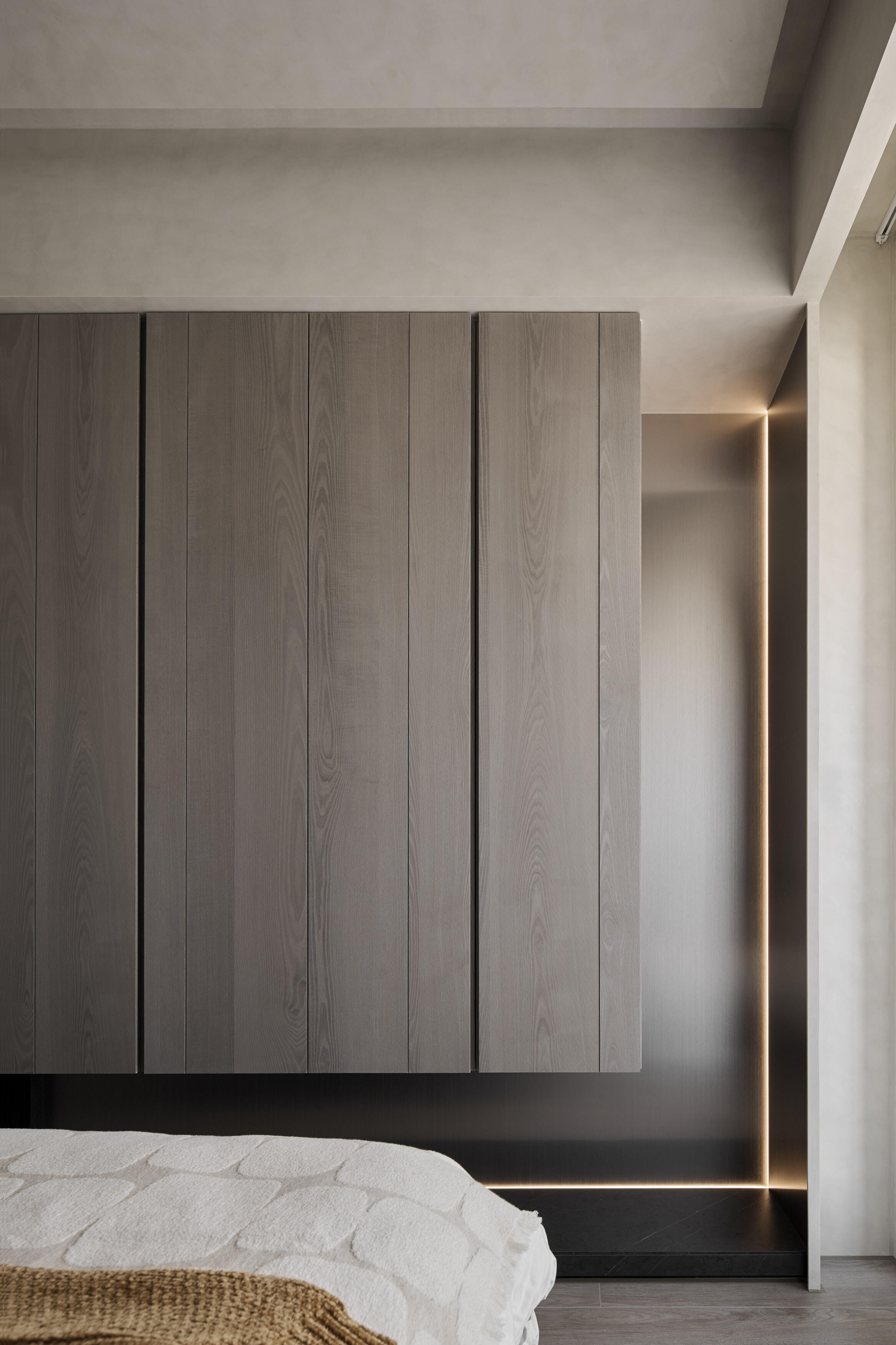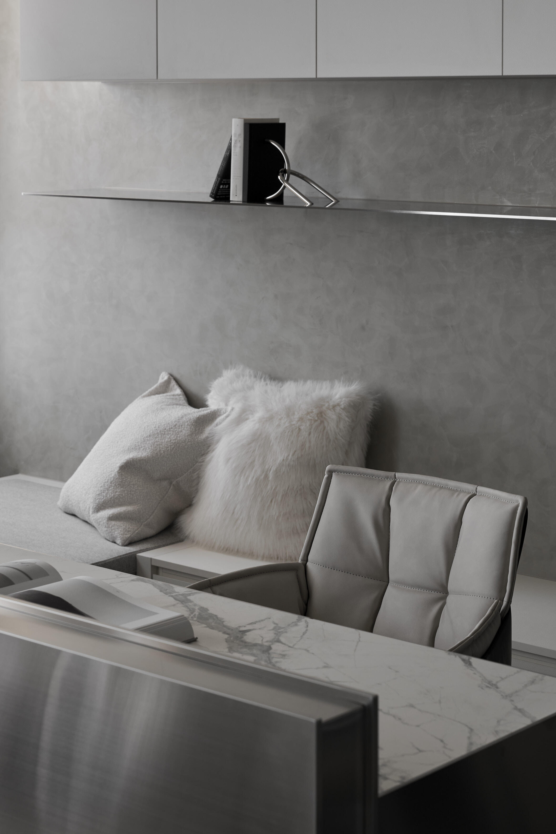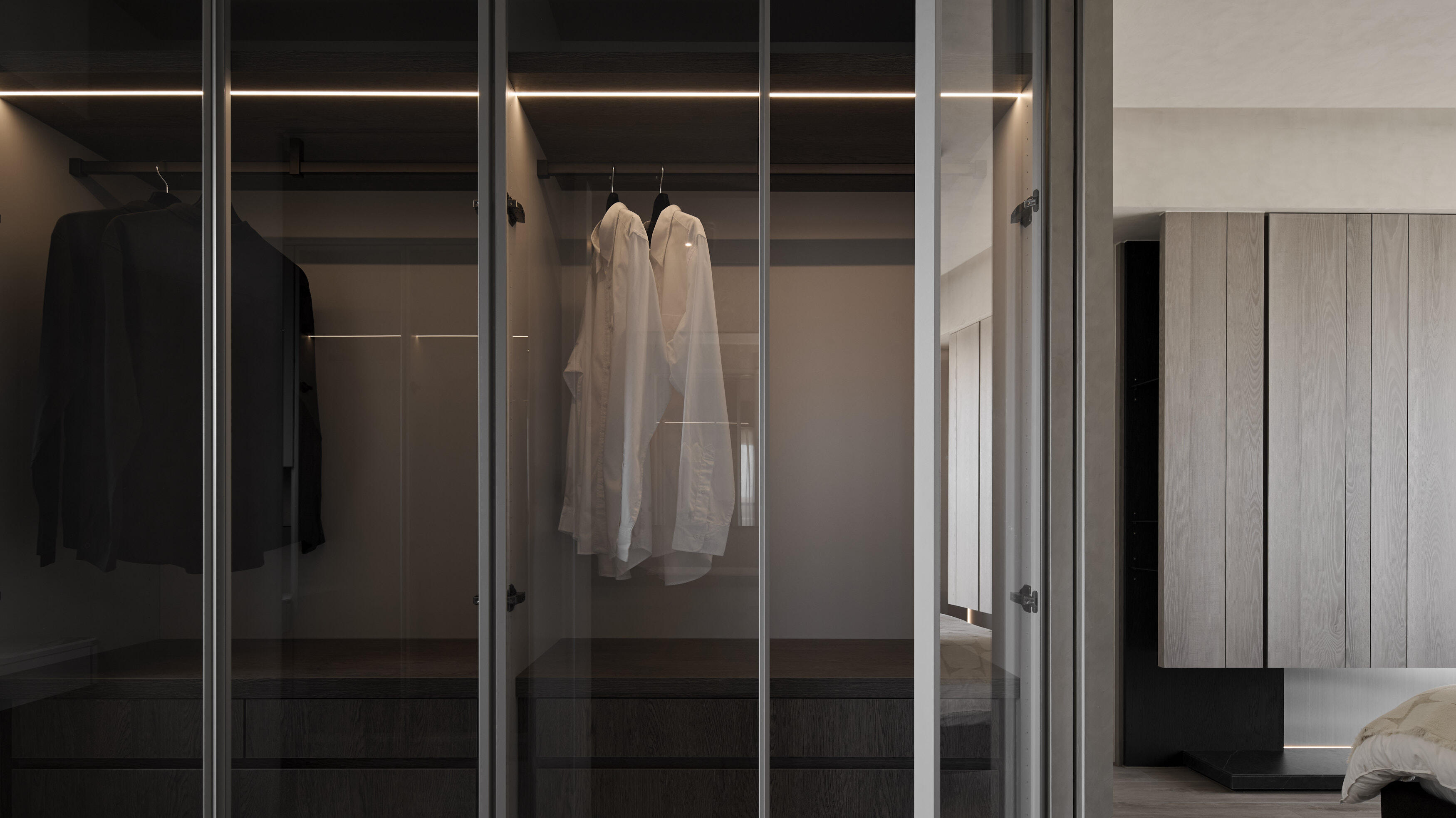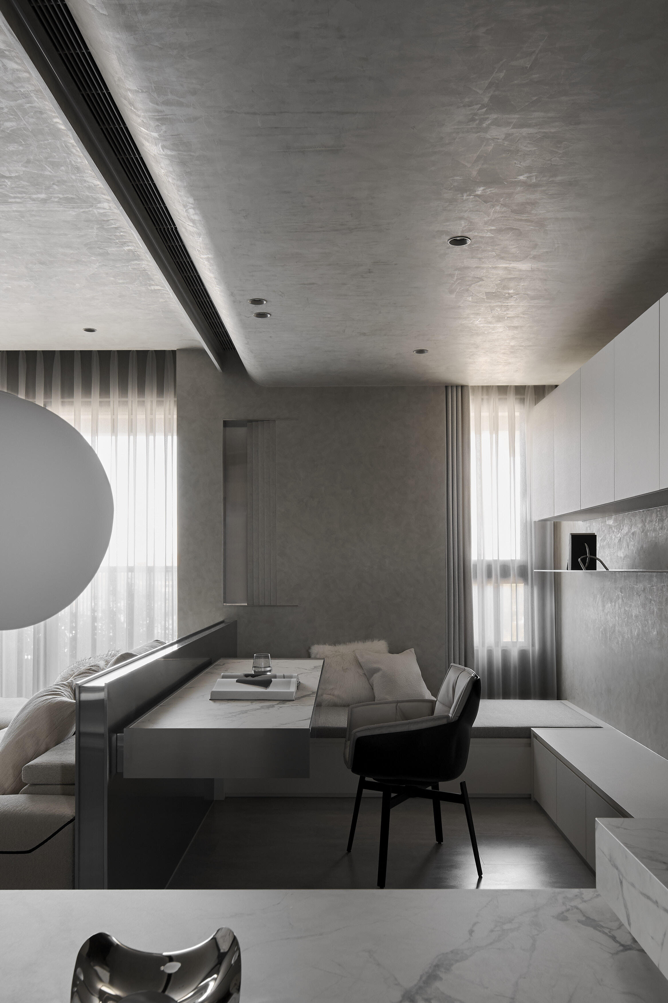 轉身步入書房,銀色鍍鈦金屬的冷冽光澤與俐落線條,不僅巧妙地界定出與公領域的界線,更為空間勾勒出洗練而沉穩的表情。書桌以鐵件懸浮支撐,輕盈的姿態彷彿漂浮於半空,減輕了量體的視覺負擔。而壁面透過立體切割,形塑出豐富的光影層次變化,間接光源的烘托,更為空間創造出深邃而引人入勝的景深。
