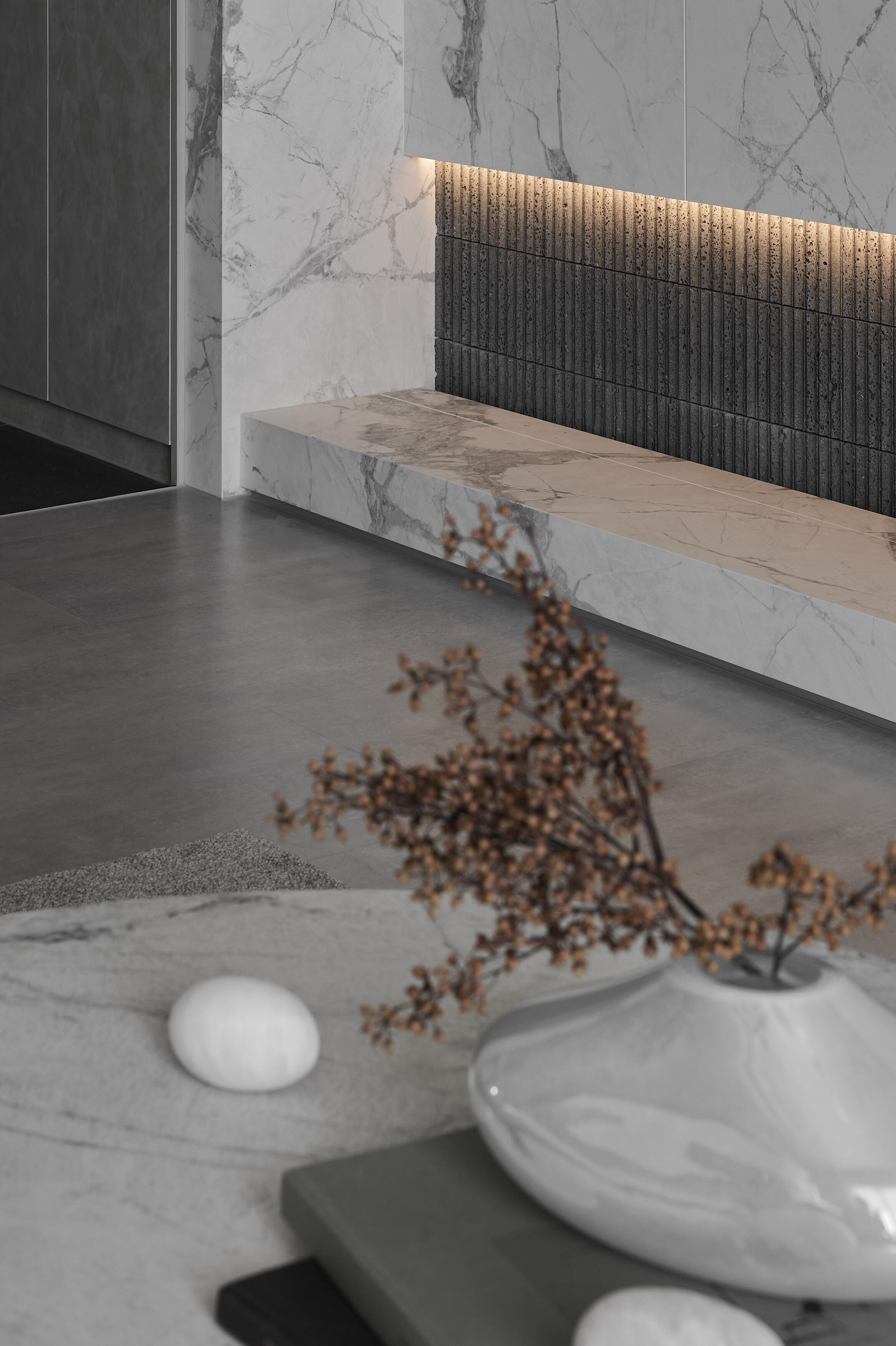 電視牆跳脫厚重印象,輕盈的白色薄板如同畫布般提亮了空間層次,上下再以帶有火山岩紋路的石條磚細膩點綴,錯落有致的排列,輕巧地展現出豐盈且富有趣味的視覺效果,每一寸細節都訴說著不凡的品味。