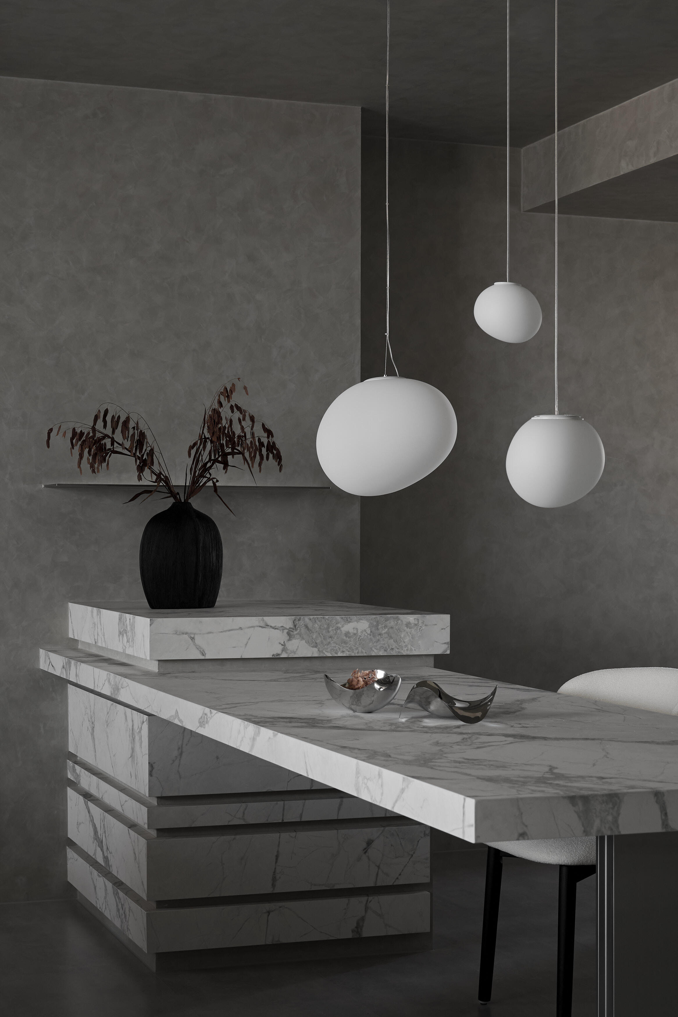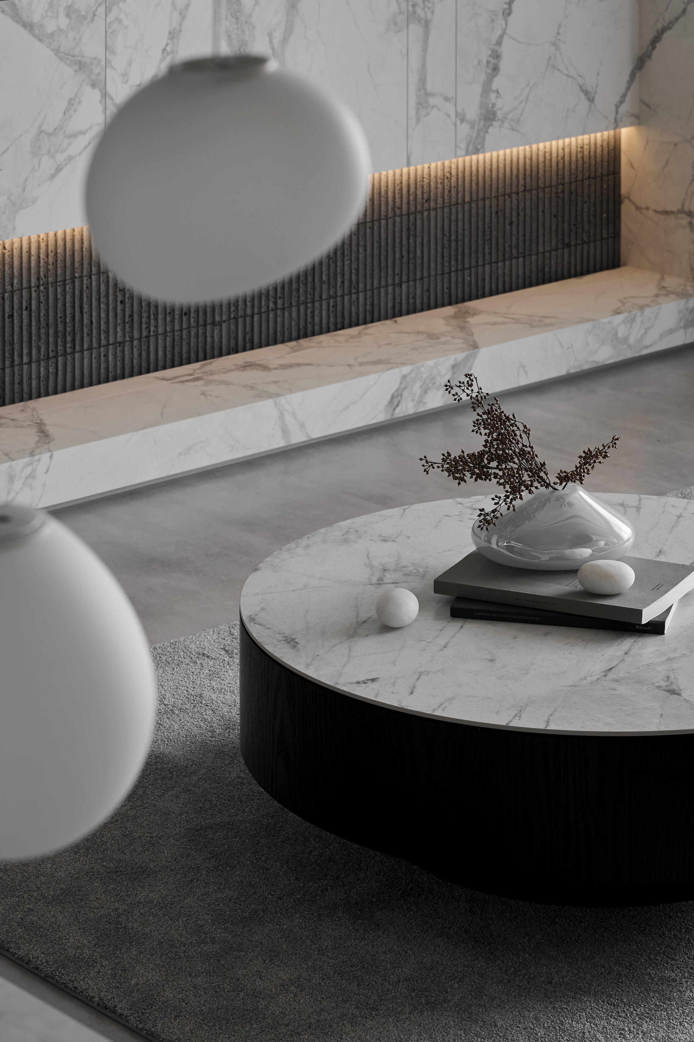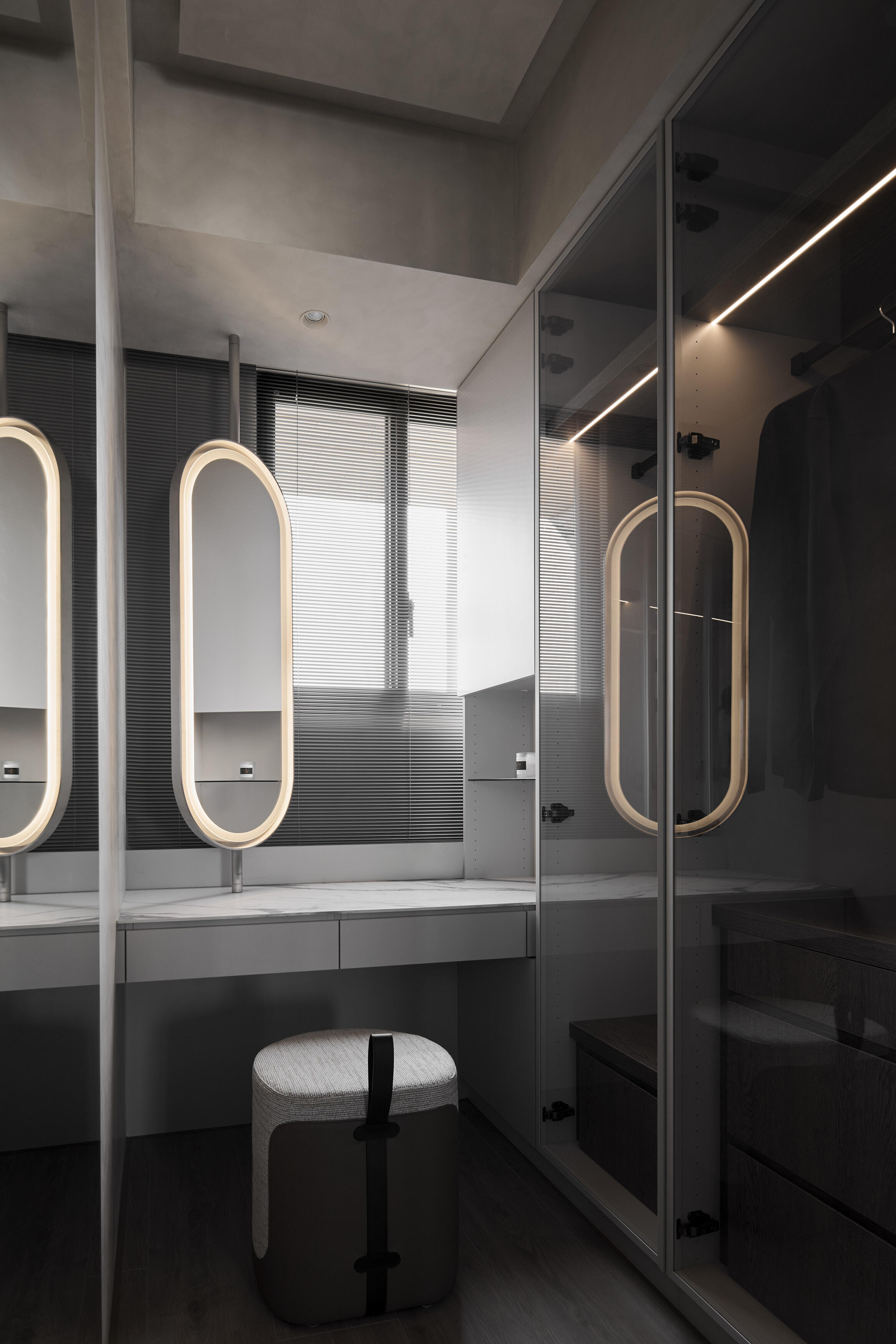 餐廳區域延續了公領域的設計語彙,中島以不同量體層層堆砌而成,呈現出輕巧而不沉悶的藝術姿態。不規則的圓形燈具在空中錯落有致地展開,它們不僅提供照明功能,更是空間裡跳躍的音符,巧妙地為沉穩的灰色基底注入活潑的律動感。透過設計的巧思,讓空間擁有了呼吸。