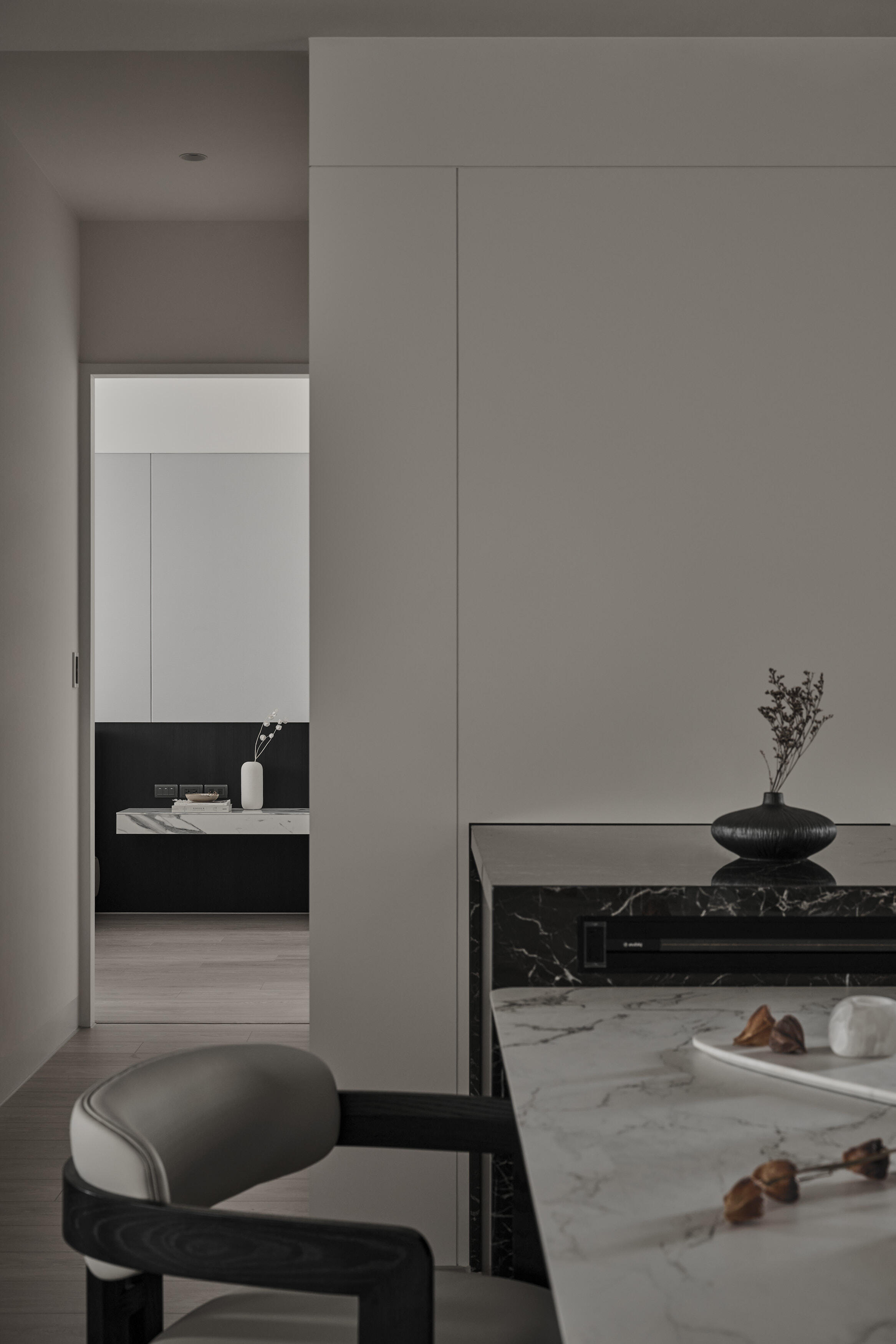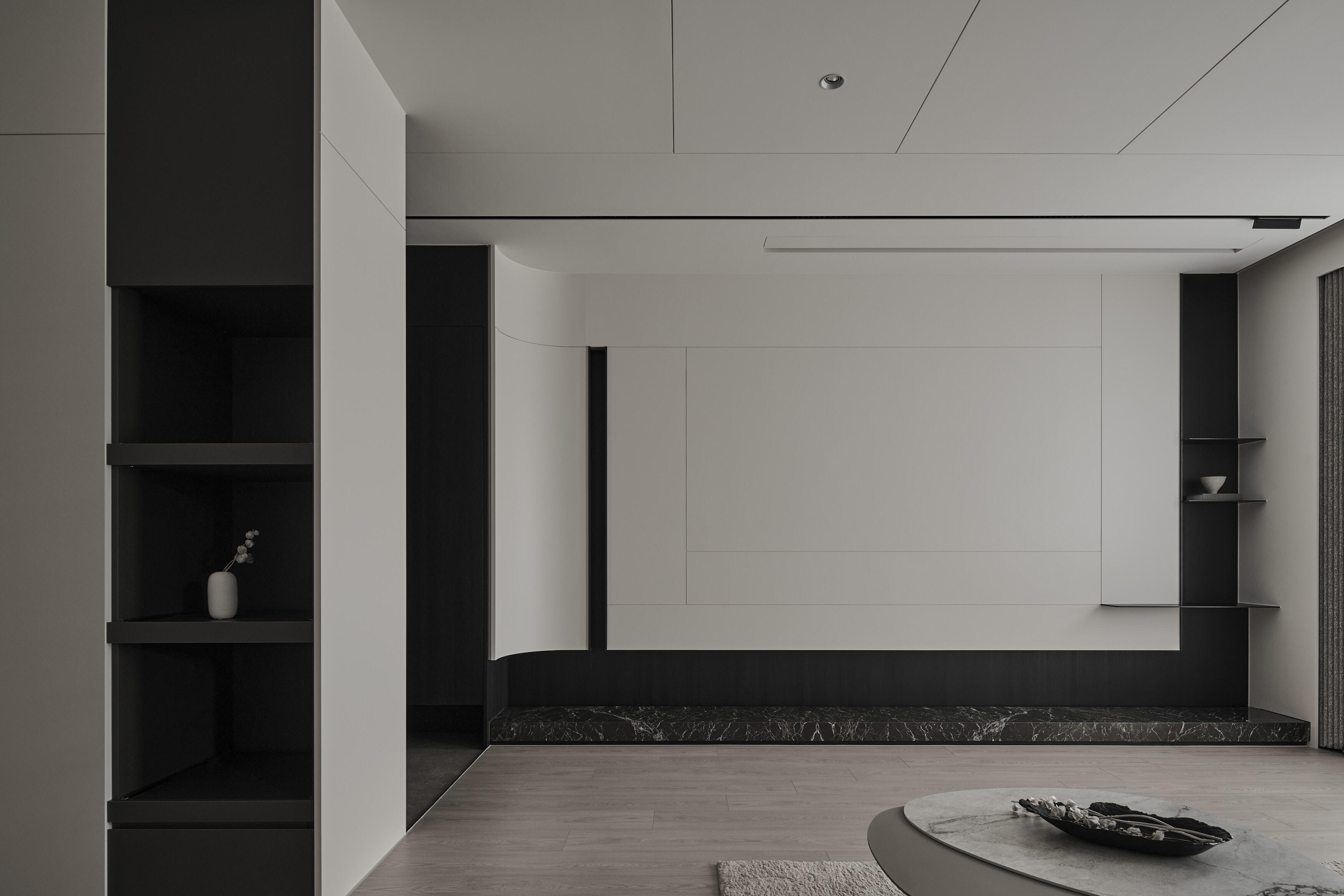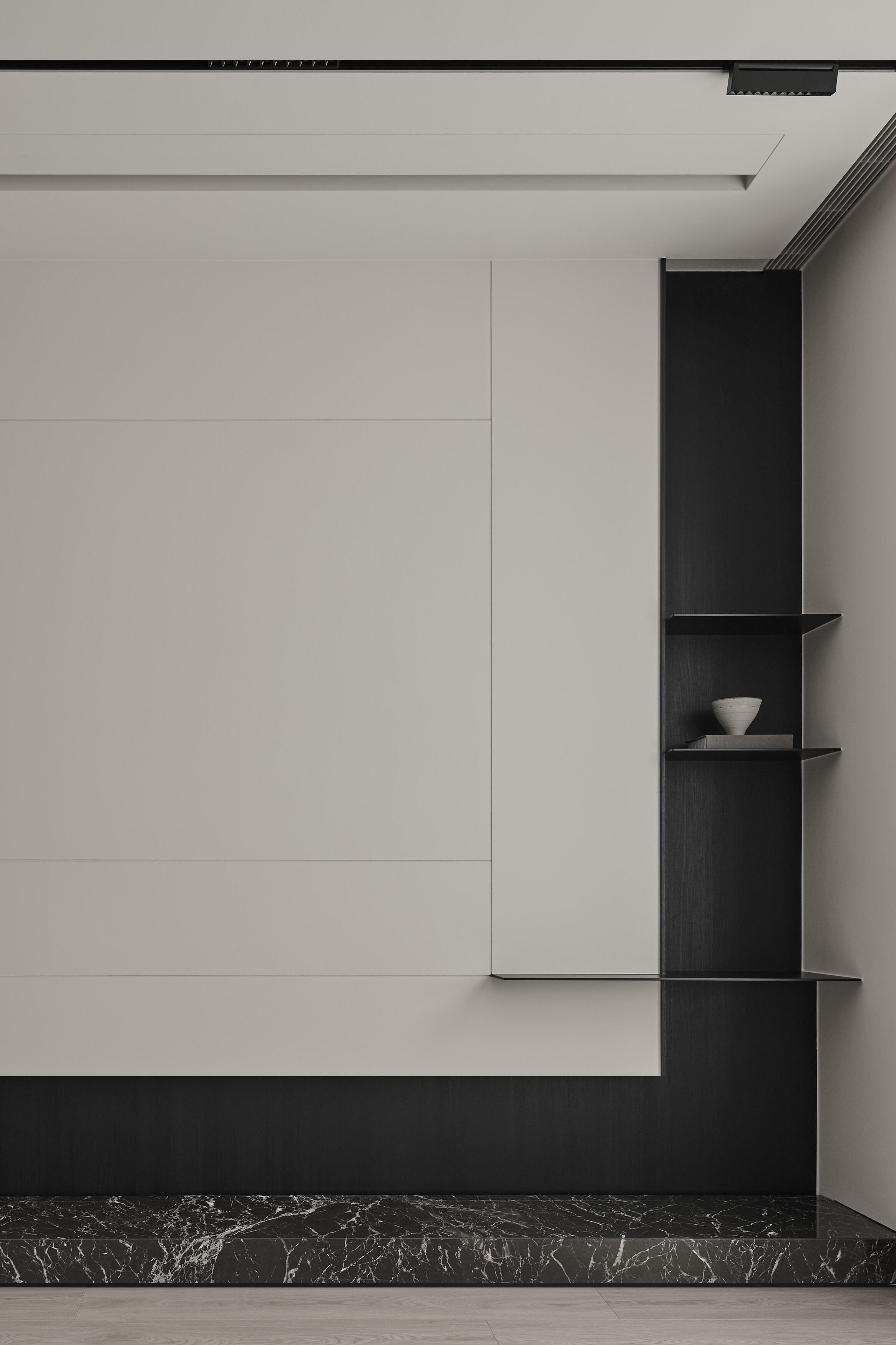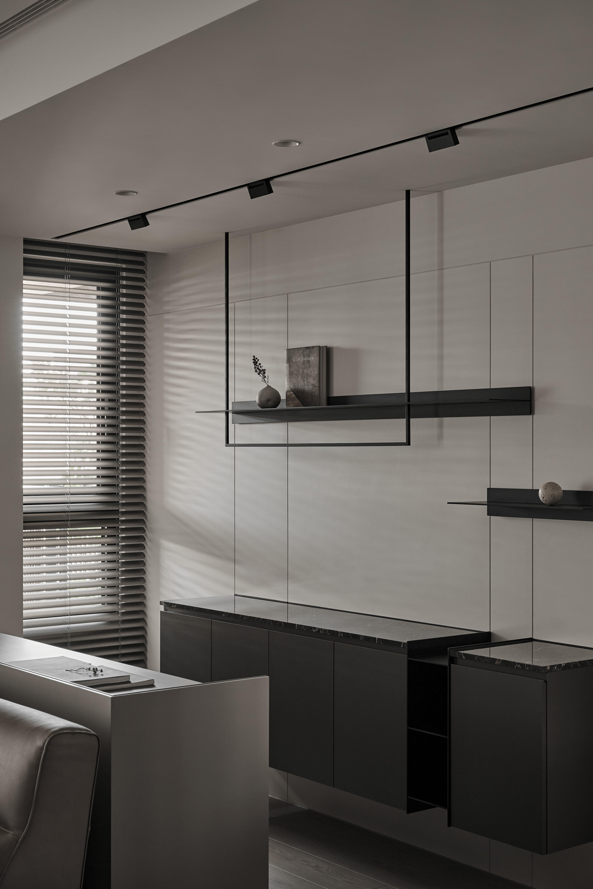空間的秩序由線性語彙串聯,自玄關向內延展,透過等高比例的分割邏輯,將櫃體、立面與機能整合於同一脈絡之中,使整體視覺維持一致而克制的節奏。細節隱於線條之間,讓空間在留白與尺度的拿捏中呈現沉靜而均衡的狀態。懸浮櫃體與鐵件層板的配置,進一步削弱量體的厚重感,使實體與虛空交錯並置,讓留白不僅是視覺上的空隙,也成為構築空間層次的重要語彙。