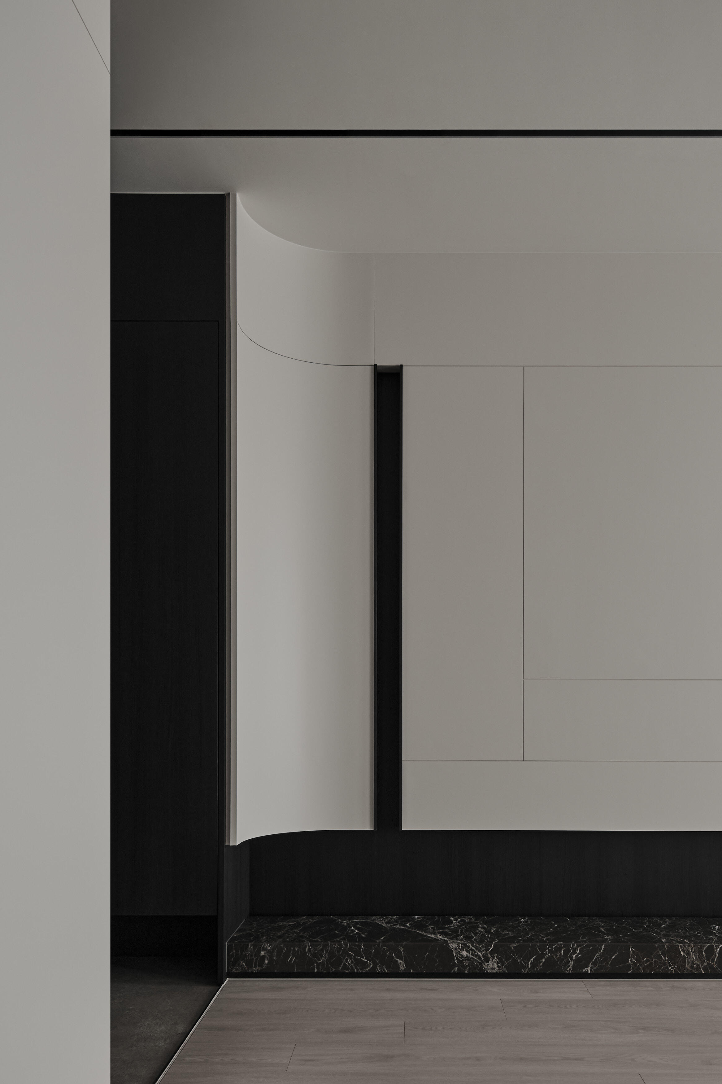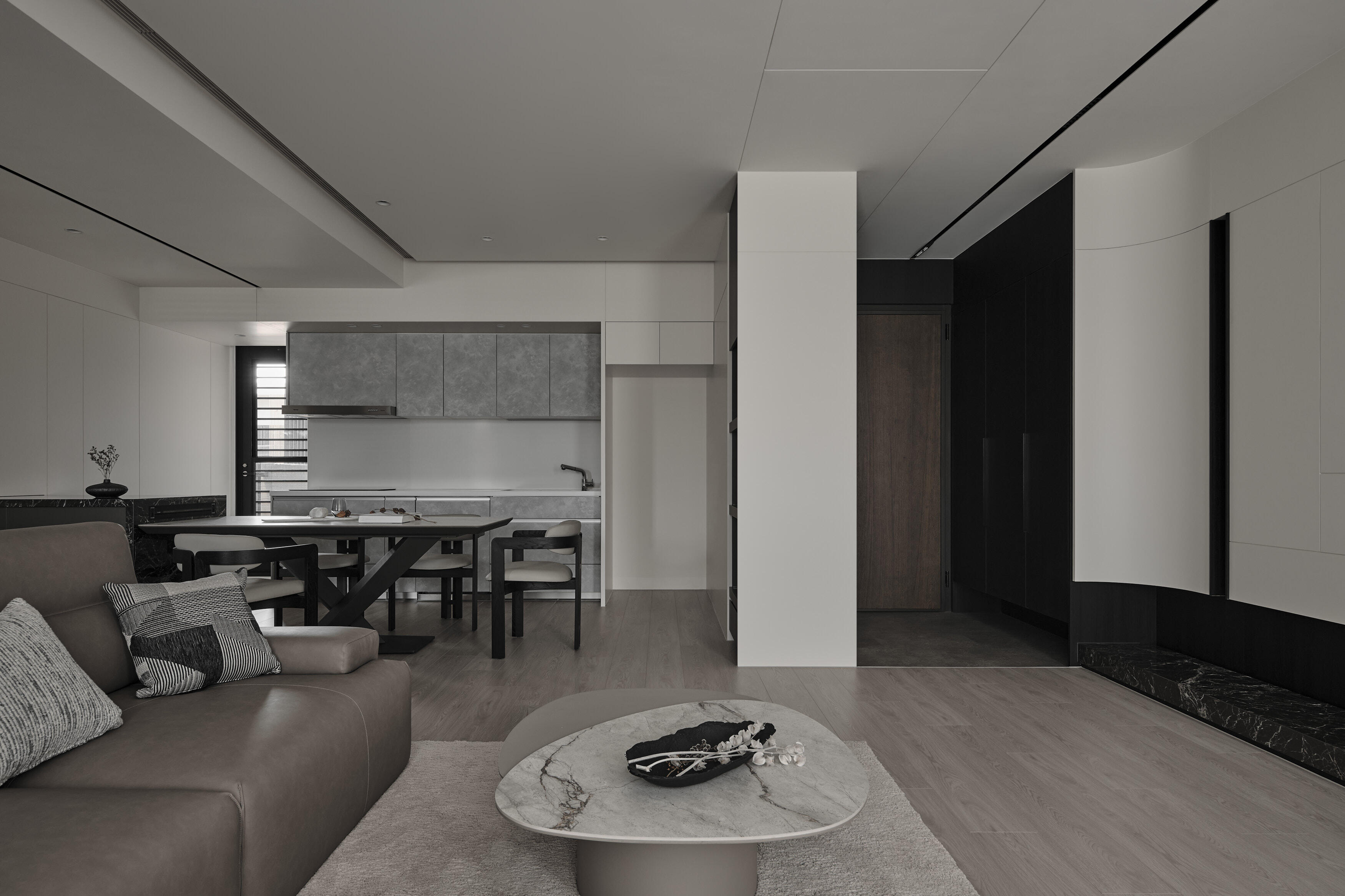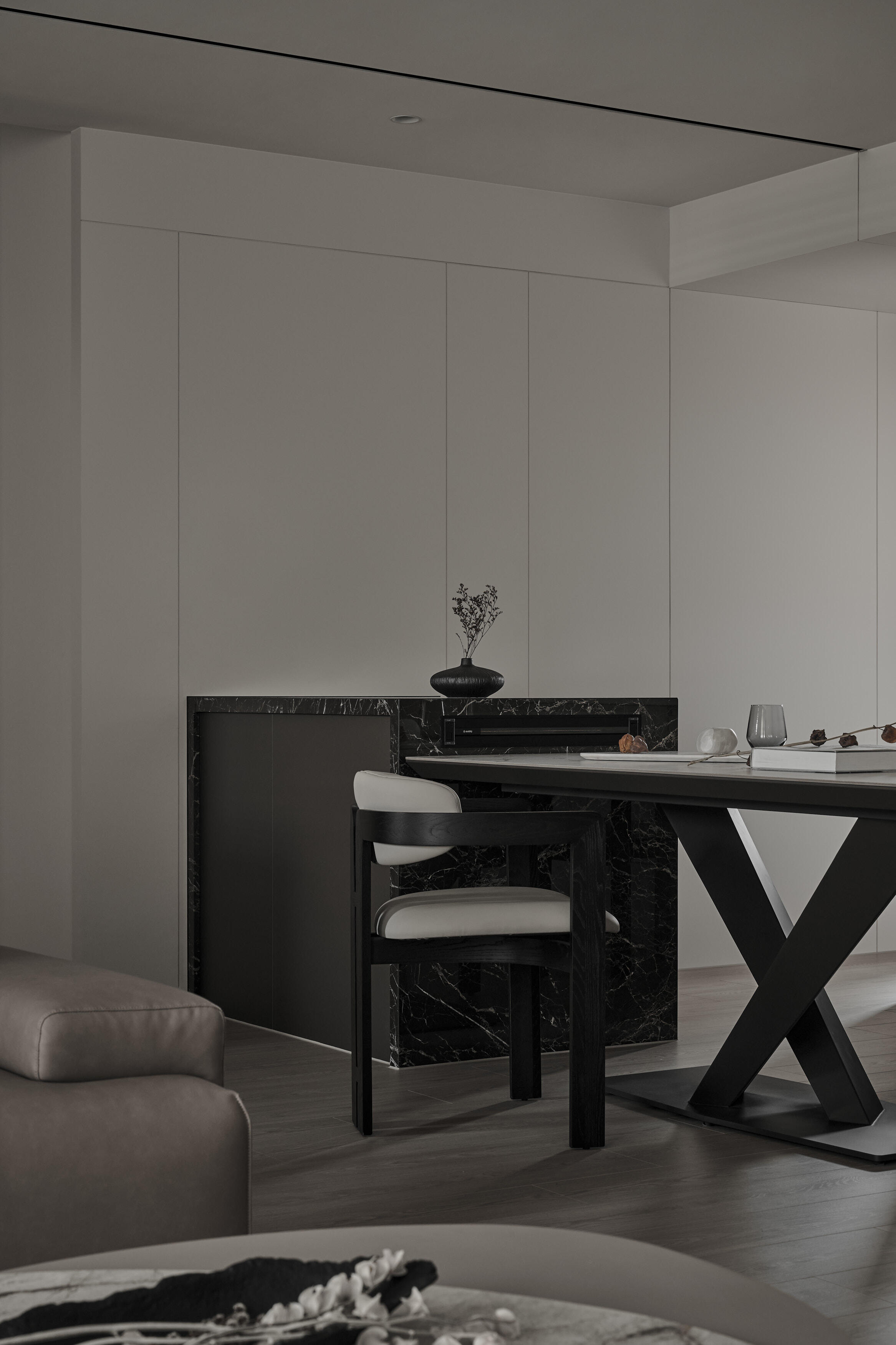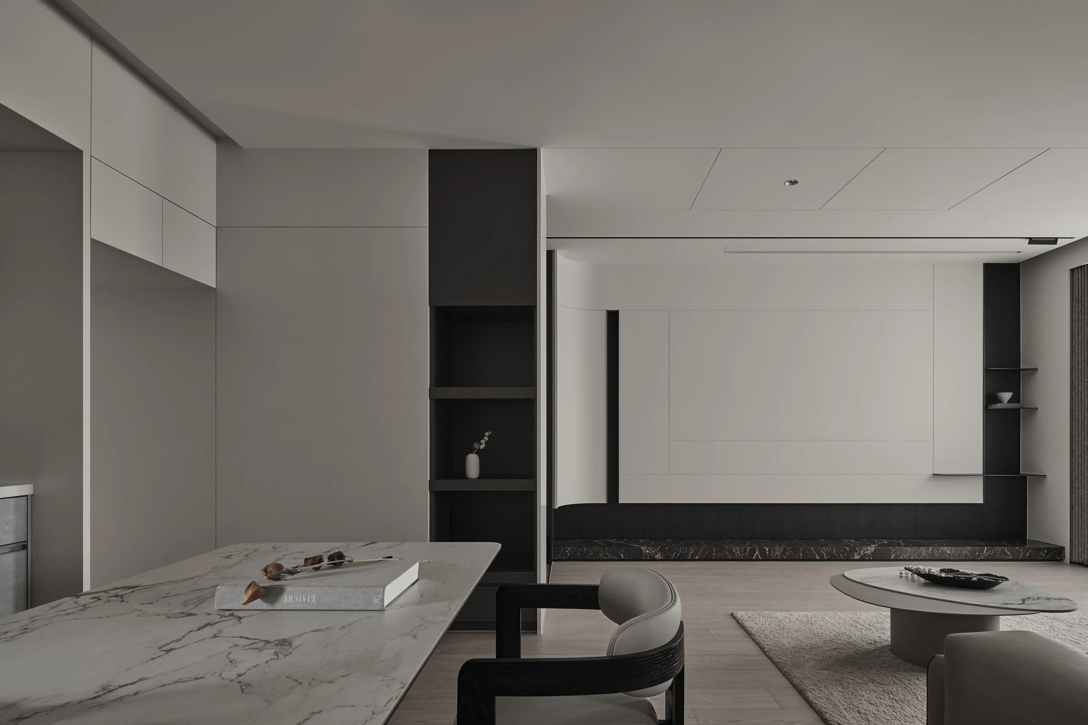 空間的秩序由線性語彙串聯,自玄關向內延展,透過等高比例的分割邏輯,將櫃體、立面與機能整合於同一脈絡之中,使整體視覺維持一致而克制的節奏。細節隱於線條之間,讓空間在留白與尺度的拿捏中呈現沉靜而均衡的狀態。懸浮櫃體與鐵件層板的配置,進一步削弱量體的厚重感,使實體與虛空交錯並置,讓留白不僅是視覺上的空隙,也成為構築空間層次的重要語彙。