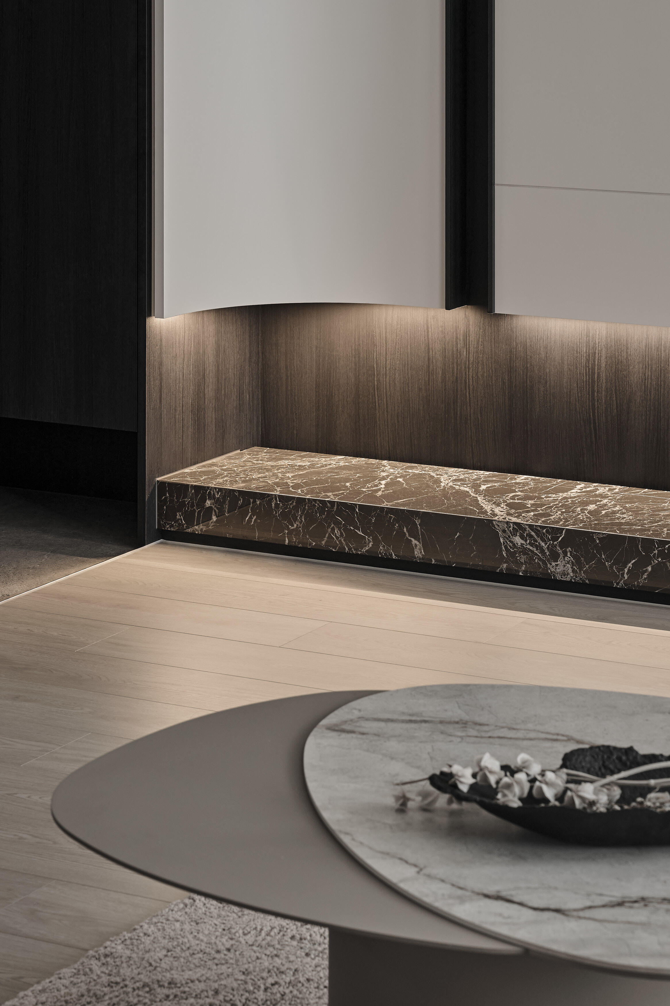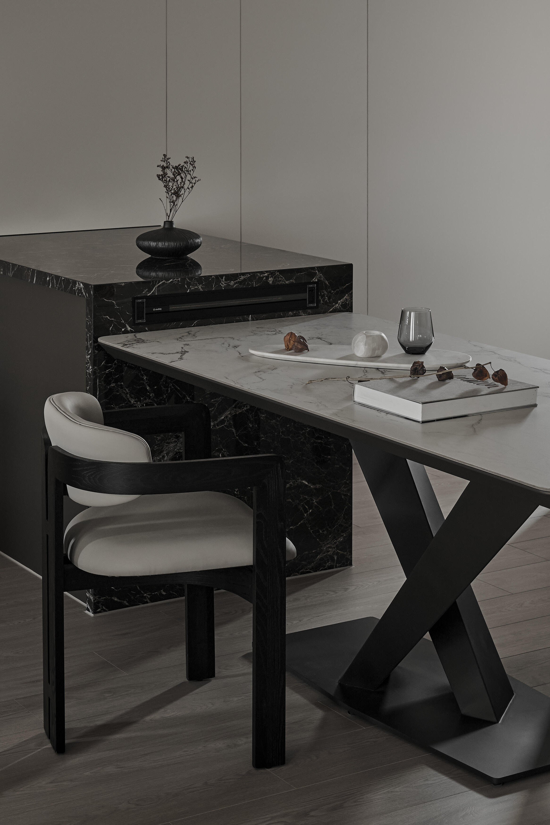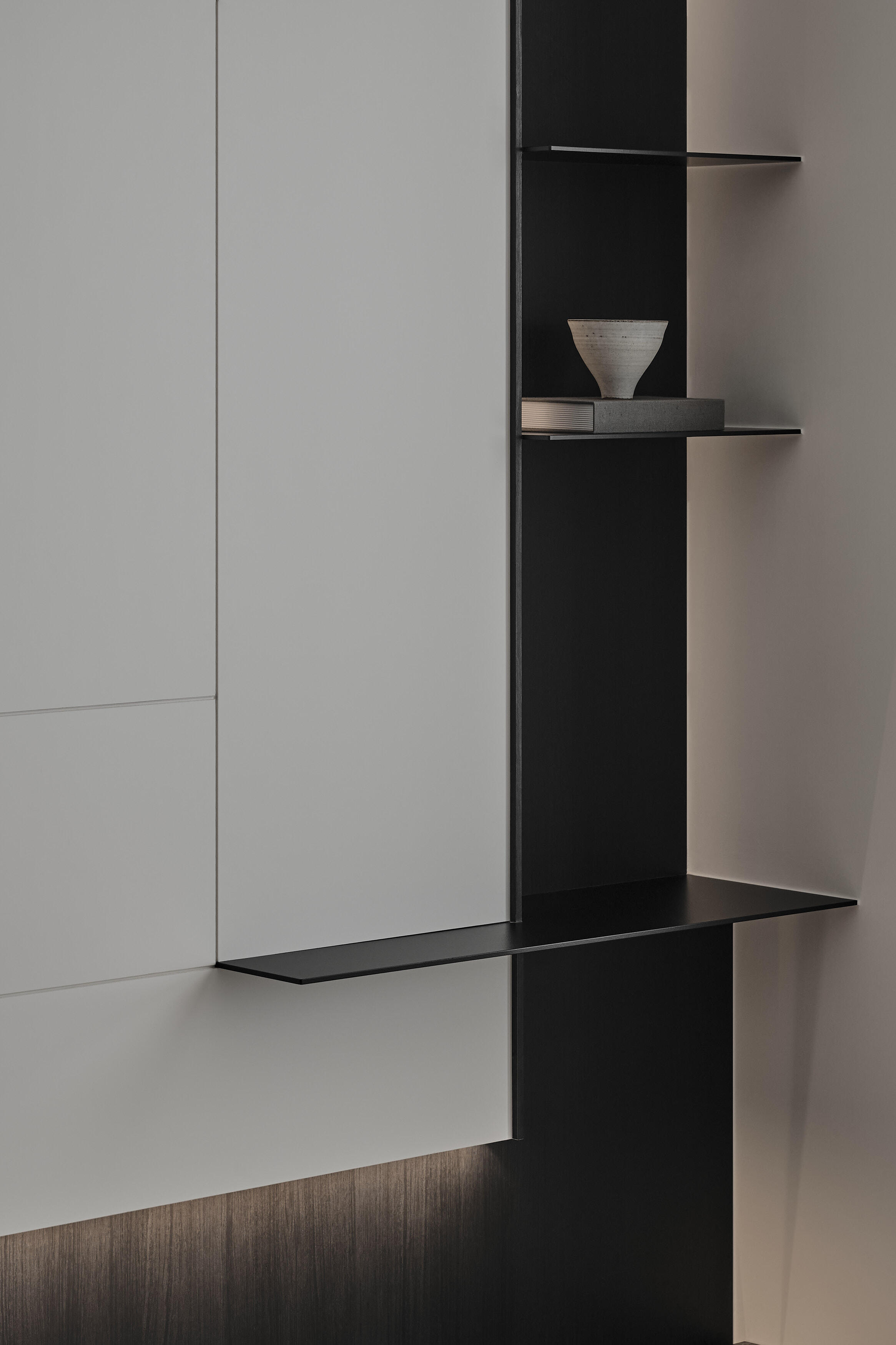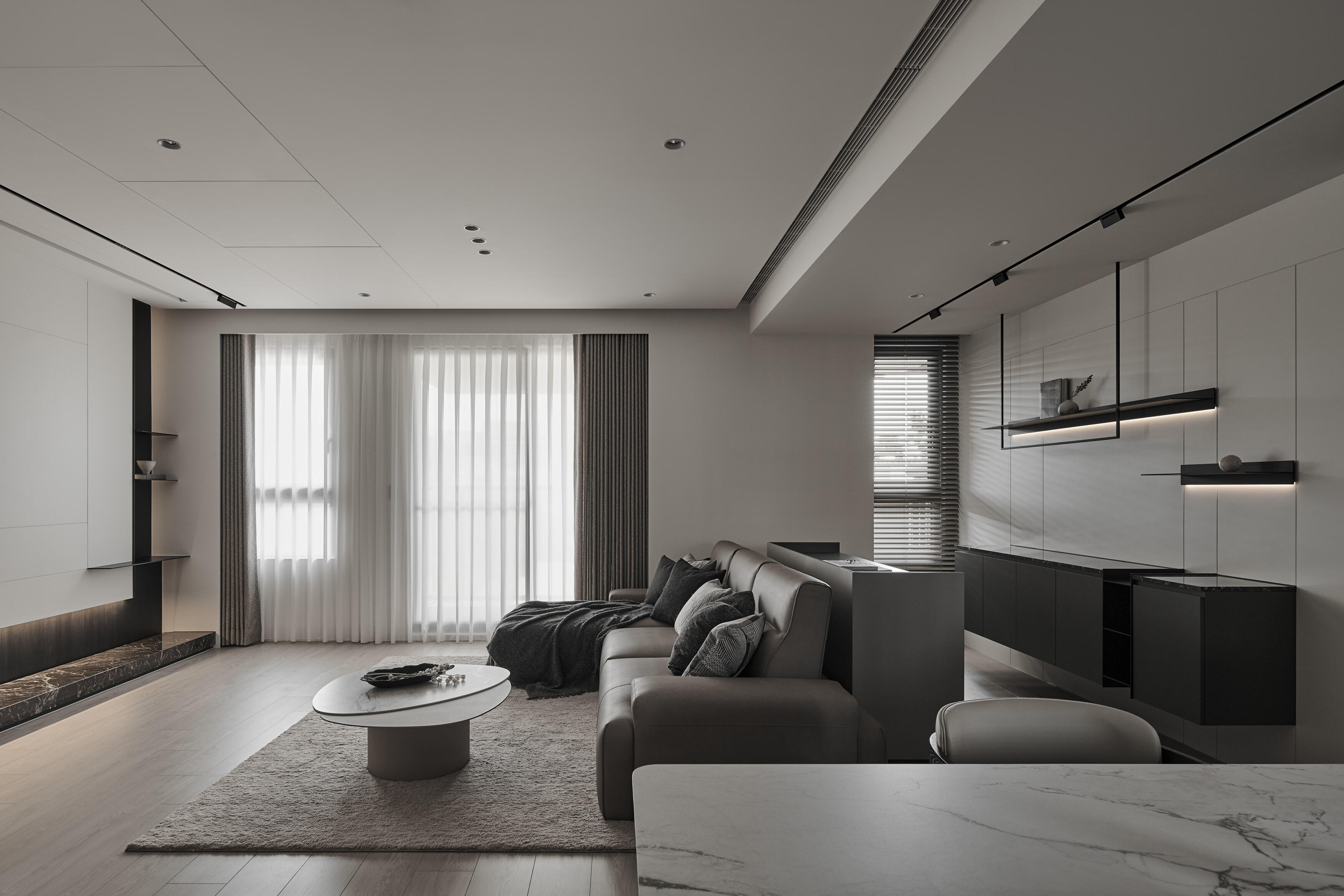 空間的秩序由線性語彙串聯,自玄關向內延展,透過等高比例的分割邏輯,將櫃體、立面與機能整合於同一脈絡之中,使整體視覺維持一致而克制的節奏。細節隱於線條之間,讓空間在留白與尺度的拿捏中呈現沉靜而均衡的狀態。懸浮櫃體與鐵件層板的配置,進一步削弱量體的厚重感,使實體與虛空交錯並置,讓留白不僅是視覺上的空隙,也成為構築空間層次的重要語彙。