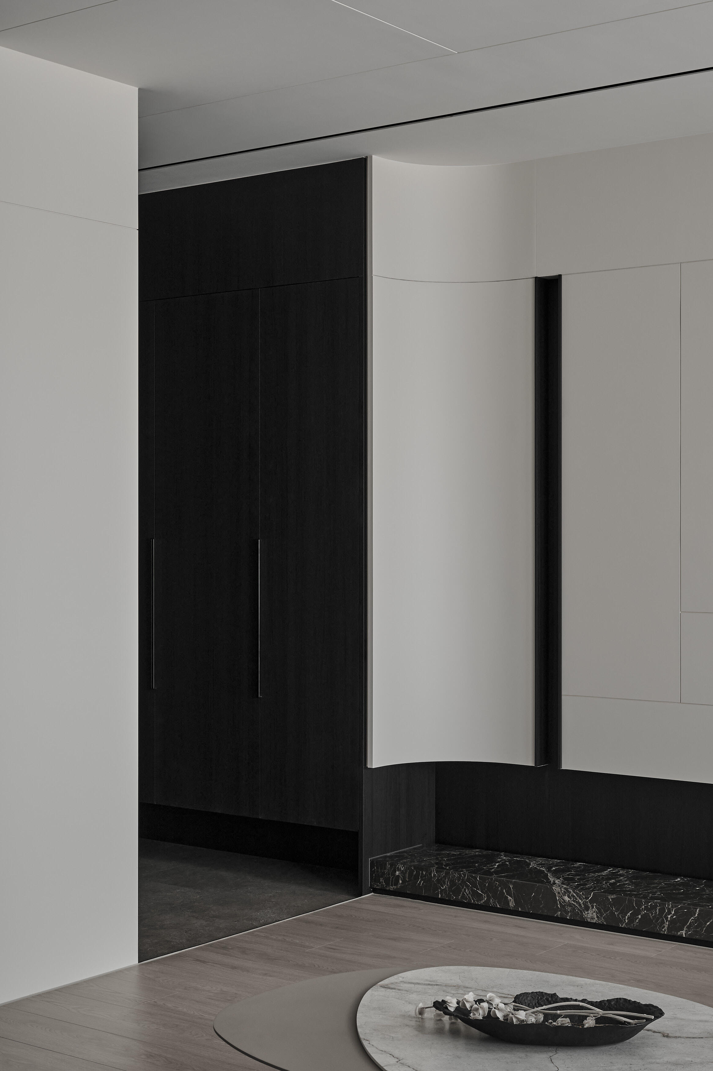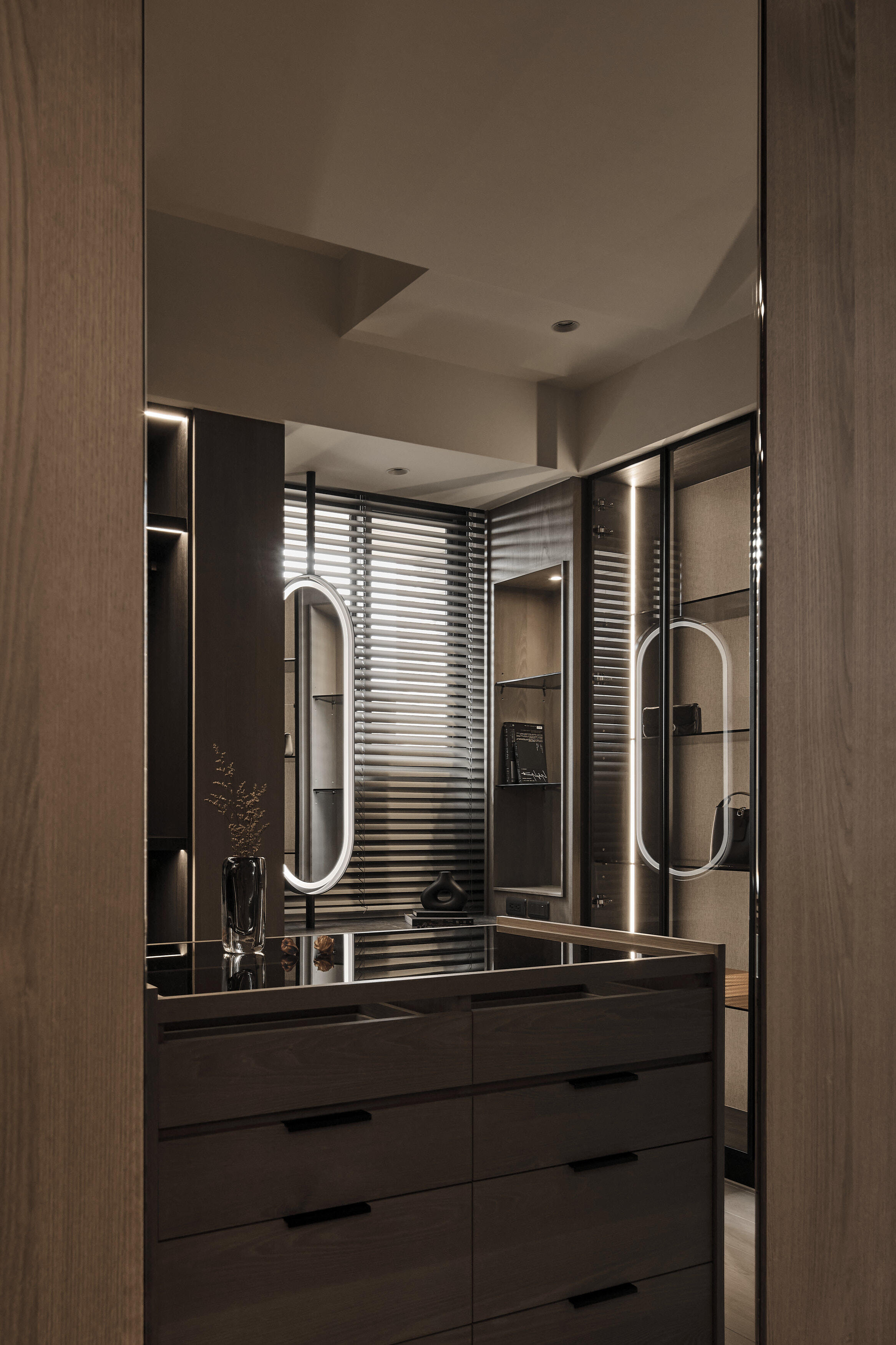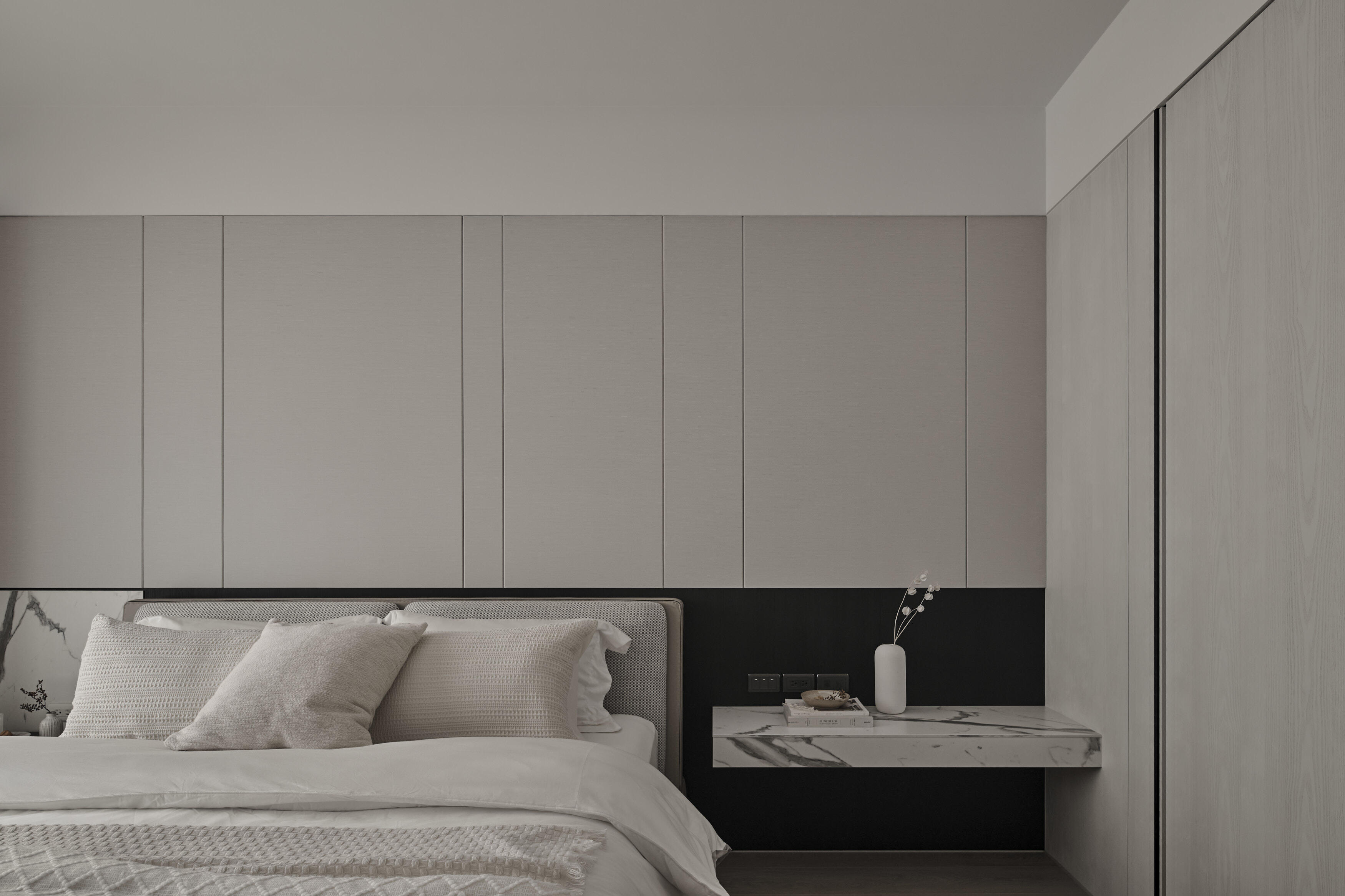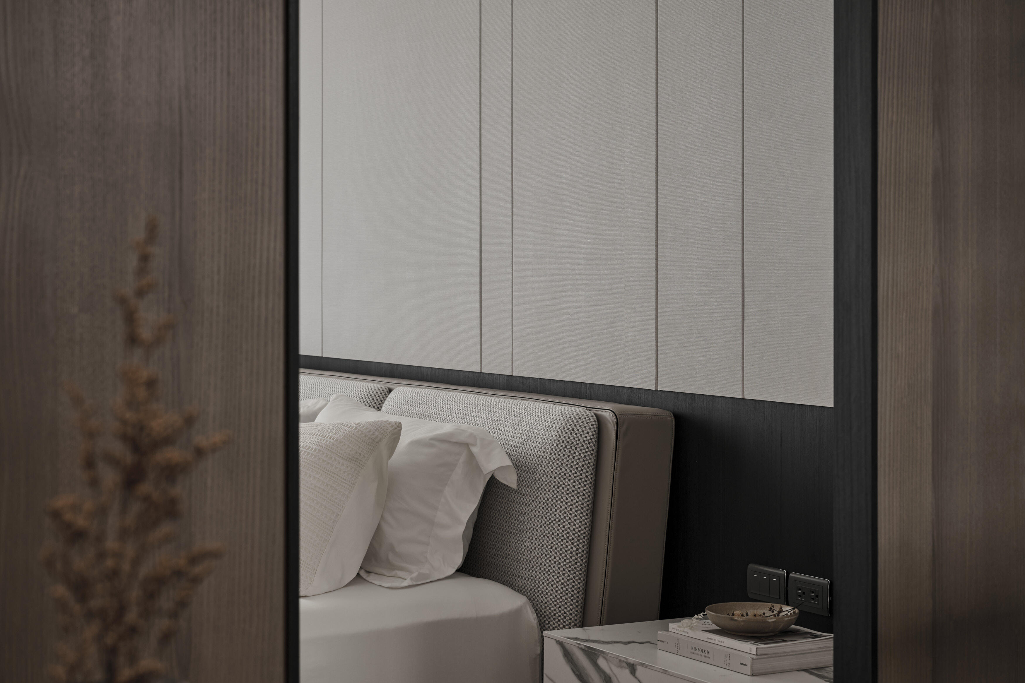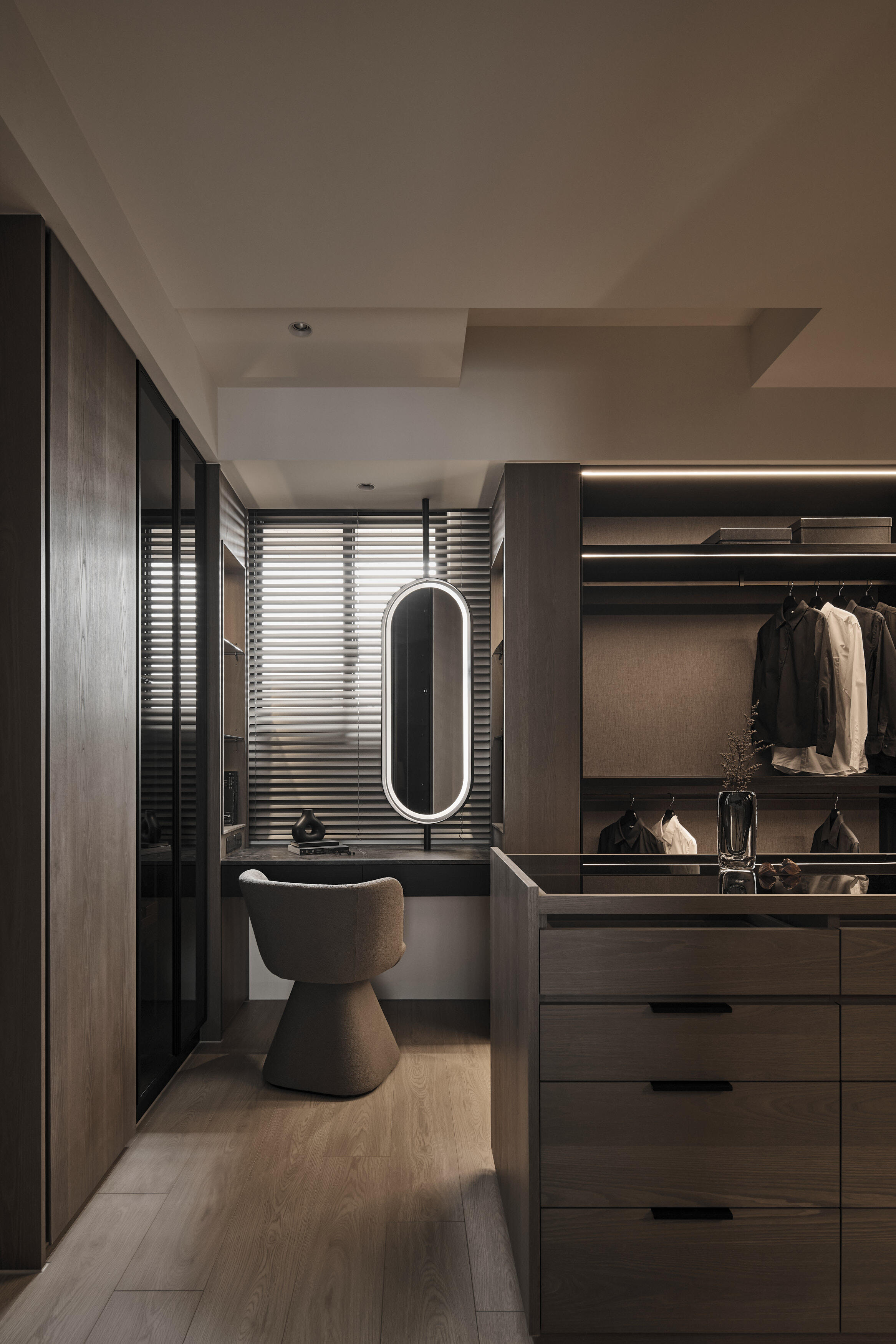 主臥延續公領域所建立的輕盈與安定,以更純粹的語言回應私領域的使用需求。更衣室以墨色作為空間的轉折,深色木皮與櫃體整合嵌合,在純粹的框架之中形塑沉穩而內斂的氣質。設計刻意屏除過多裝飾,回到比例與材質本身的表現,使每一處界面都維持克制而精準的秩序。留白不只是視覺上的簡潔,更是一種為生活預留餘裕的設計態度,使空間得以隨著時間與日常的累積,自然沉澱並慢慢完整。