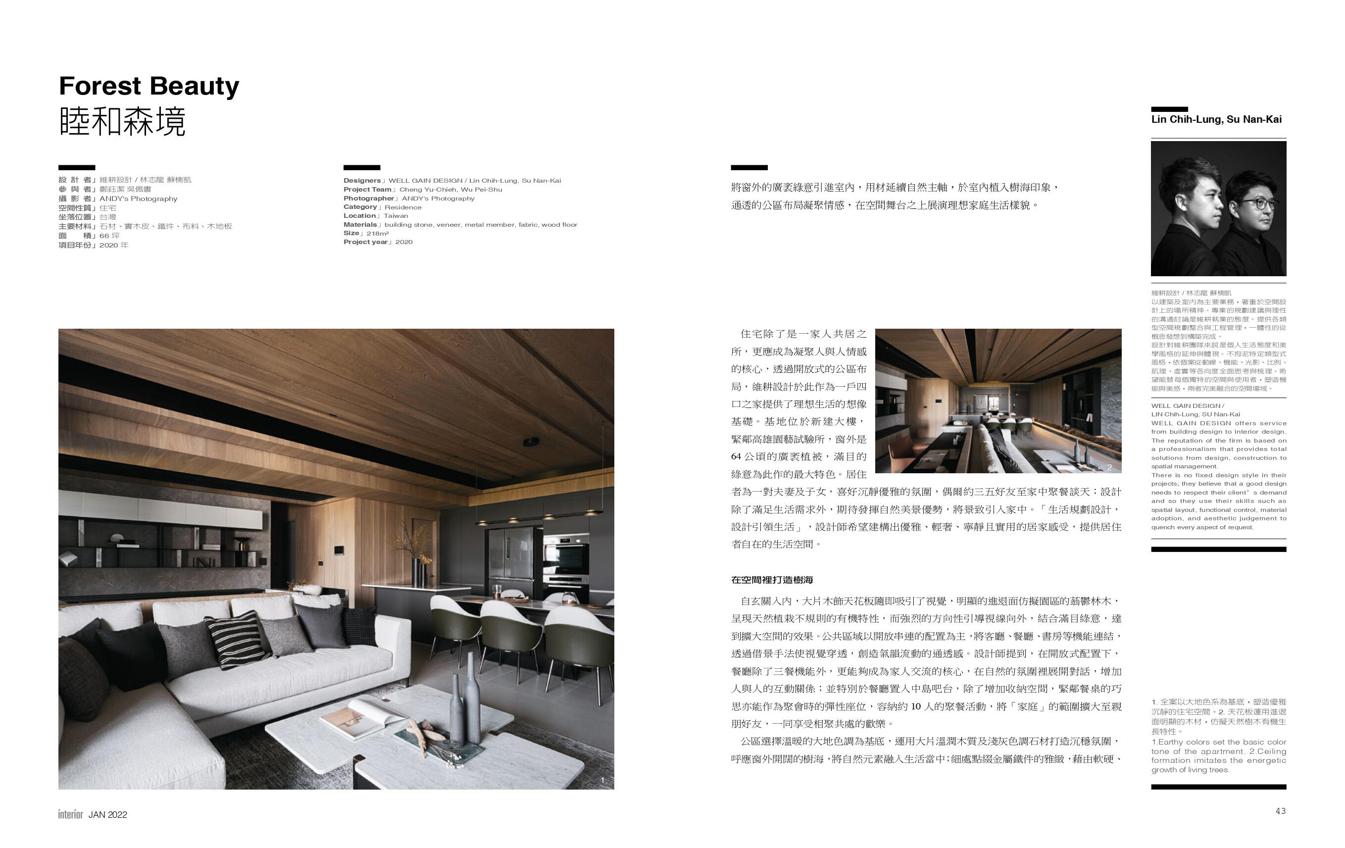 將窗外的廣袤綠意引進室内,用材延續自然主軸,於室内植入樹海印象,通透的公區布局凝聚情感,在空間舞台之上展演演理想家庭生活樣貌。