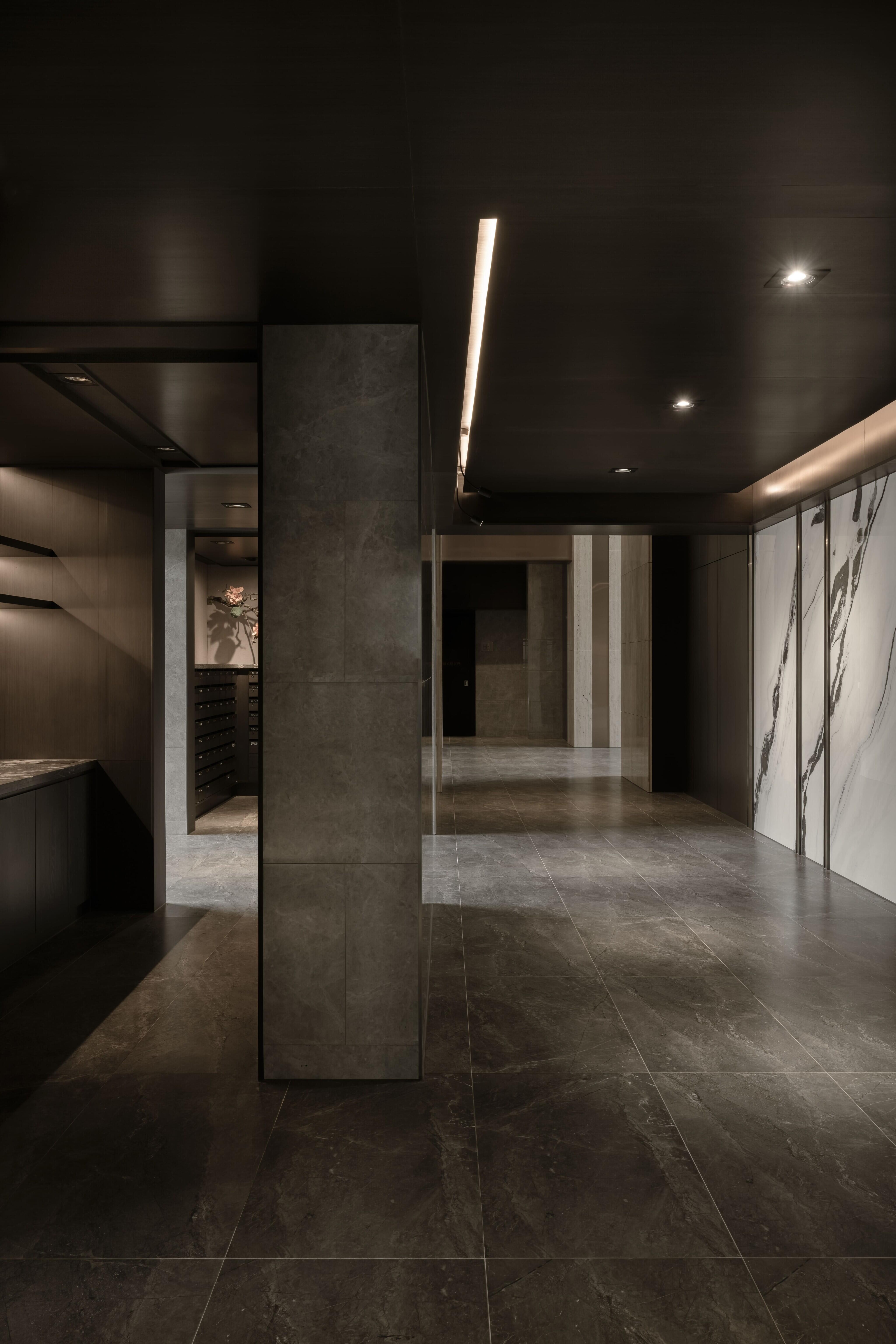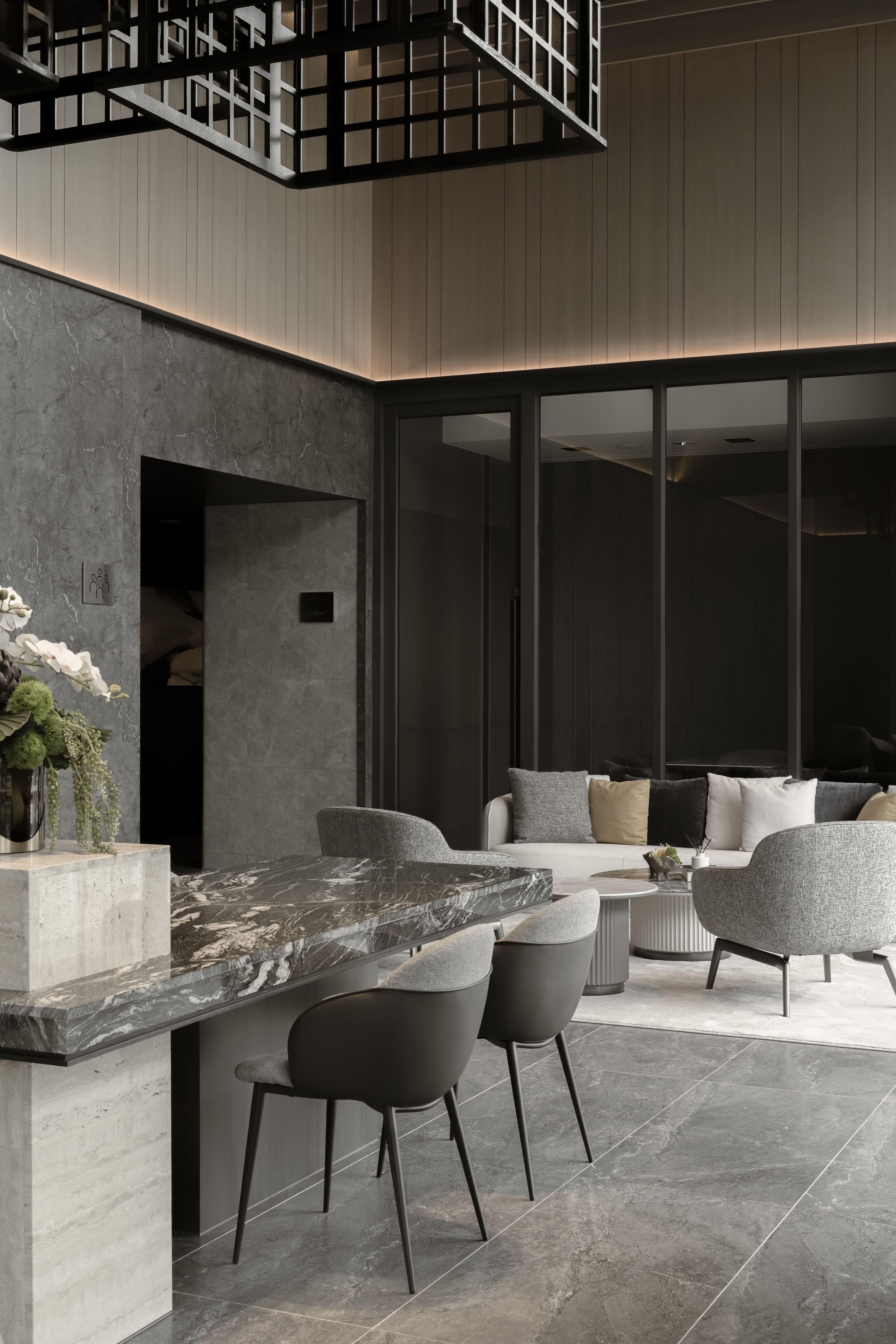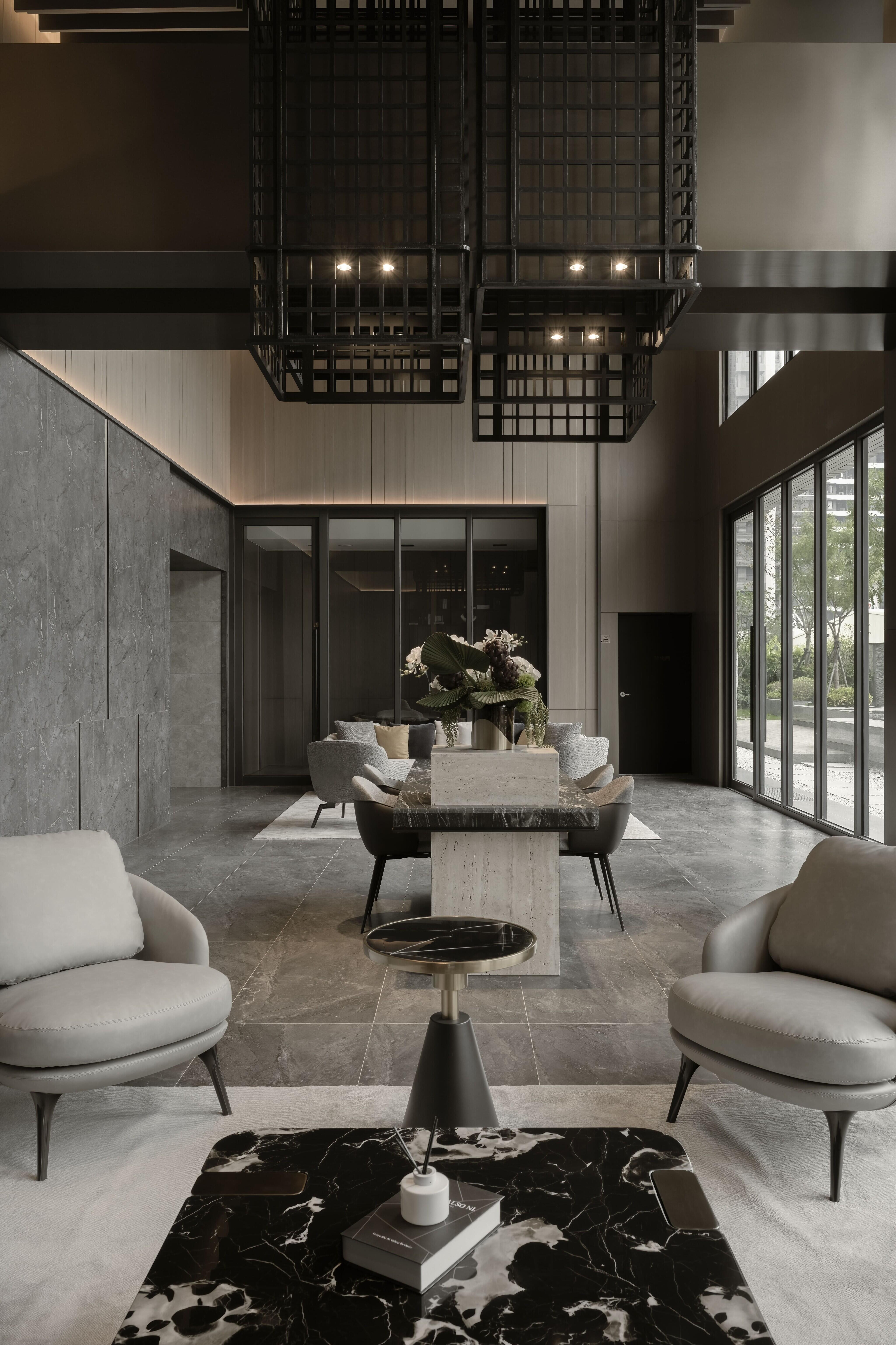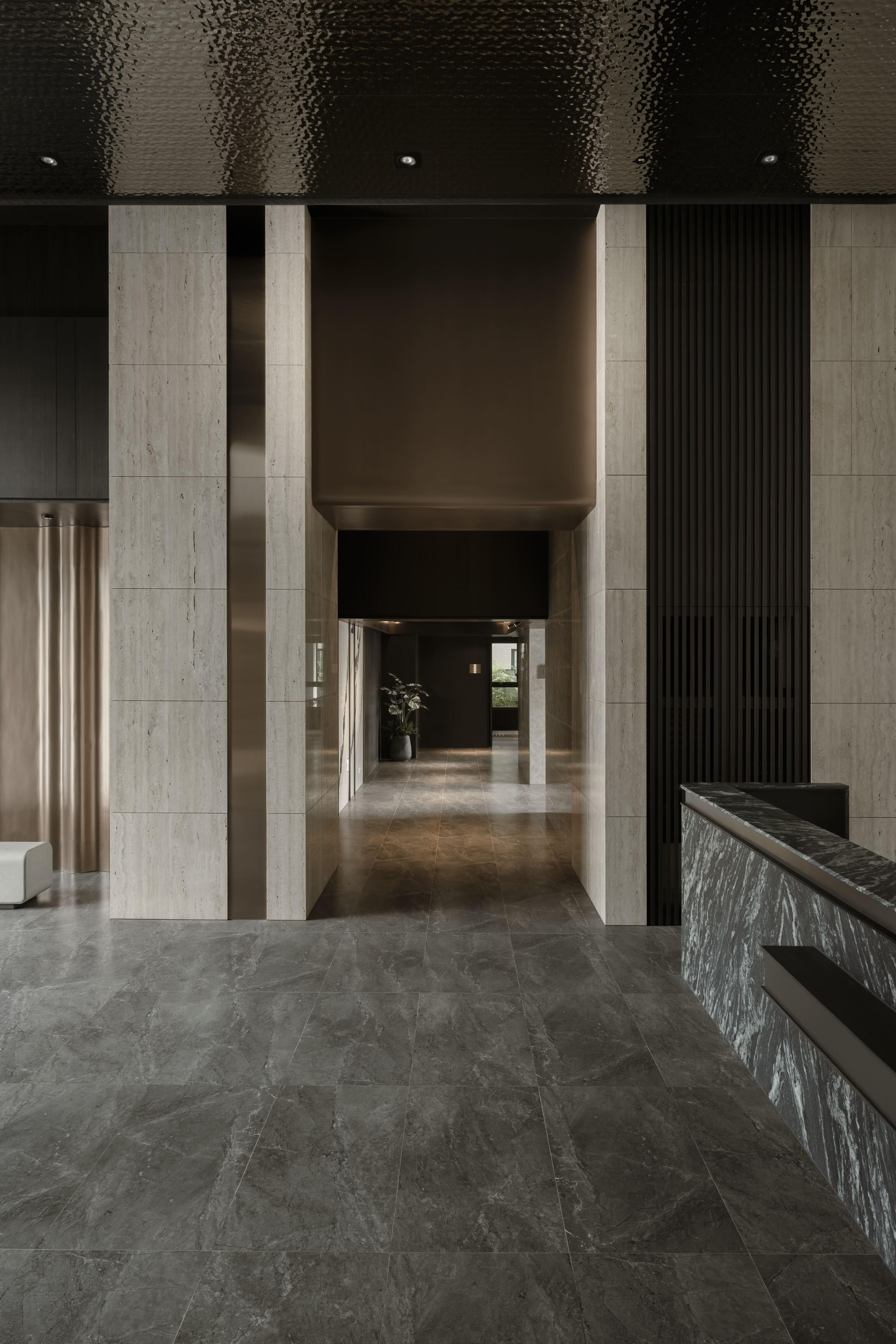公設空間不僅是大樓形象的延伸,更是承載日常互動與生活情感的重要場域。我們以線條作為空間的起點,讓曲線與直線在其中交會、延展,透過比例的控制與尺度的切分,於理性架構之中勾勒秩序之美,使場域在俐落之中仍保有柔和層次。