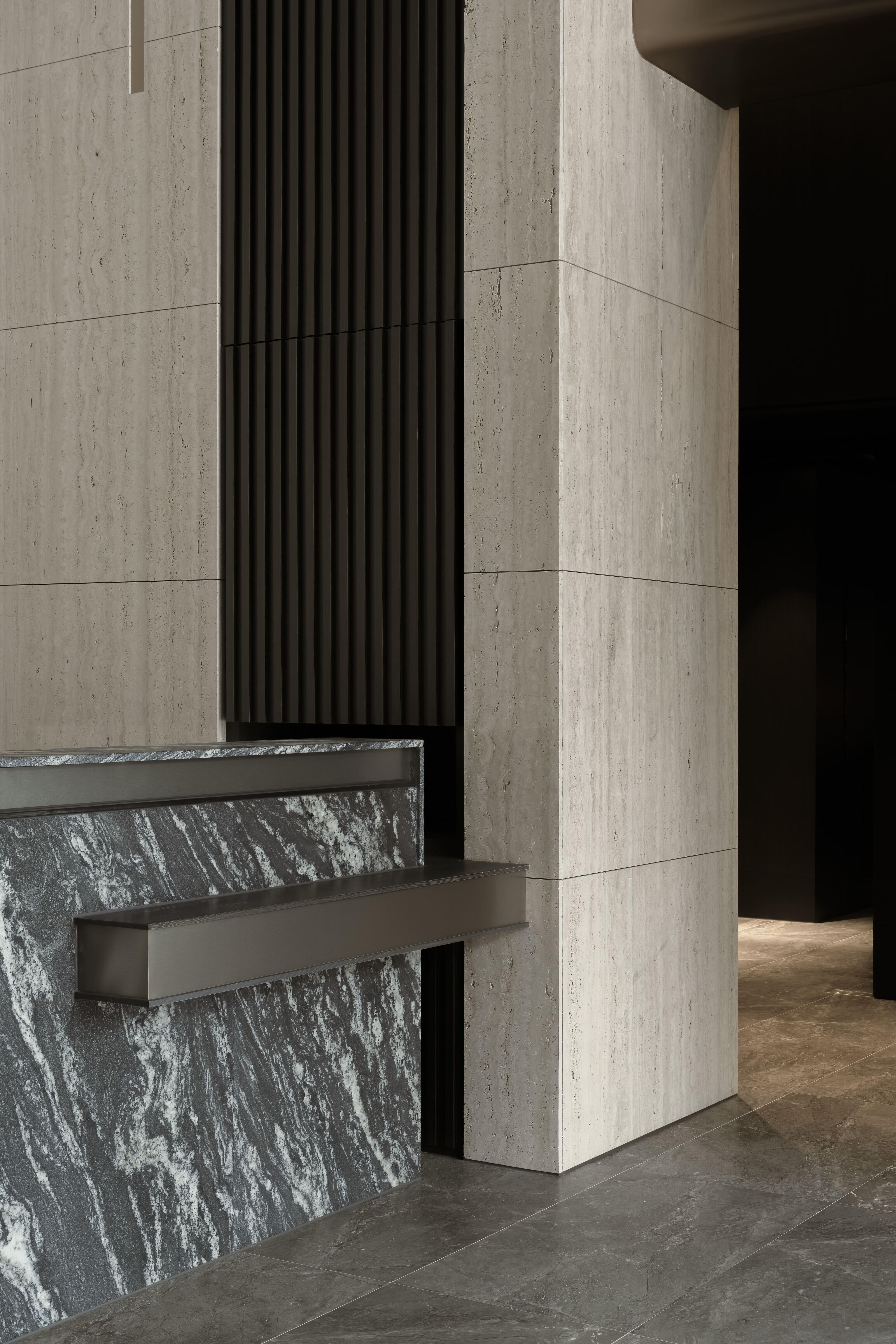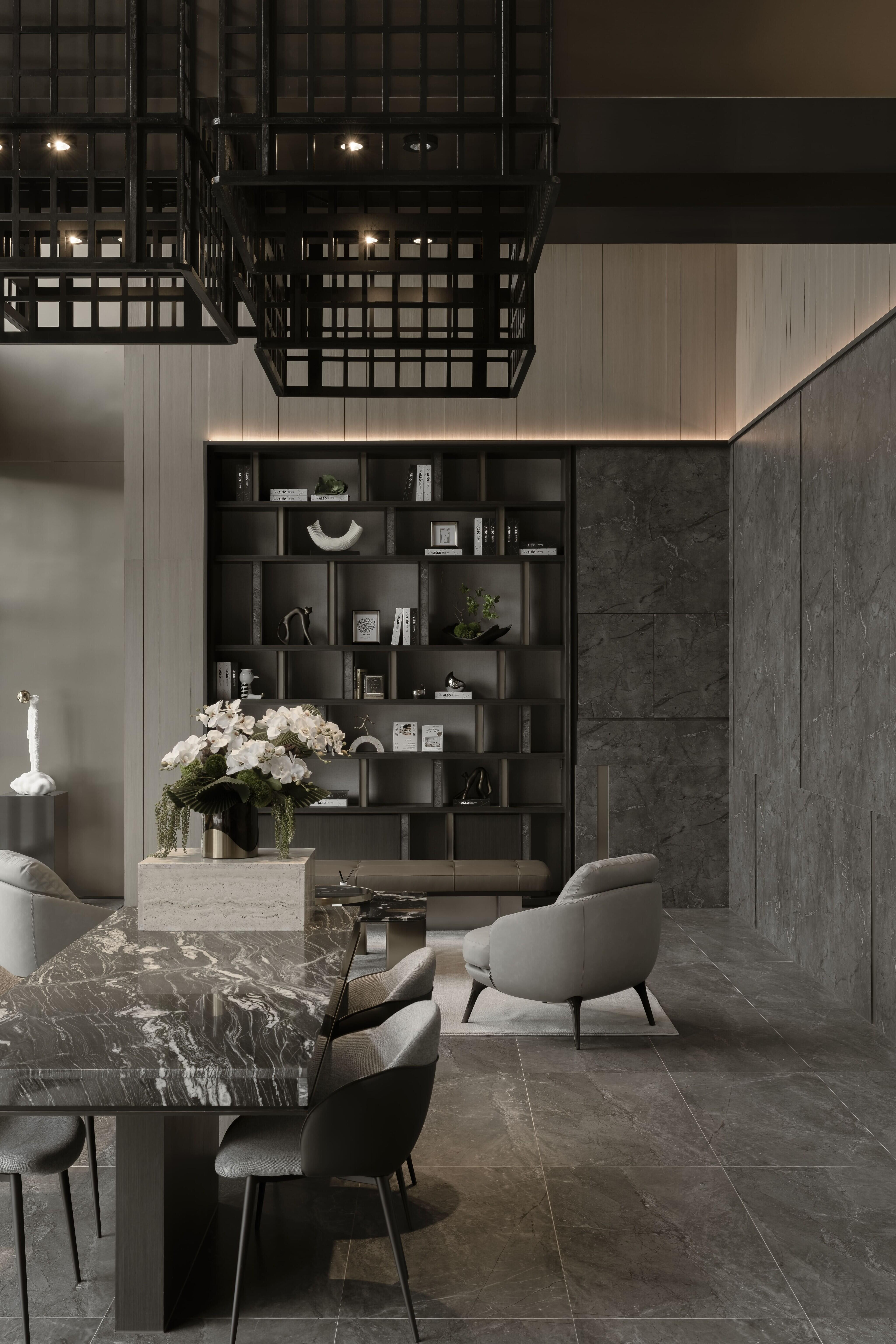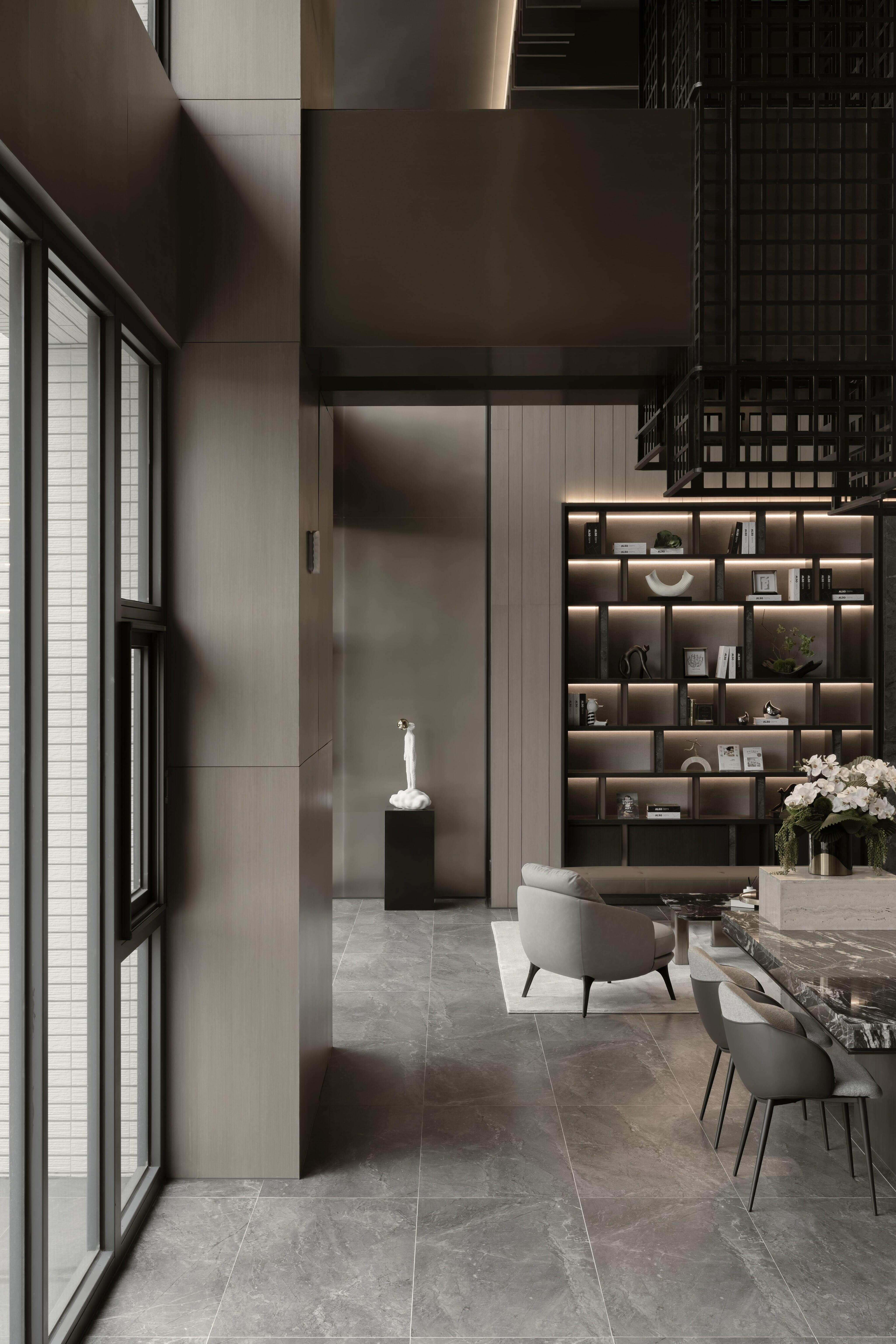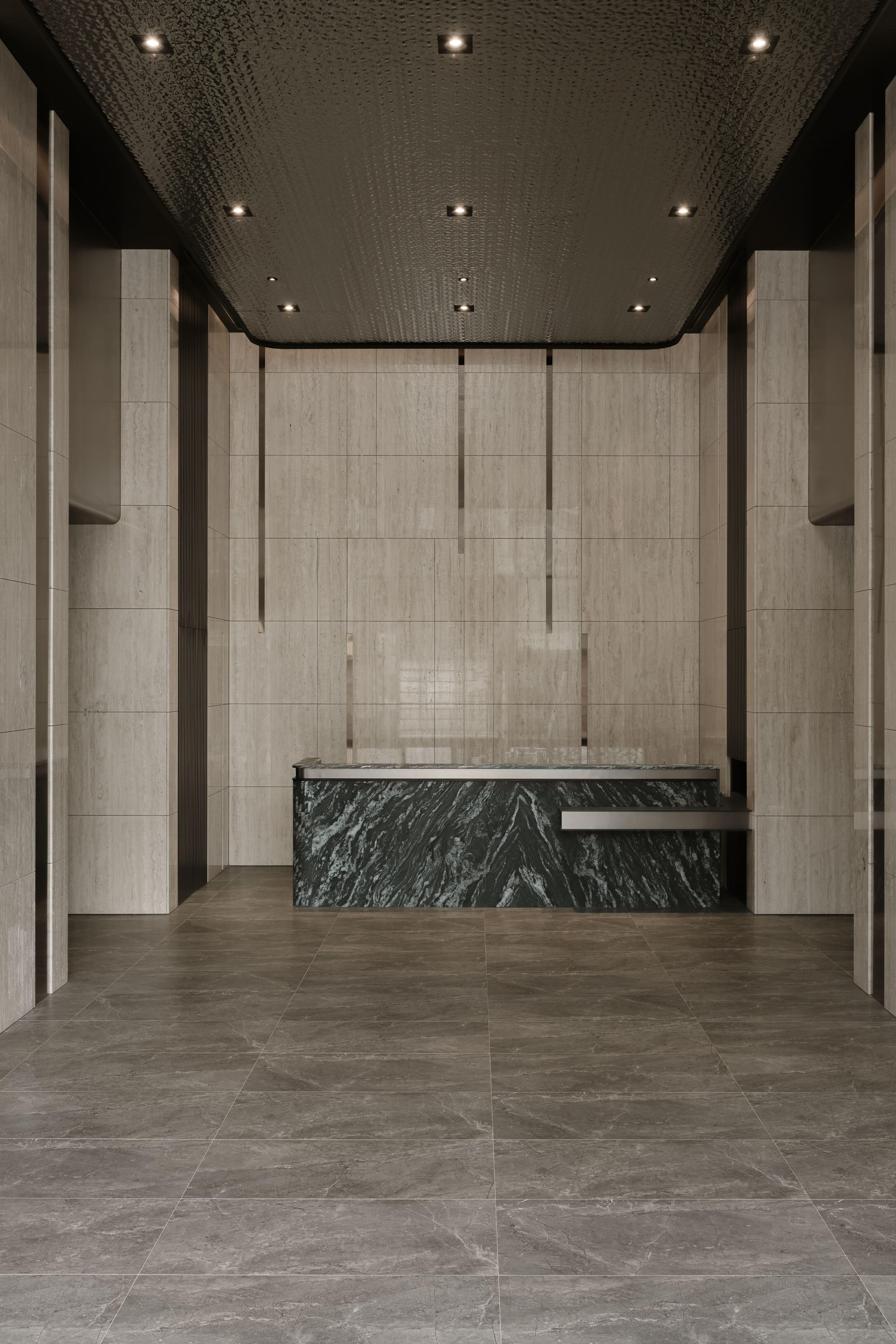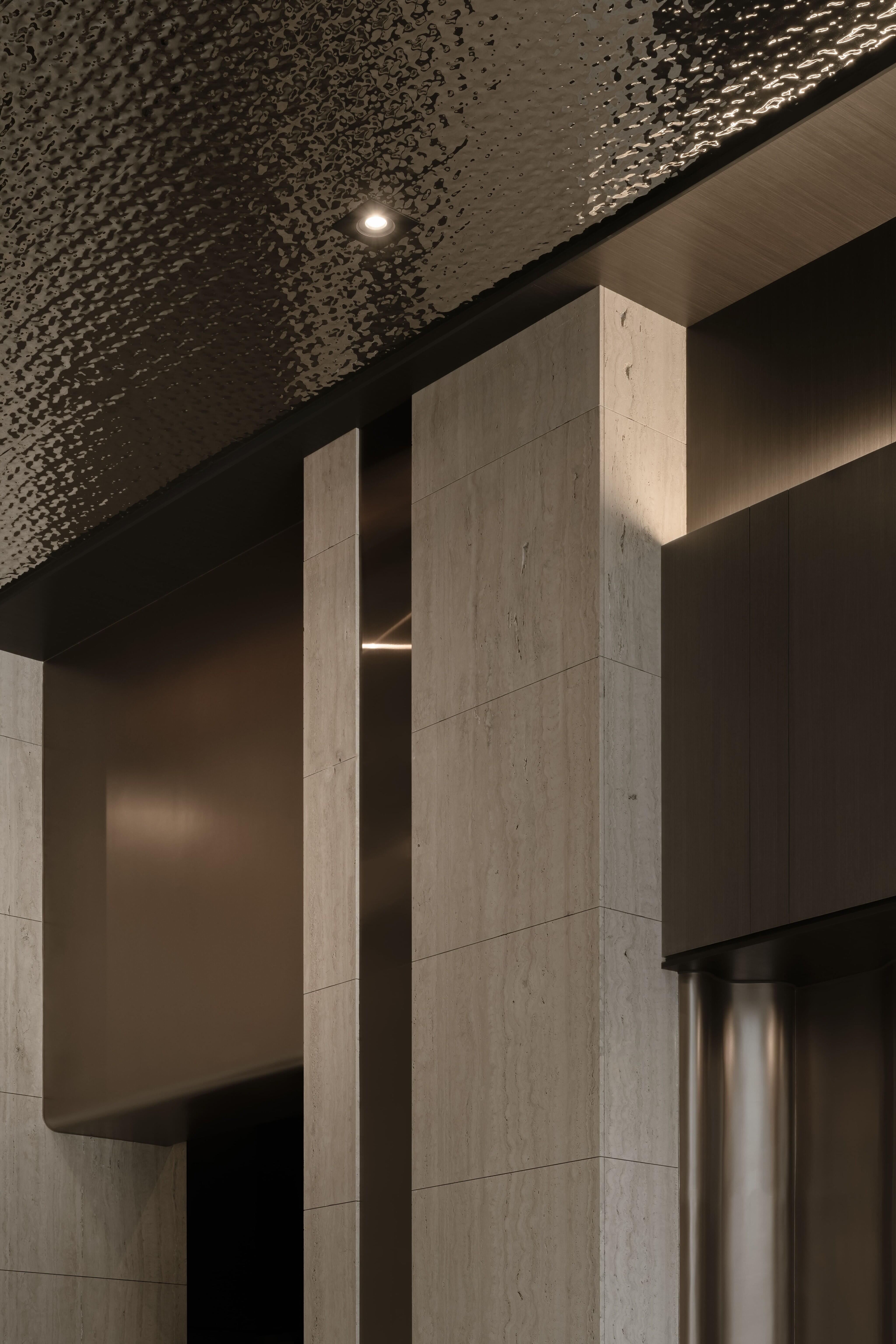 公設空間不僅是大樓形象的延伸,更是承載日常互動與生活情感的重要場域。我們以線條作為空間的起點,讓曲線與直線在其中交會、延展,透過比例的控制與尺度的切分,於理性架構之中勾勒秩序之美,使場域在俐落之中仍保有柔和層次。