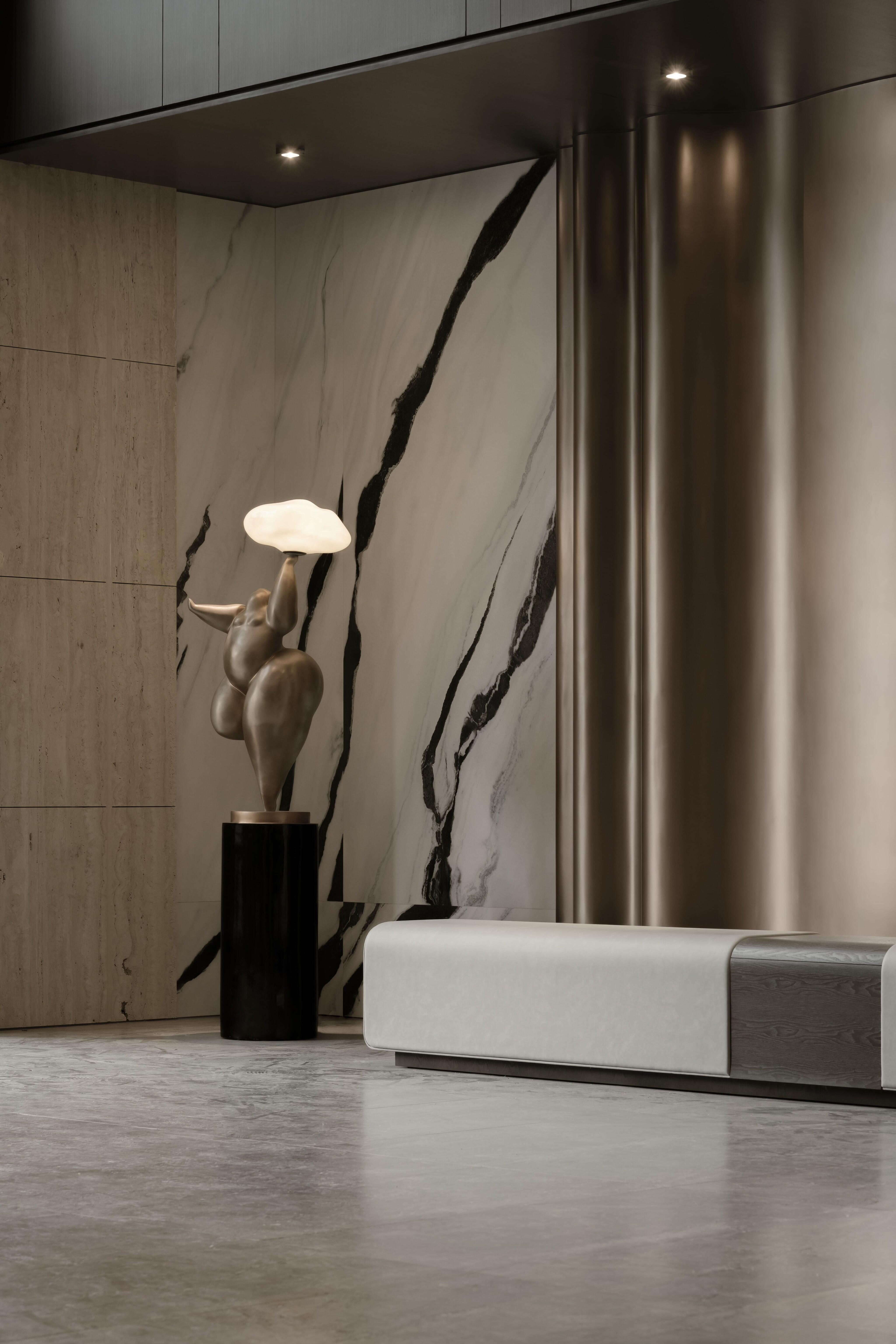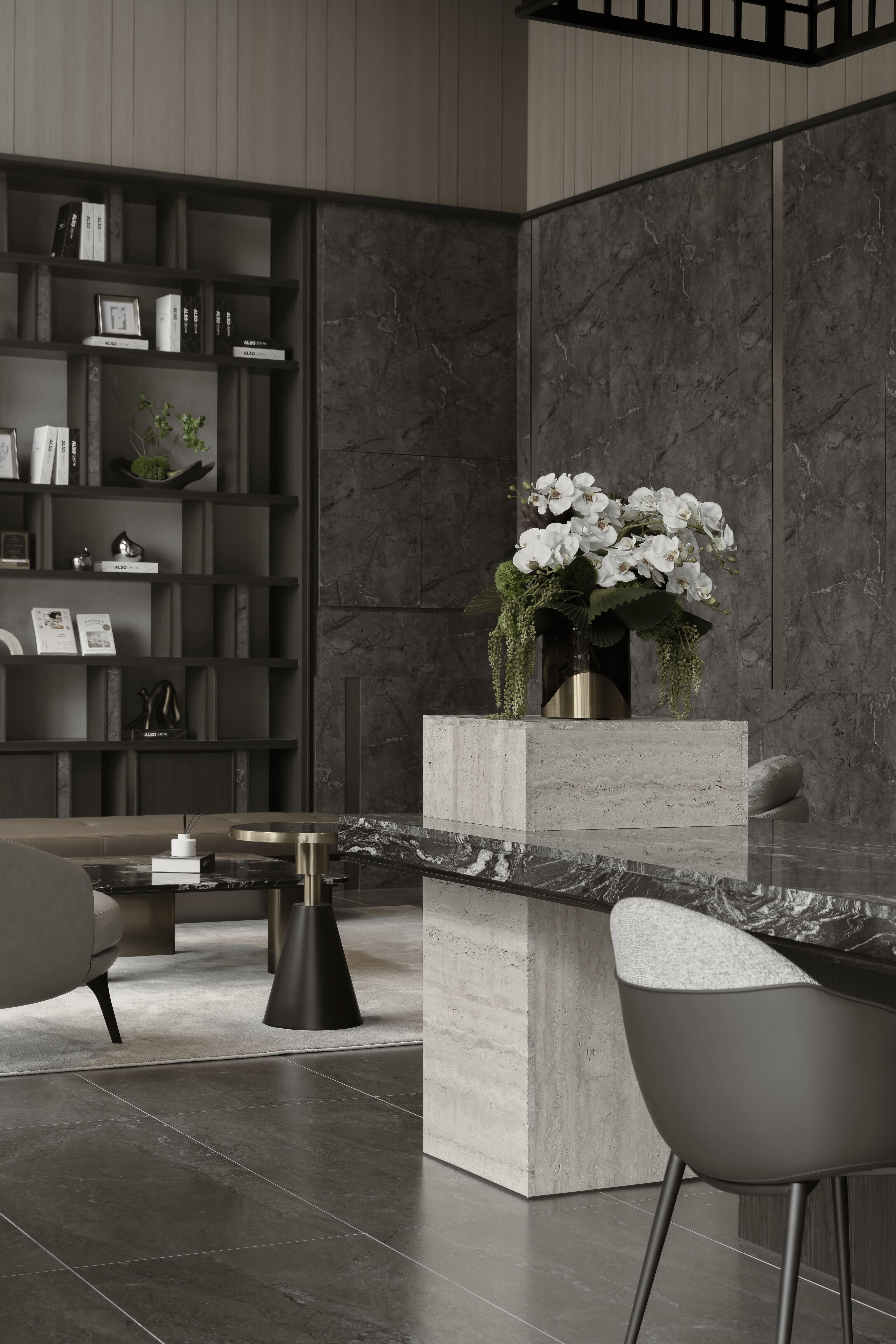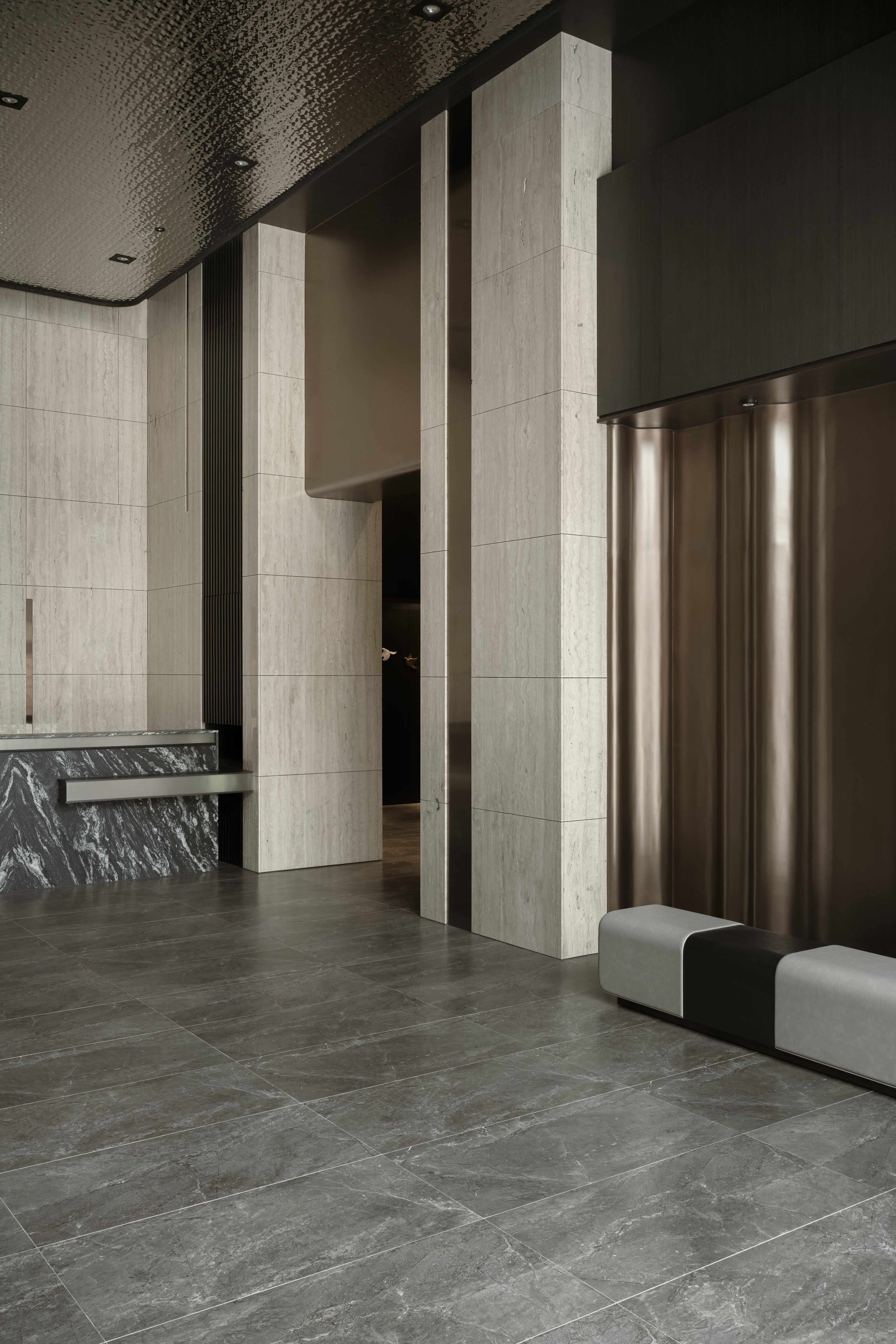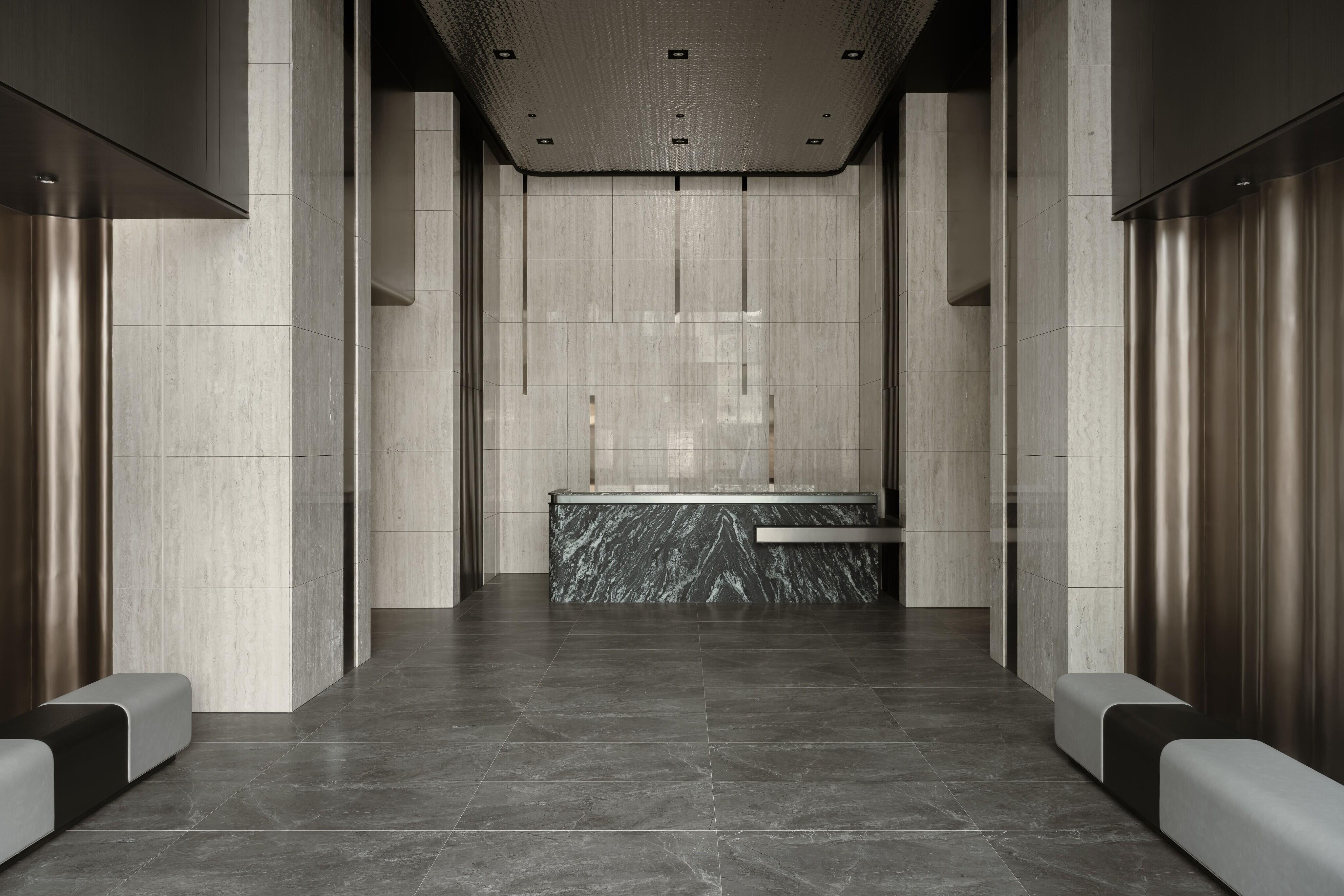 公設空間不僅是大樓形象的延伸,更是承載日常互動與生活情感的重要場域。我們以線條作為空間的起點,讓曲線與直線在其中交會、延展,透過比例的控制與尺度的切分,於理性架構之中勾勒秩序之美,使場域在俐落之中仍保有柔和層次。