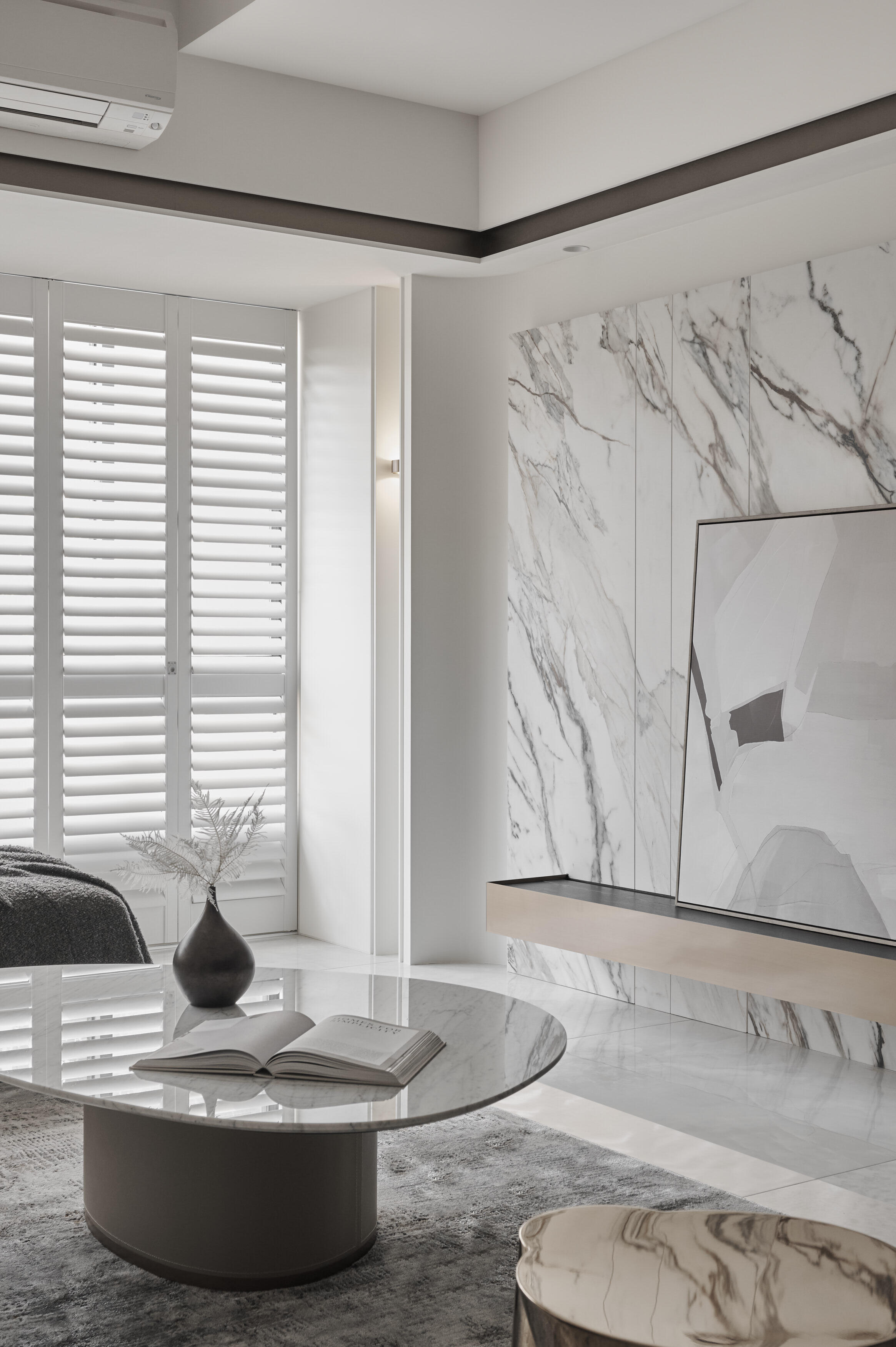 設計師以純粹的白色作為空間主調,不僅放大了視覺感受,更為居家注入一股寧靜而優雅的氛圍,而在簡約的基底之上,巧妙地融入了溫潤的木質元素與細膩的石材紋理,客廳電視牆以淺色大理石鋪陳,自然流動的紋路為空間增添藝術氣息,而一旁純白牆面則透過線條分割,創造出豐富的立體層次。