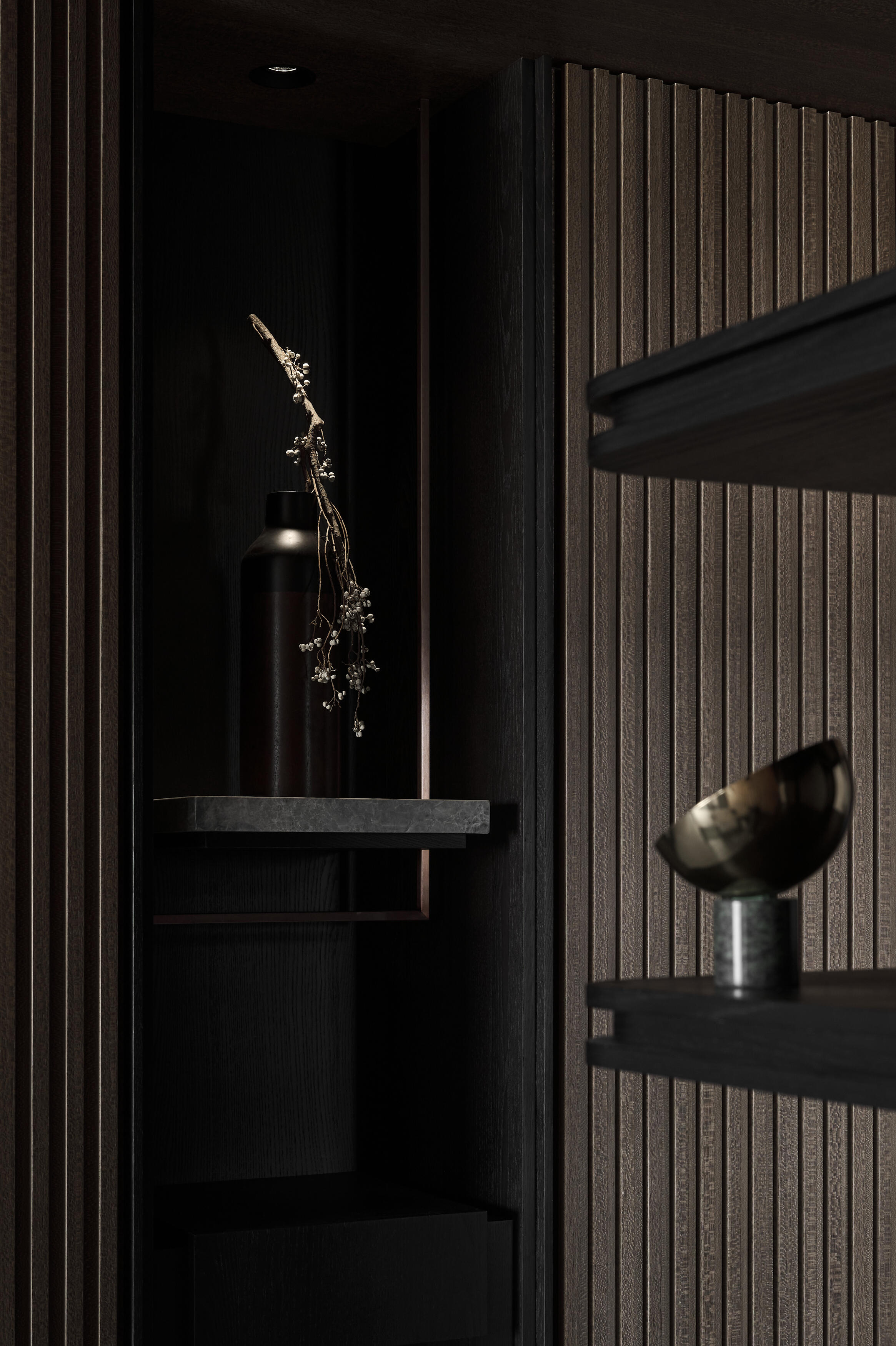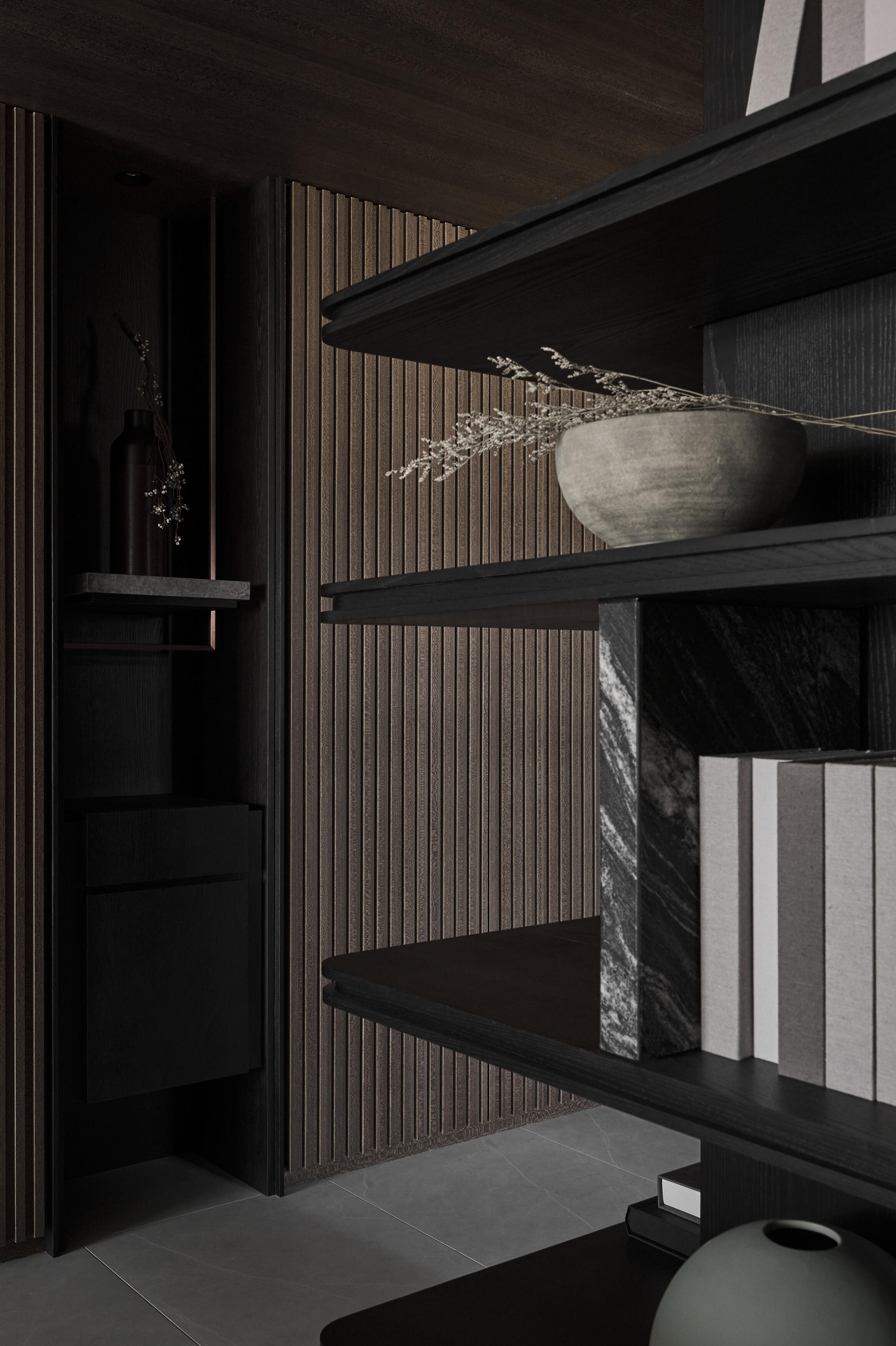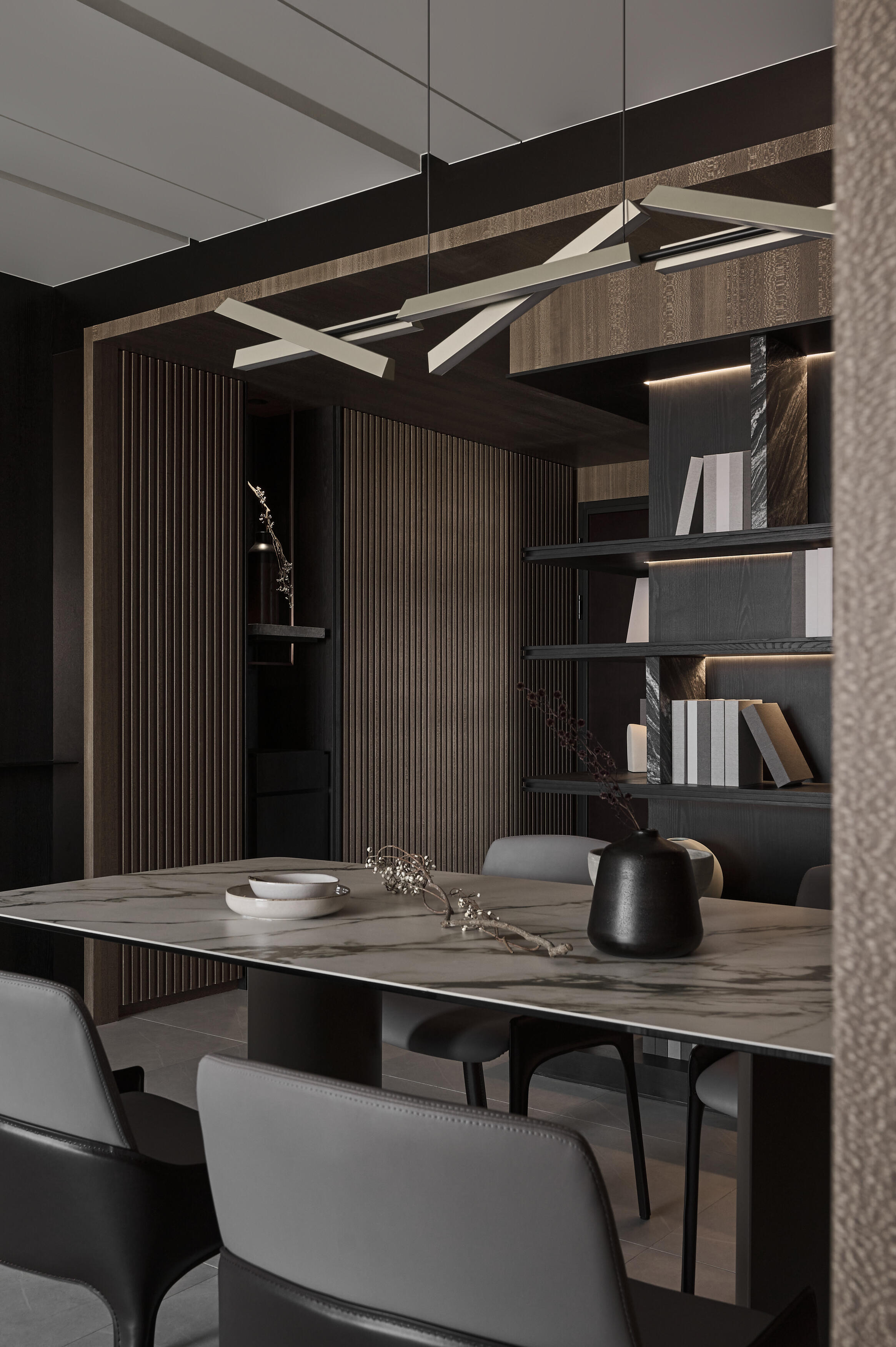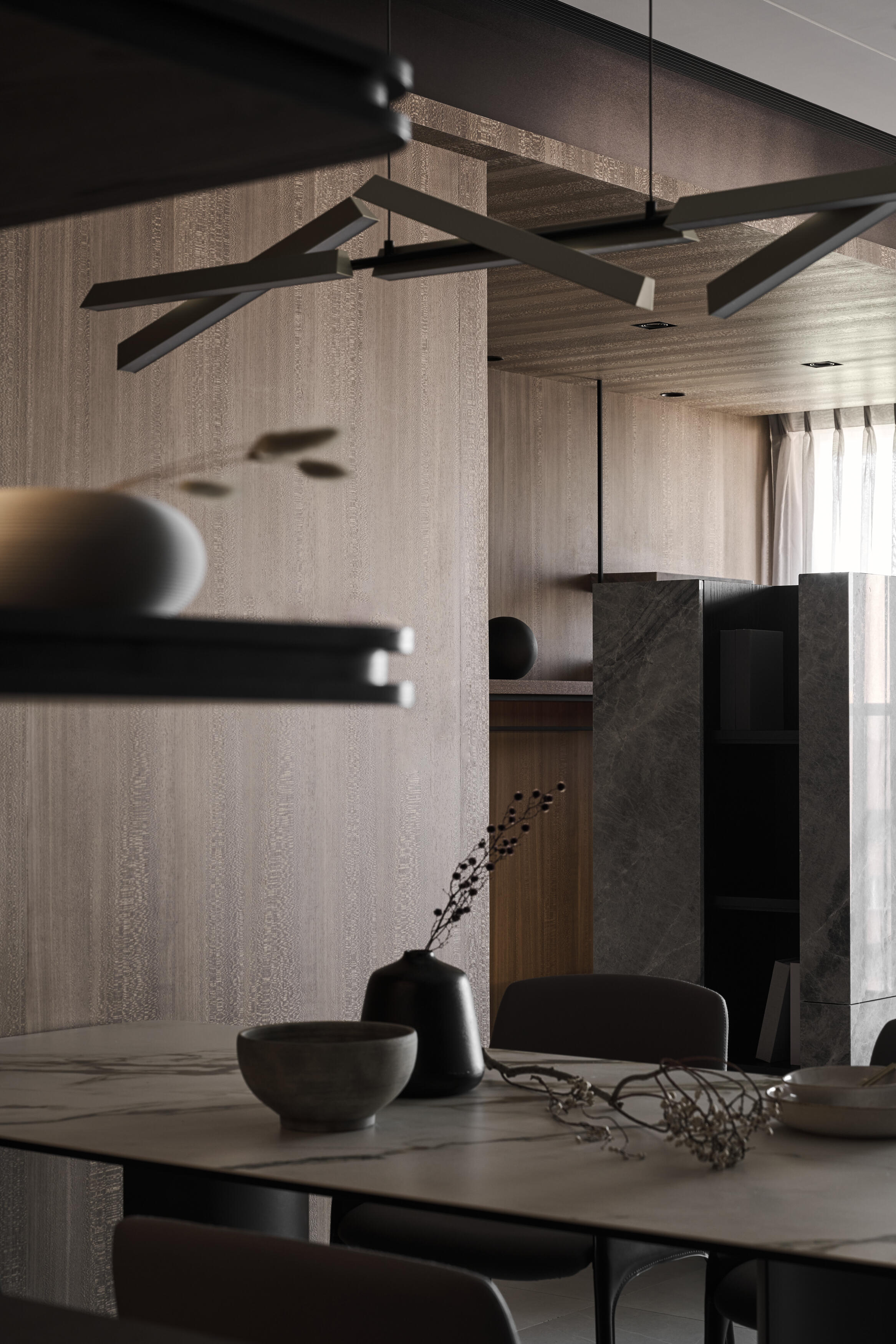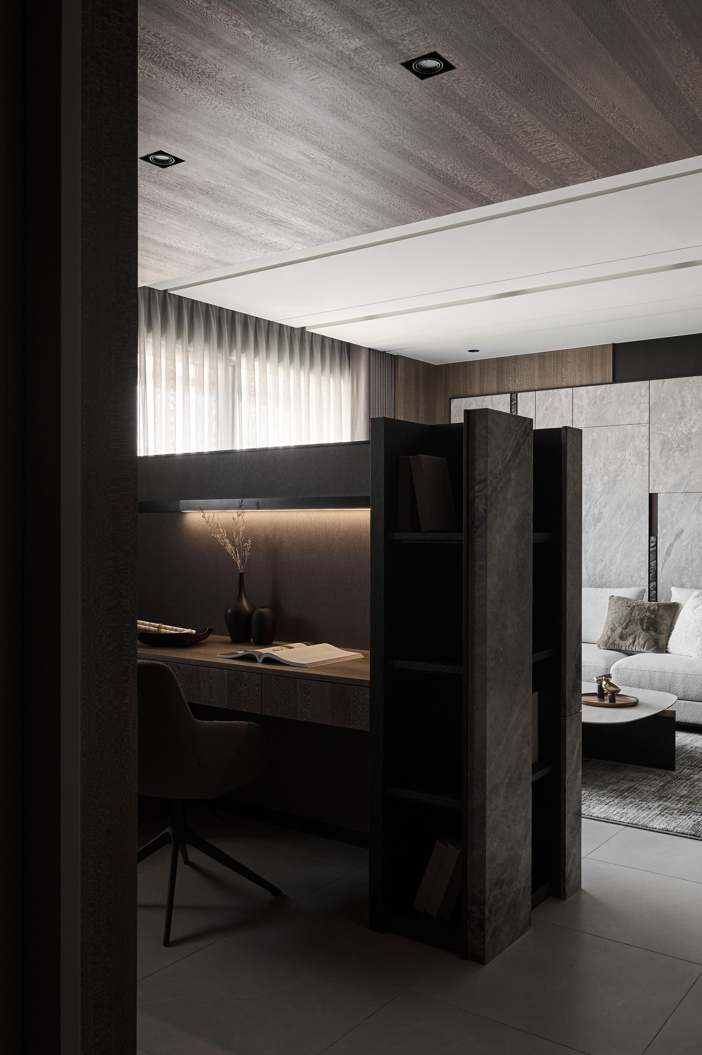 步入玄關,溫潤的木紋便以俐落的線條與格柵,構築出迎賓的儀式感,揭開空間的序幕。公共空間採開放式設計,串聯客廳及閱讀區,保持開闊的視覺感受,透過象徵森林意象的木紋元素,或以平面鋪陳,或以格柵立面呈現,巧妙地在天花與立面之間流動,營造出自然的氛圍,客廳主色調則選用清新的灰色,與木質的溫潤相互輝映,沉穩而內斂。電視主牆以黑白潑墨紋理的石材打造,不僅巧妙地界定了閱讀區的位置,更透過線條切割的手法,使質樸的石材紋理錯落有致地延伸,創造出豐富的視覺層次與律動感。