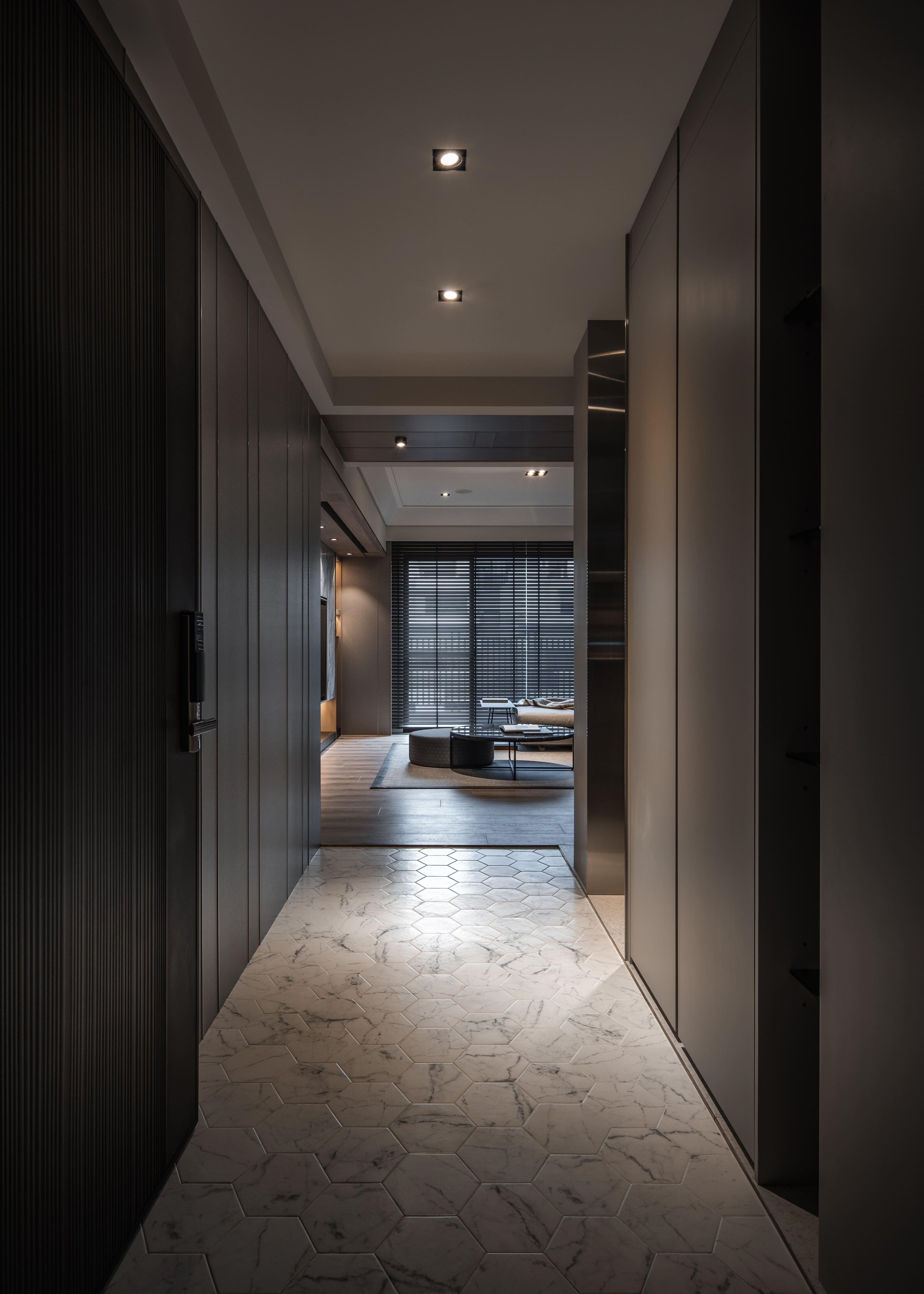 客、餐廳走道上方原本有著一道醒目的梁柱,利用金屬材質圍塑出隱約反射的光澤,黑色金屬與燈光交相輝映,延伸出一道深邃的燈帶,不僅化解了量體的壓迫感,更增添了視覺的層次與設計感。