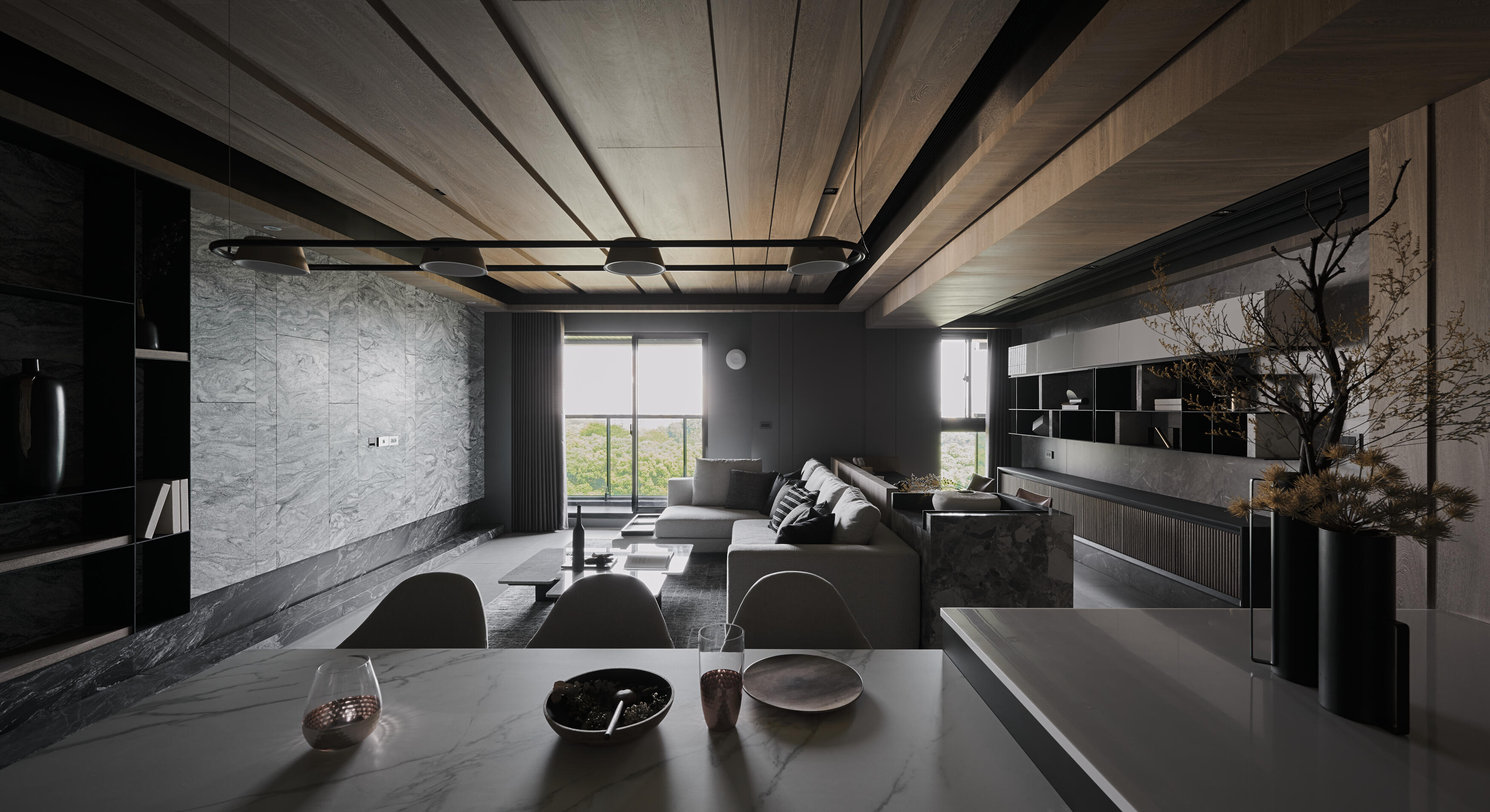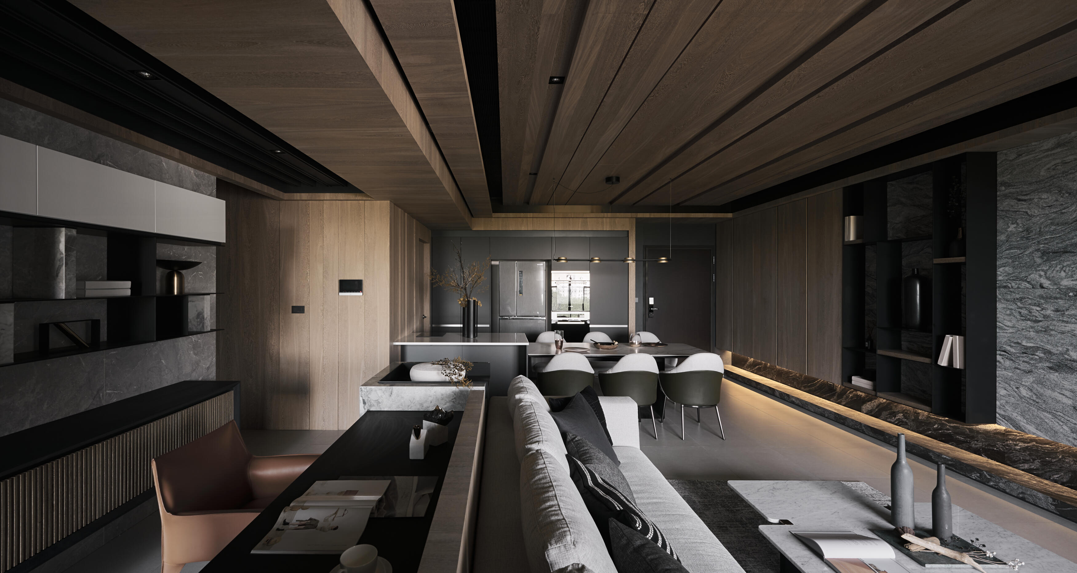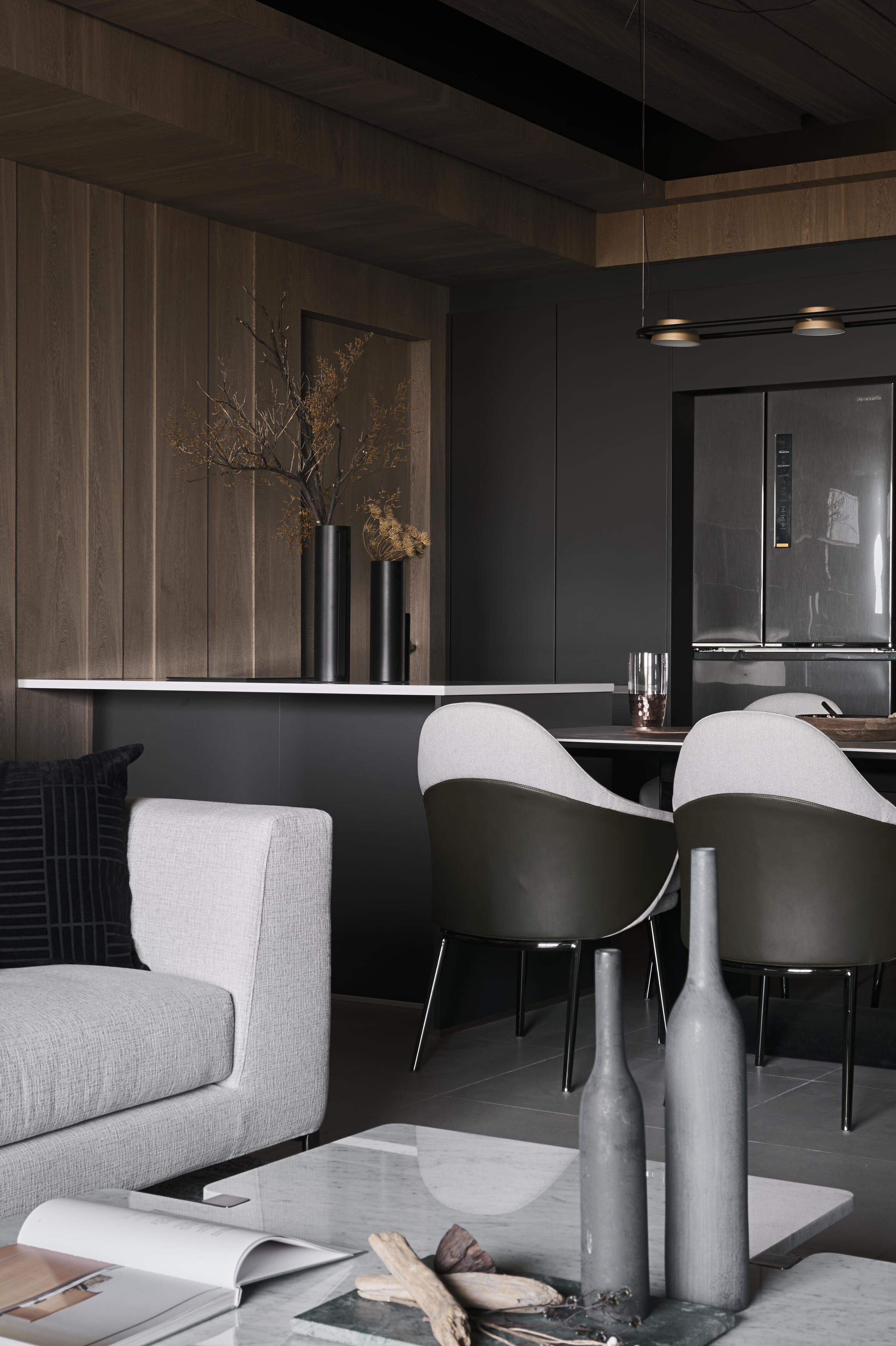 開放式的格局讓空間更顯開闊與自在。客廳、餐廳、書房等區域,在流暢的動線中自然串聯,不僅促進了家人間的互動交流,更讓陽光與空氣在空間中自由穿梭,為生活注入源源不絕的活力。金屬元素,如不鏽鋼、黃銅等,在木質基底上細膩點綴,為空間增添一抹低調的質感,這些金屬光澤,不僅提升了空間的層次,更巧妙地反射光線,讓室內更顯明亮與開闊。在這裡,生活與自然和諧共舞,譜寫出一曲寧靜而美好的樂章。