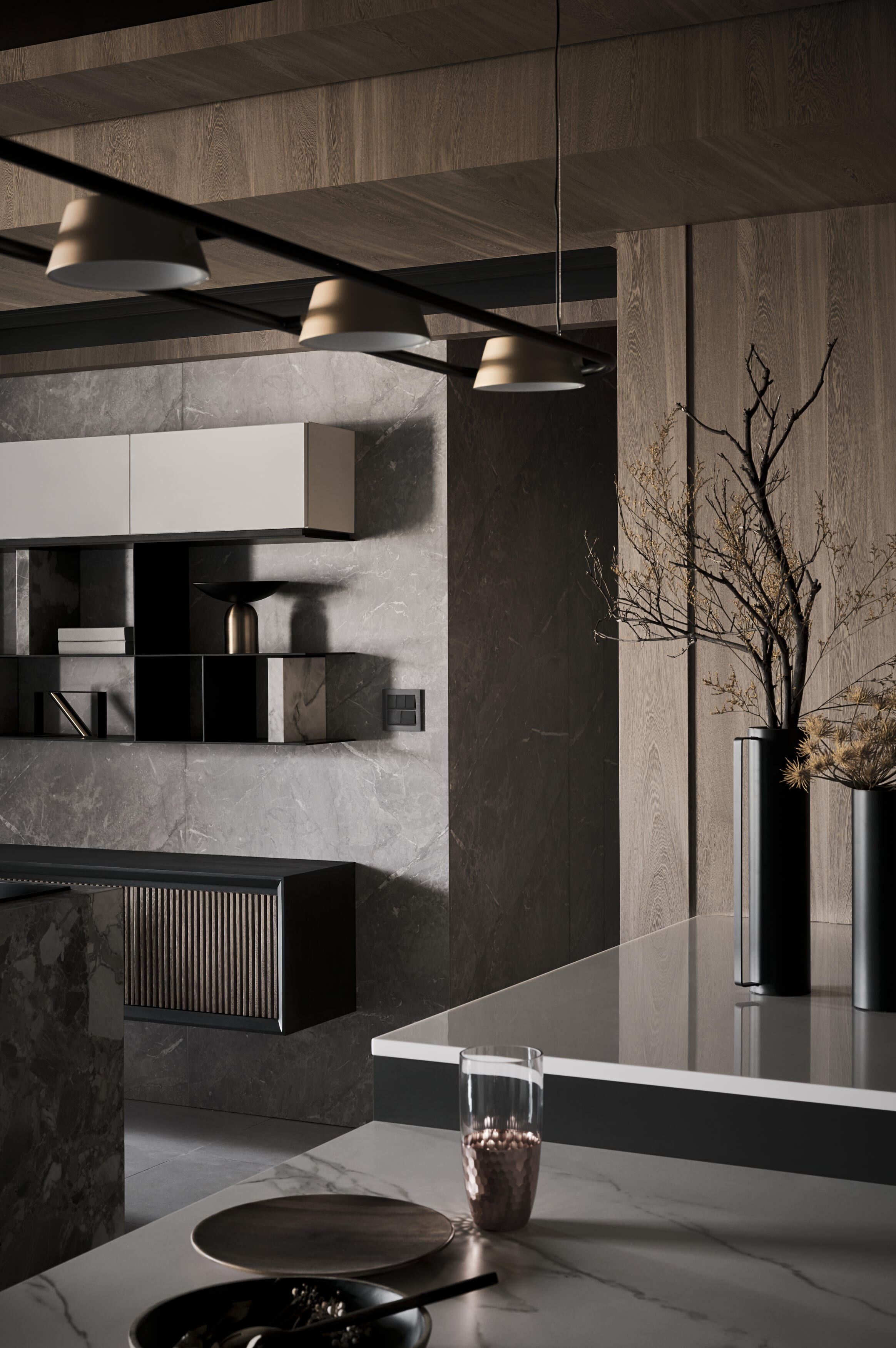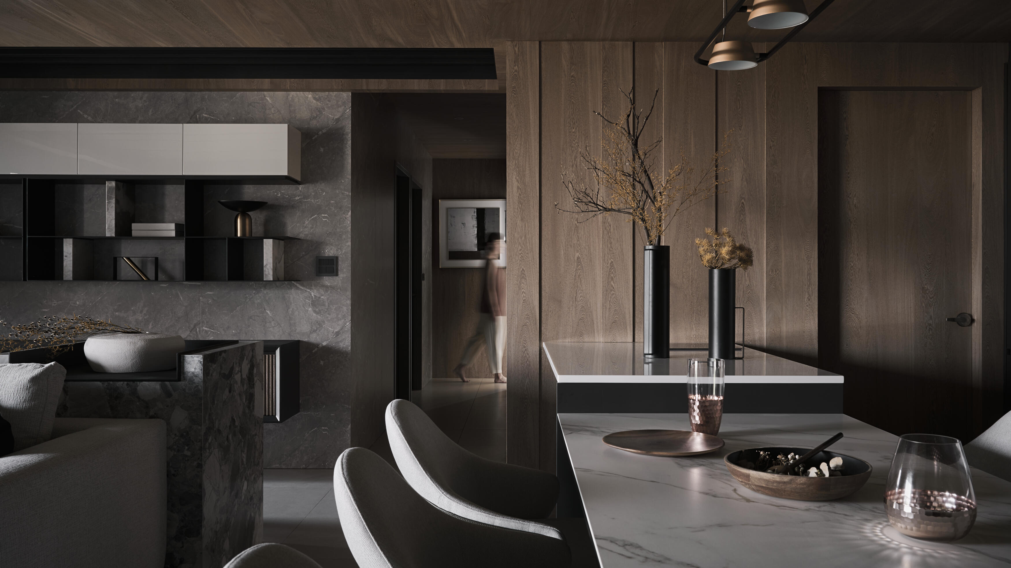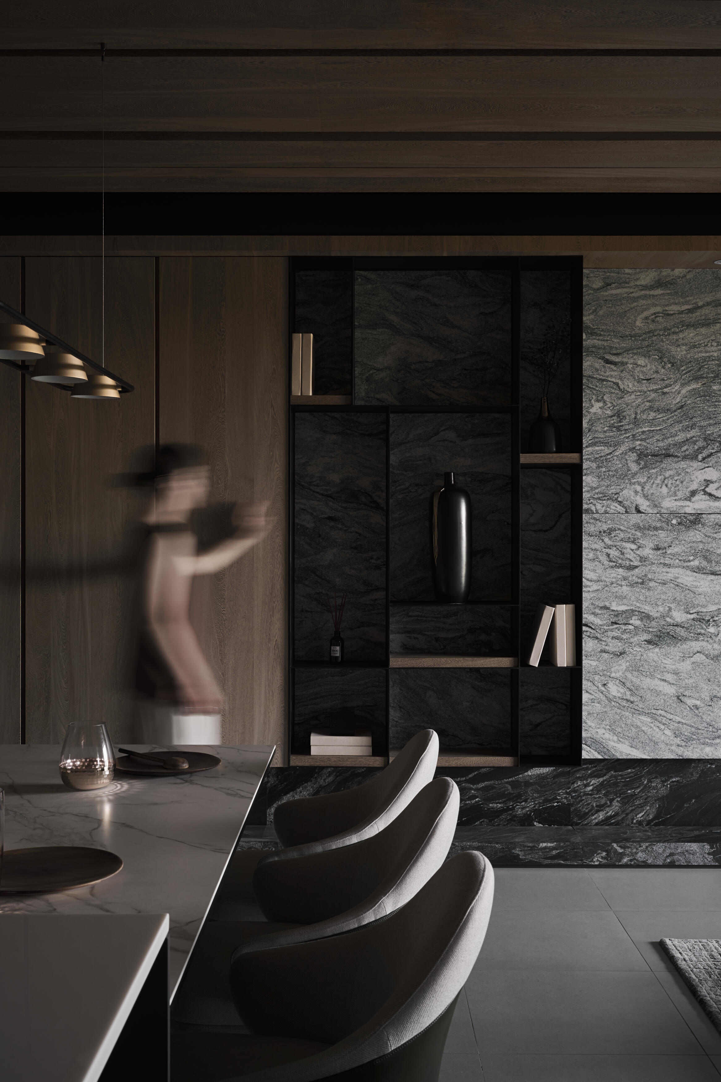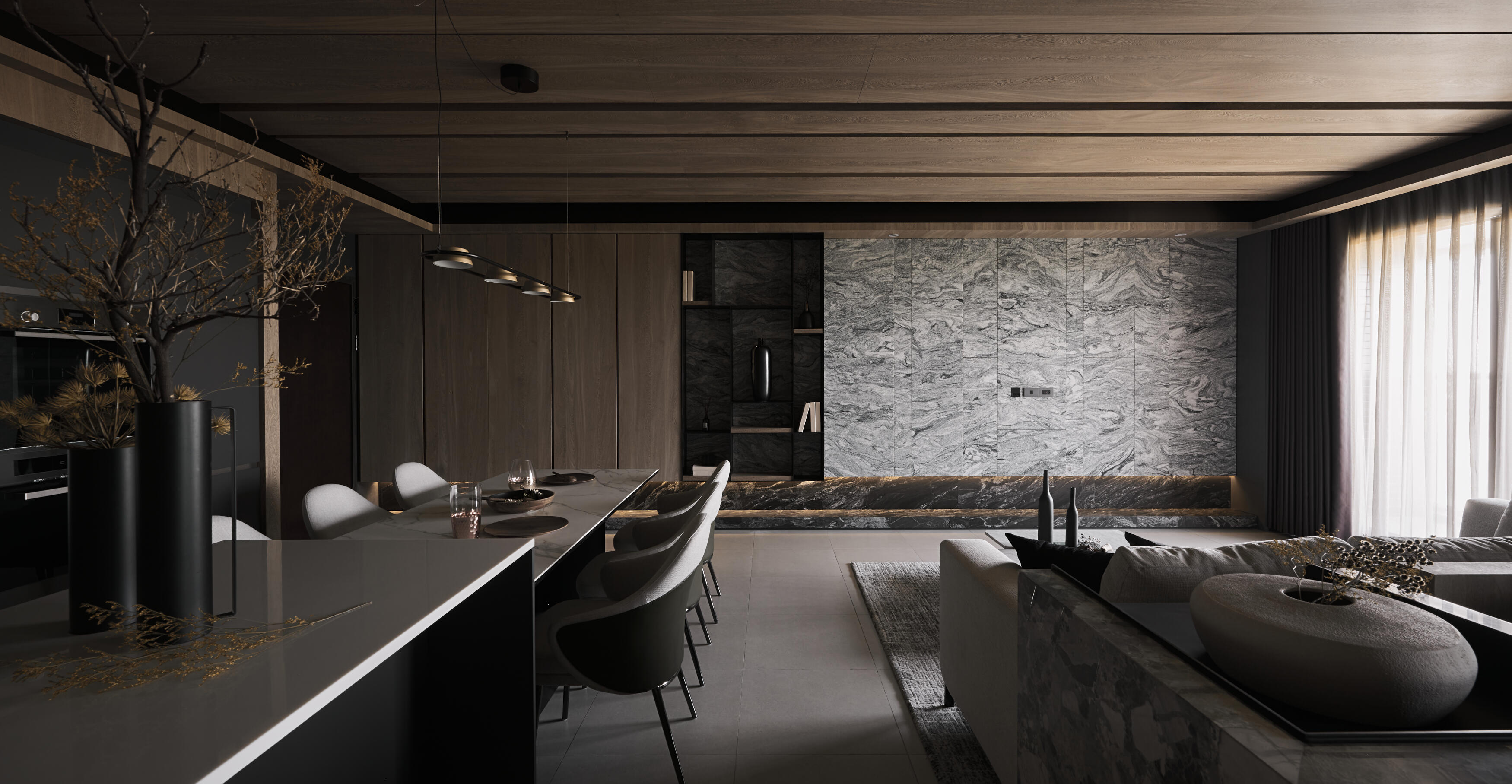 開放式的格局讓空間更顯開闊與自在。客廳、餐廳、書房等區域,在流暢的動線中自然串聯,不僅促進了家人間的互動交流,更讓陽光與空氣在空間中自由穿梭,為生活注入源源不絕的活力。金屬元素,如不鏽鋼、黃銅等,在木質基底上細膩點綴,為空間增添一抹低調的質感,這些金屬光澤,不僅提升了空間的層次,更巧妙地反射光線,讓室內更顯明亮與開闊。在這裡,生活與自然和諧共舞,譜寫出一曲寧靜而美好的樂章。