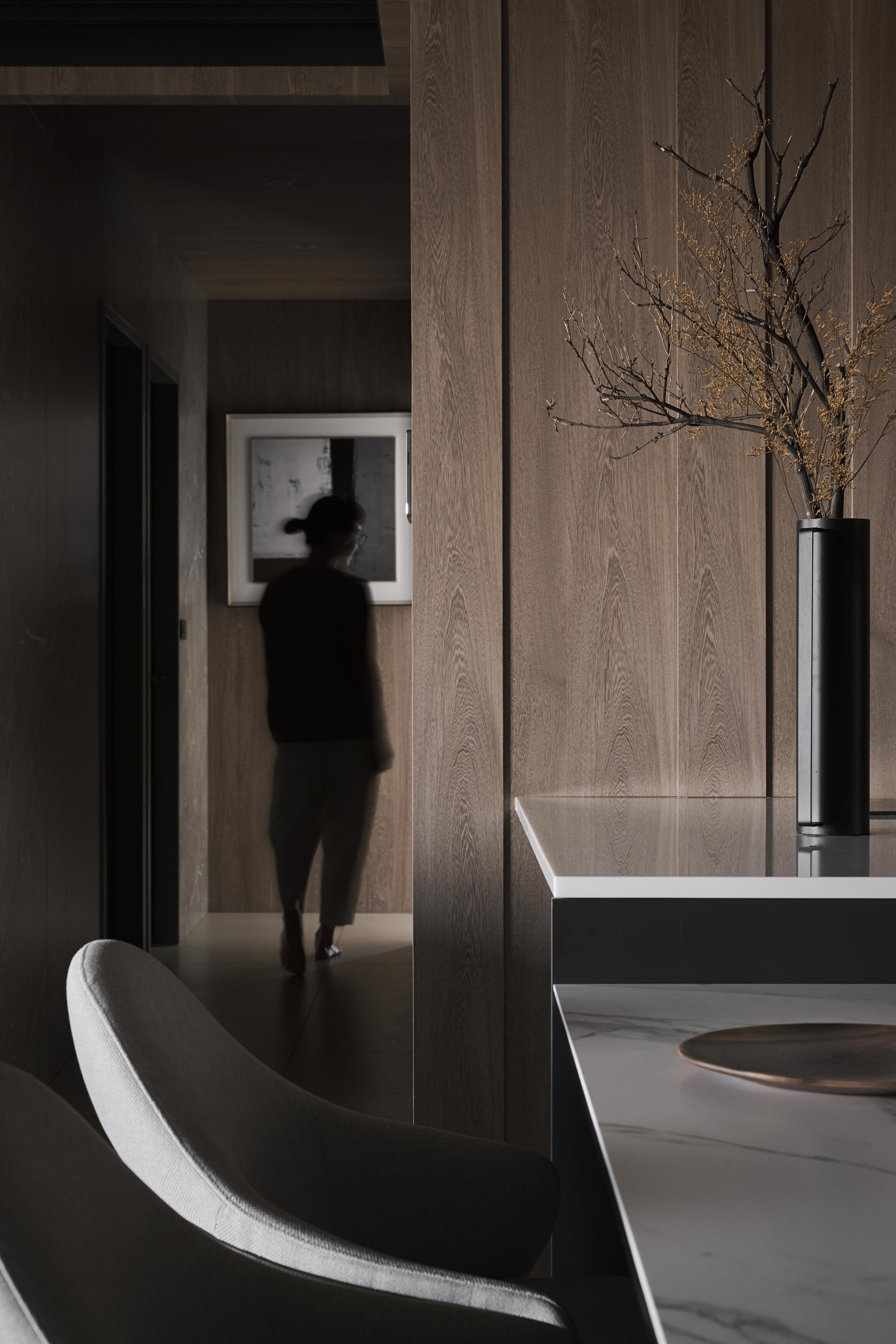 回歸自我的私密空間,溫柔的光線,如輕紗般灑落,撫平一天的疲憊;步入更衣室映入眼簾的是簡潔而有序的陳列,每一件衣物都安靜地待在屬於自己的位置,不再有匆忙的翻找,只有從容的搭配,以及對生活的細膩掌控。空間的基調是沉穩而內斂的大地色系,其間點綴著幾抹跳躍的色彩,像是生活中的驚喜,在平靜中注入一絲活力,提醒著我們保有對世界的好奇與熱情。