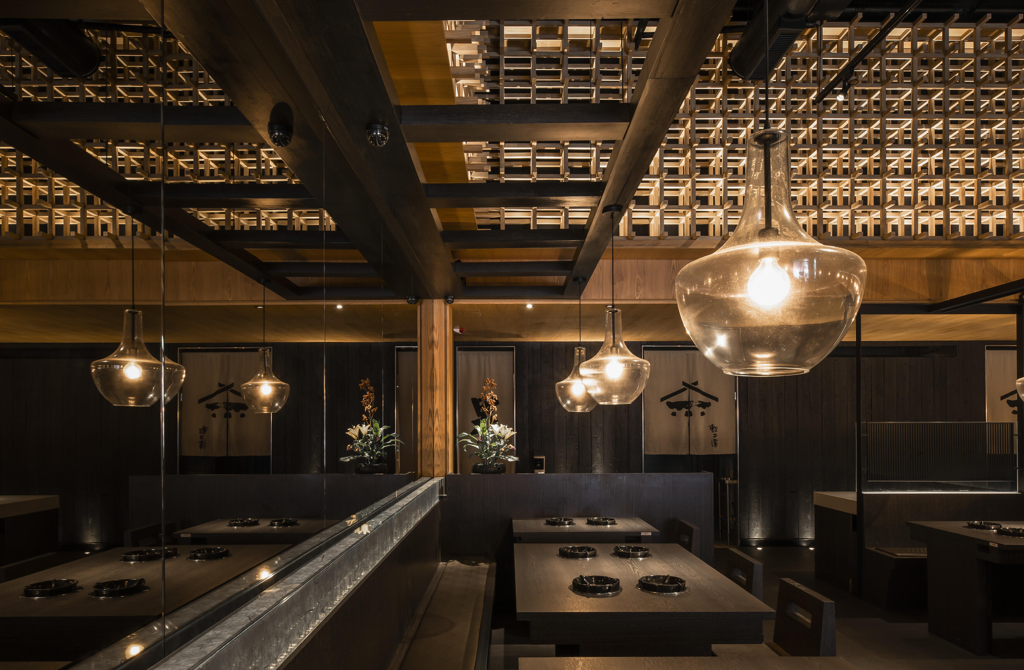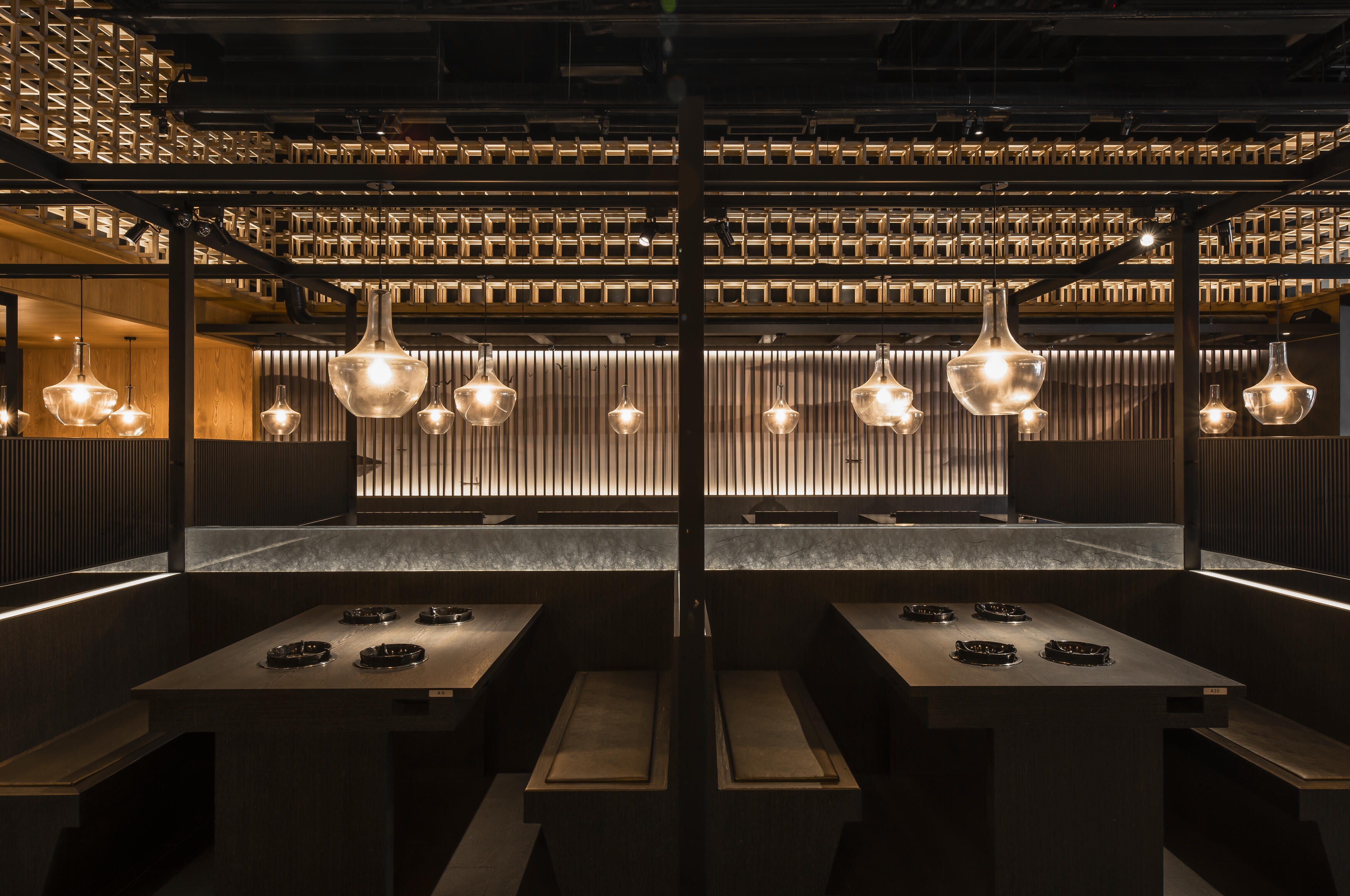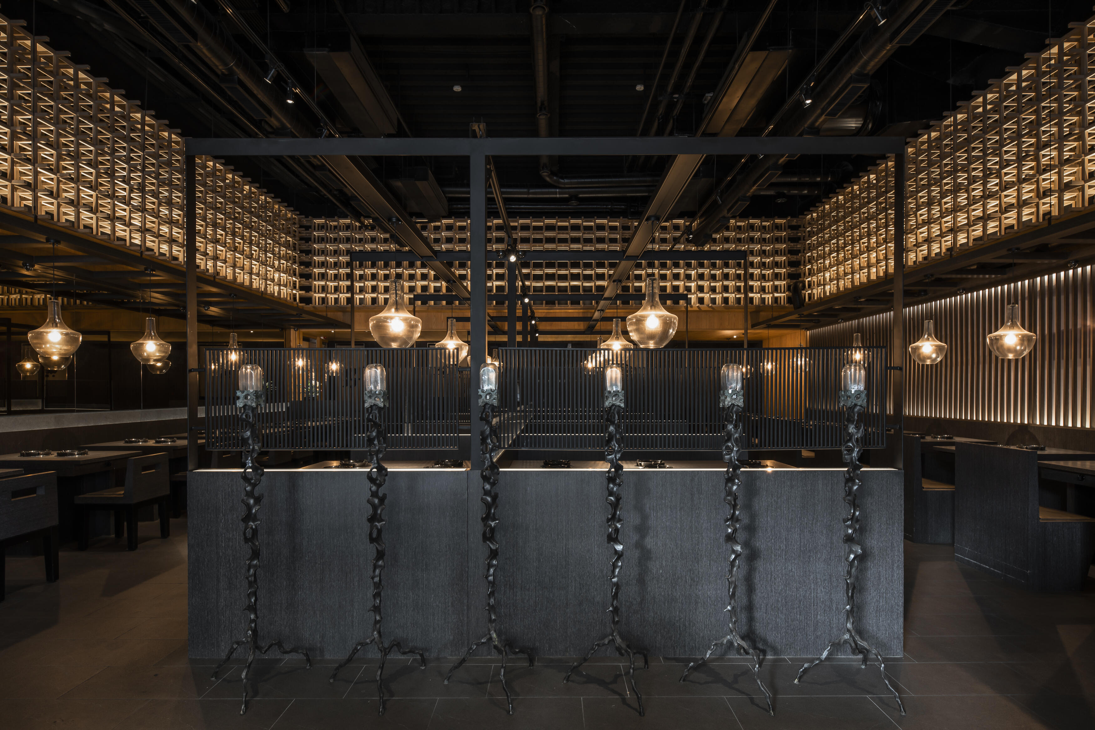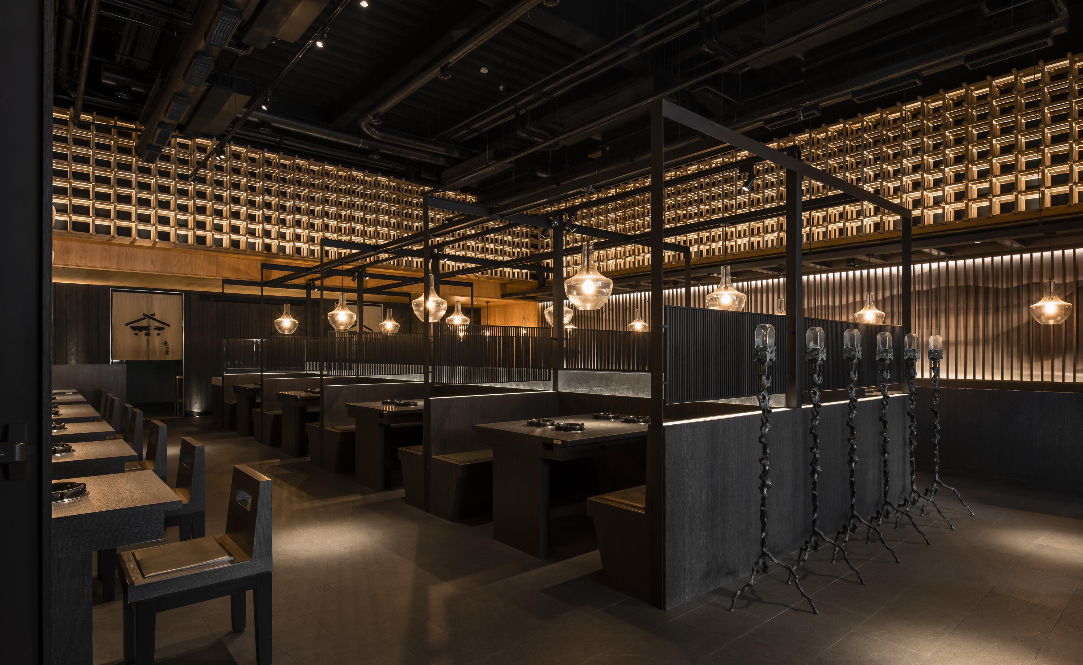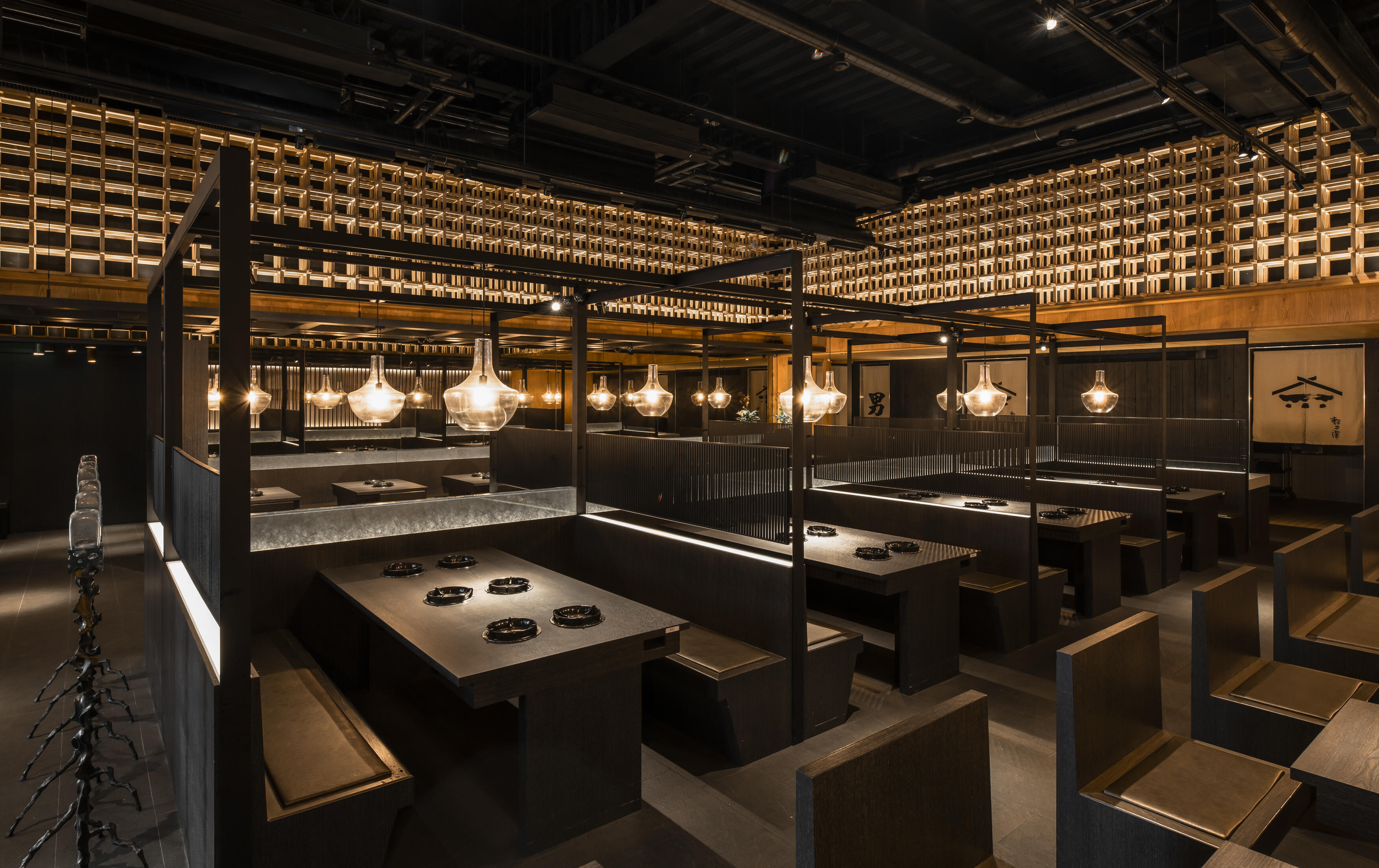 選材上結合了軟硬、冷暖的質材,如木皮的溫潤、布面的柔和、石材的堅實與鏡面的通透,佐以外界的陽光與綠意,共同創造出獨一無二的風景。每一個細節,都旨在展現材質本身的獨特肌理和原色,營造出沉穩內斂,卻又帶著奔放不羈的用餐氛圍。在這裡,不僅是品嚐火鍋的美味,更是一場關於美學、關於自然、關於人與人連結的深度體驗。
