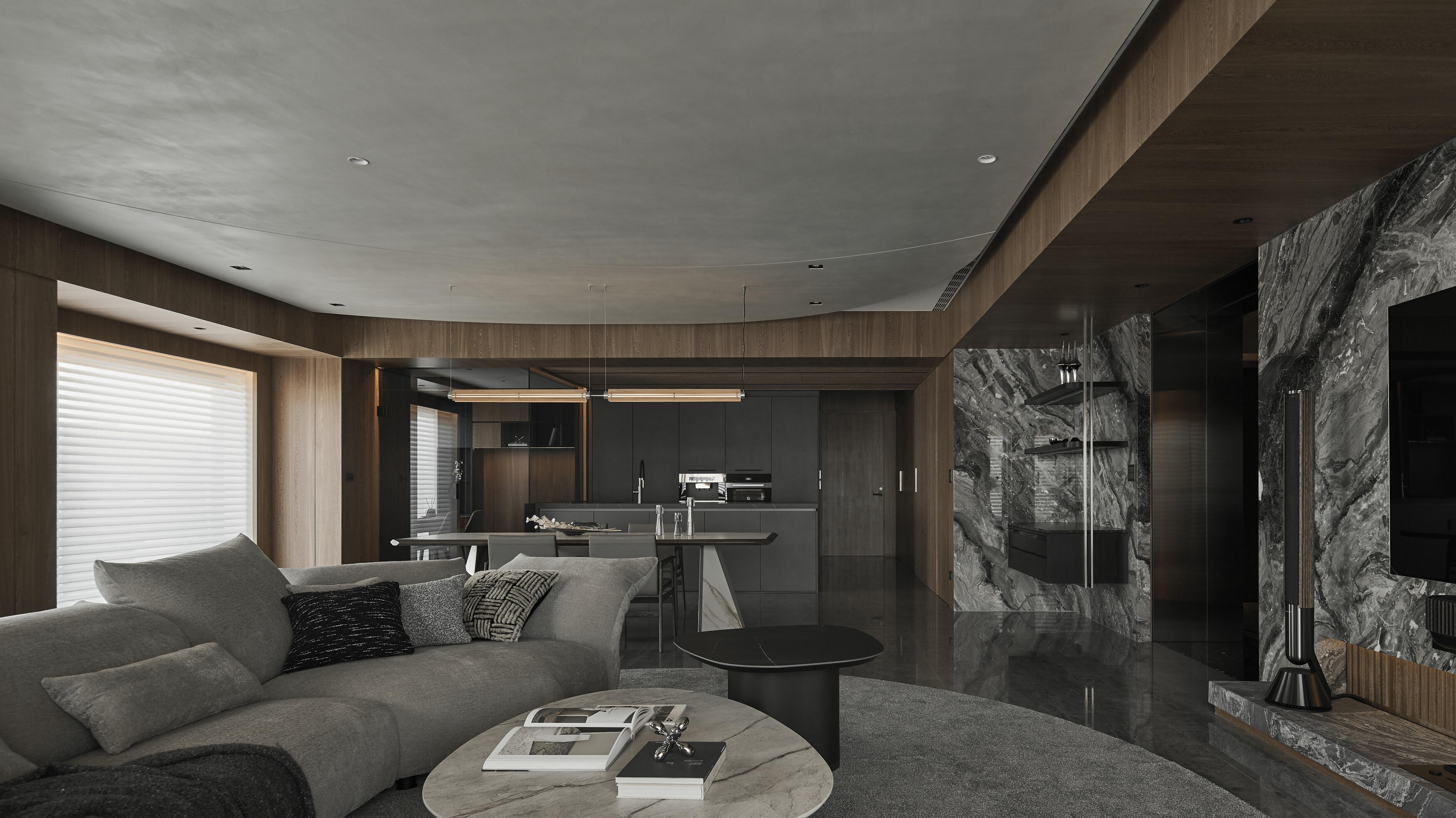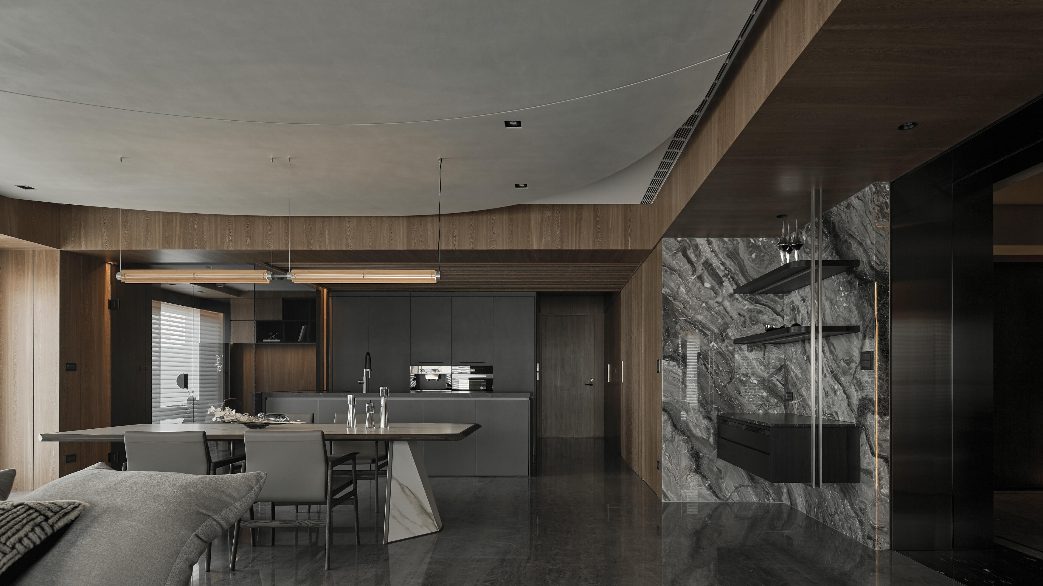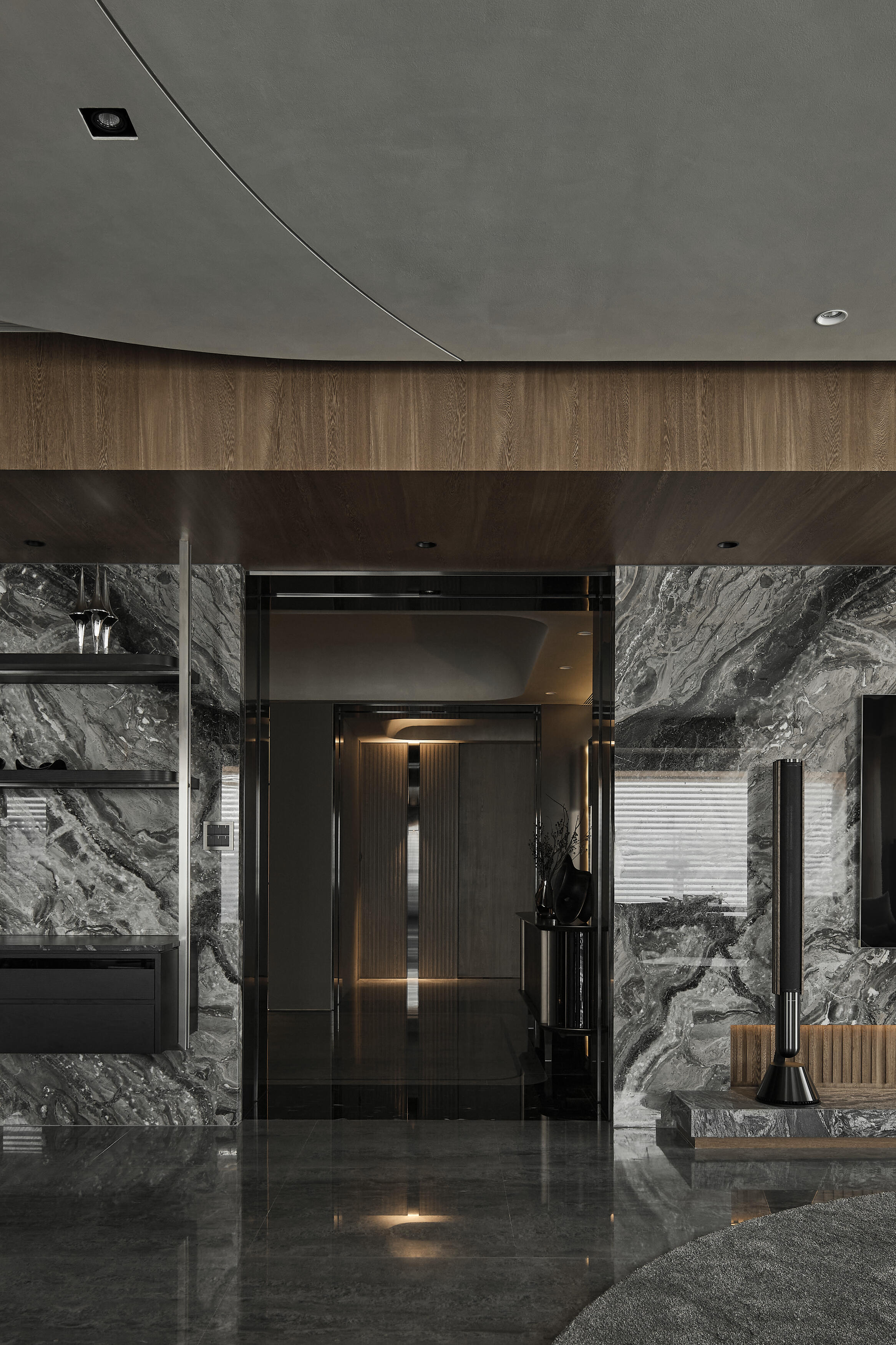石材的冷冽質感與木質的溫潤細膩相互交織,在沉穩內斂的空間基調中,淬鍊出低調而迷人的奢華感。無論是客廳的電視牆,抑或是溫潤的木質收納櫃,以及點綴其間的鍍鈦金屬細節,共同營造出層次豐富的視覺饗宴,構築出兼具宏闊氣度與自在愜意的空間印象。