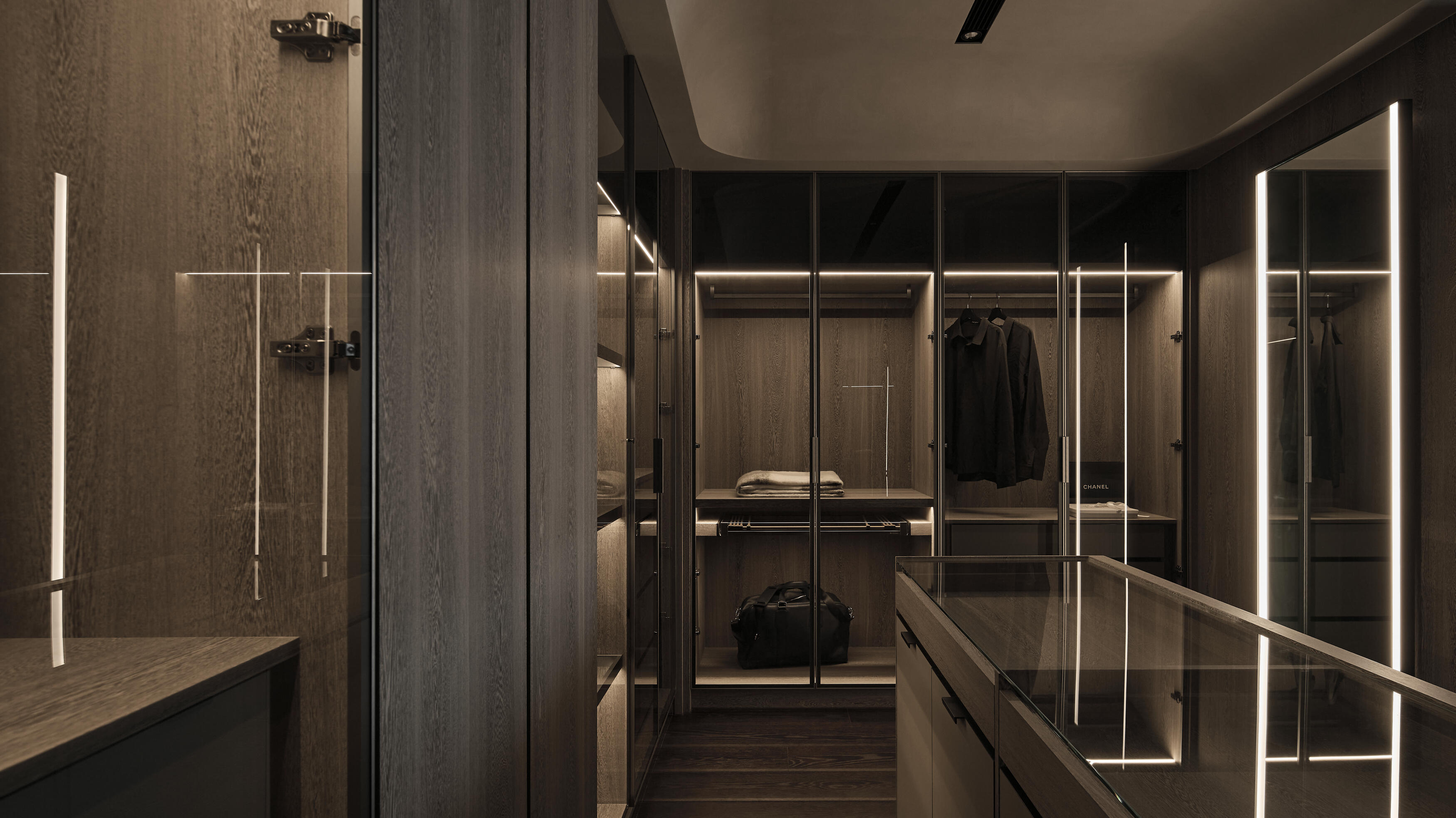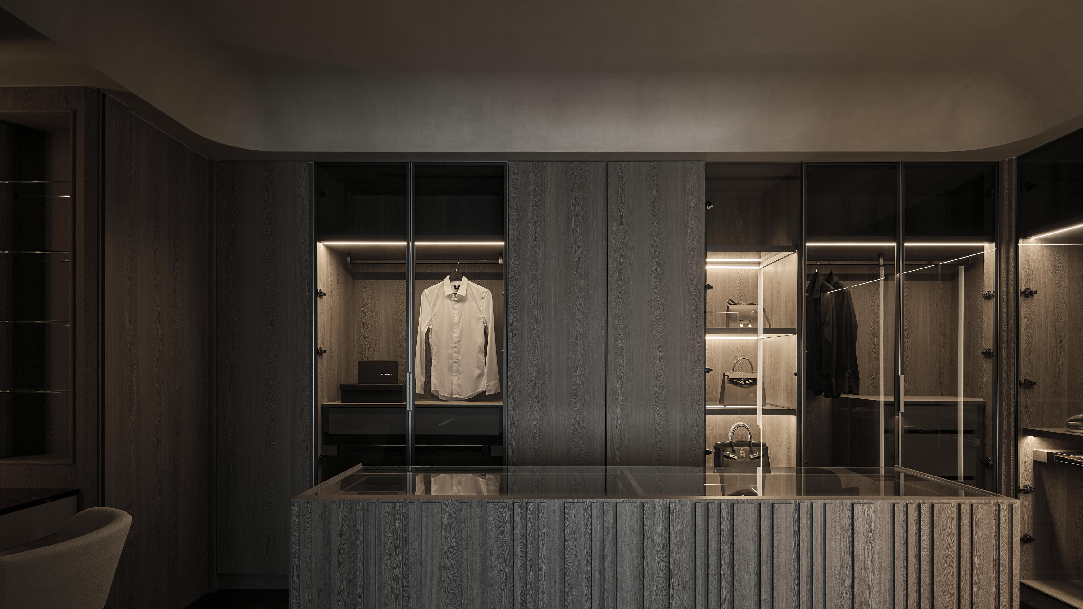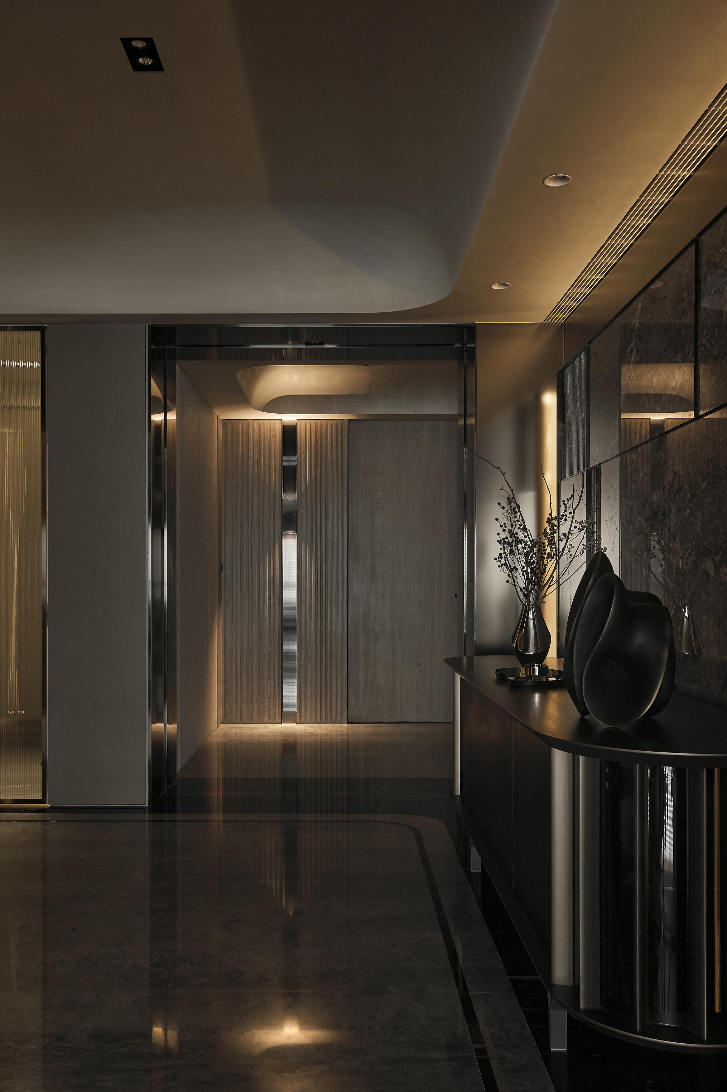 石材的冷冽質感與木質的溫潤細膩相互交織,在沉穩內斂的空間基調中,淬鍊出低調而迷人的奢華感。無論是客廳的電視牆,抑或是溫潤的木質收納櫃,以及點綴其間的鍍鈦金屬細節,共同營造出層次豐富的視覺饗宴,構築出兼具宏闊氣度與自在愜意的空間印象。