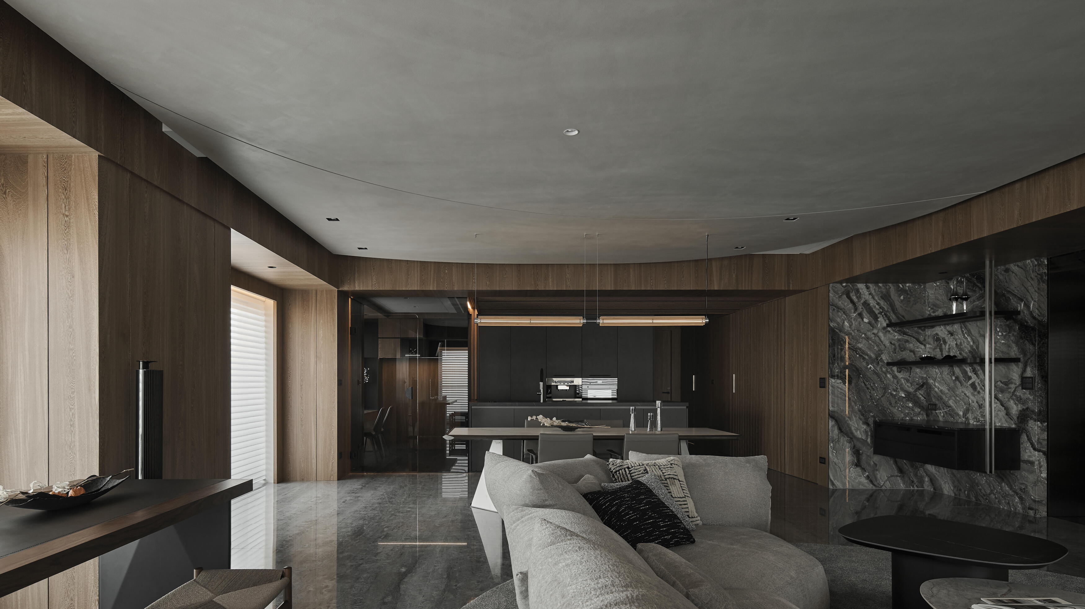抬頭仰望,天花板設計跳脫了傳統的框架,以流暢的曲線雕塑出水波漫延的意象,為原本沉穩的空間注入了一絲輕盈的柔美與動態之美。