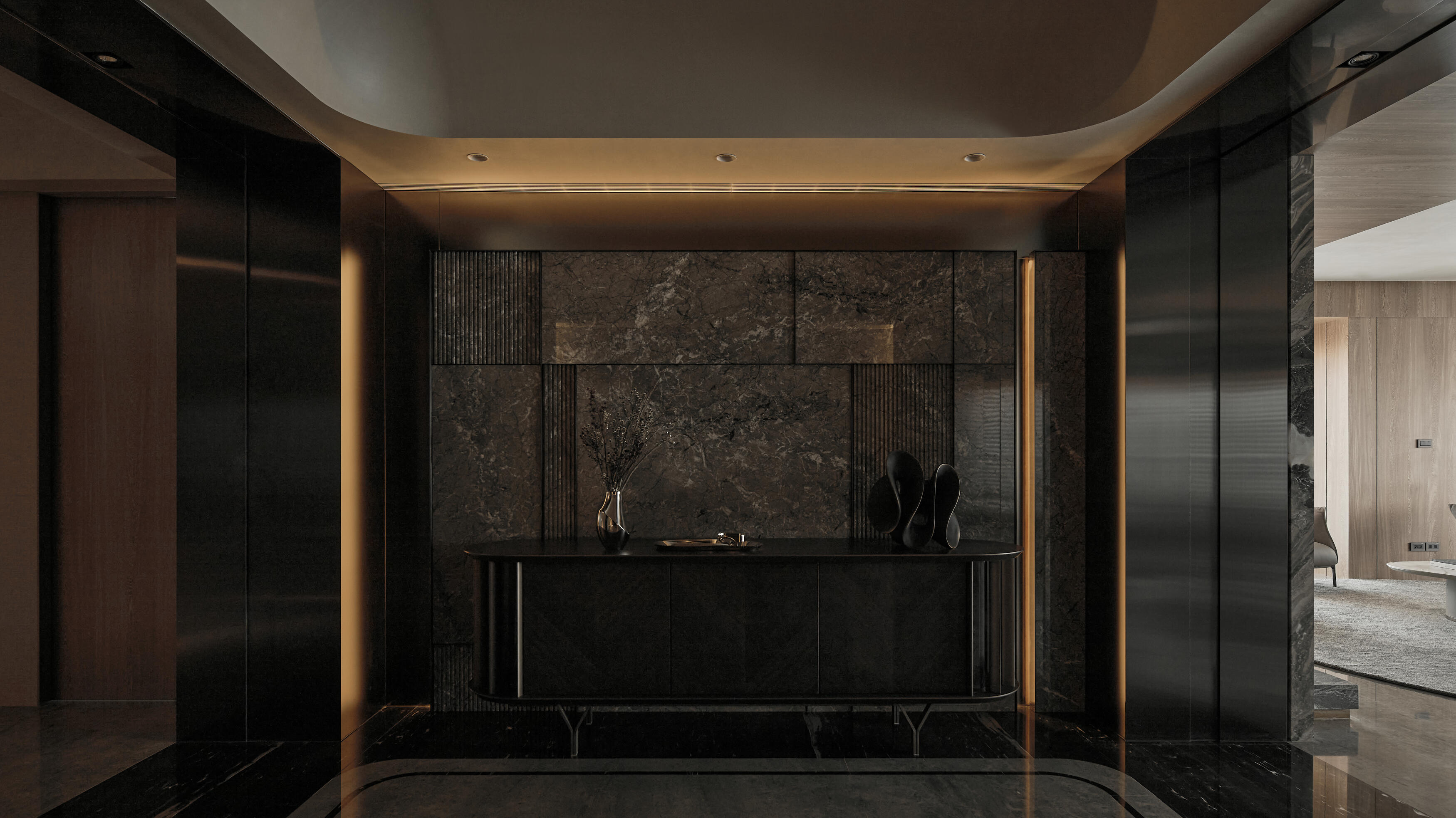 玄關是開啟美好序幕的優雅前奏,推開家門,敞亮的空間布局映入眼簾,一股開闊氣度油然而生,運用石材的沉穩內斂與鍍鈦金屬的精緻光澤,共同鋪敘出大器而現代的空間氛圍。兩側的隱藏式櫃體設計,在無形之中滿足了收納需求,維持了立面的簡潔俐落,也為歸家時刻帶來一絲清爽。視線盡頭一隅精緻的端景櫃,於細節處提升空間的視覺質感。
