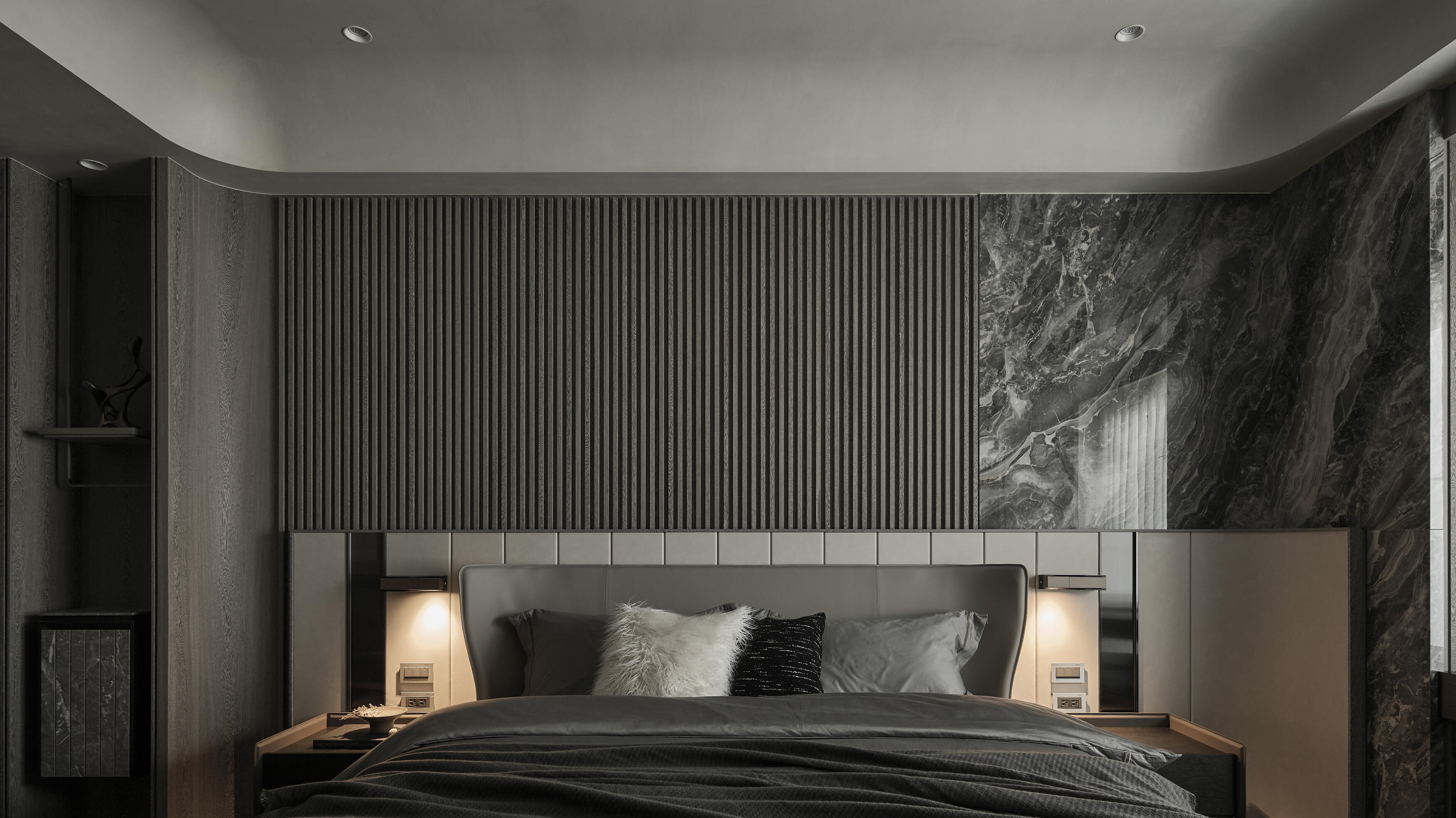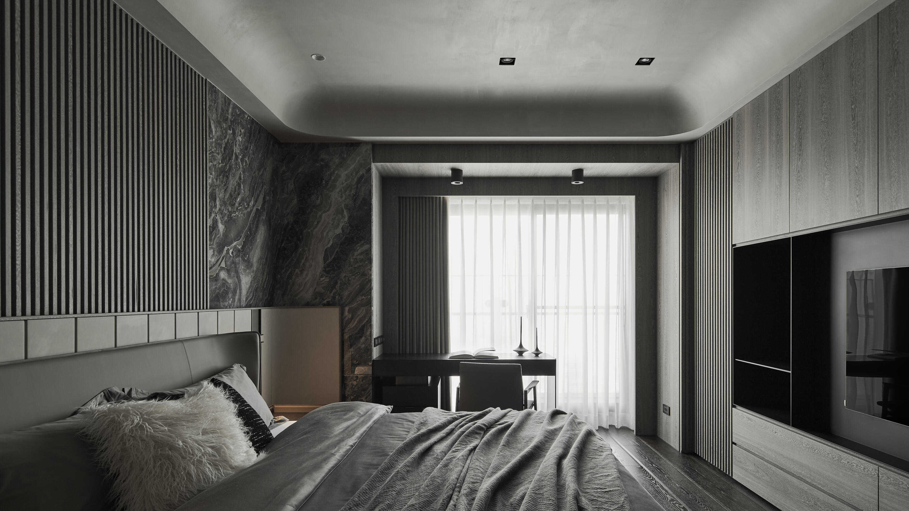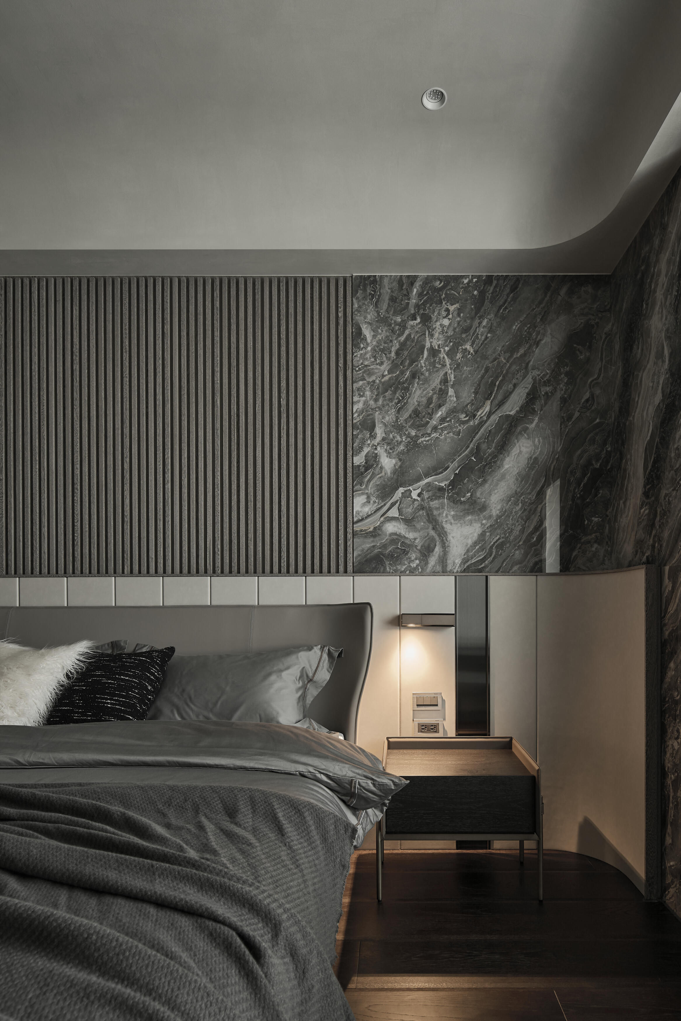 相較於開闊的公共空間,臥室區域則被悉心規劃為一方獨立而靜謐的休憩場域。透過地坪材質的細膩轉換,巧妙劃分出空間的屬性,營造出更為沉穩安定的睡眠氛圍。主臥室延續公領域設計語彙,以中性灰色調為基底,透過比例分割塑造俐落質感,格柵的線條與石材的肌理在此相互映襯,在簡約中流露出細膩的質感。