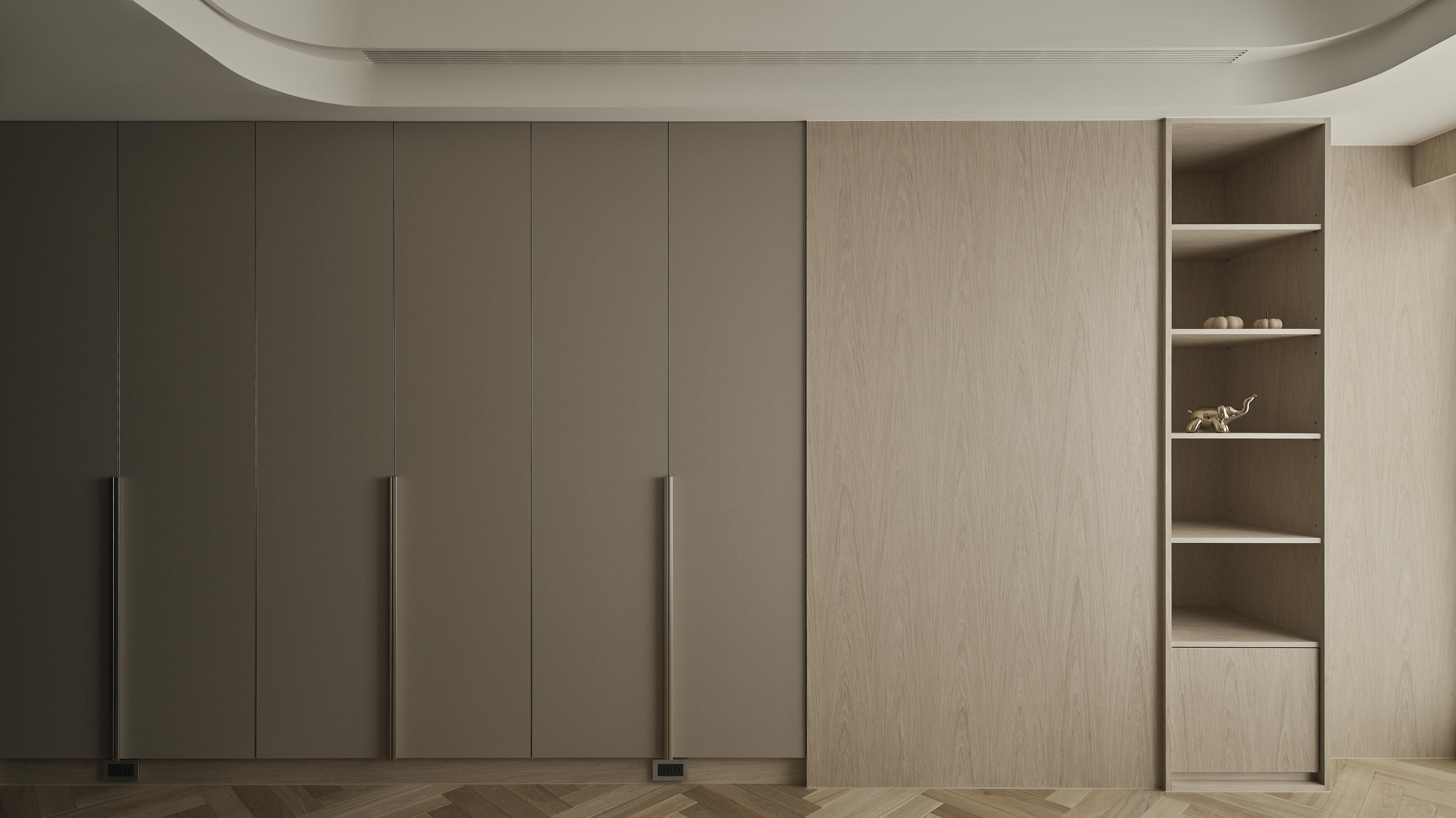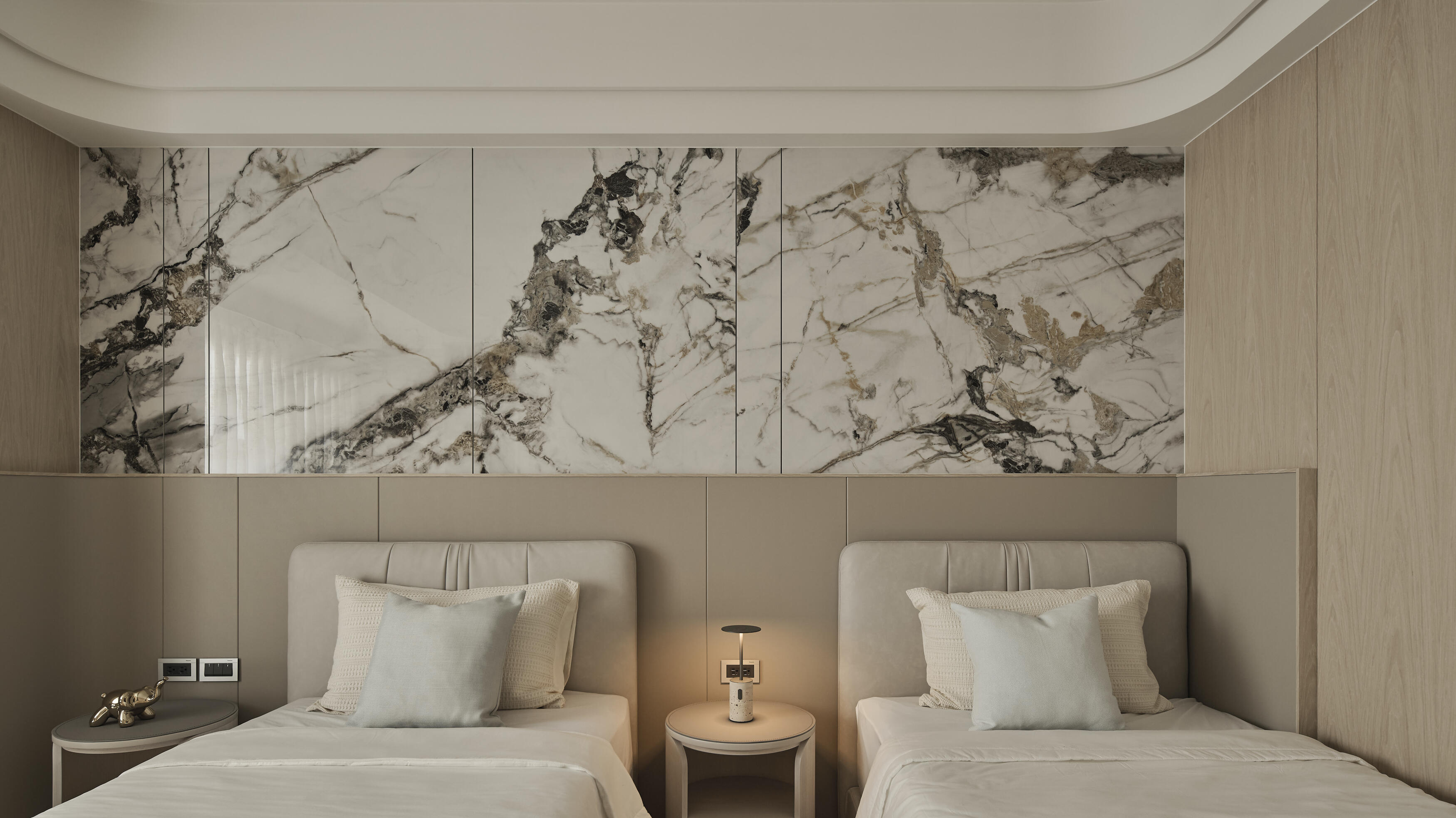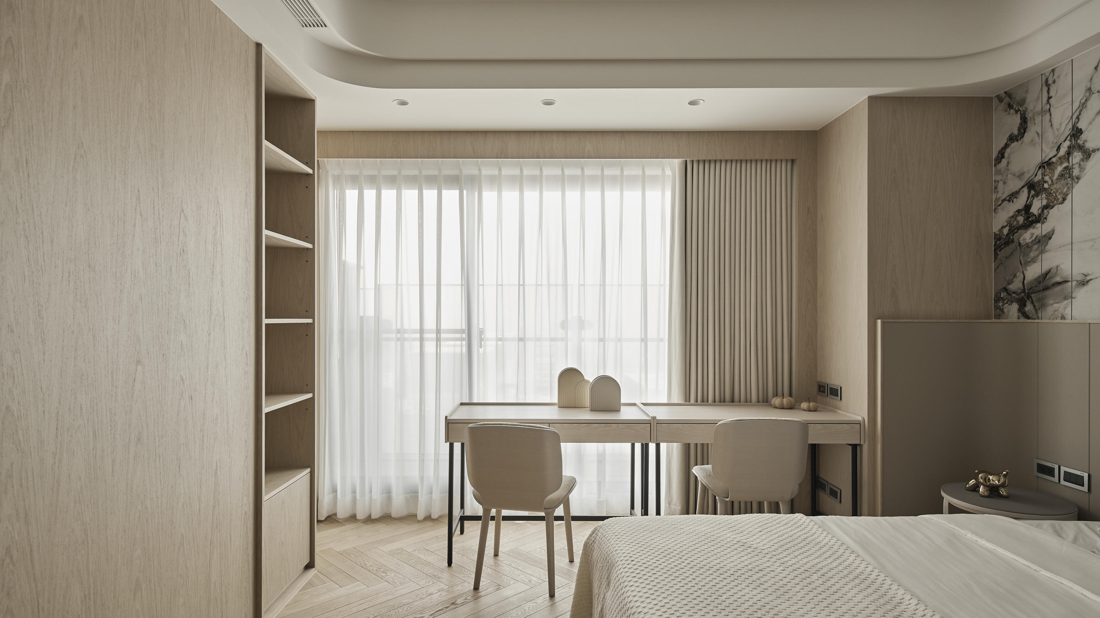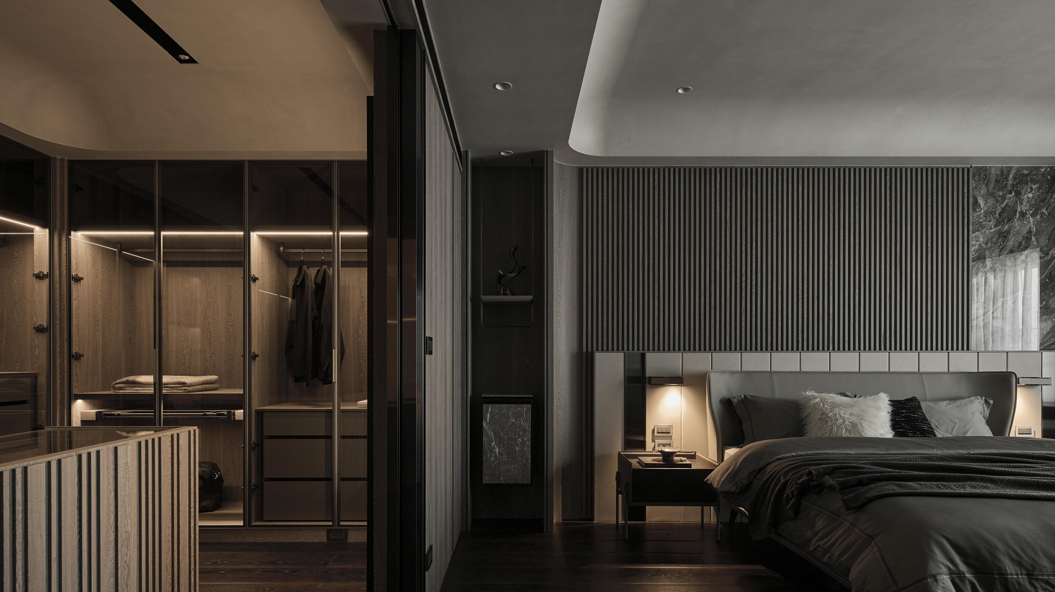 相較於開闊的公共空間,臥室區域則被悉心規劃為一方獨立而靜謐的休憩場域。透過地坪材質的細膩轉換,巧妙劃分出空間的屬性,營造出更為沉穩安定的睡眠氛圍。主臥室延續公領域設計語彙,以中性灰色調為基底,透過比例分割塑造俐落質感,格柵的線條與石材的肌理在此相互映襯,在簡約中流露出細膩的質感。