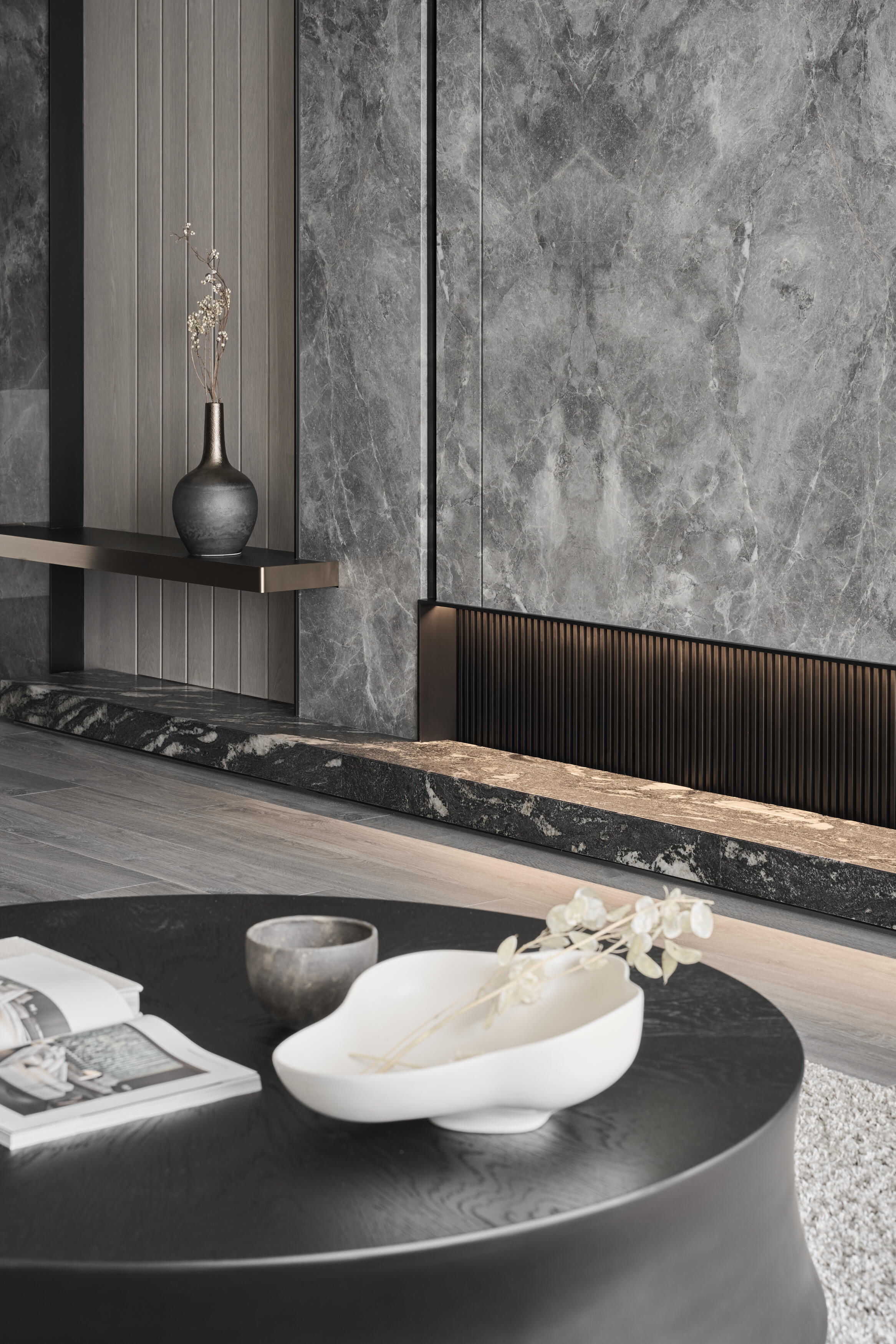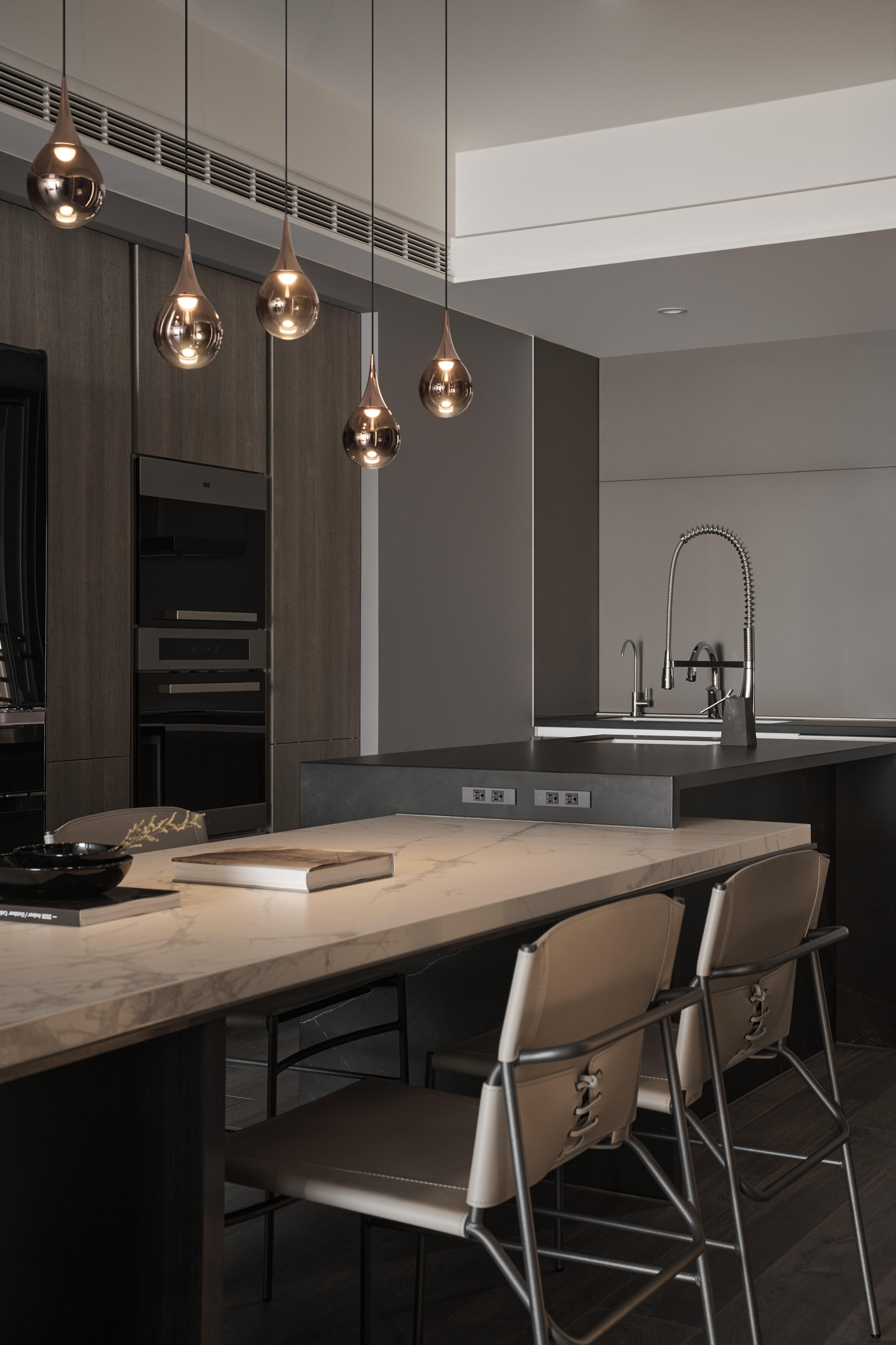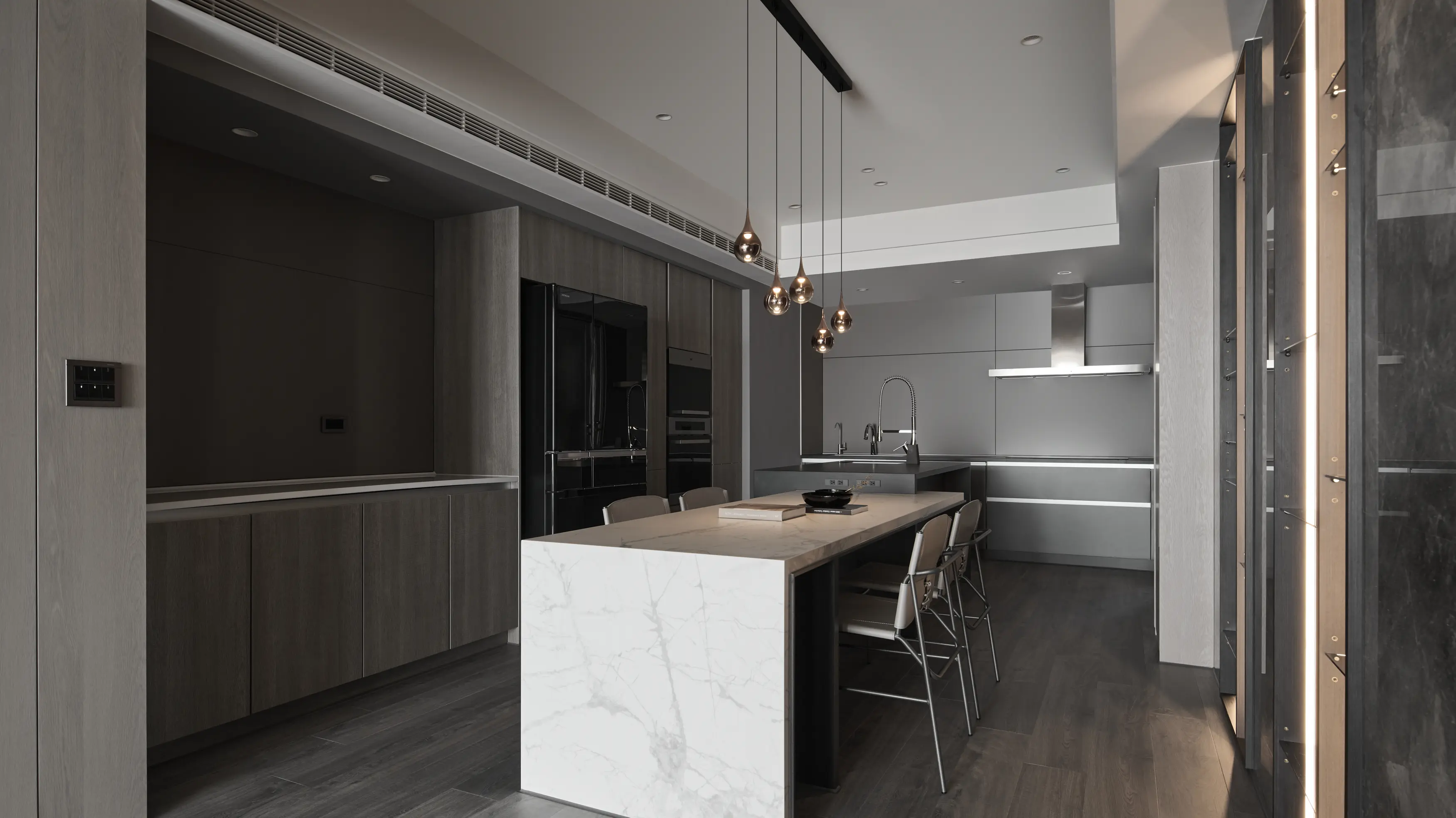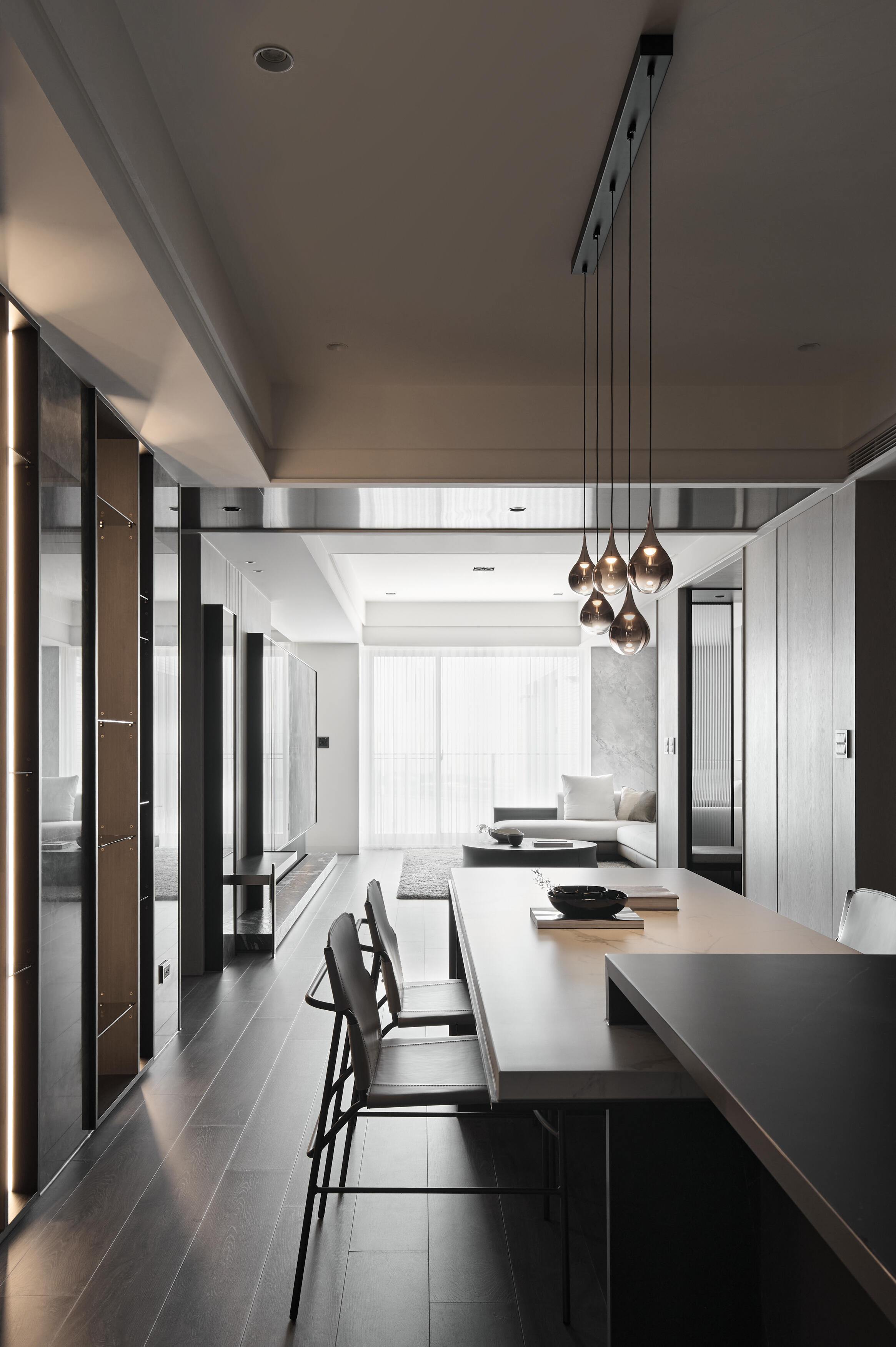 客廳以淡雅的色調營造舒適氛圍,考量屋主希望擁有可擺放鋼琴及閱讀的空間,我們巧妙地運用一道半高電視牆,自然劃分客廳與書房區域,同時拉長牆面,形成一道優雅的端景。電視牆的設計不僅區隔空間,適當的留白引導視線穿梭,使客廳、餐廳、廚房等公共區域相互串聯,創造流暢的空間動線與開闊的視覺感受。開放式的餐廚空間是家人互動交流的重要場域。中島檯面以灰色薄板覆蓋,與餐桌巧妙結合,透過前後交錯的立體造型,展現豐富的設計層次。