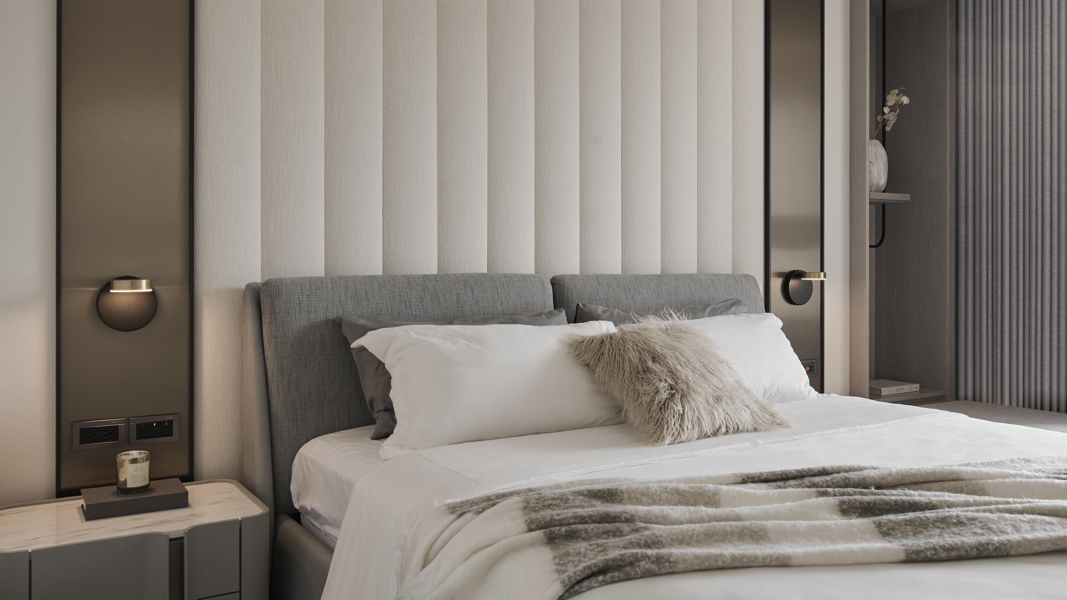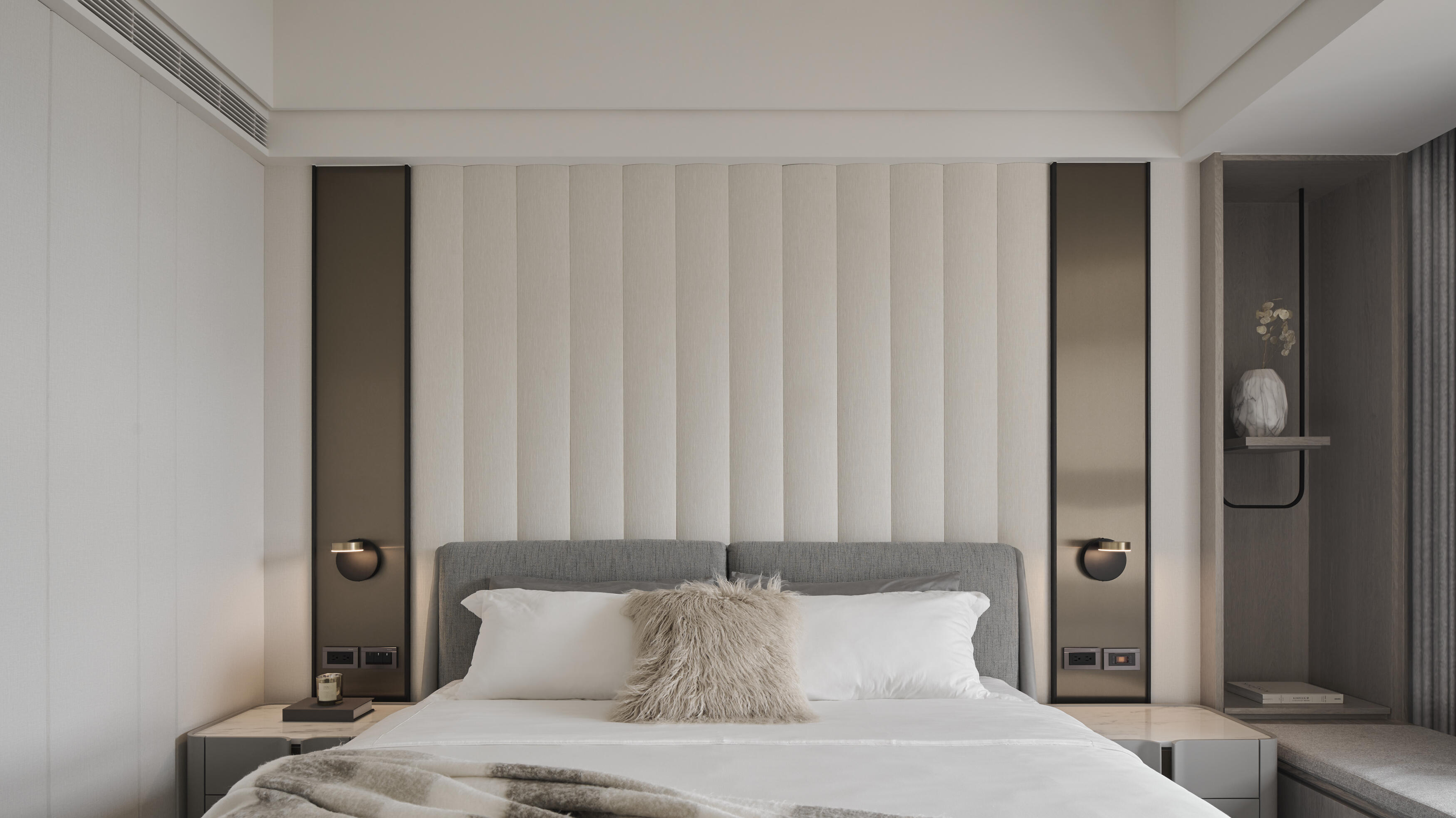 素淨的主臥空間延續了公共區域的設計語彙,以更為柔和的木質色調為主軸,並以鍍鈦金屬點綴,增添空間的活力。窗邊設置了舒適的臥榻區,提供屋主休憩、賞景的空間。床頭背板則以弧形繃布拼接而成,搭配兩側造型別緻的壁燈,營造寧靜舒適的睡眠氛圍。透過簡約的設計手法搭配自然的材質運用,在素色畫布上輕描淡寫,勾勒出簡潔有力的視覺畫面,襯托出窗外豐富多變的海景,為空間注入一抹人文氣息,感受海風的吹拂、陽光的照耀,在寧靜的氛圍中,感受生活的美好。
