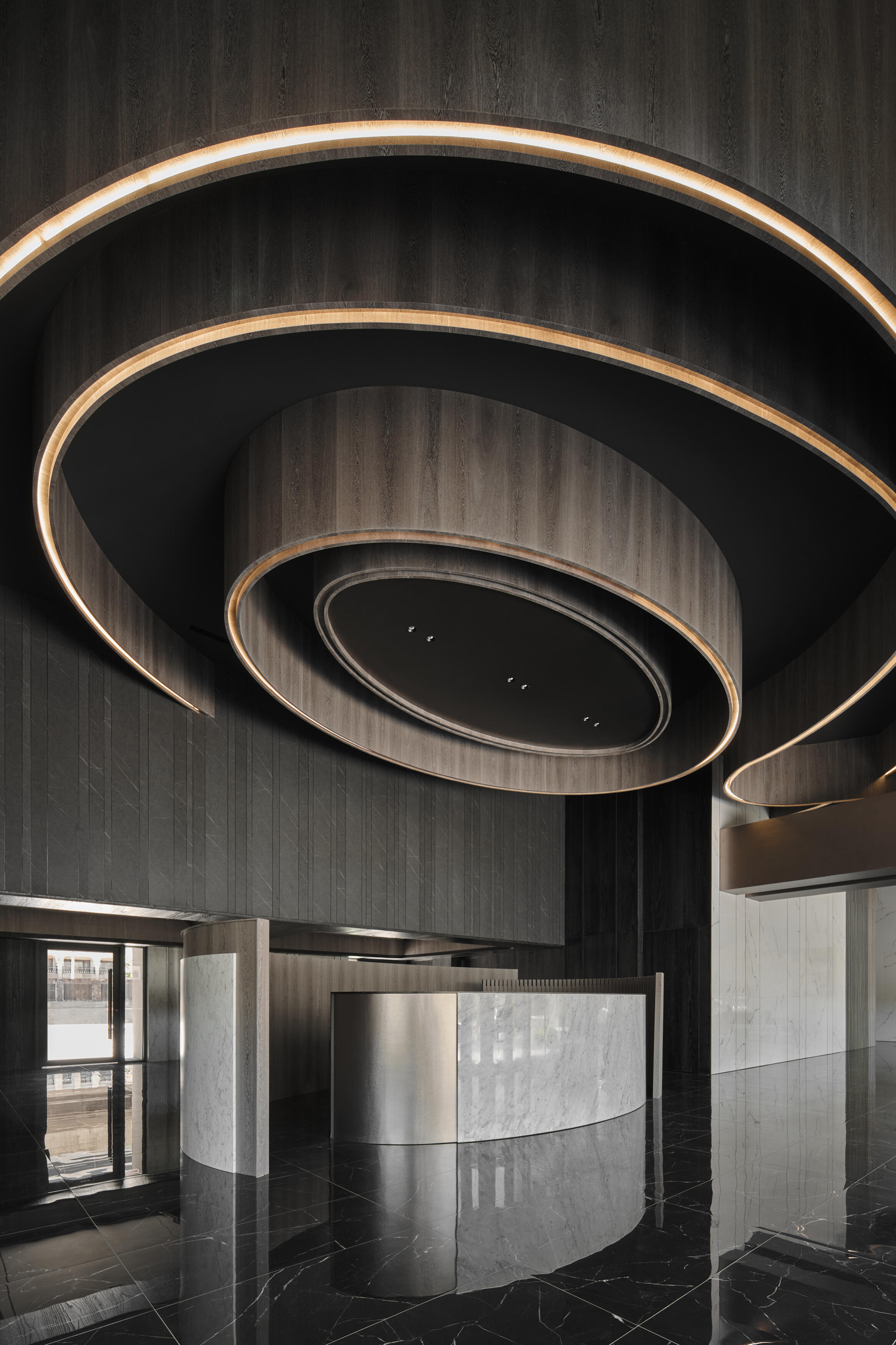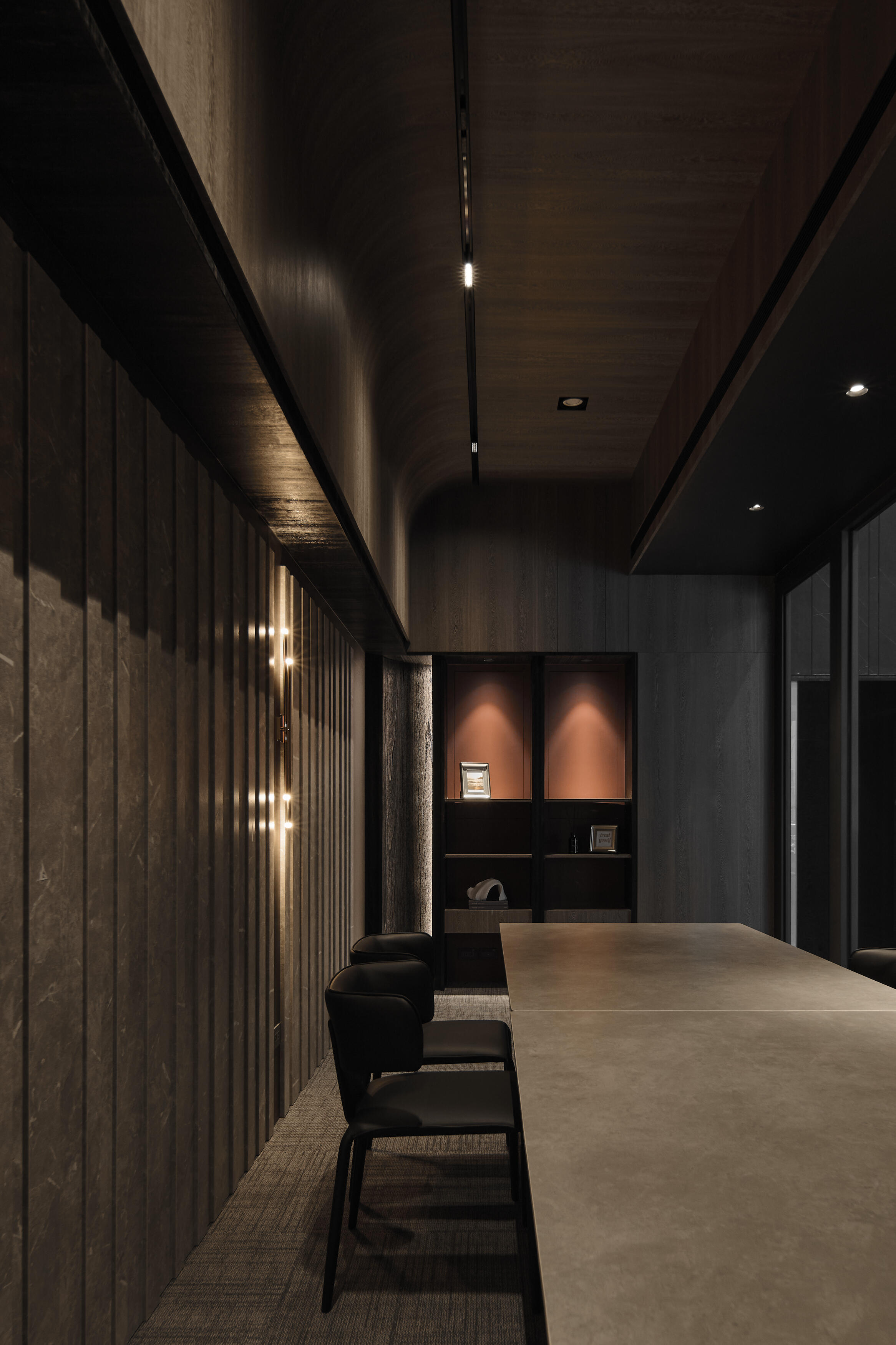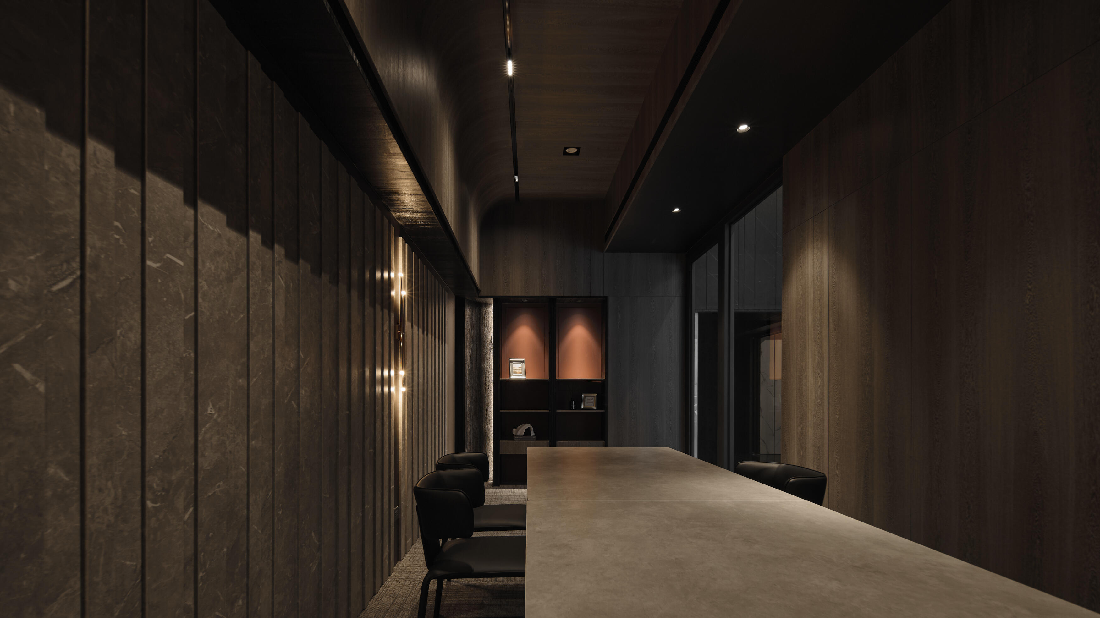在寬闊的場域中,如何界定空間,同時讓整體保有延伸及通透性,成為設計的挑戰,我們以線條打造蜿蜒河流般的天花串聯整體空間,讓視線得延伸,營造出開闊的空間感。立面透過石紋、木皮、金屬等天然的材質,藉由拼貼、切割等不同的手法,堆疊層次,讓空間的線條更加飽滿,呈現公共空間應有的磅礡氣勢。