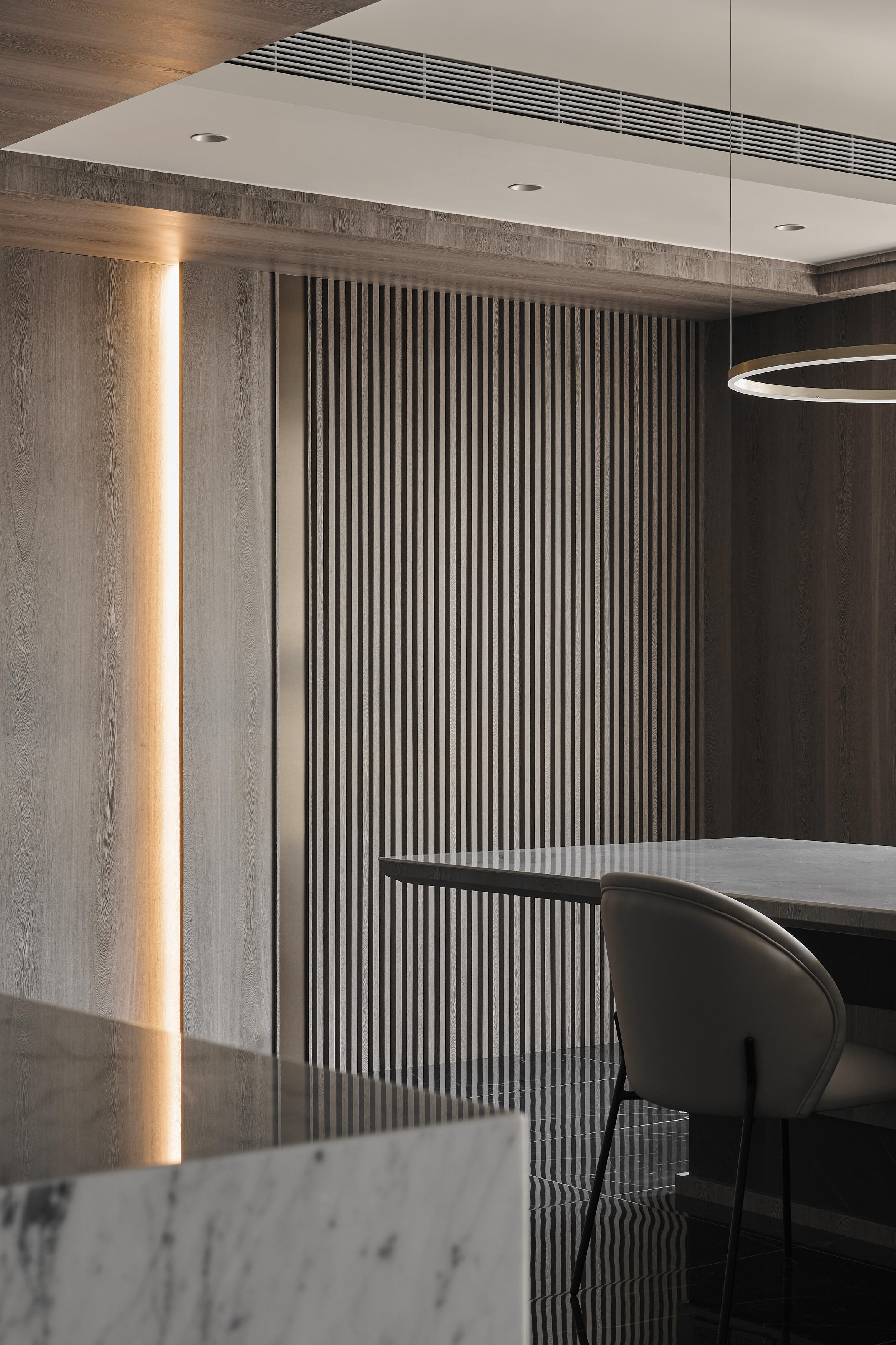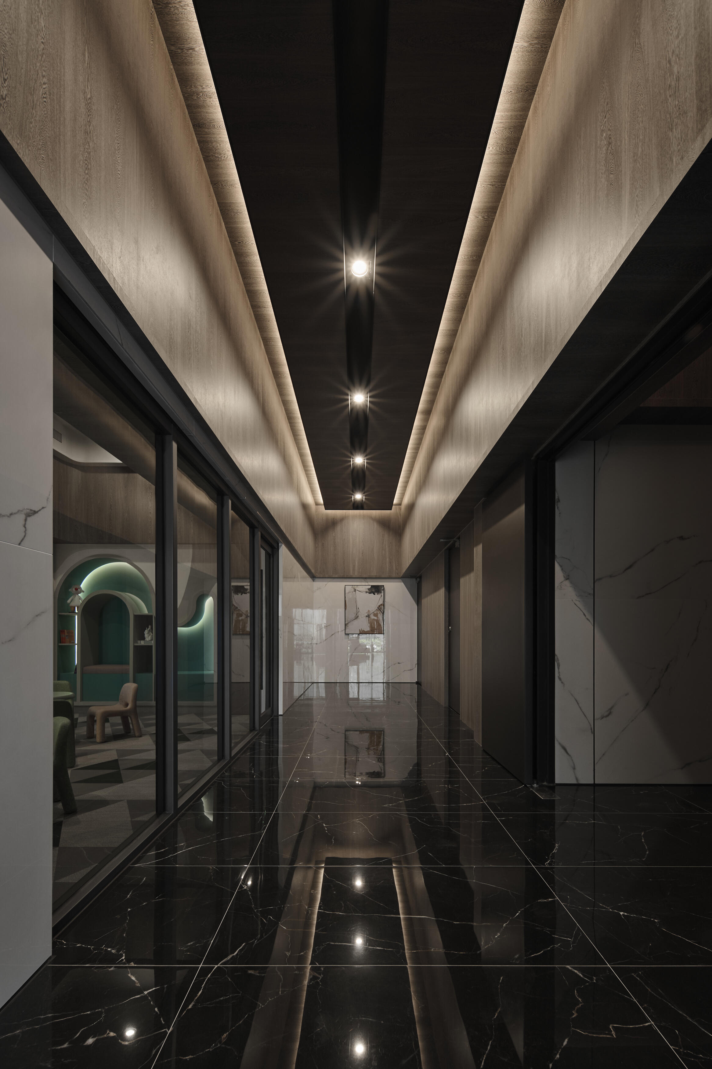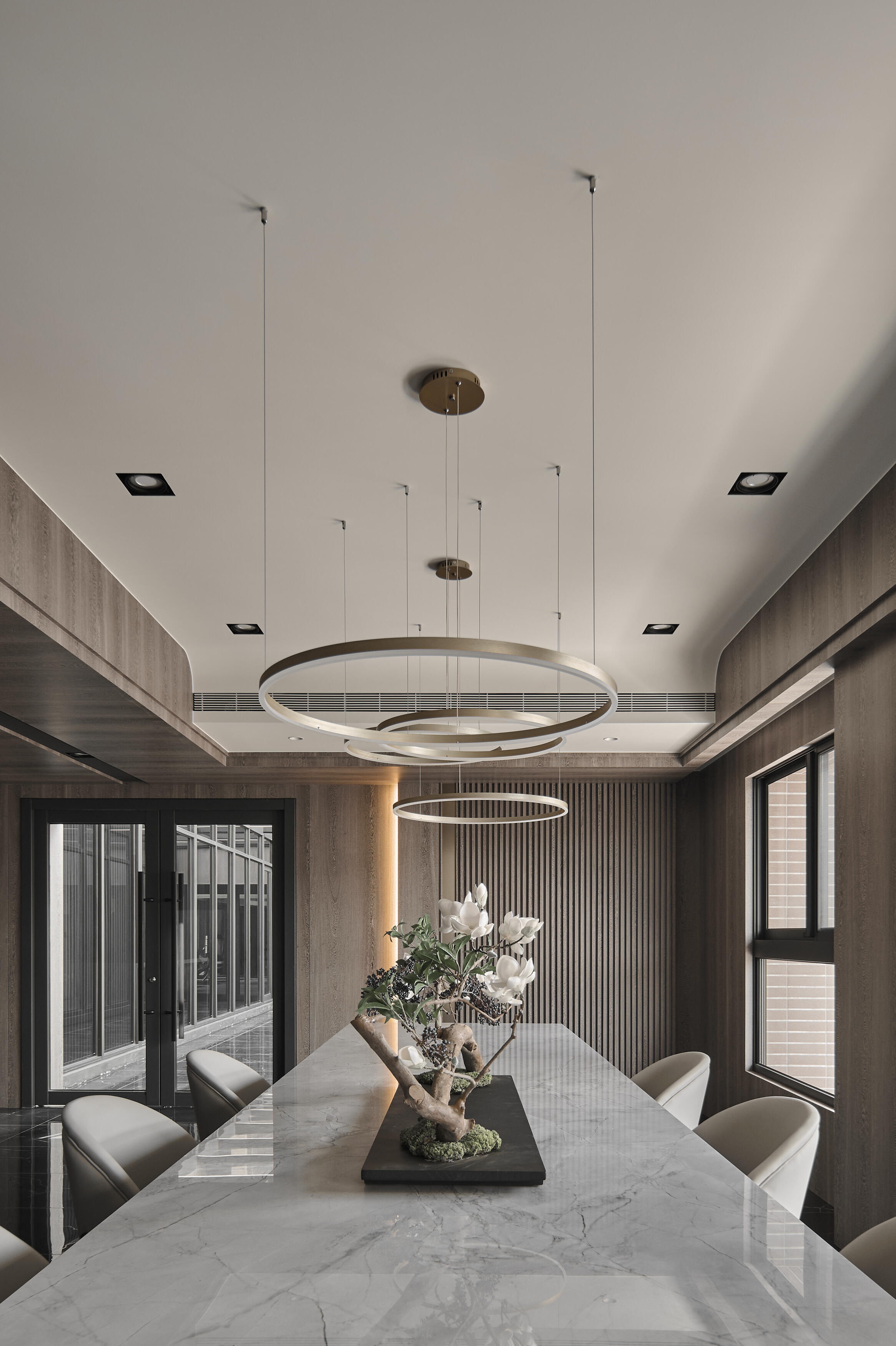 在寬闊的場域中,如何界定空間,同時讓整體保有延伸及通透性,成為設計的挑戰,我們以線條打造蜿蜒河流般的天花串聯整體空間,讓視線得延伸,營造出開闊的空間感。立面透過石紋、木皮、金屬等天然的材質,藉由拼貼、切割等不同的手法,堆疊層次,讓空間的線條更加飽滿,呈現公共空間應有的磅礡氣勢。