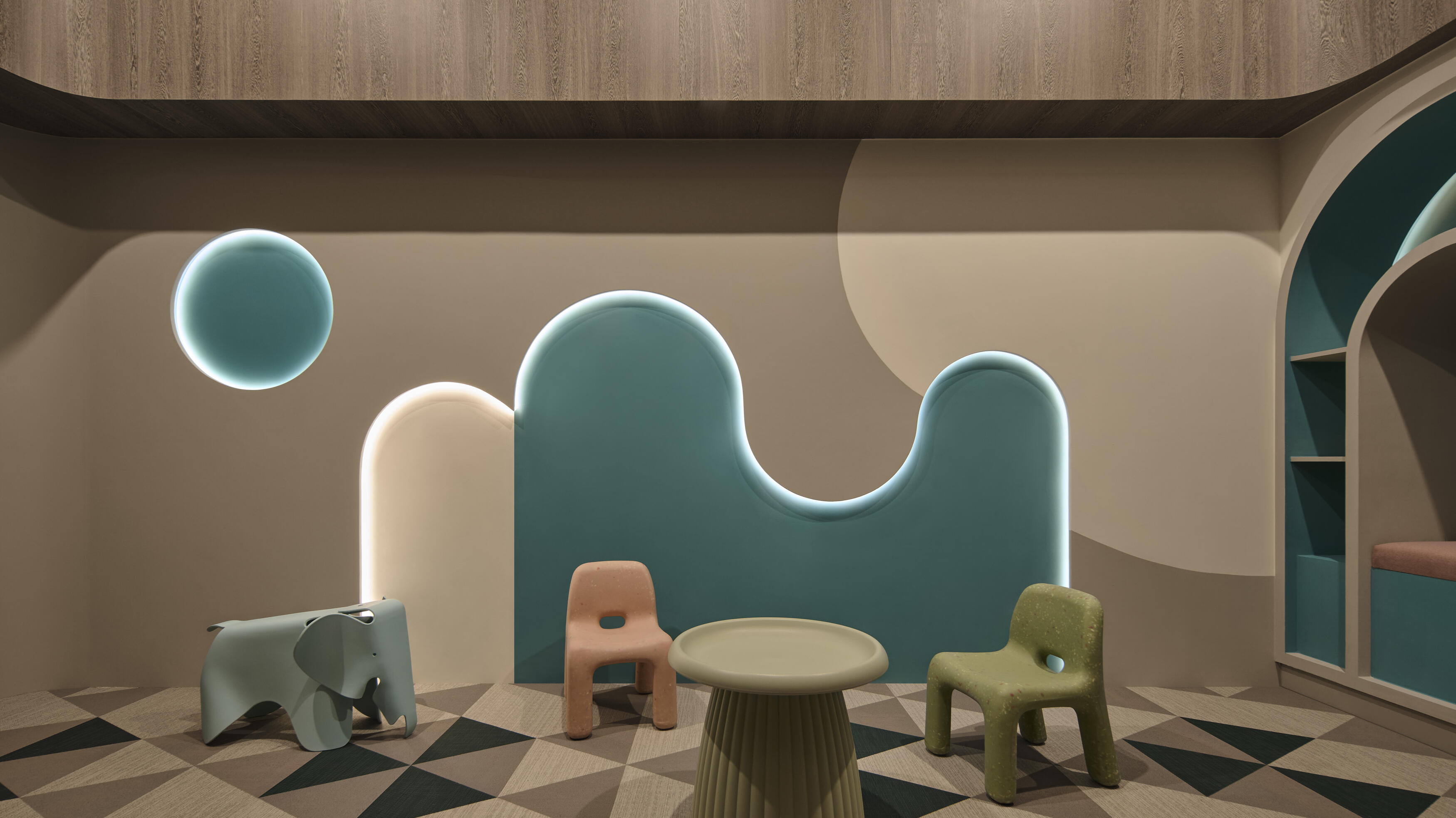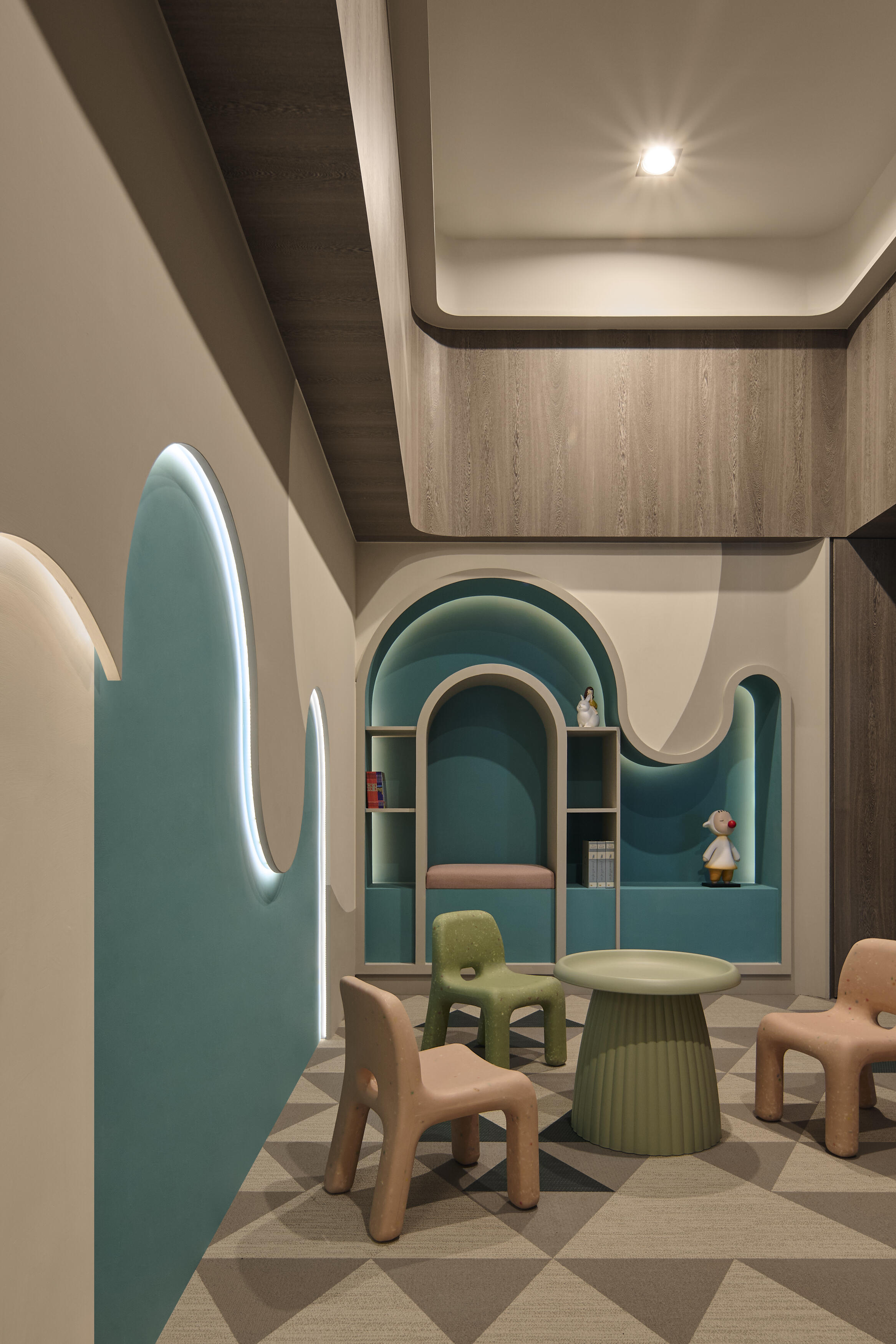本次的公設空間共有兩層,一樓空間整合櫃台、交誼區、信箱、多功能區域等空間,滿足住戶日常生活的實用情景;二樓空間則規劃為可供多人使用的閱讀室、會議室,此外也貼心為幼兒設想增設具有童趣色彩的兒童閱覽室,讓場域的機能更加豐富多樣。