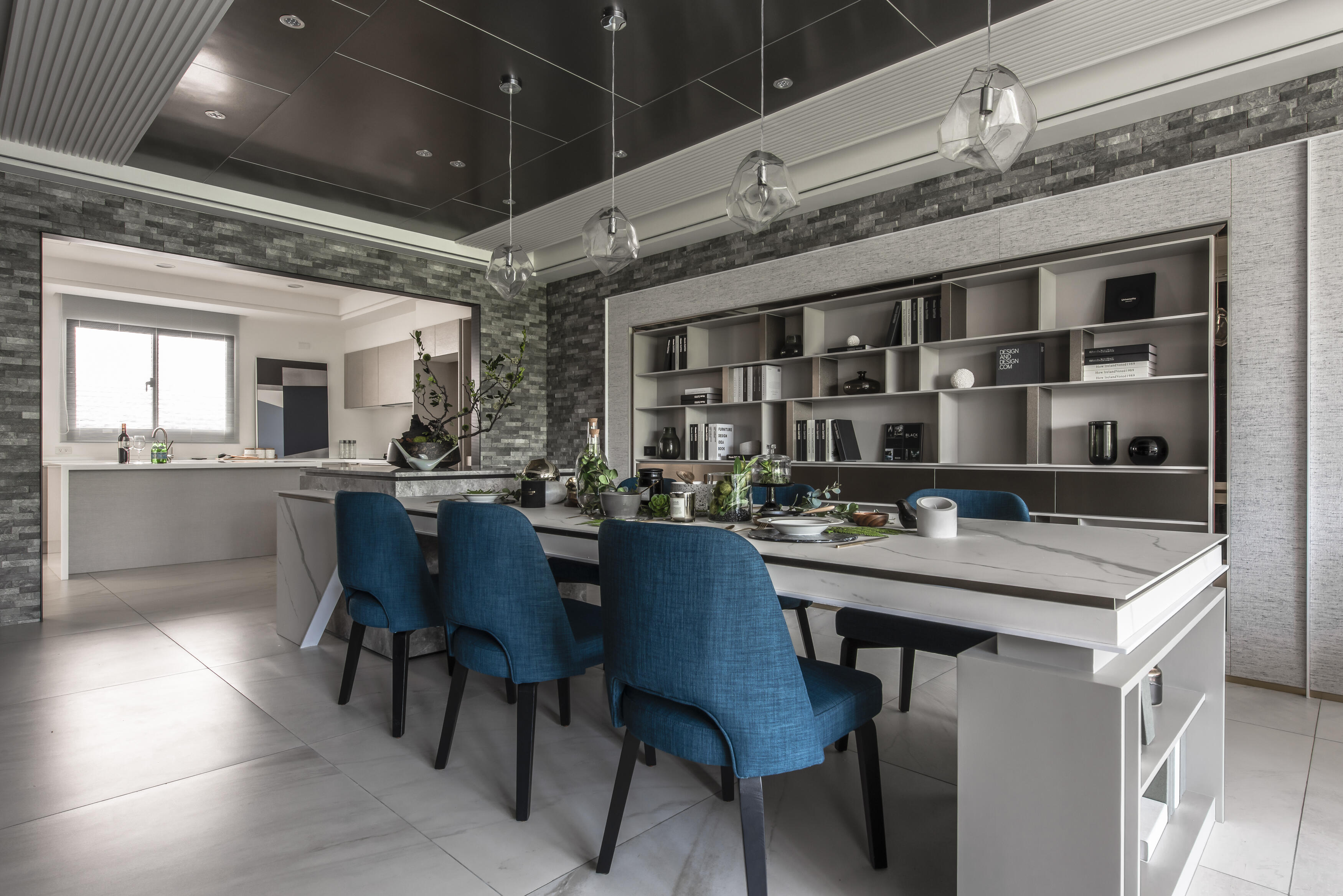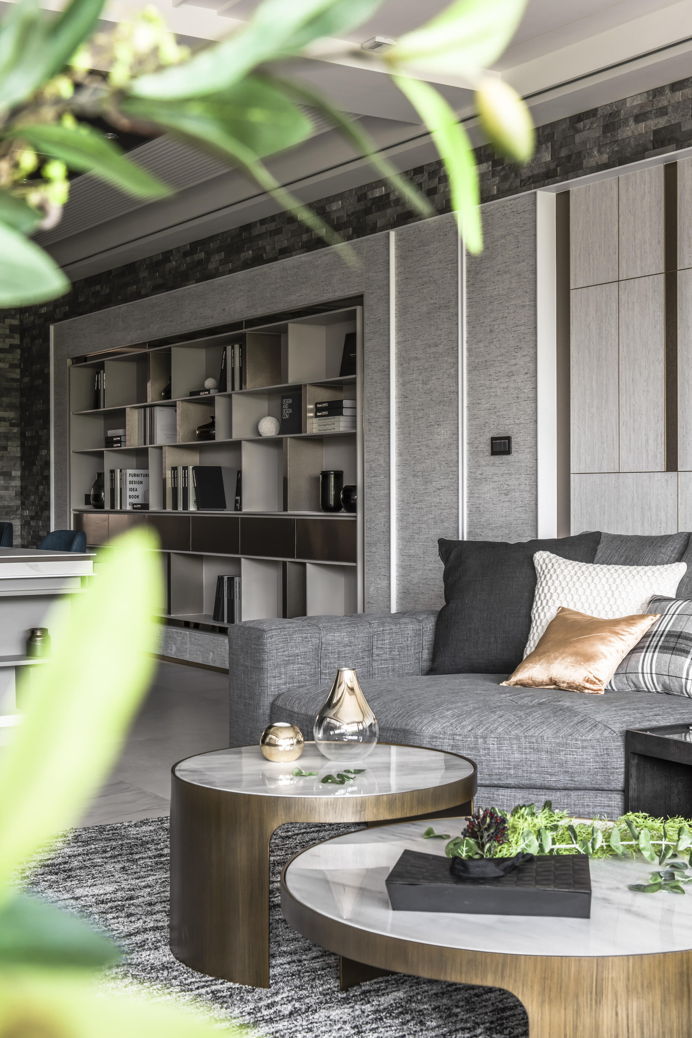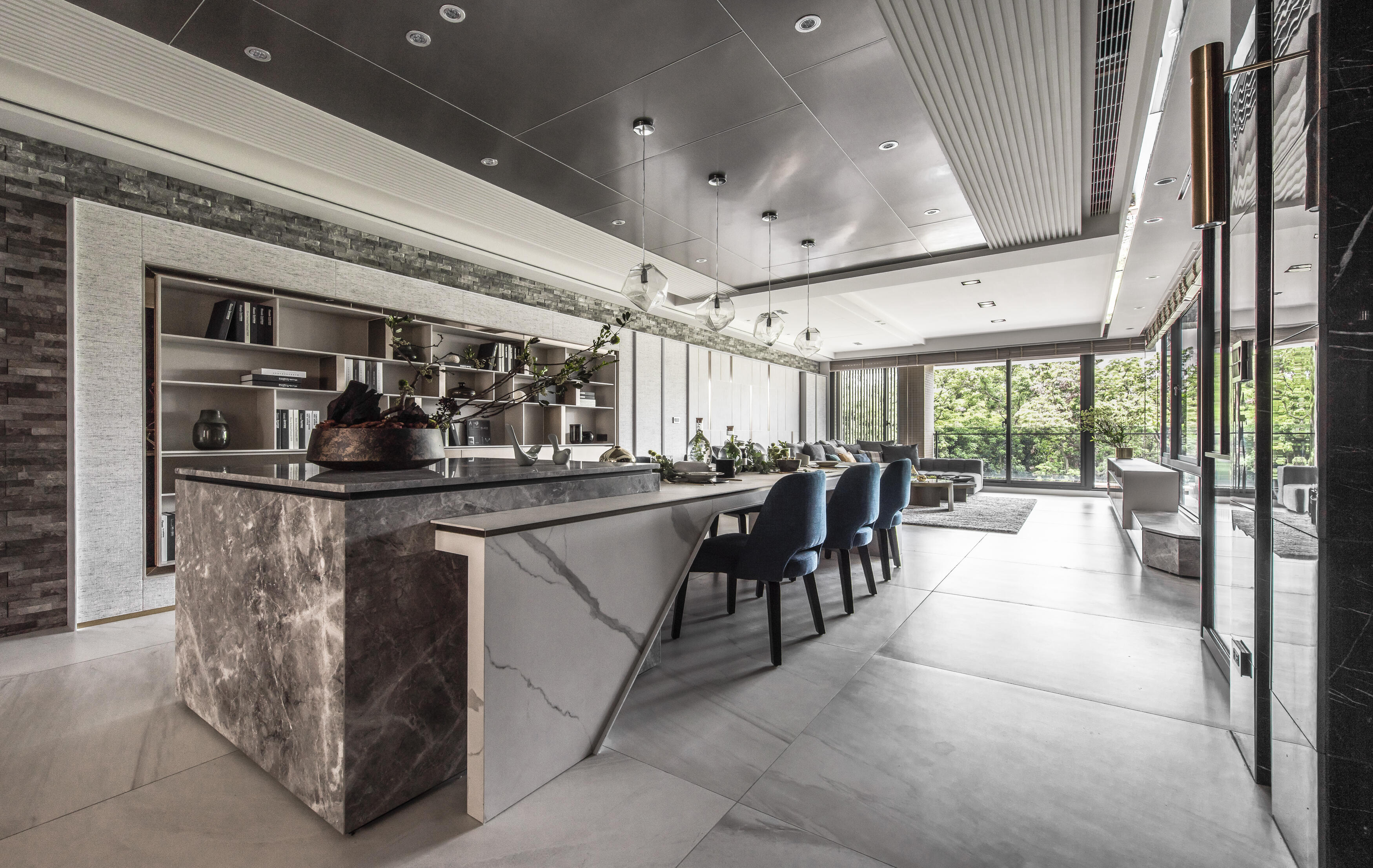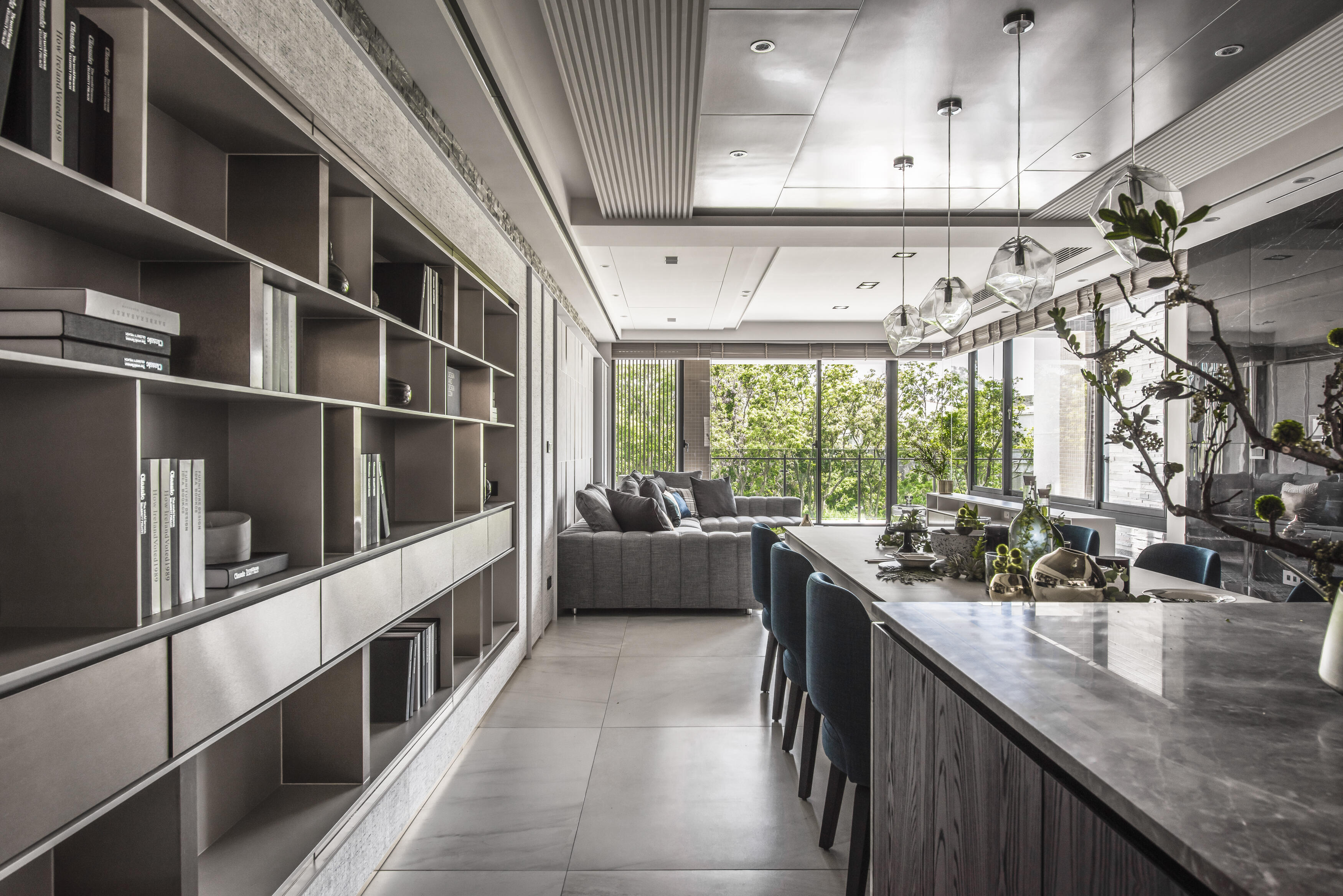 走進這座居所,首先映入眼簾的是建築外觀的獨特線條。運用「退縮」和「斷開」的設計手法,為建築注入了輕盈的生命力,消弭了傳統連棟建築的壓迫感。獨特的角窗設計,不僅為室內空間引入了豐沛的陽光,更像是一扇扇畫框,將戶外的綠意框入室內,形成一幅幅生機盎然的風景畫。公共空間以開放式設計串聯客廳、餐廳和廚房,營造出寬敞舒適的氛圍。視線隨著空間軸線延伸,自然地被引導至大面角窗外的綠意,彷彿置身於一片綠意盎然的森林之中。陽光穿過樹梢,灑落在室內,與室內的木質、石材等自然材質相互輝映,營造出溫暖而寧靜的氛圍。