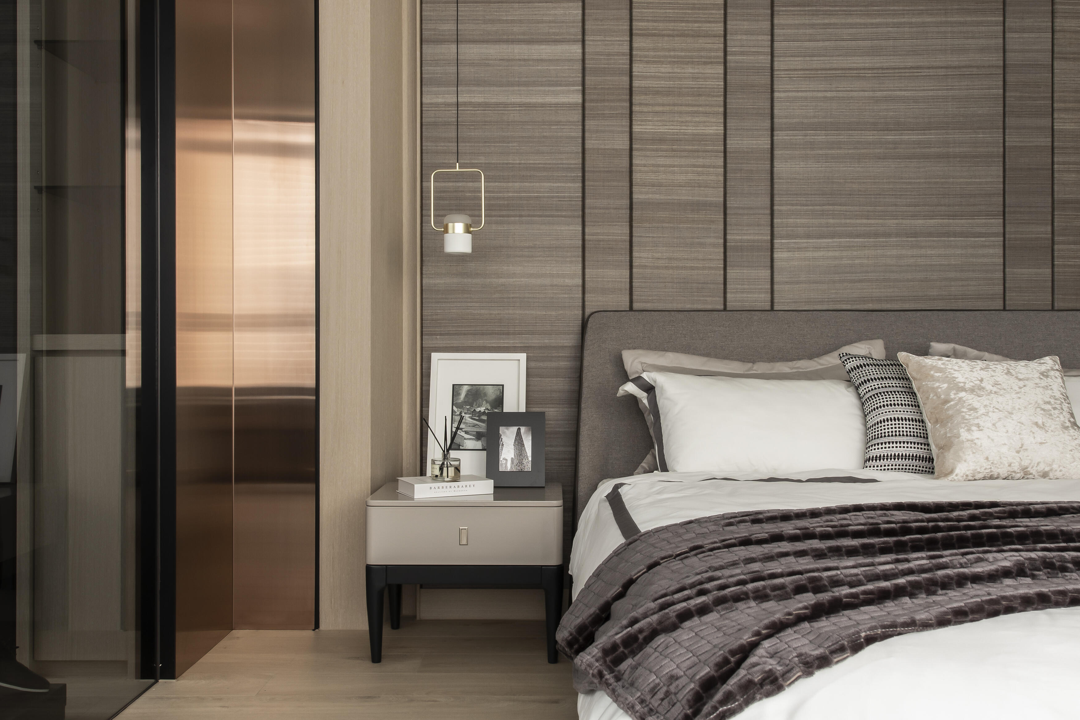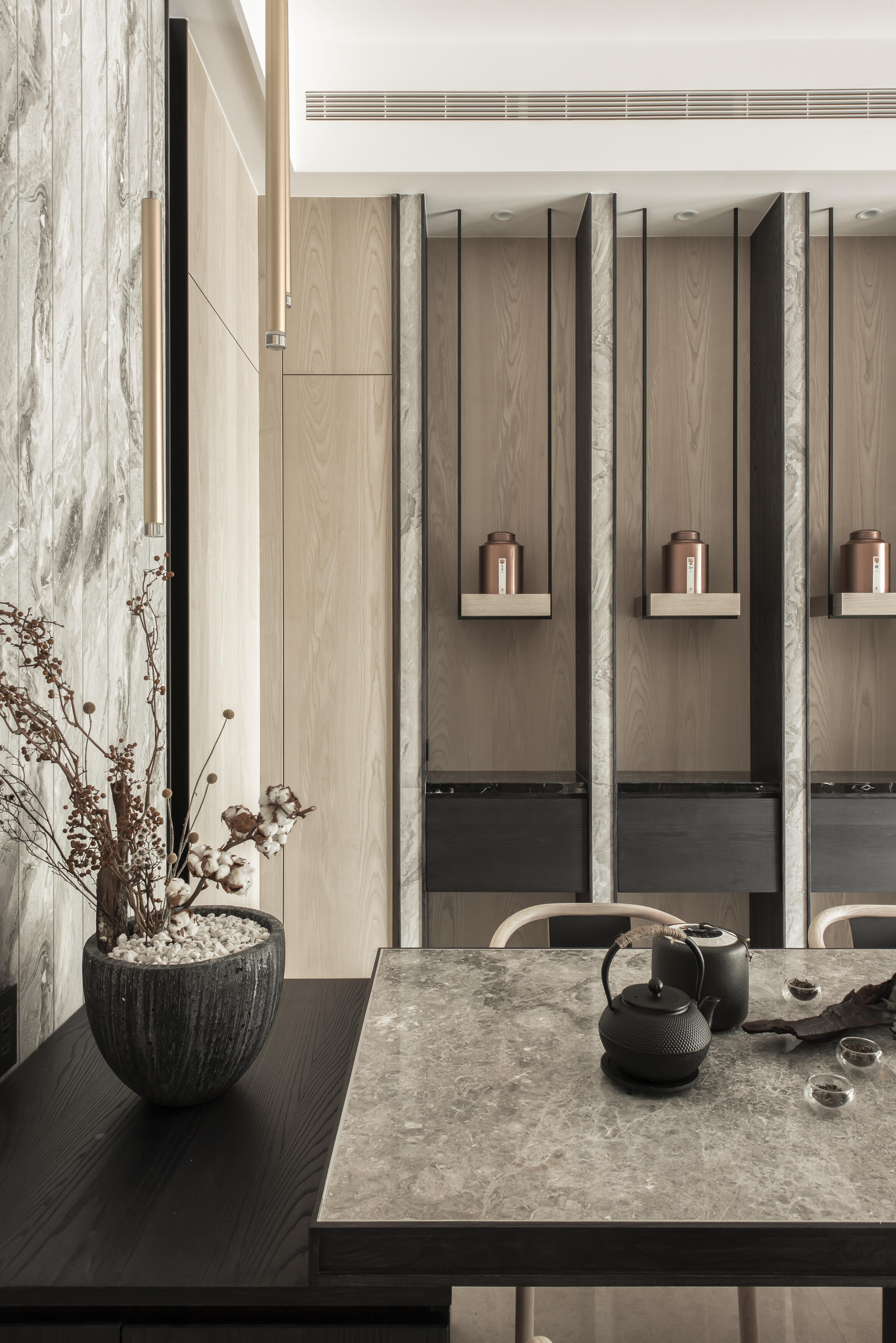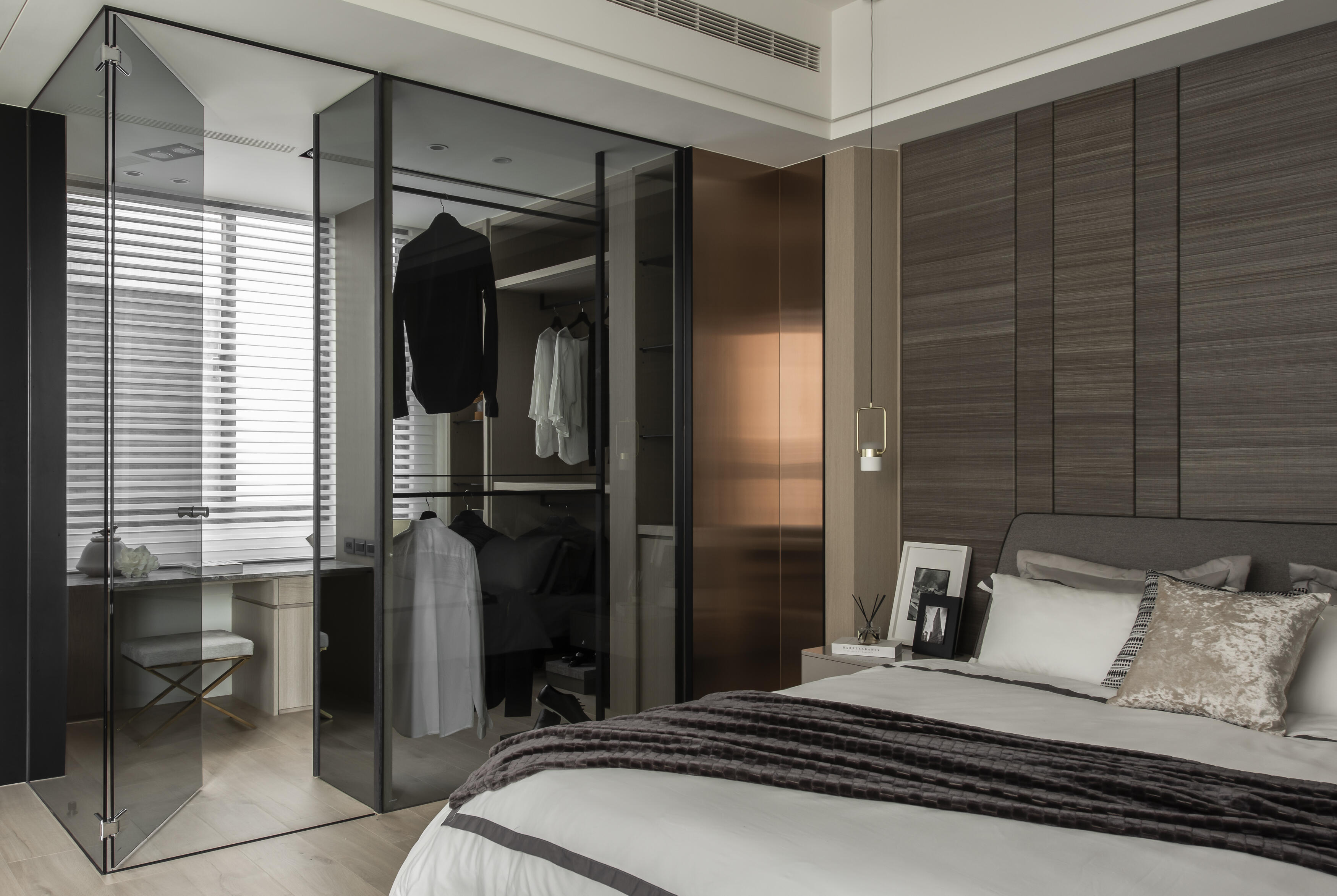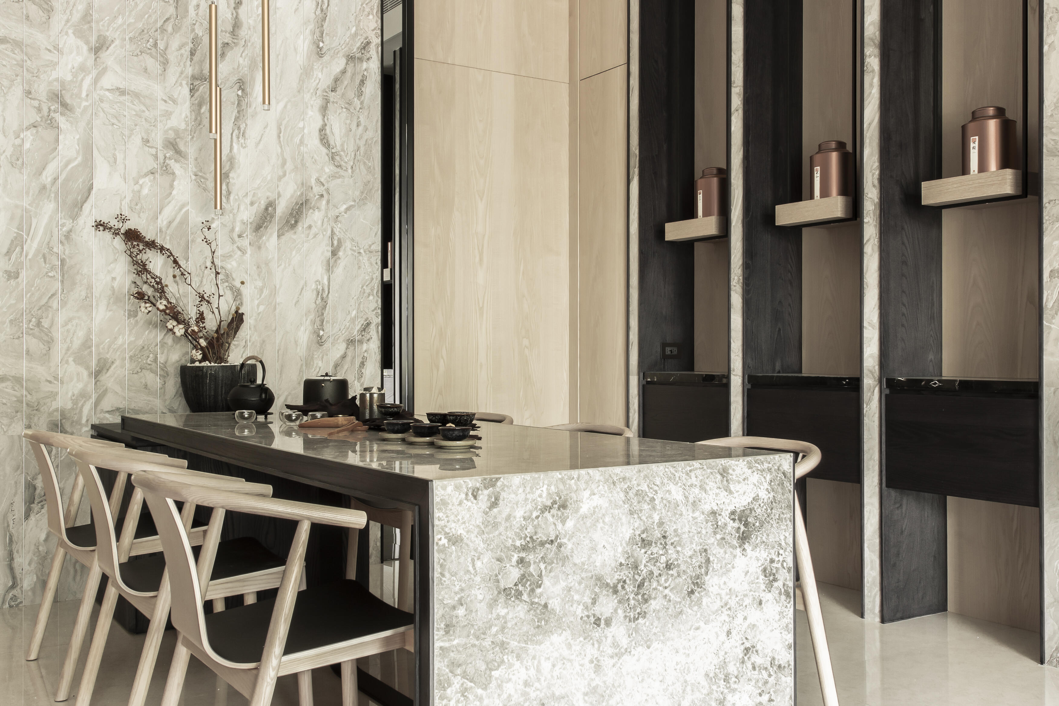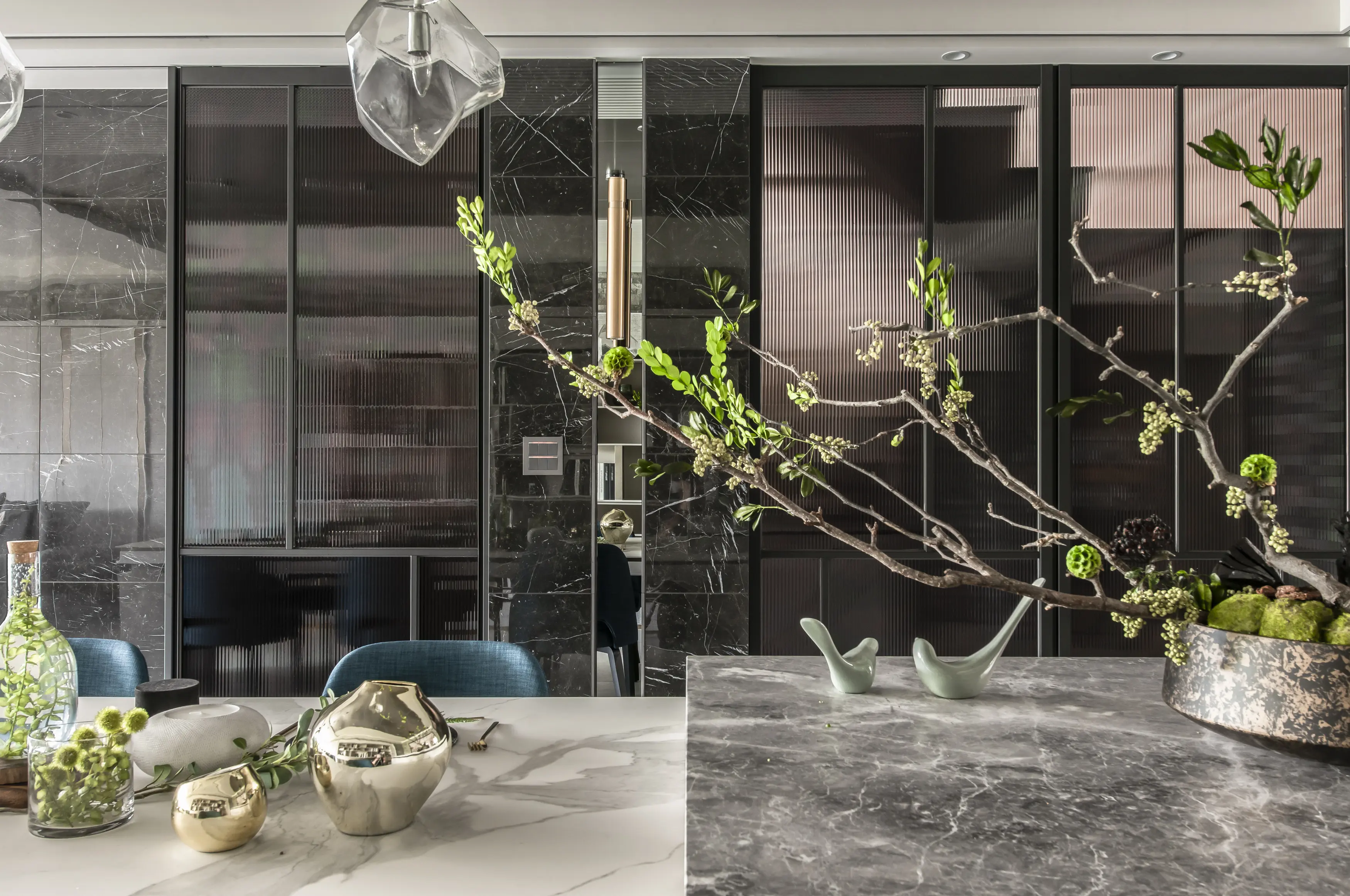 走進這座居所,首先映入眼簾的是建築外觀的獨特線條。運用「退縮」和「斷開」的設計手法,為建築注入了輕盈的生命力,消弭了傳統連棟建築的壓迫感。獨特的角窗設計,不僅為室內空間引入了豐沛的陽光,更像是一扇扇畫框,將戶外的綠意框入室內,形成一幅幅生機盎然的風景畫。公共空間以開放式設計串聯客廳、餐廳和廚房,營造出寬敞舒適的氛圍。視線隨著空間軸線延伸,自然地被引導至大面角窗外的綠意,彷彿置身於一片綠意盎然的森林之中。陽光穿過樹梢,灑落在室內,與室內的木質、石材等自然材質相互輝映,營造出溫暖而寧靜的氛圍。