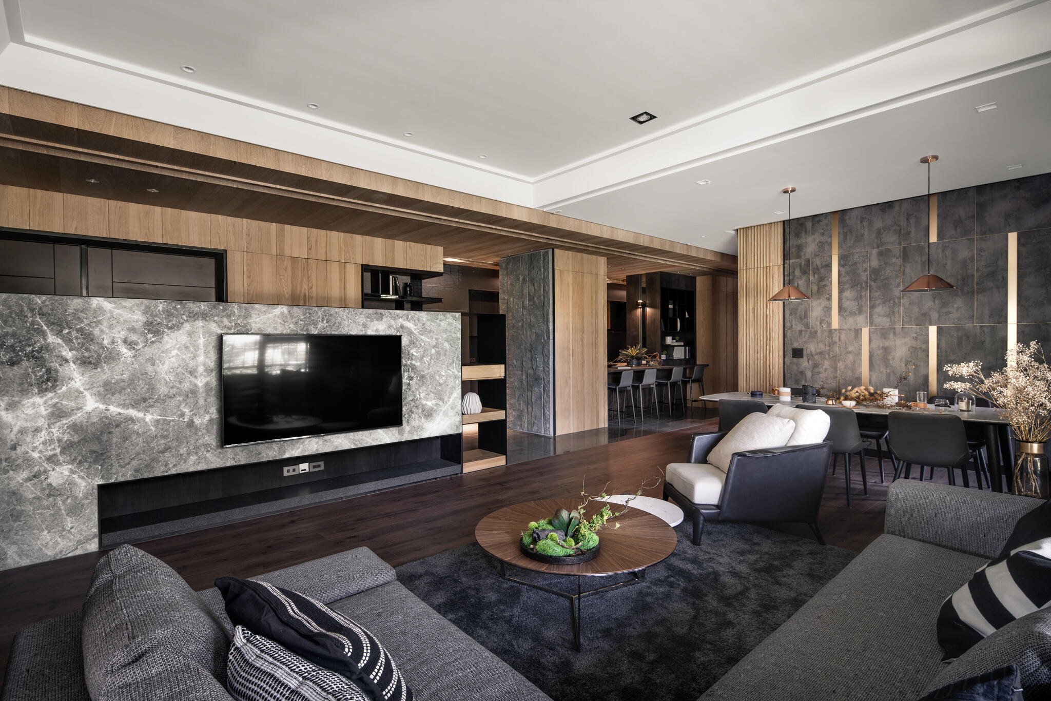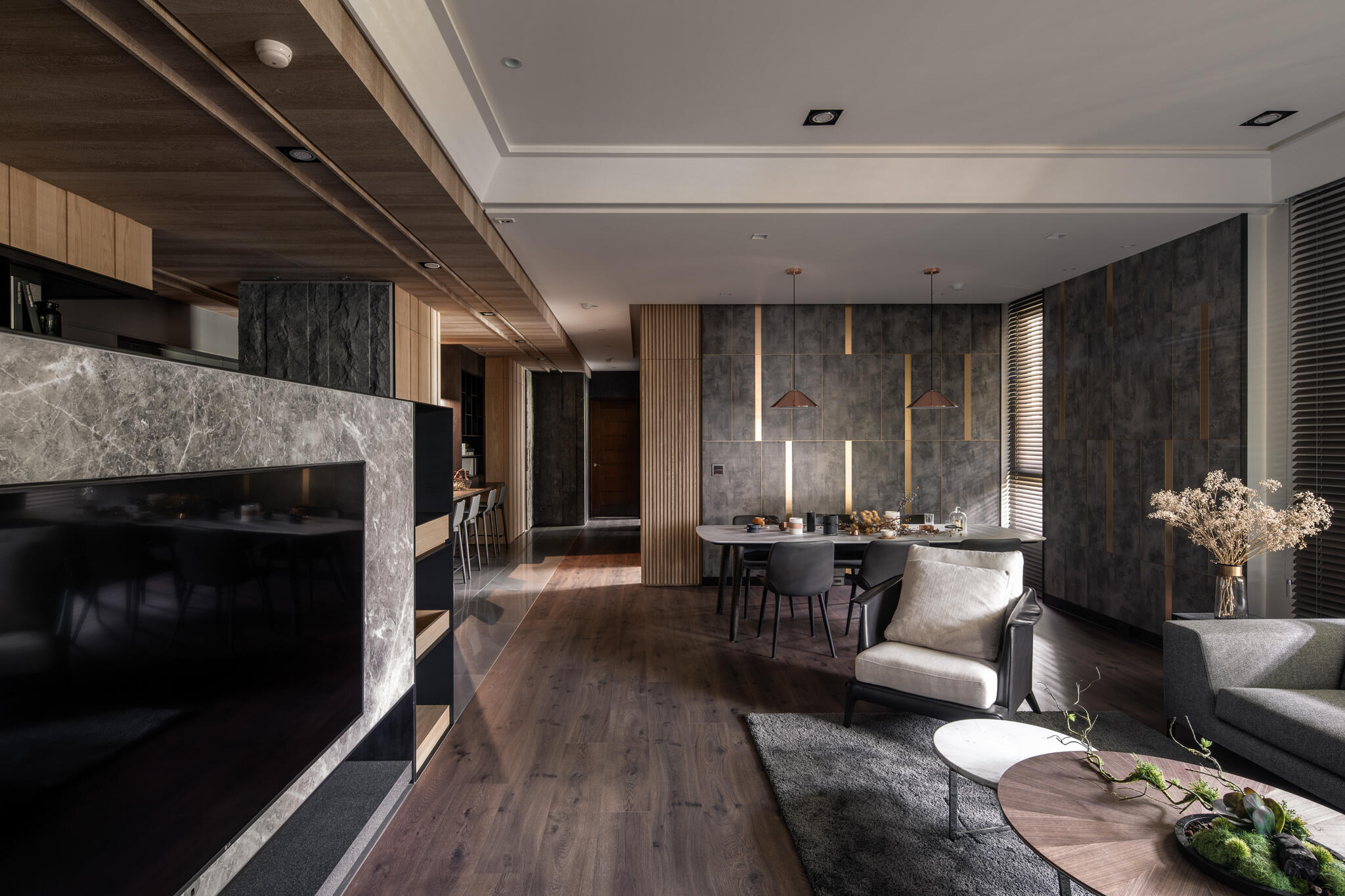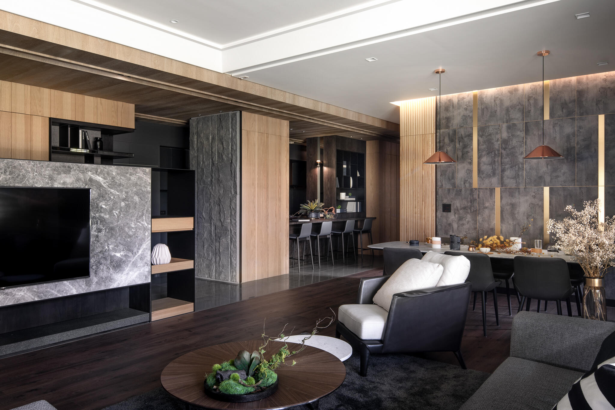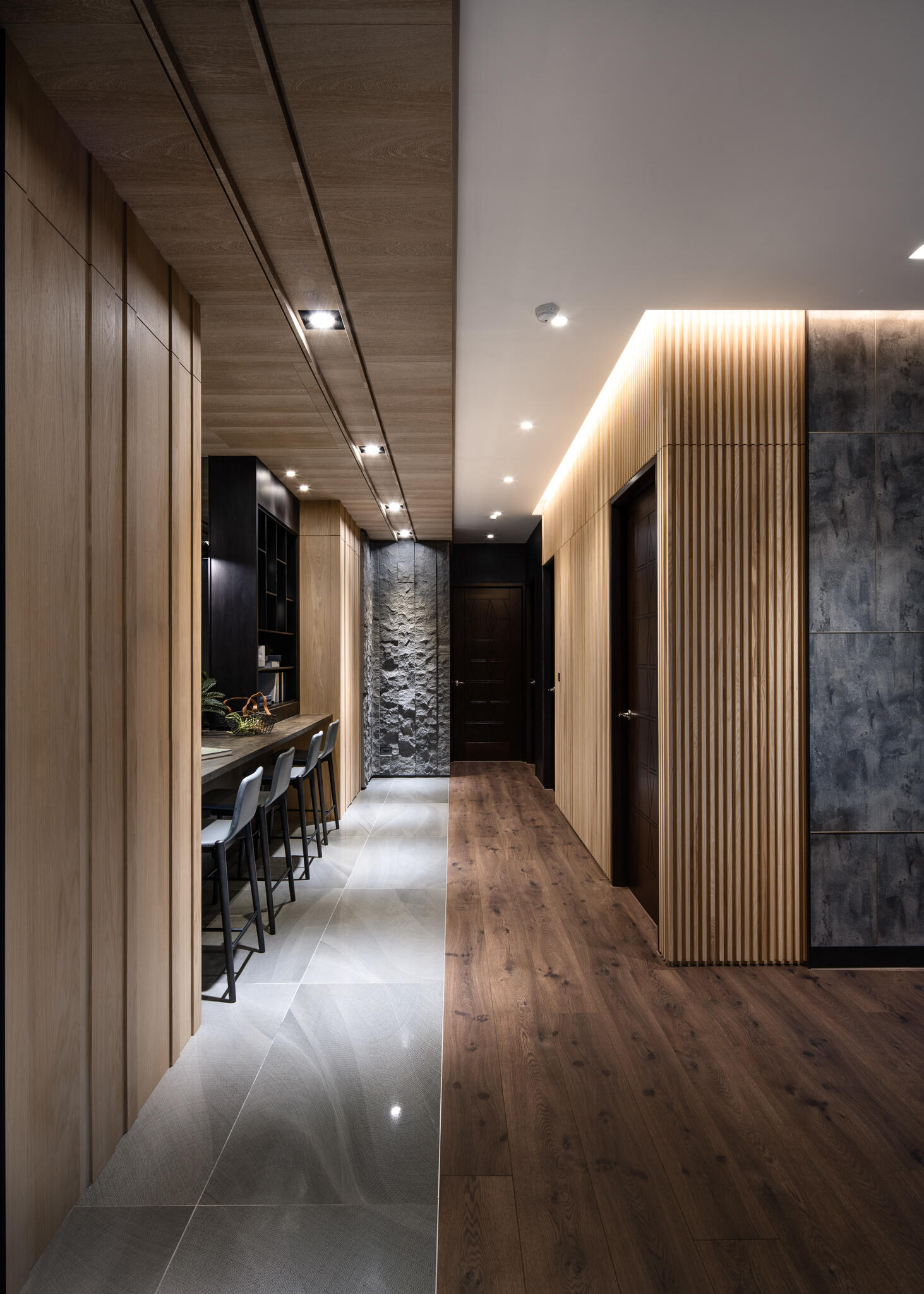 選用木皮、平光石材、美耐板、鍍鈦、可樂石等豐富的異材質,串聯起整個空間,演繹出層次豐富的現代美學。在看似俐落的視覺背後,暗藏了大量的收納櫃體,無論是電視牆後方、吧檯下方,甚至是柱子背後,都規劃了隱藏式儲物空間。主臥更衣室的門片設計,也巧妙搭配壁面造型做延伸,充分滿足了一家四口的收納需求,同時絲毫不妨礙視覺的完整與協調度。在居家各個角落,異材質的淵雅質感被精彩演繹,共同構築出一個既有機能性又充滿藝術氣息的現代質感生活空間。