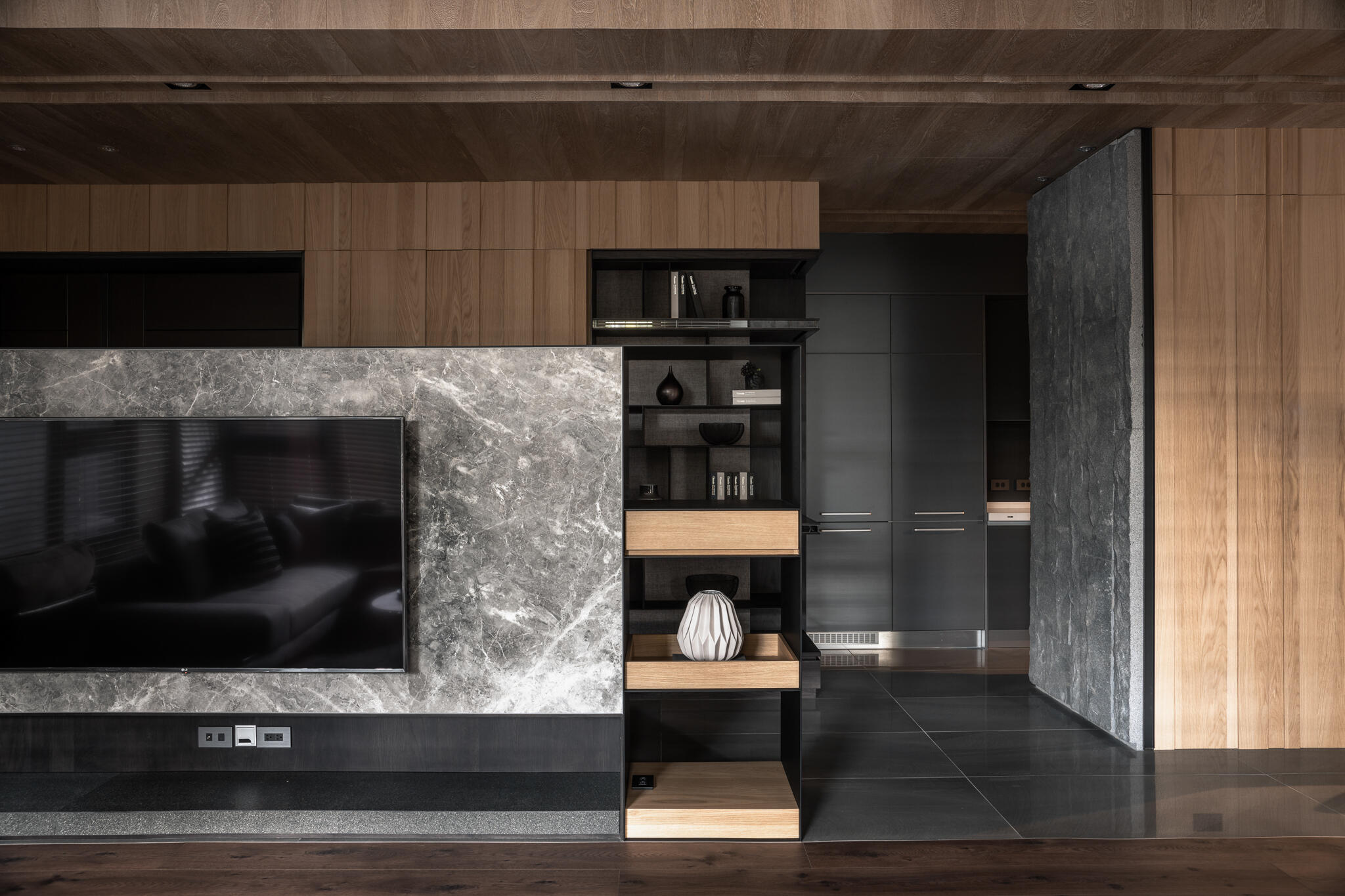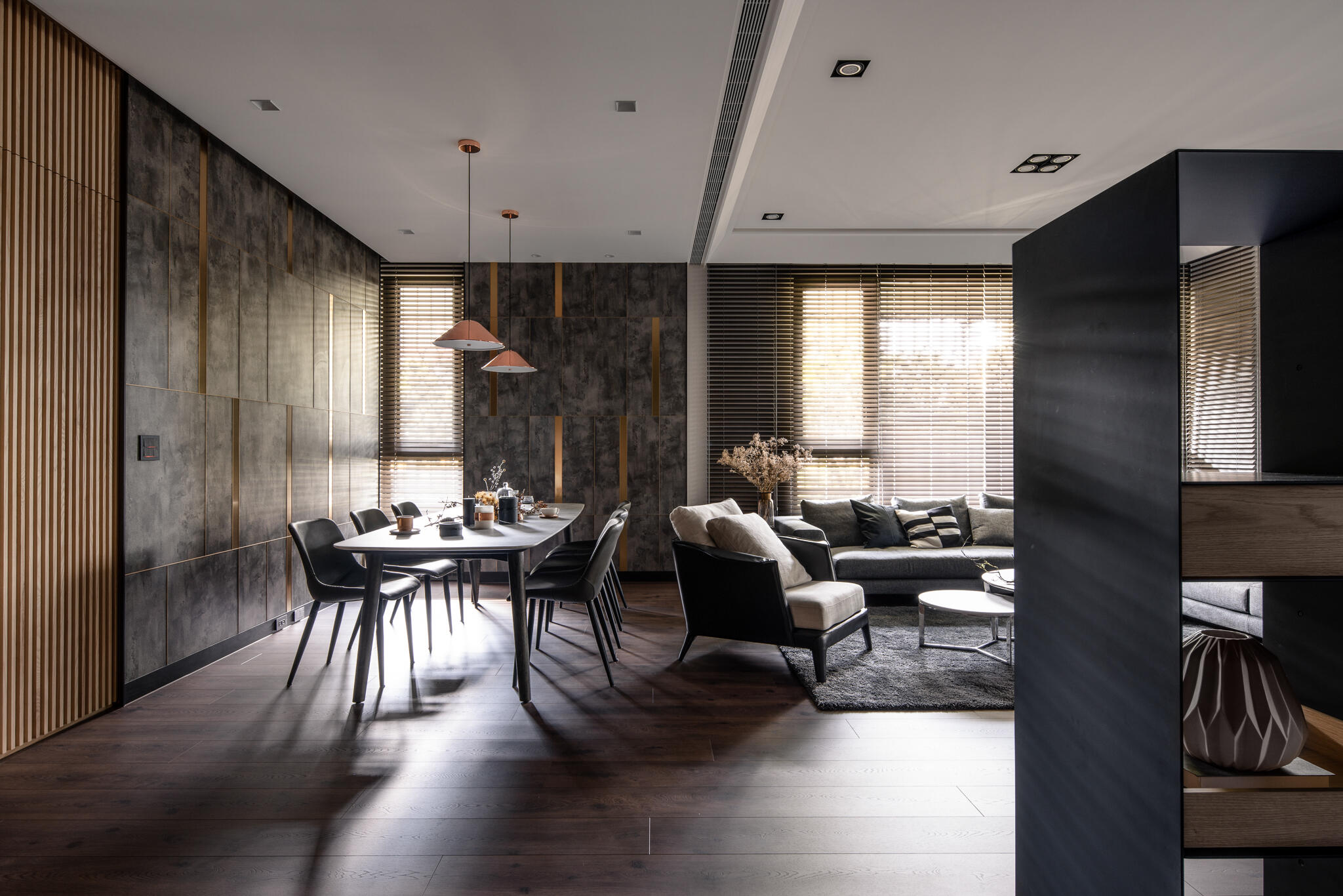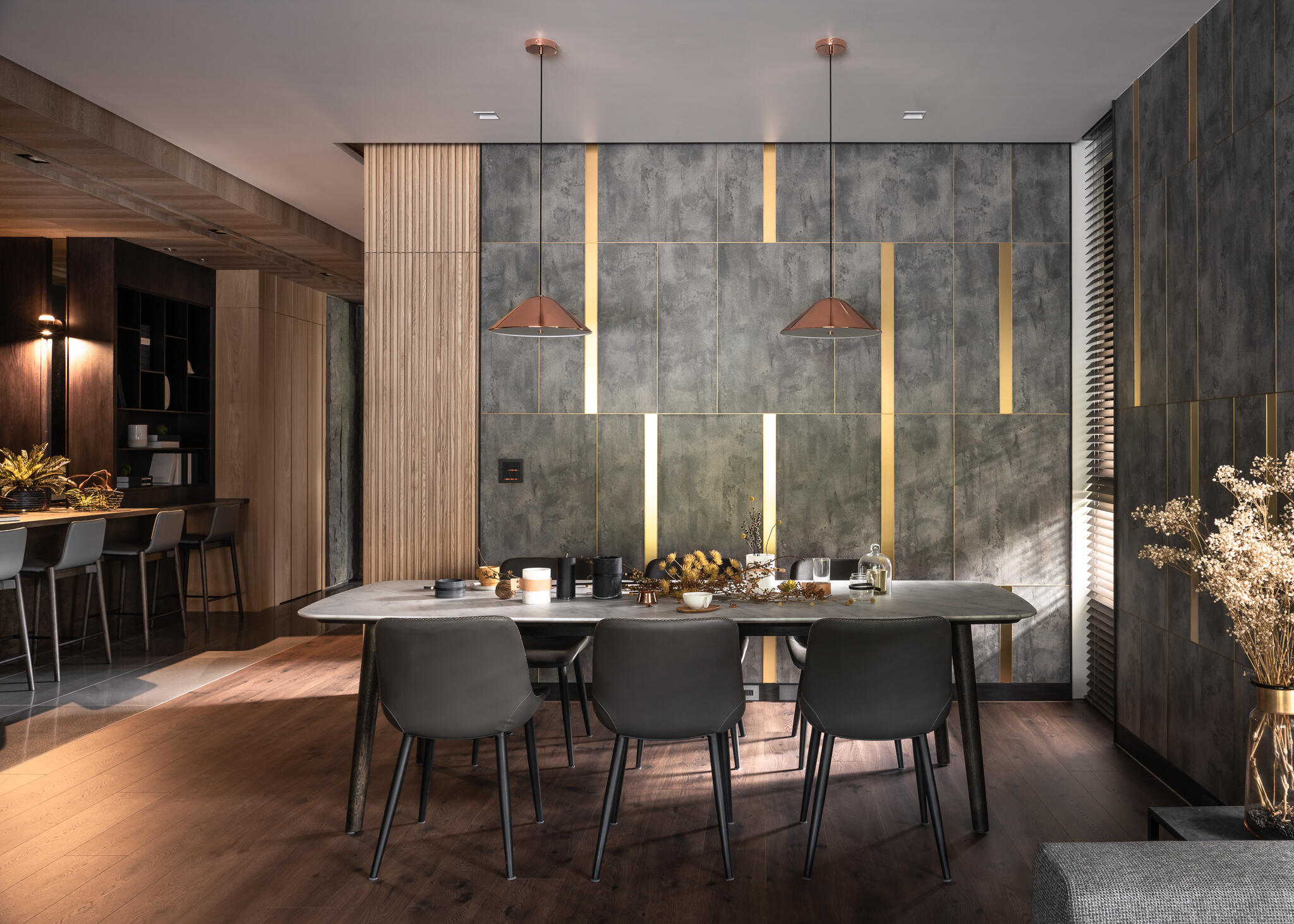 選用木皮、平光石材、美耐板、鍍鈦、可樂石等豐富的異材質,串聯起整個空間,演繹出層次豐富的現代美學。在看似俐落的視覺背後,暗藏了大量的收納櫃體,無論是電視牆後方、吧檯下方,甚至是柱子背後,都規劃了隱藏式儲物空間。主臥更衣室的門片設計,也巧妙搭配壁面造型做延伸,充分滿足了一家四口的收納需求,同時絲毫不妨礙視覺的完整與協調度。在居家各個角落,異材質的淵雅質感被精彩演繹,共同構築出一個既有機能性又充滿藝術氣息的現代質感生活空間。