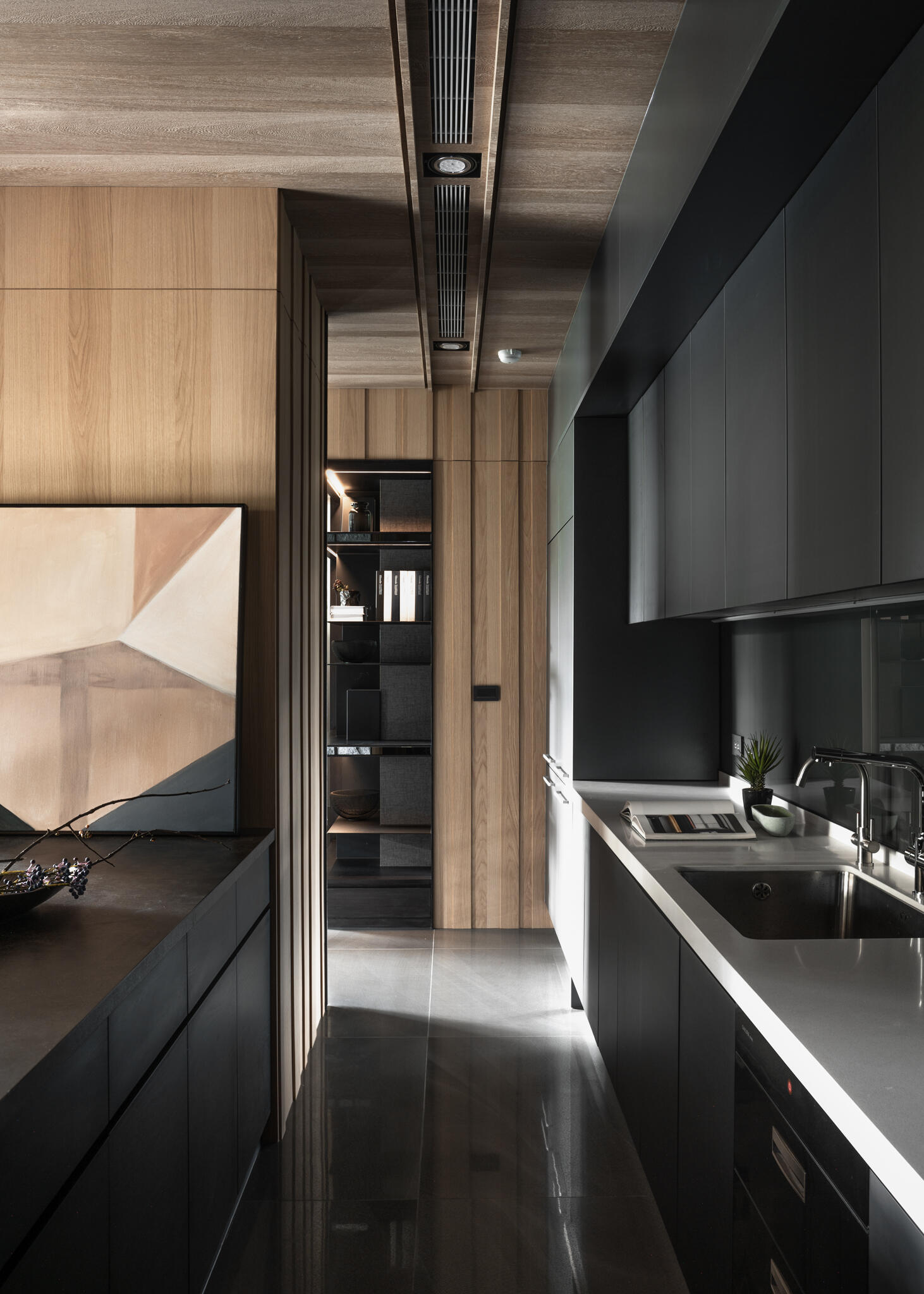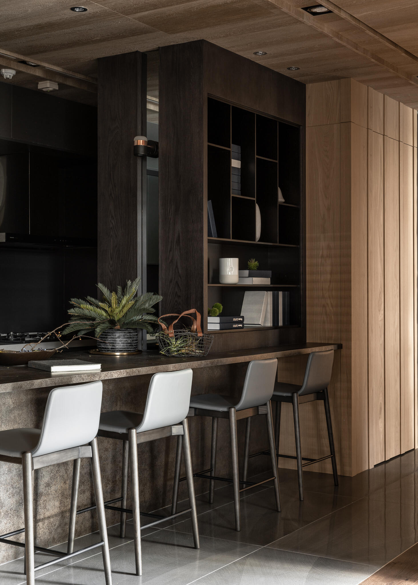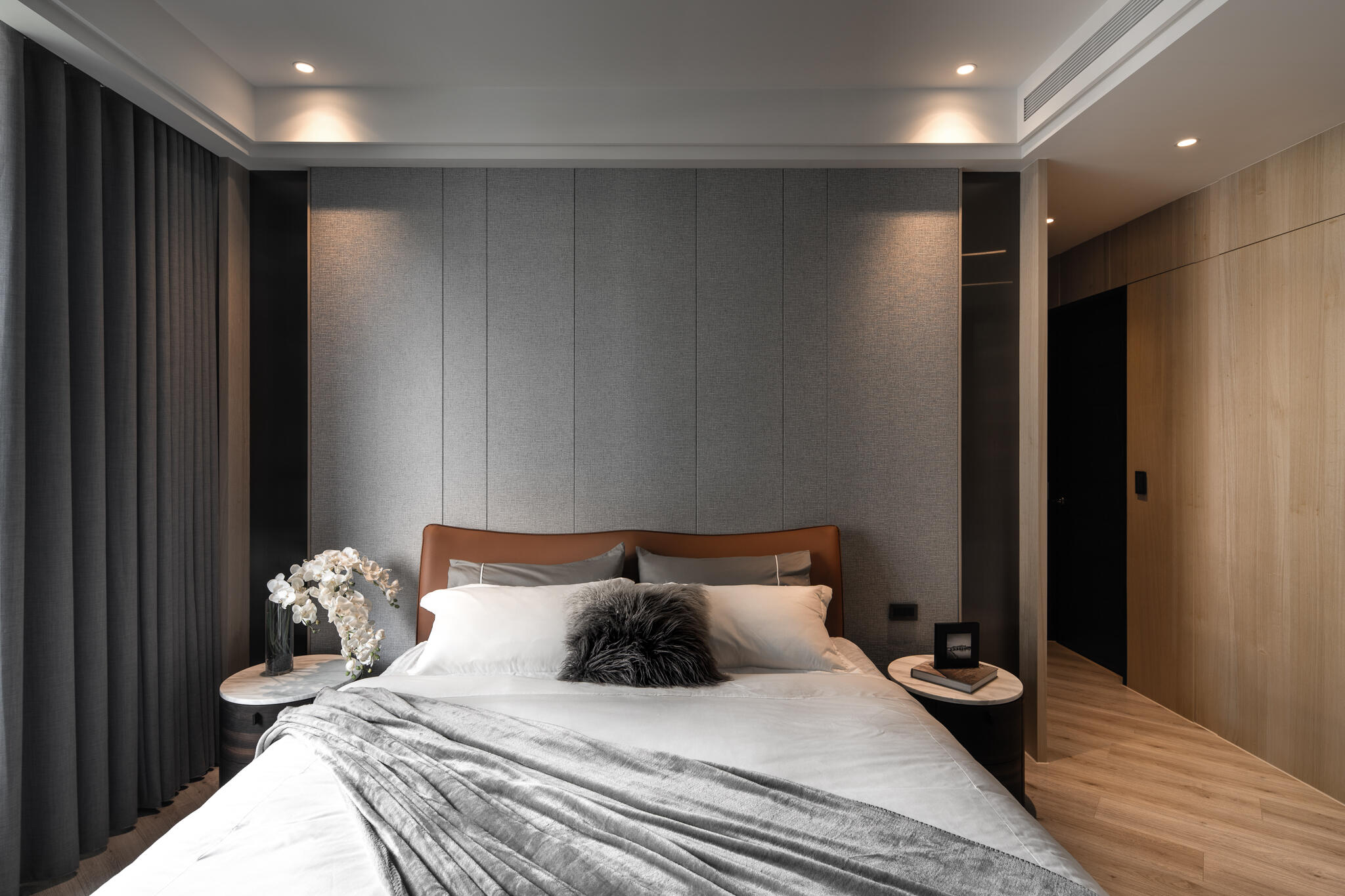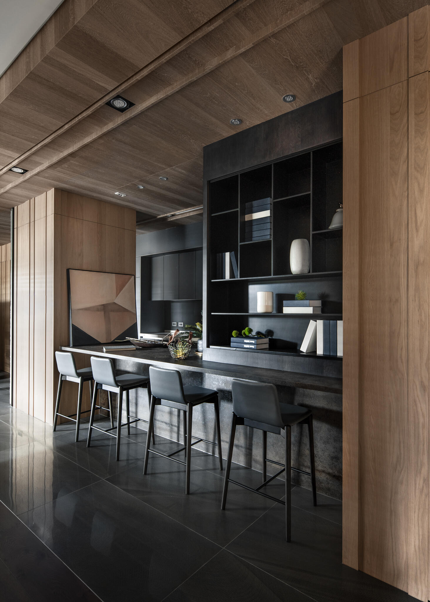 選用木皮、平光石材、美耐板、鍍鈦、可樂石等豐富的異材質,串聯起整個空間,演繹出層次豐富的現代美學。在看似俐落的視覺背後,暗藏了大量的收納櫃體,無論是電視牆後方、吧檯下方,甚至是柱子背後,都規劃了隱藏式儲物空間。主臥更衣室的門片設計,也巧妙搭配壁面造型做延伸,充分滿足了一家四口的收納需求,同時絲毫不妨礙視覺的完整與協調度。在居家各個角落,異材質的淵雅質感被精彩演繹,共同構築出一個既有機能性又充滿藝術氣息的現代質感生活空間。
