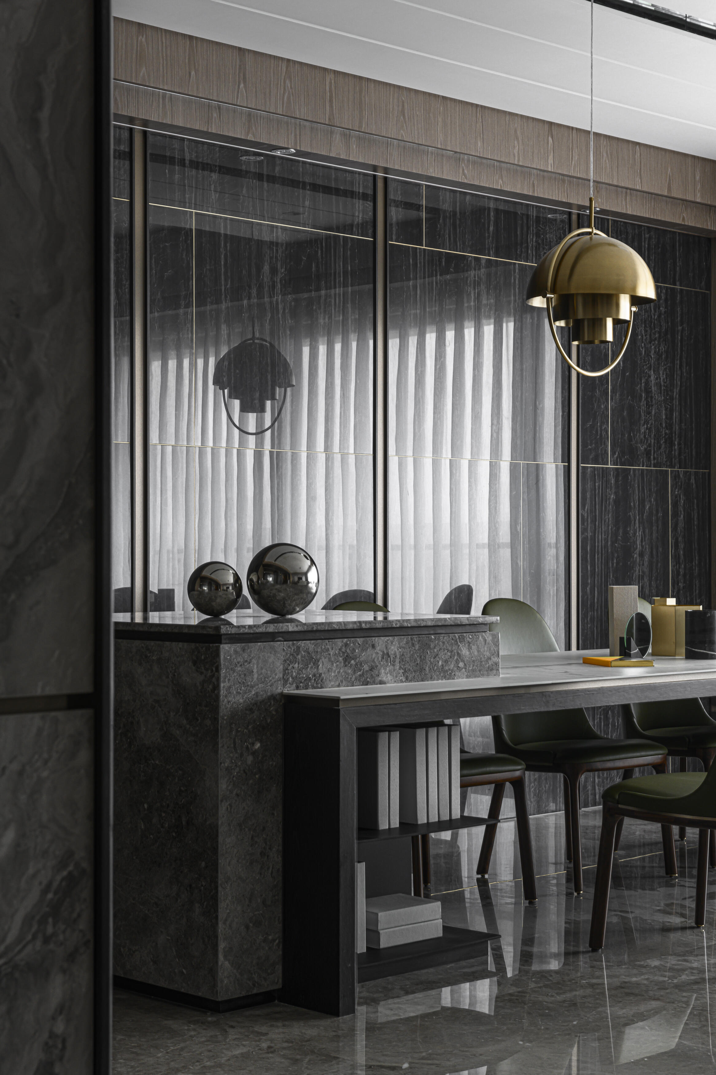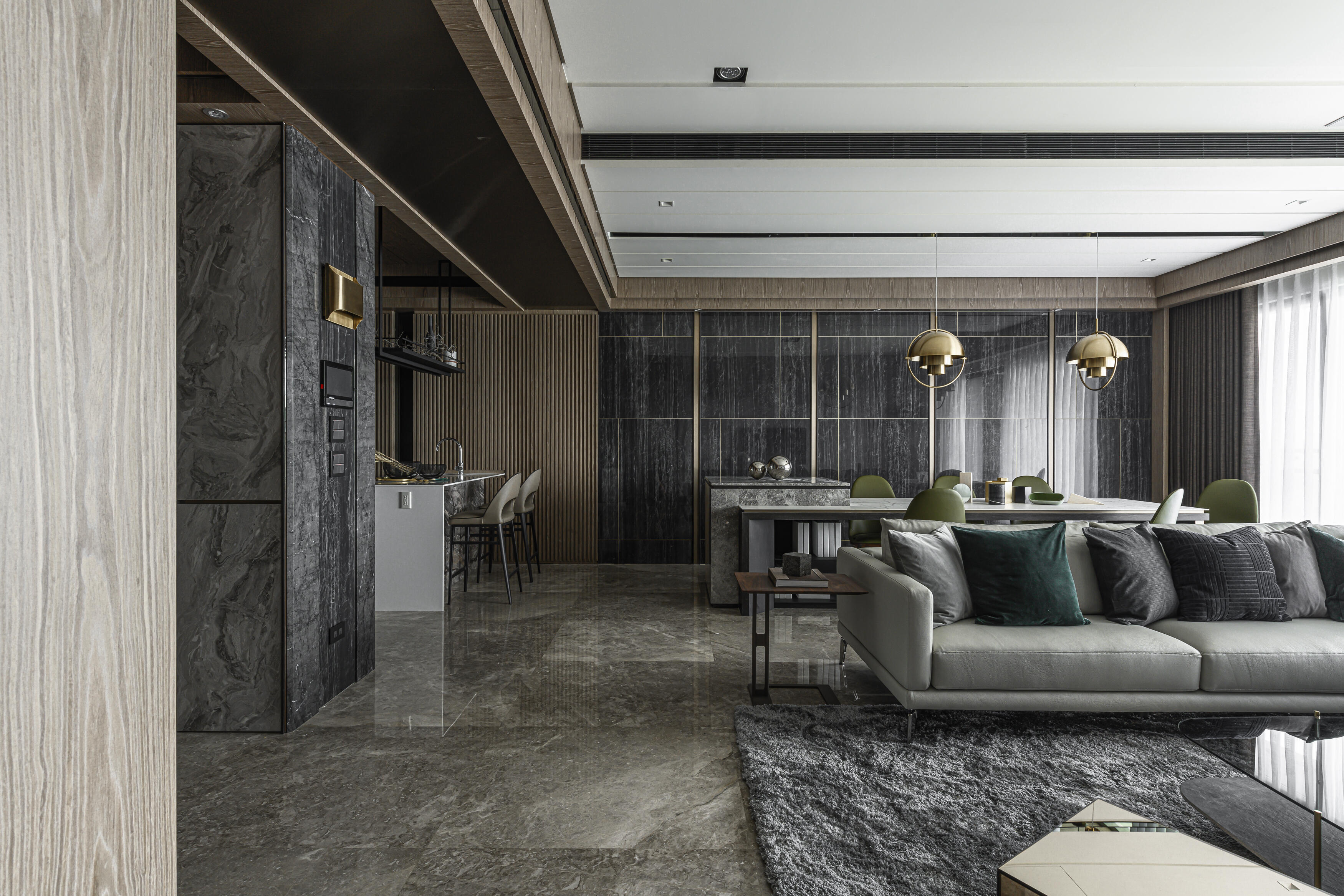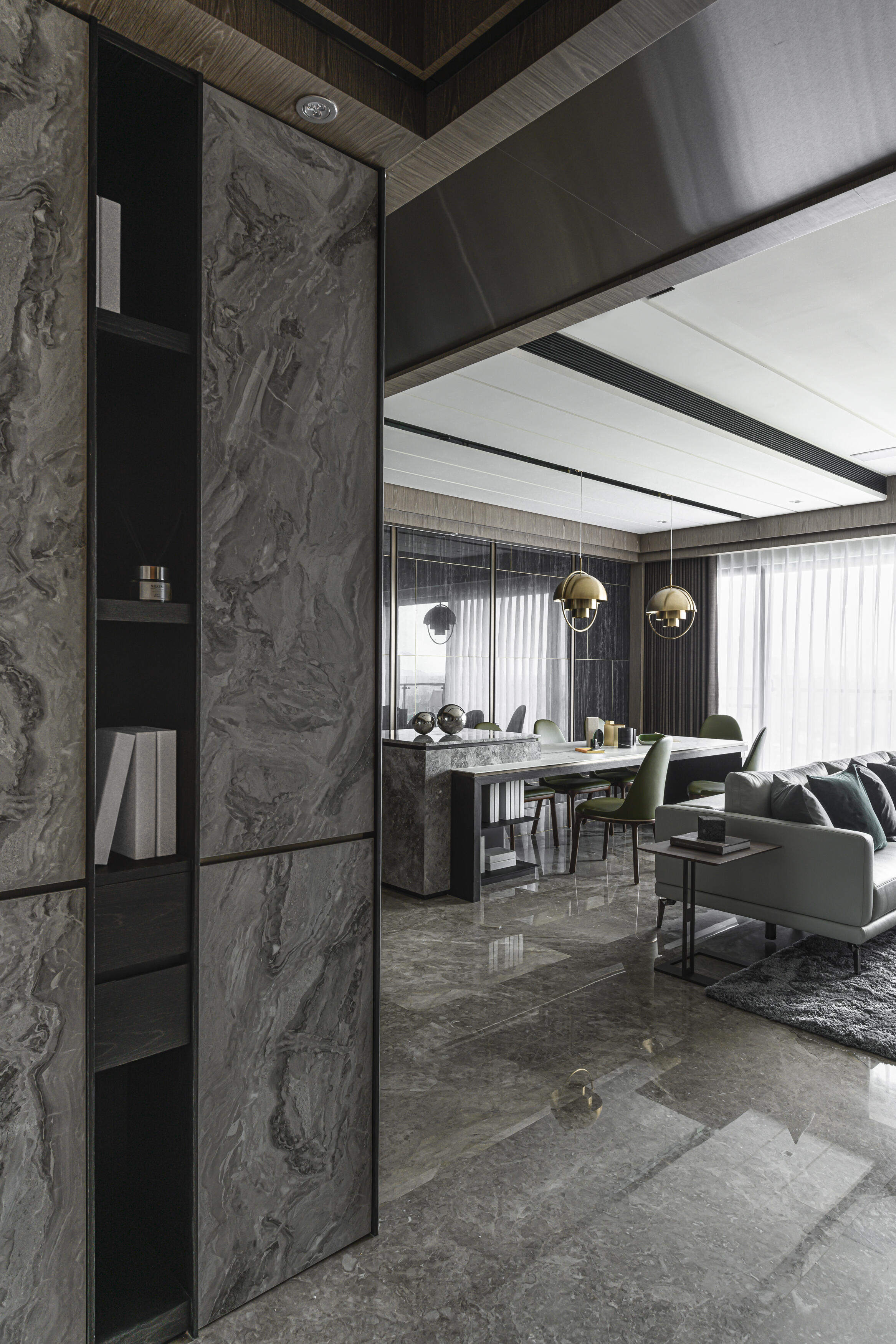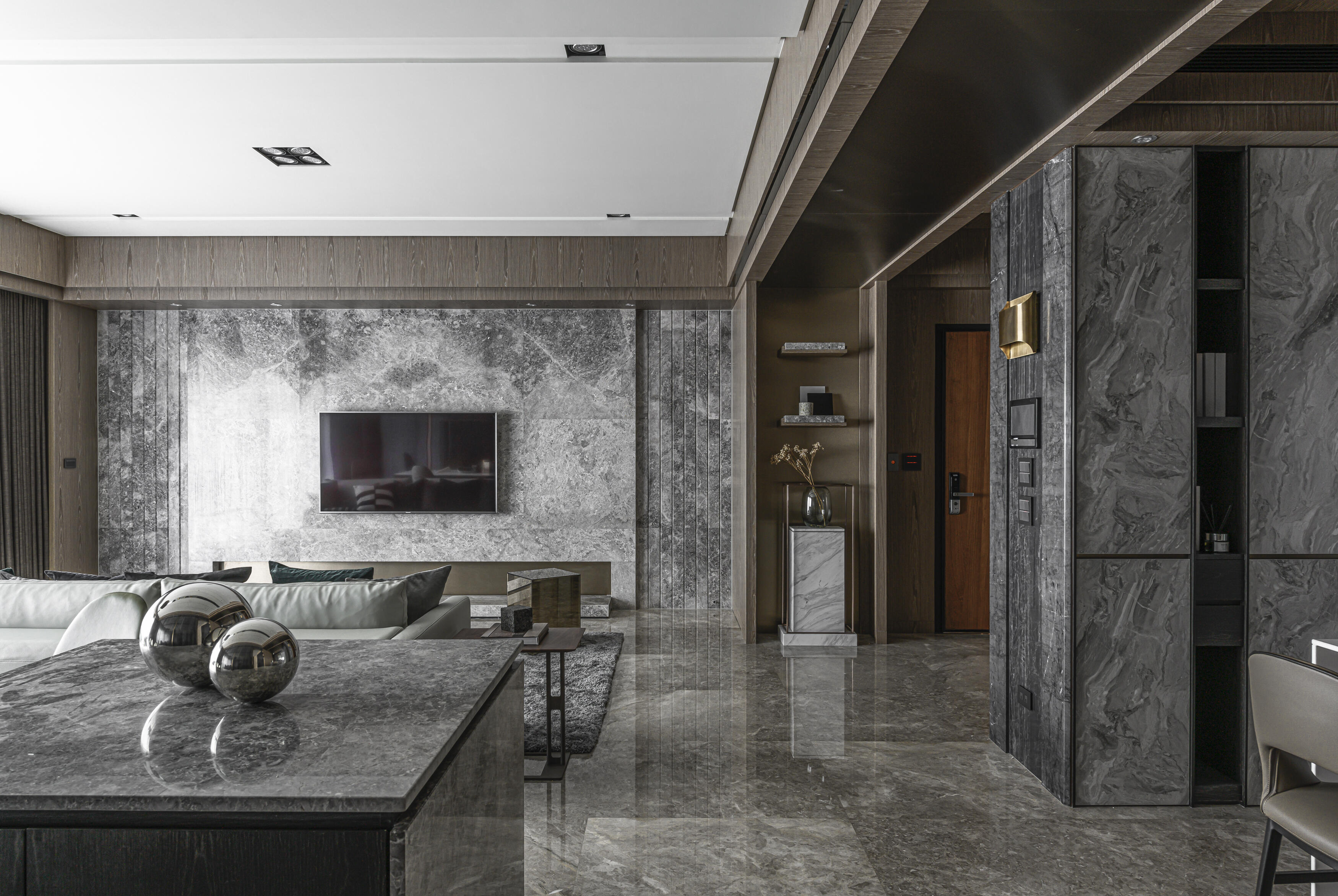 甫入門,即迎來一覽無遺的開闊視感,讓心境隨之開朗。玄關與餐廚區的石紋雙面櫃體,不僅鋪陳出恢弘氣勢,更完善了收納機能,並巧妙發揮了劃分領域的作用。客廳電視牆選用銀河灰大理石,其兩側刻鑿的垂直溝縫造型,流露出對稱之美,磅礡氣勢不言而喻。移步至餐廳,主牆面則揉合了異材質的巧思,使用石材薄板,並以精緻的鍍鈦金屬作切割,展現出清麗優雅的迷人面貌,每一處細節都彰顯著對品味的極致追求。