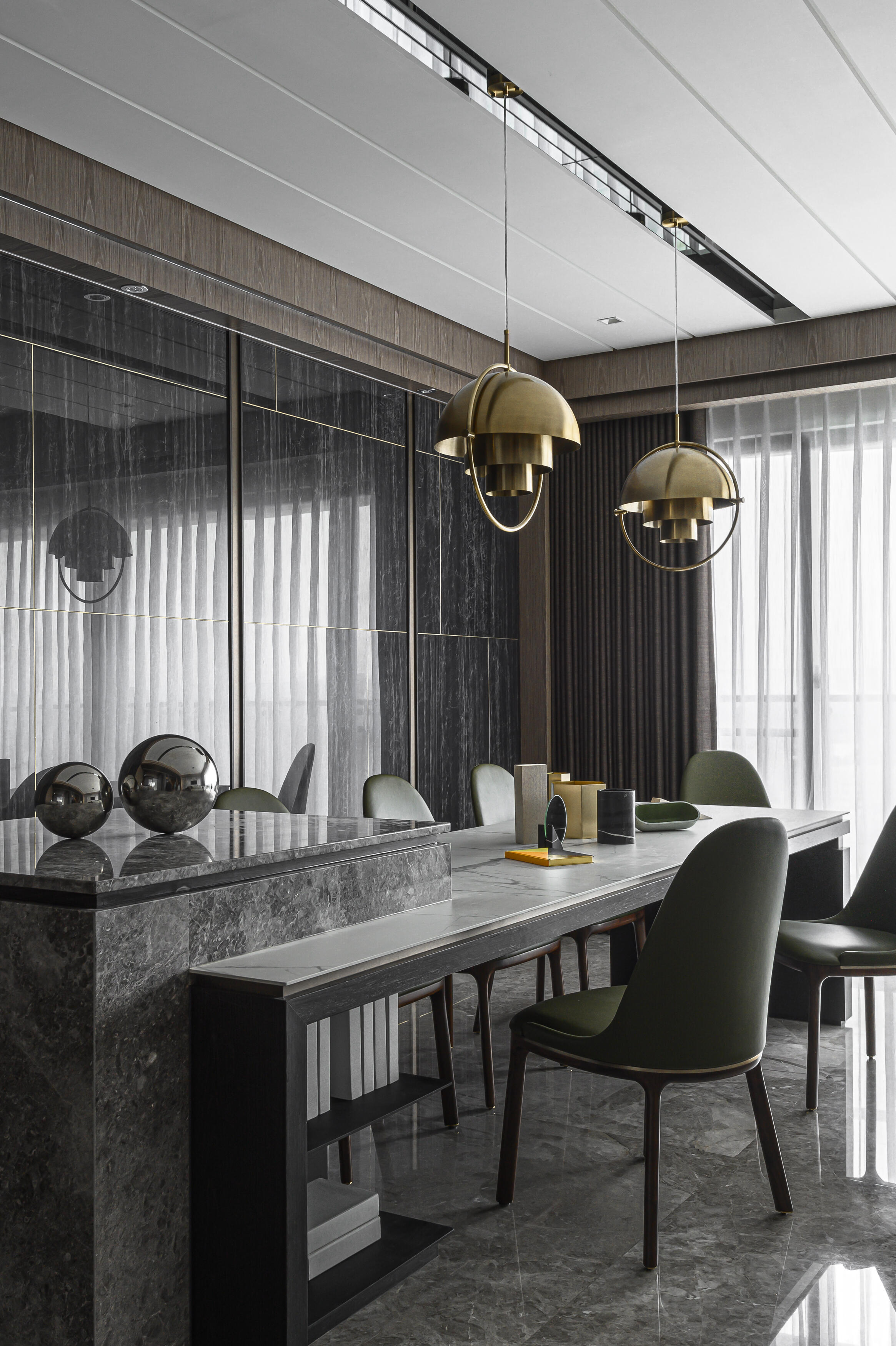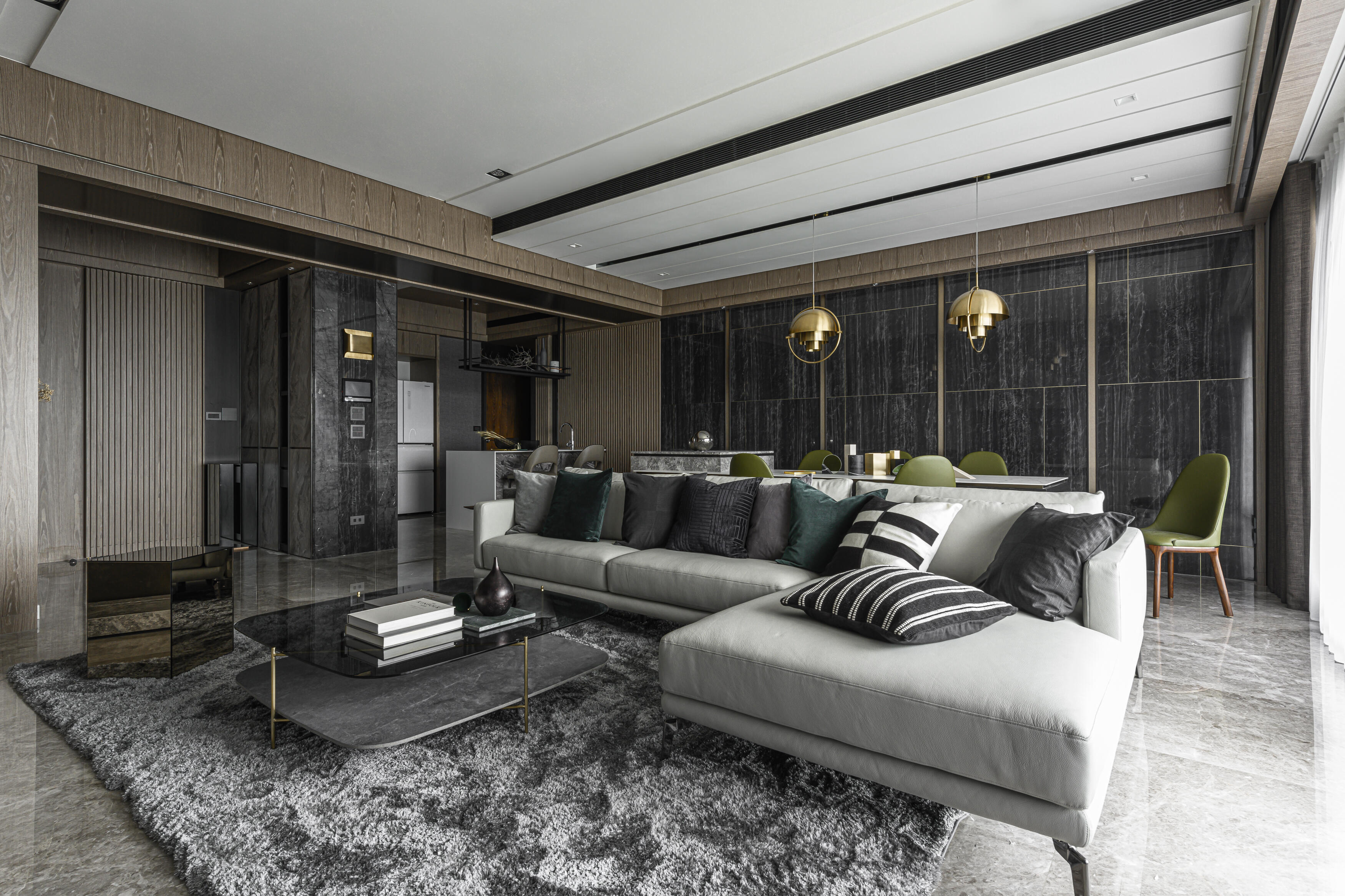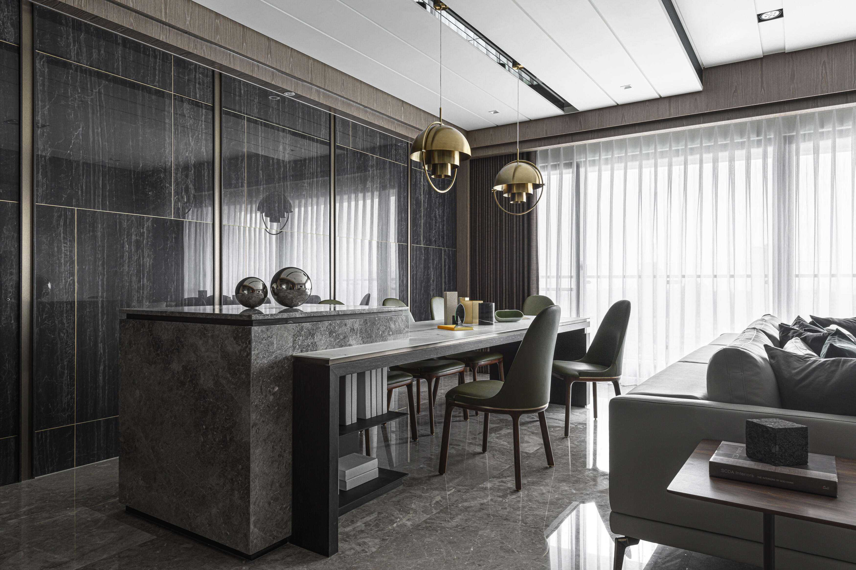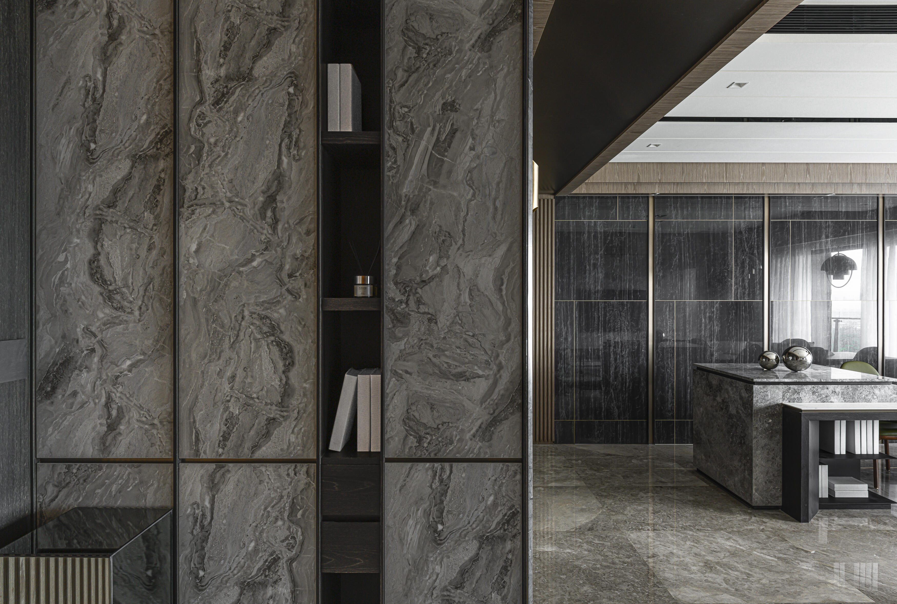 甫入門,即迎來一覽無遺的開闊視感,讓心境隨之開朗。玄關與餐廚區的石紋雙面櫃體,不僅鋪陳出恢弘氣勢,更完善了收納機能,並巧妙發揮了劃分領域的作用。客廳電視牆選用銀河灰大理石,其兩側刻鑿的垂直溝縫造型,流露出對稱之美,磅礡氣勢不言而喻。移步至餐廳,主牆面則揉合了異材質的巧思,使用石材薄板,並以精緻的鍍鈦金屬作切割,展現出清麗優雅的迷人面貌,每一處細節都彰顯著對品味的極致追求。