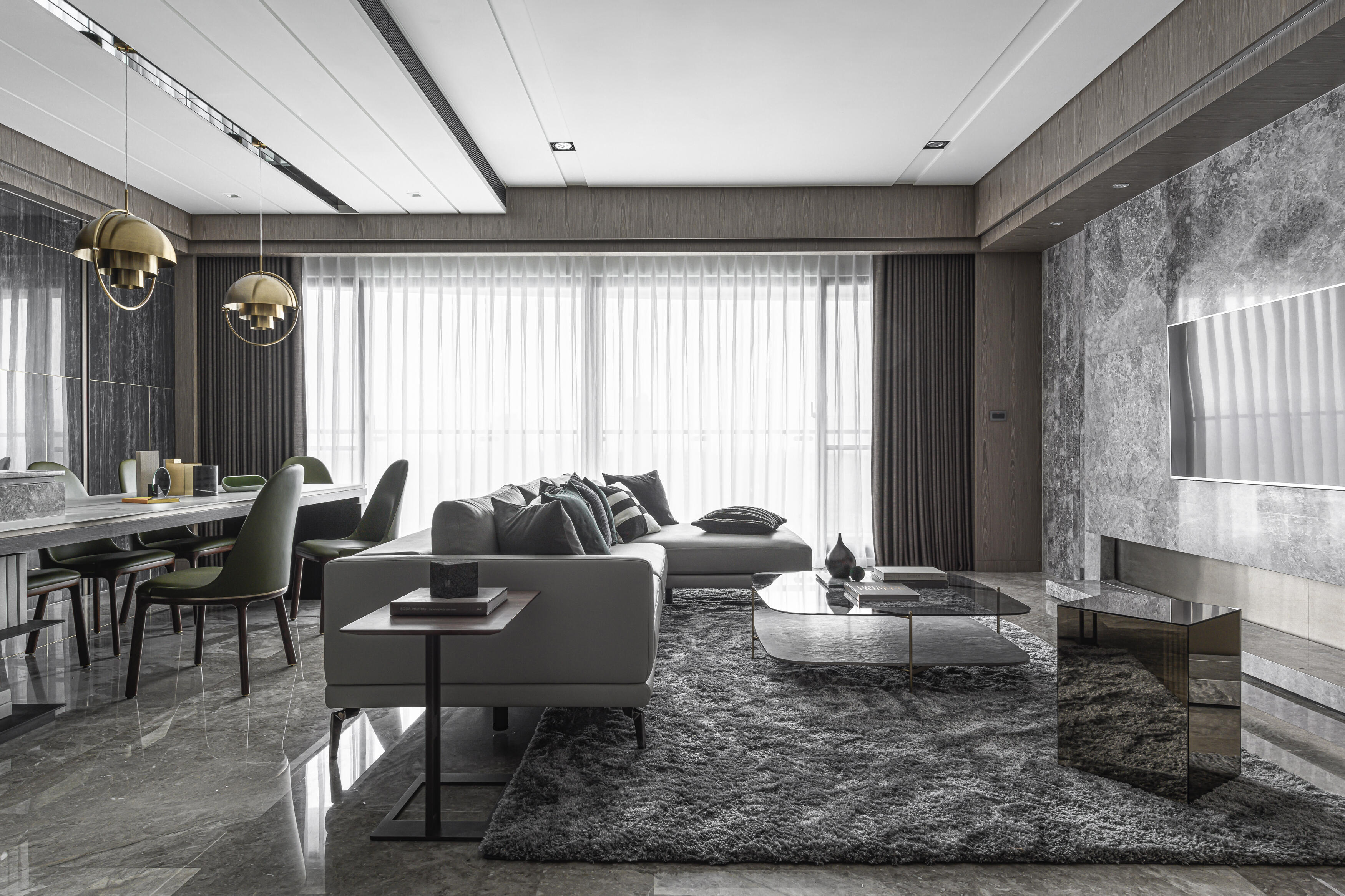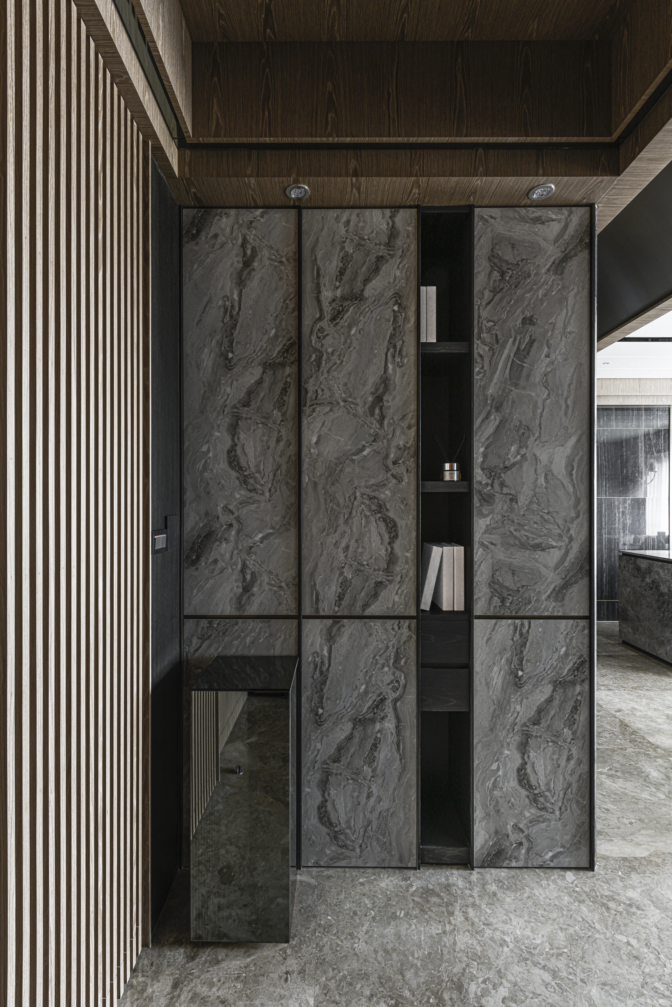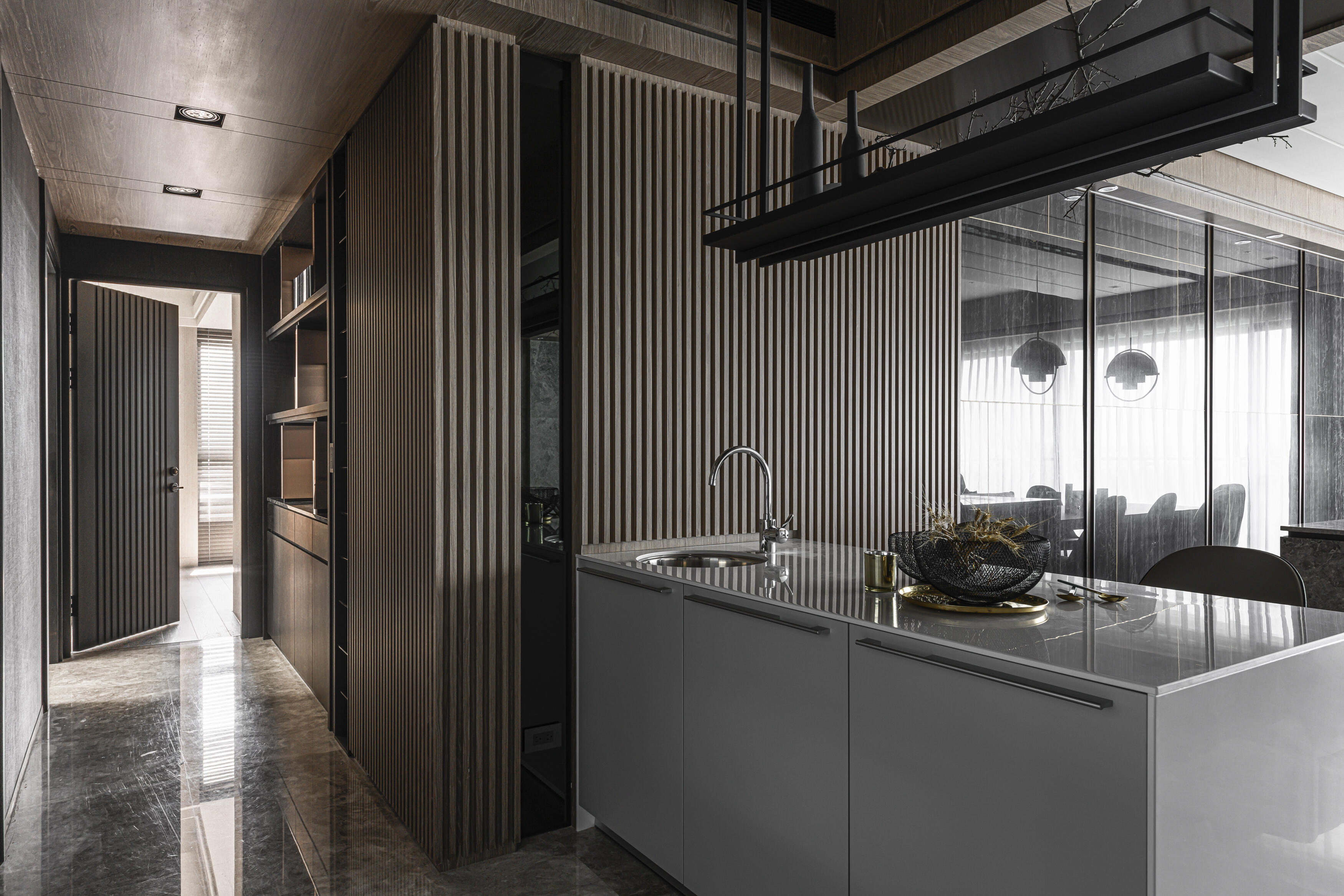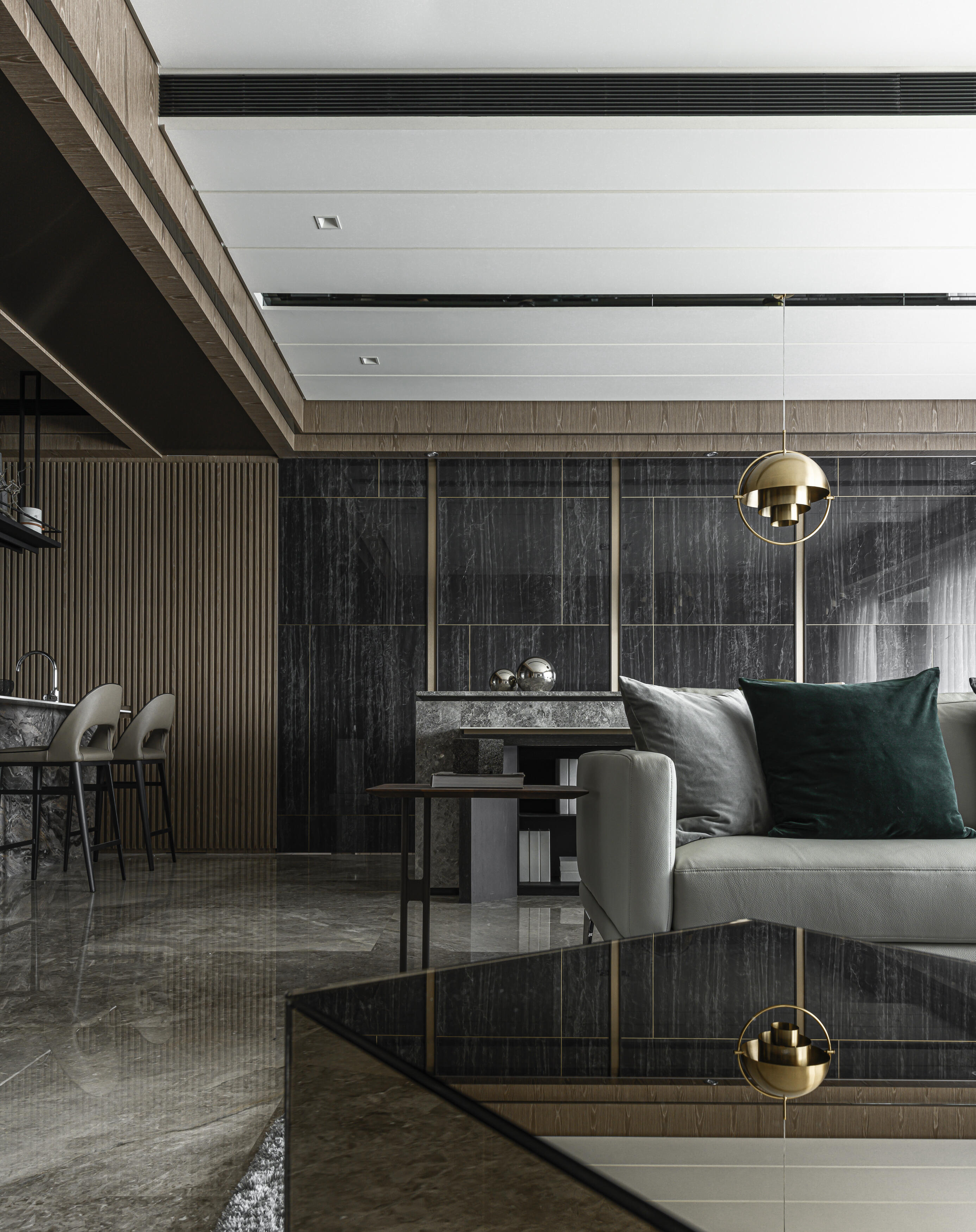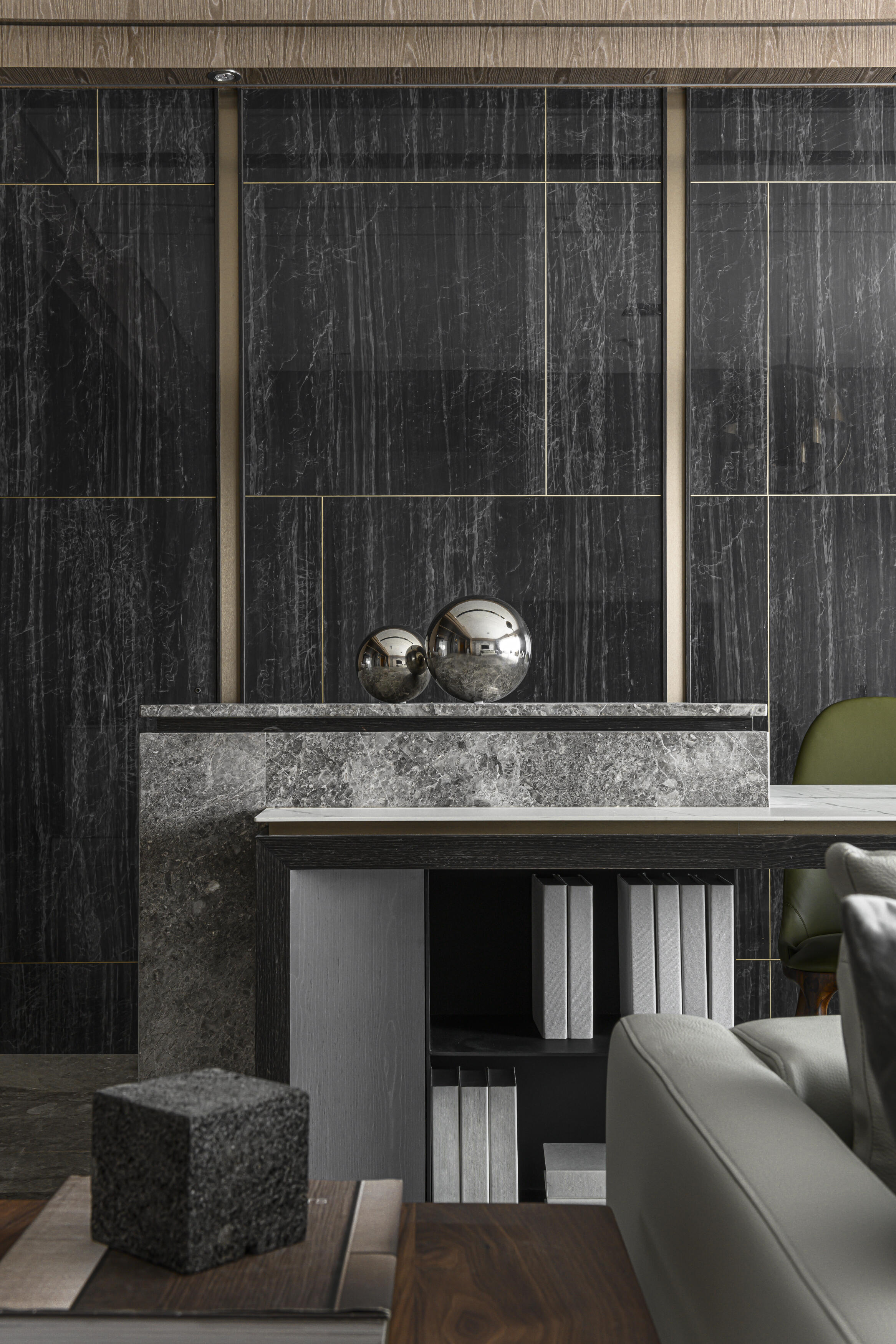甫入門,即迎來一覽無遺的開闊視感,讓心境隨之開朗。玄關與餐廚區的石紋雙面櫃體,不僅鋪陳出恢弘氣勢,更完善了收納機能,並巧妙發揮了劃分領域的作用。客廳電視牆選用銀河灰大理石,其兩側刻鑿的垂直溝縫造型,流露出對稱之美,磅礡氣勢不言而喻。移步至餐廳,主牆面則揉合了異材質的巧思,使用石材薄板,並以精緻的鍍鈦金屬作切割,展現出清麗優雅的迷人面貌,每一處細節都彰顯著對品味的極致追求。