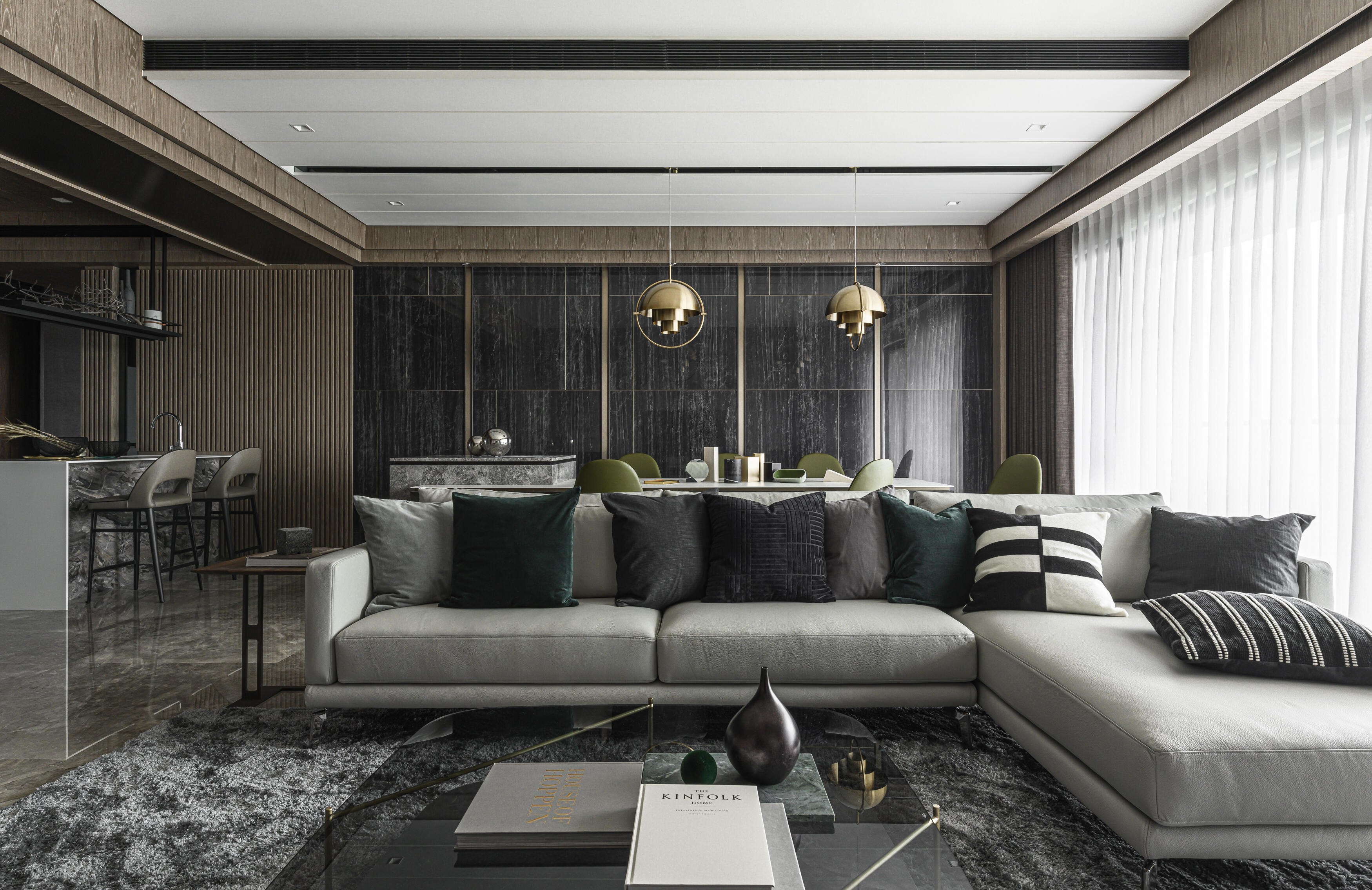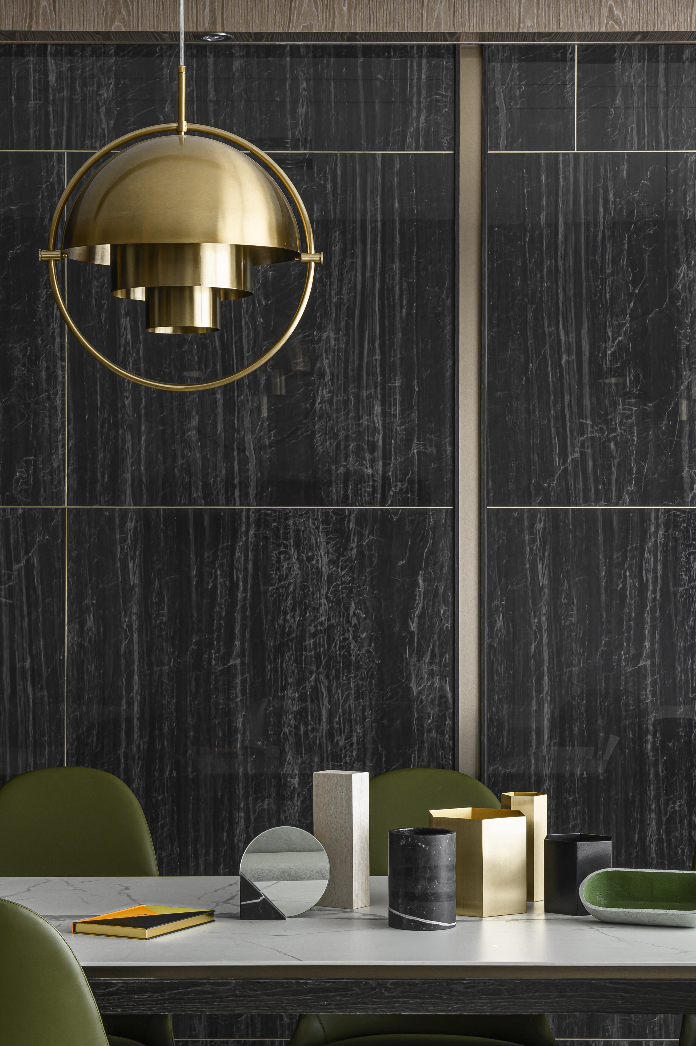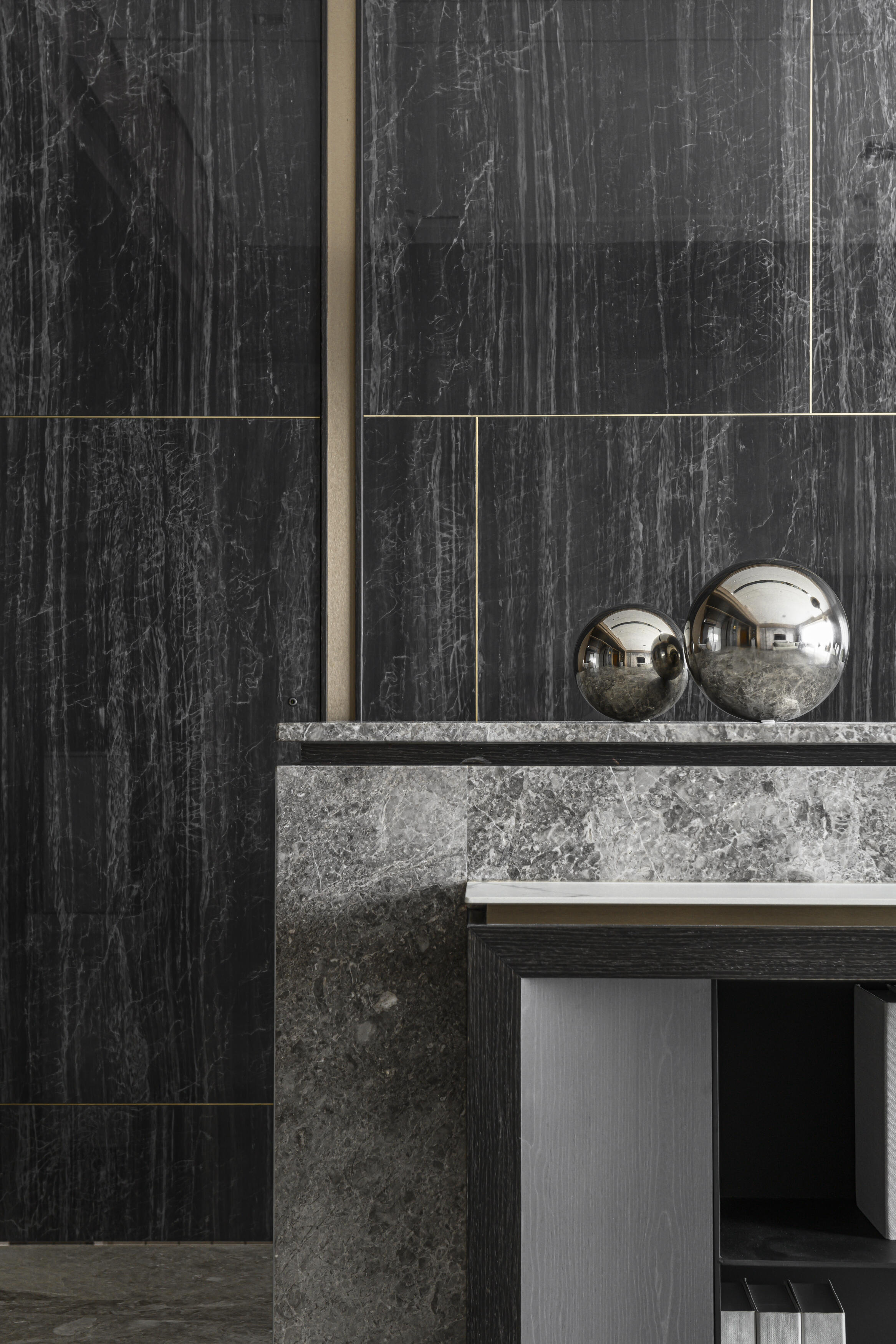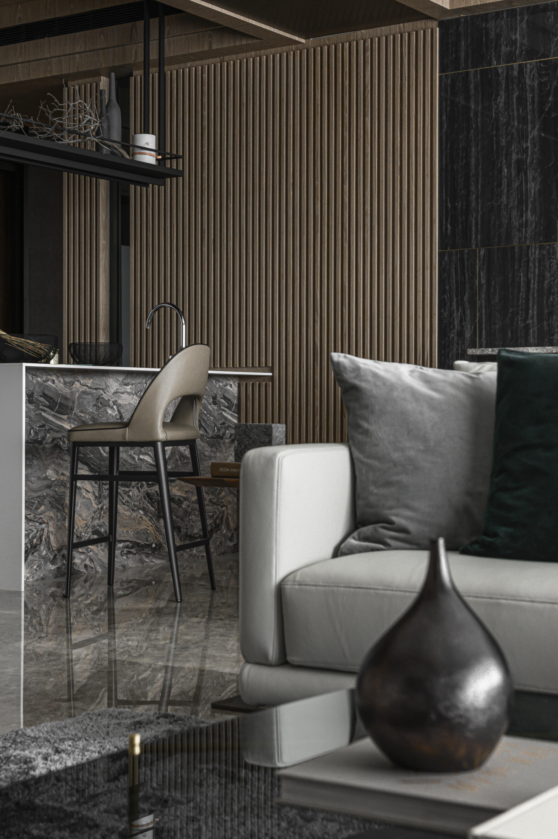 甫入門,即迎來一覽無遺的開闊視感,讓心境隨之開朗。玄關與餐廚區的石紋雙面櫃體,不僅鋪陳出恢弘氣勢,更完善了收納機能,並巧妙發揮了劃分領域的作用。客廳電視牆選用銀河灰大理石,其兩側刻鑿的垂直溝縫造型,流露出對稱之美,磅礡氣勢不言而喻。移步至餐廳,主牆面則揉合了異材質的巧思,使用石材薄板,並以精緻的鍍鈦金屬作切割,展現出清麗優雅的迷人面貌,每一處細節都彰顯著對品味的極致追求。