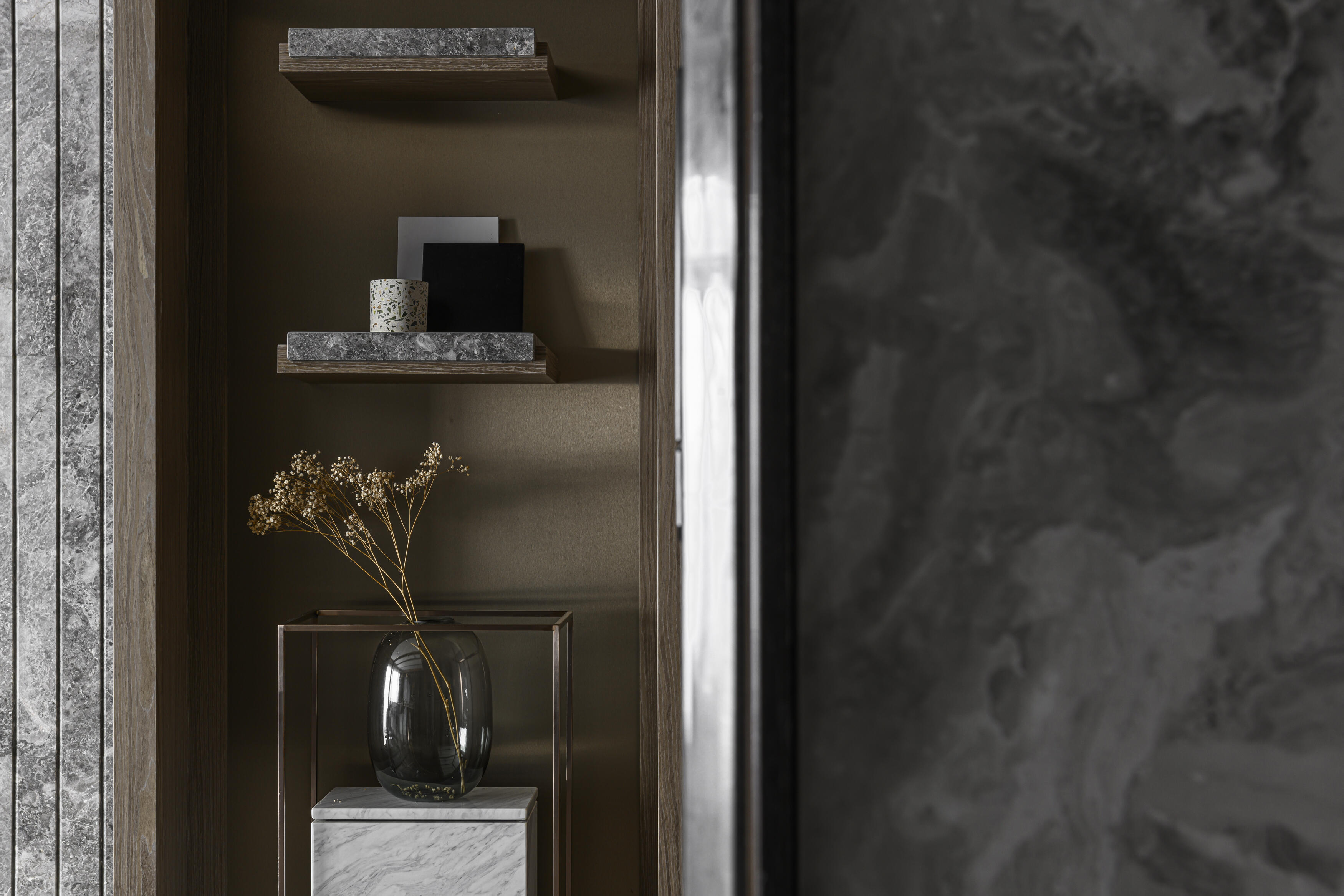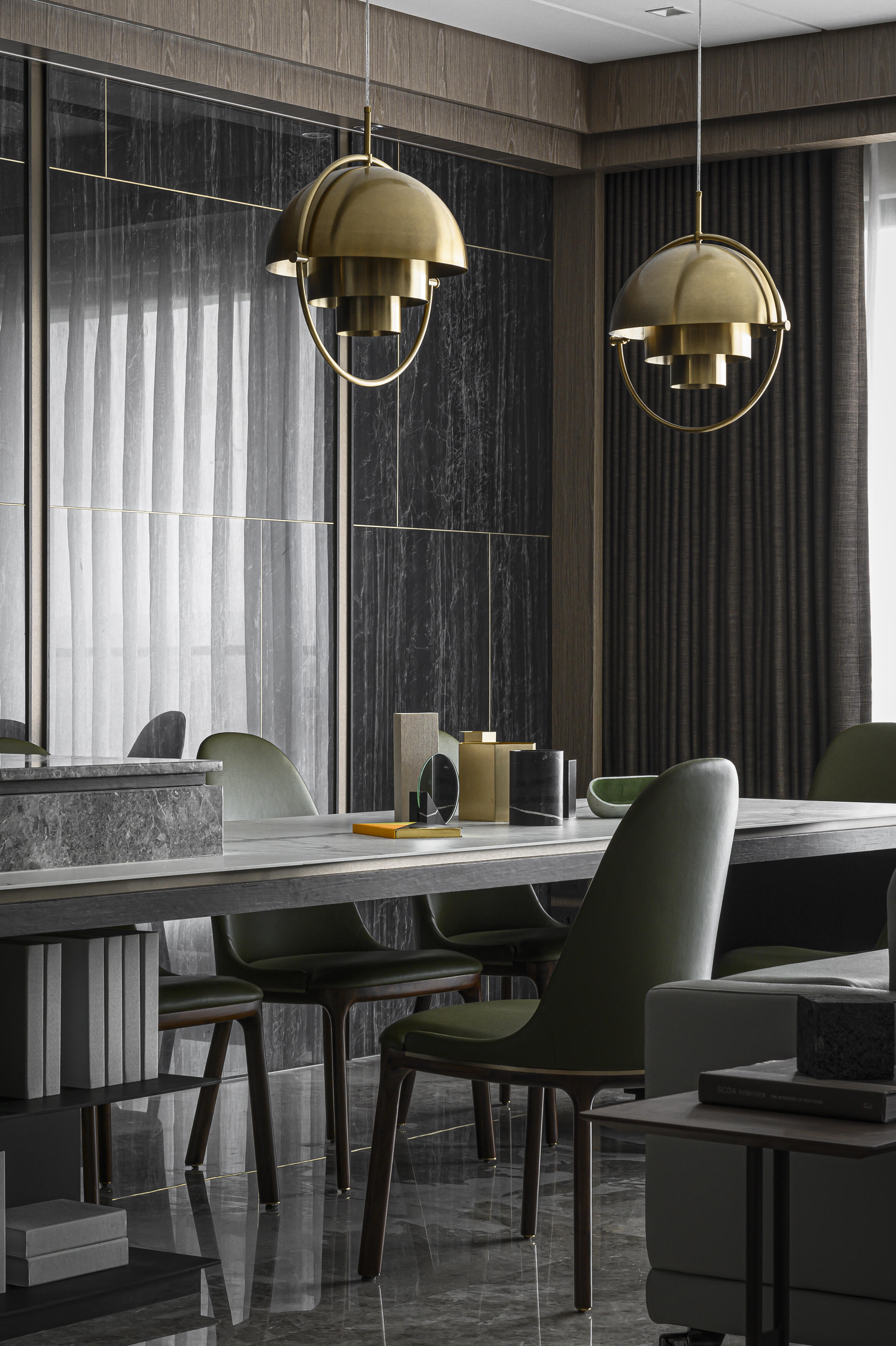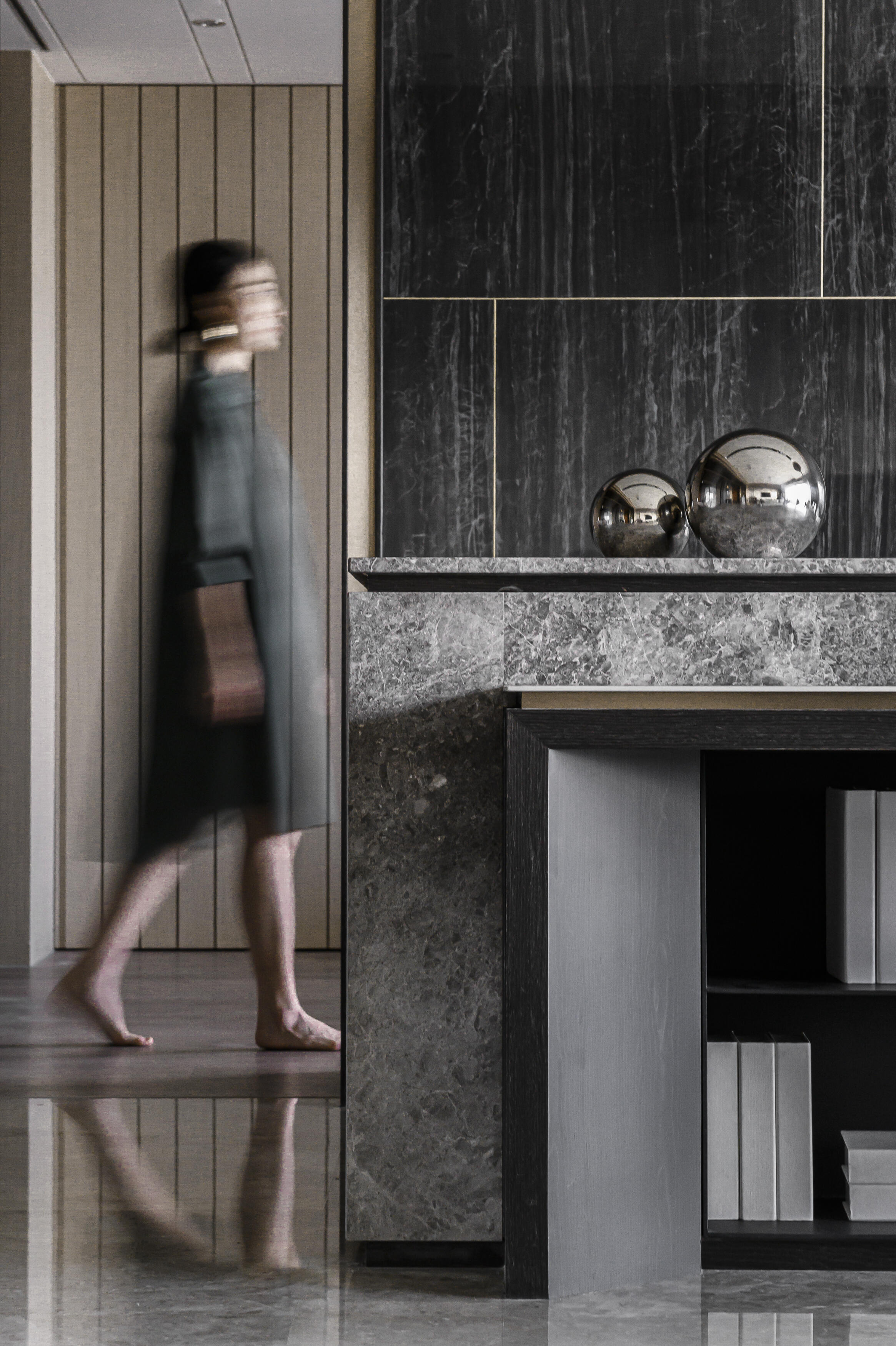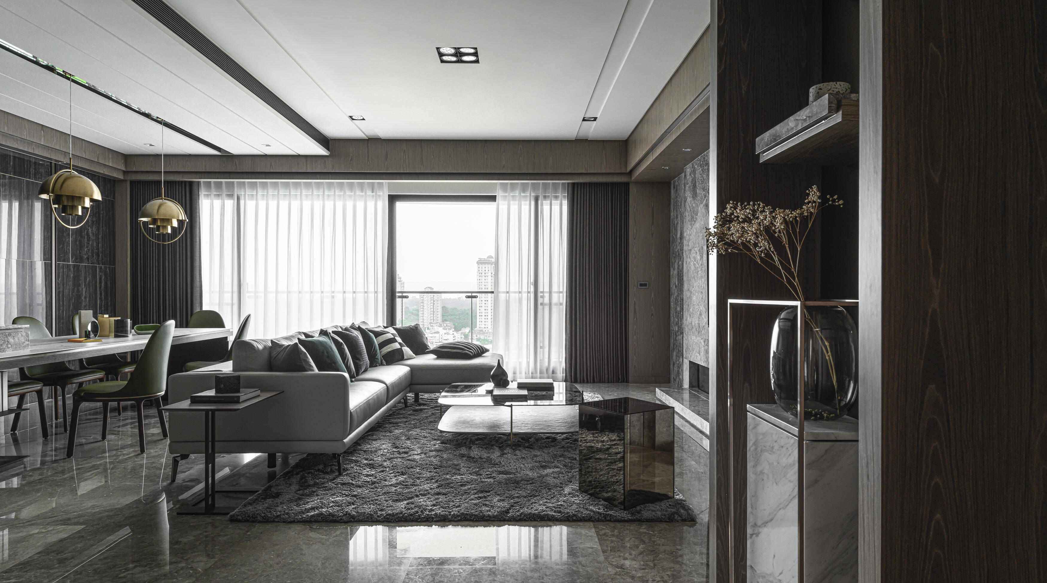 甫入門,即迎來一覽無遺的開闊視感,讓心境隨之開朗。玄關與餐廚區的石紋雙面櫃體,不僅鋪陳出恢弘氣勢,更完善了收納機能,並巧妙發揮了劃分領域的作用。客廳電視牆選用銀河灰大理石,其兩側刻鑿的垂直溝縫造型,流露出對稱之美,磅礡氣勢不言而喻。移步至餐廳,主牆面則揉合了異材質的巧思,使用石材薄板,並以精緻的鍍鈦金屬作切割,展現出清麗優雅的迷人面貌,每一處細節都彰顯著對品味的極致追求。