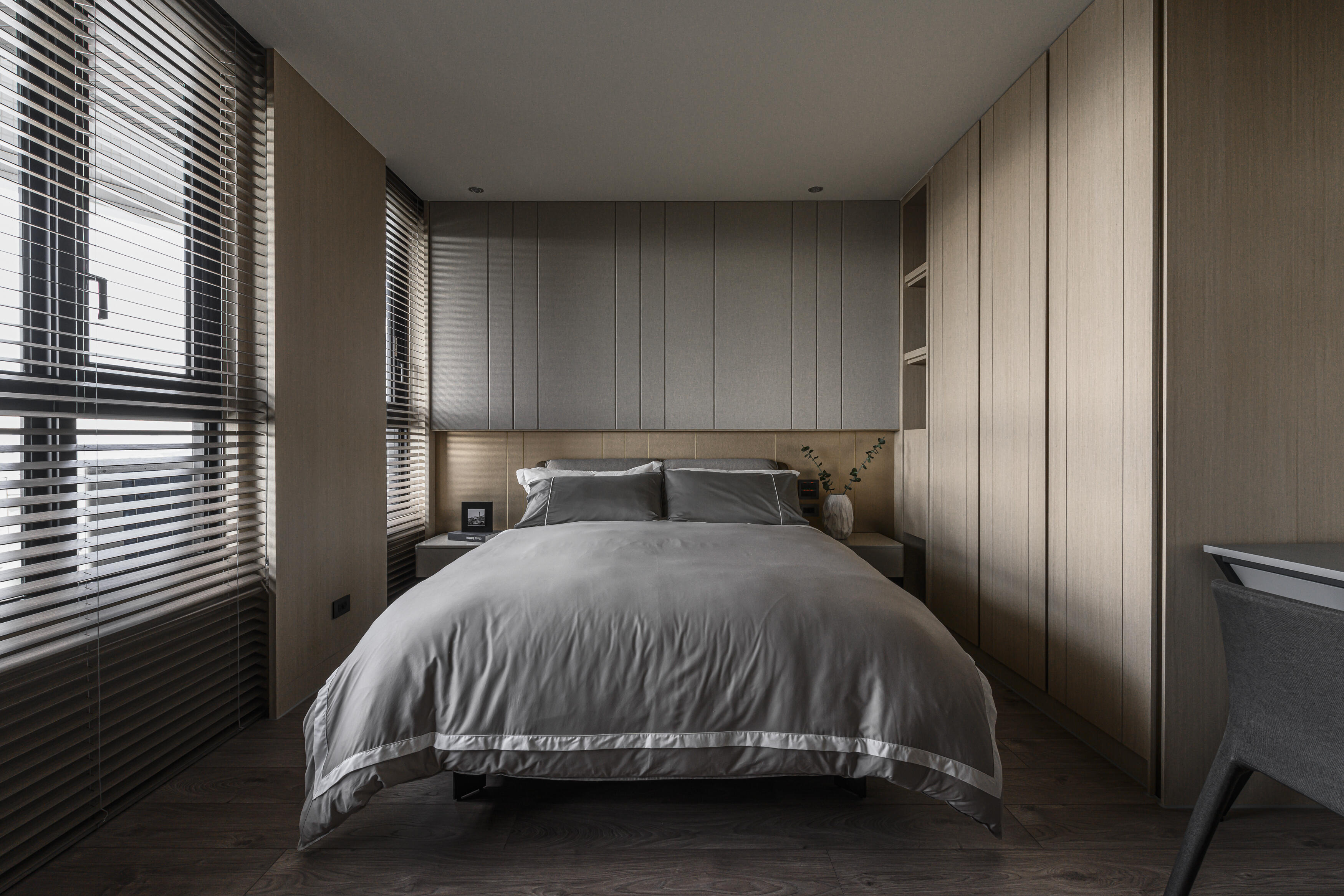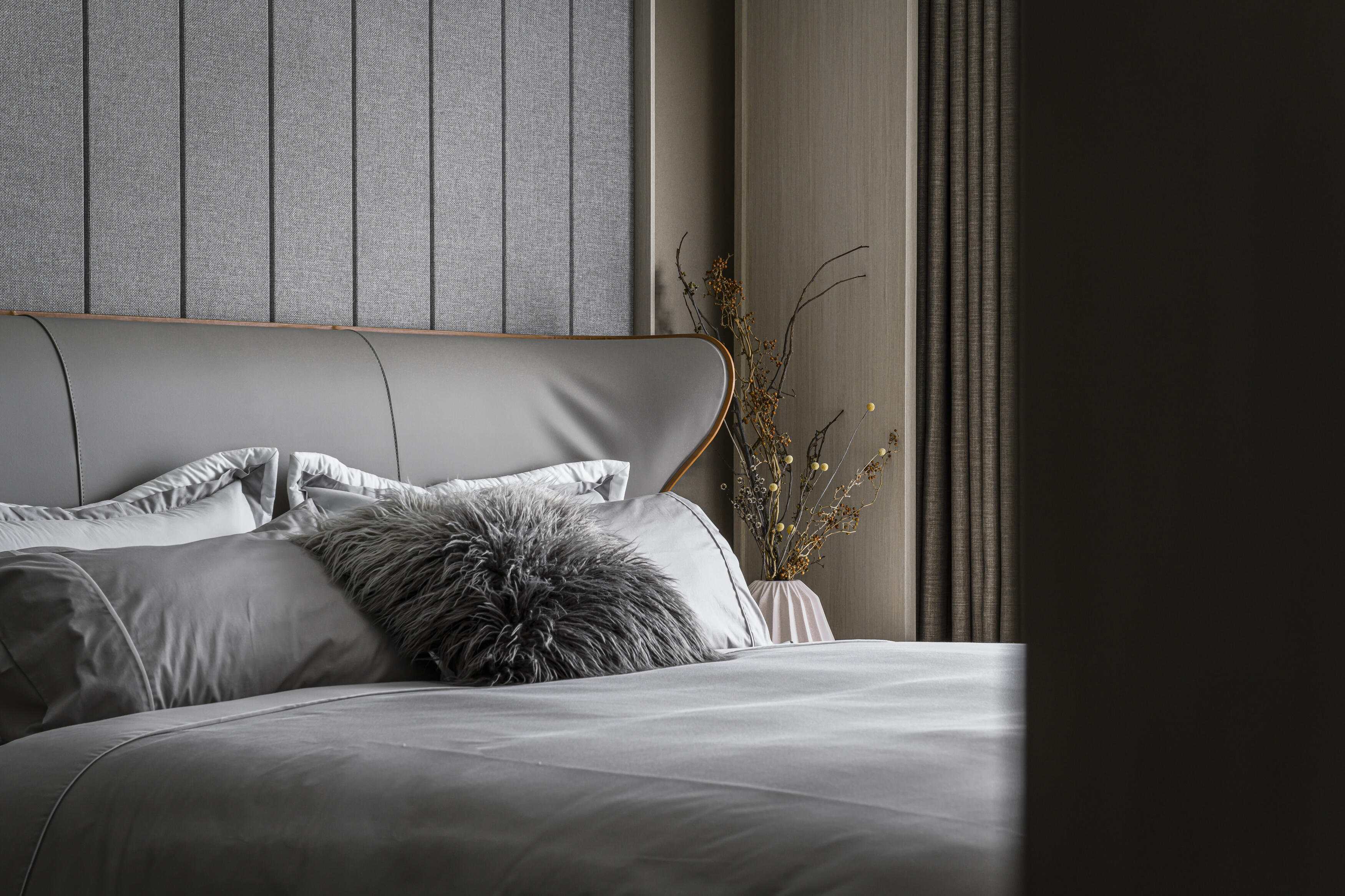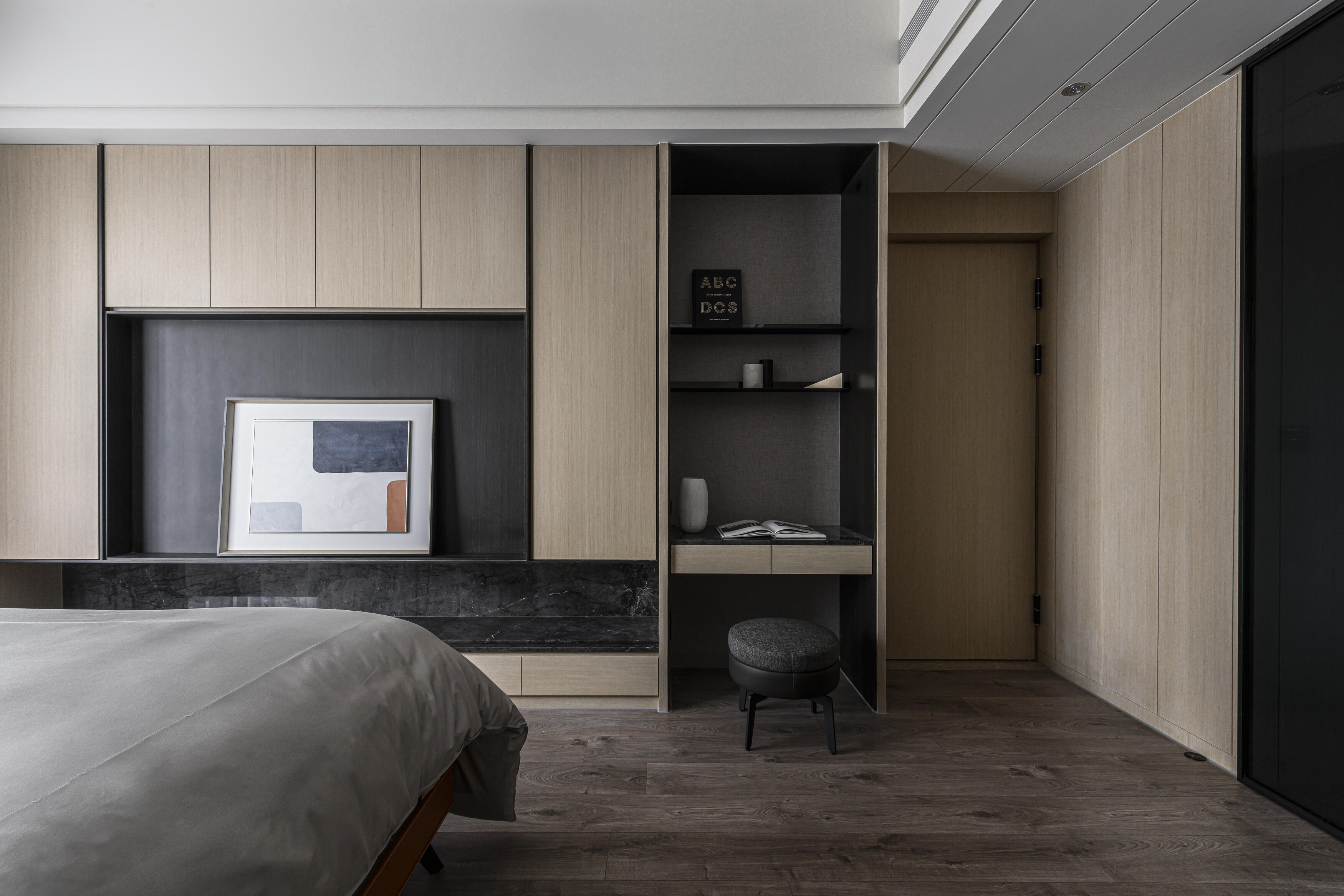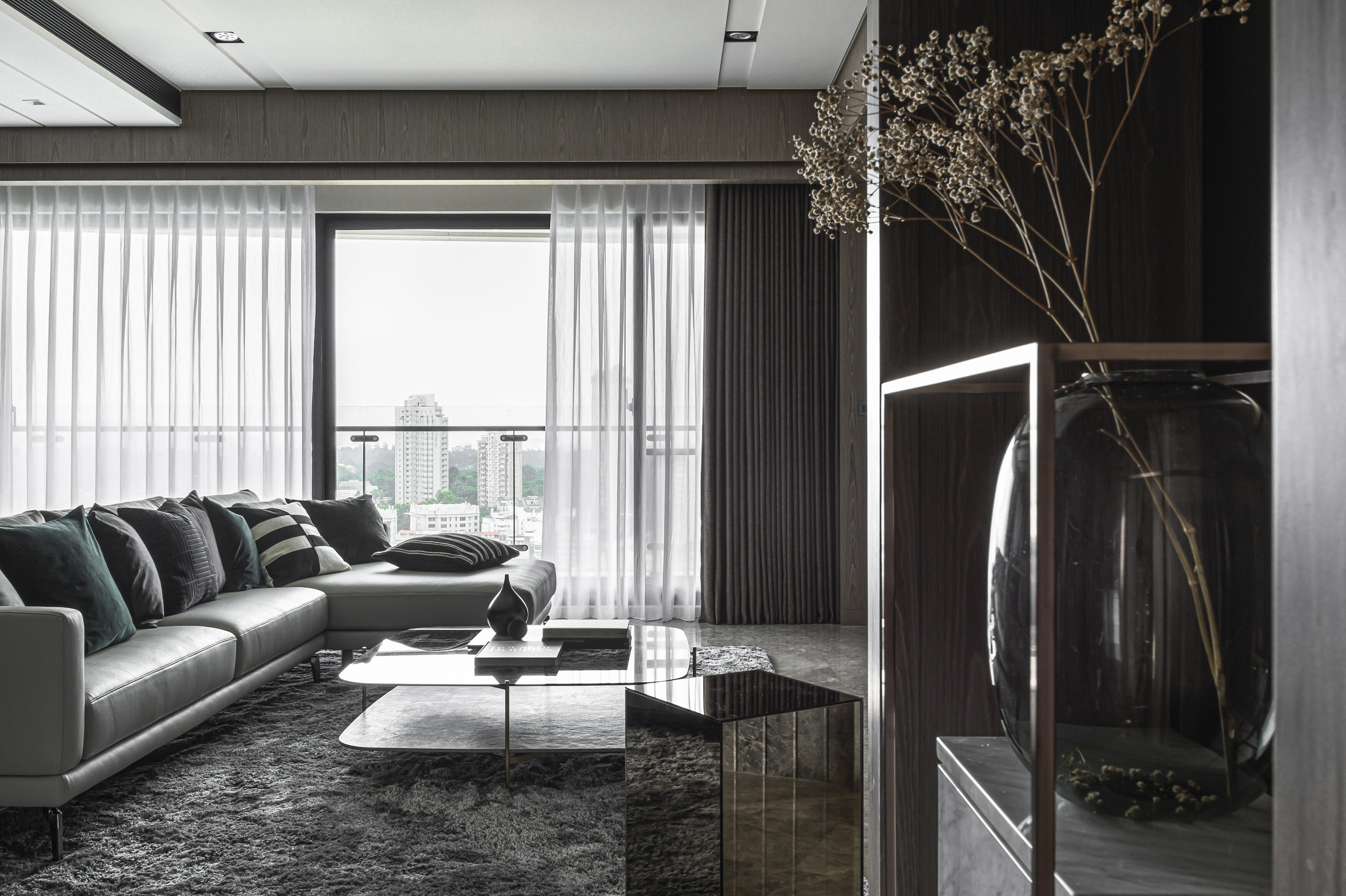鑒於屋主對簡約沉穩風格的偏愛,以洗鍊的線條刻劃出空間的張力。在材質選用上,巧妙運用不同肌理,創造出豐富而內斂的層次感;色澤則以經典的黑灰白為主調,輔以溫暖的大地色系,營造出淡雅而富有品味的風格。更藉由大面開窗,悉心攬入充足的採光及獨特的港都美景,並透過穿透與疊合的手法,無限拉闊空間尺度,串聯起流暢的動線,共同形塑出一個溫馨舒適的放鬆環境。