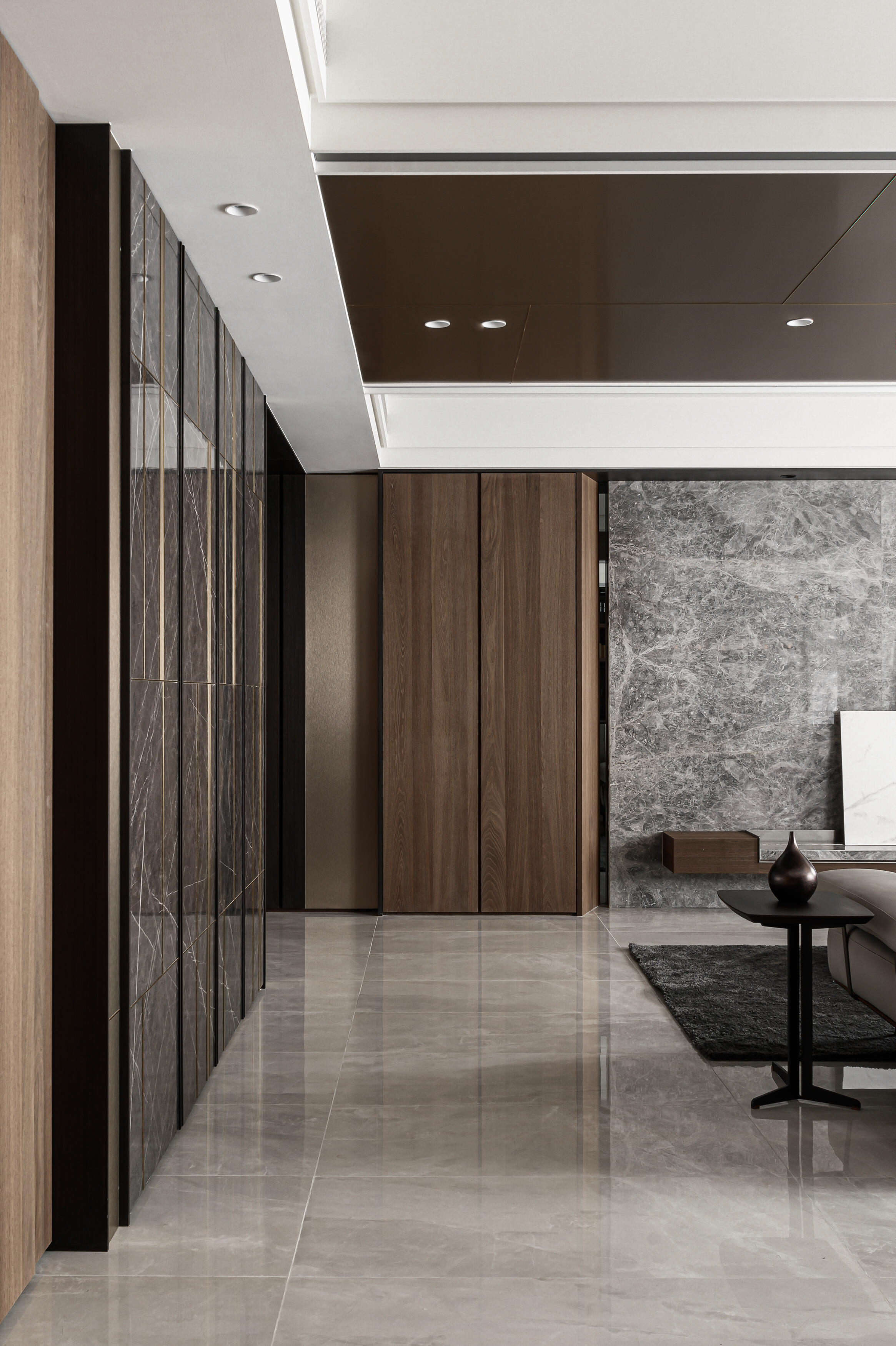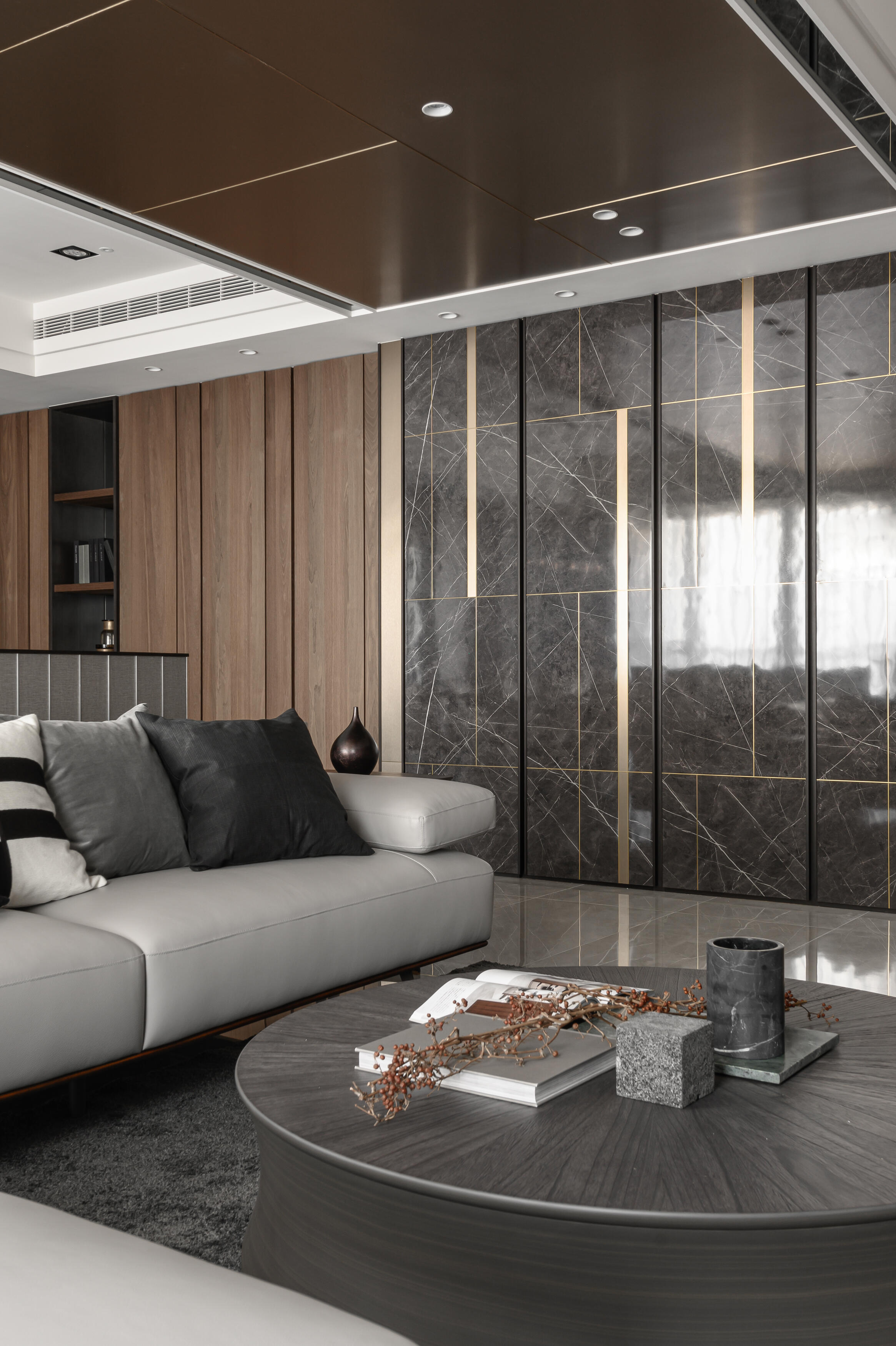 為滿足女主人對於「家如旅宿」的嚮往,我們以自然元素融入每個角落,營造度假般的放鬆氛圍。選用淺色石材與深色實木交織出溫潤的空間基調,電視主牆以大面積灰調石材鋪陳,勾勒低調內斂的優雅氣質,透過實木皮揉合消弭石材的冷冽,平衡空間調性,立面加入金屬鐵件,搭配些許黃銅點綴,讓空間增添溫度與細緻感。