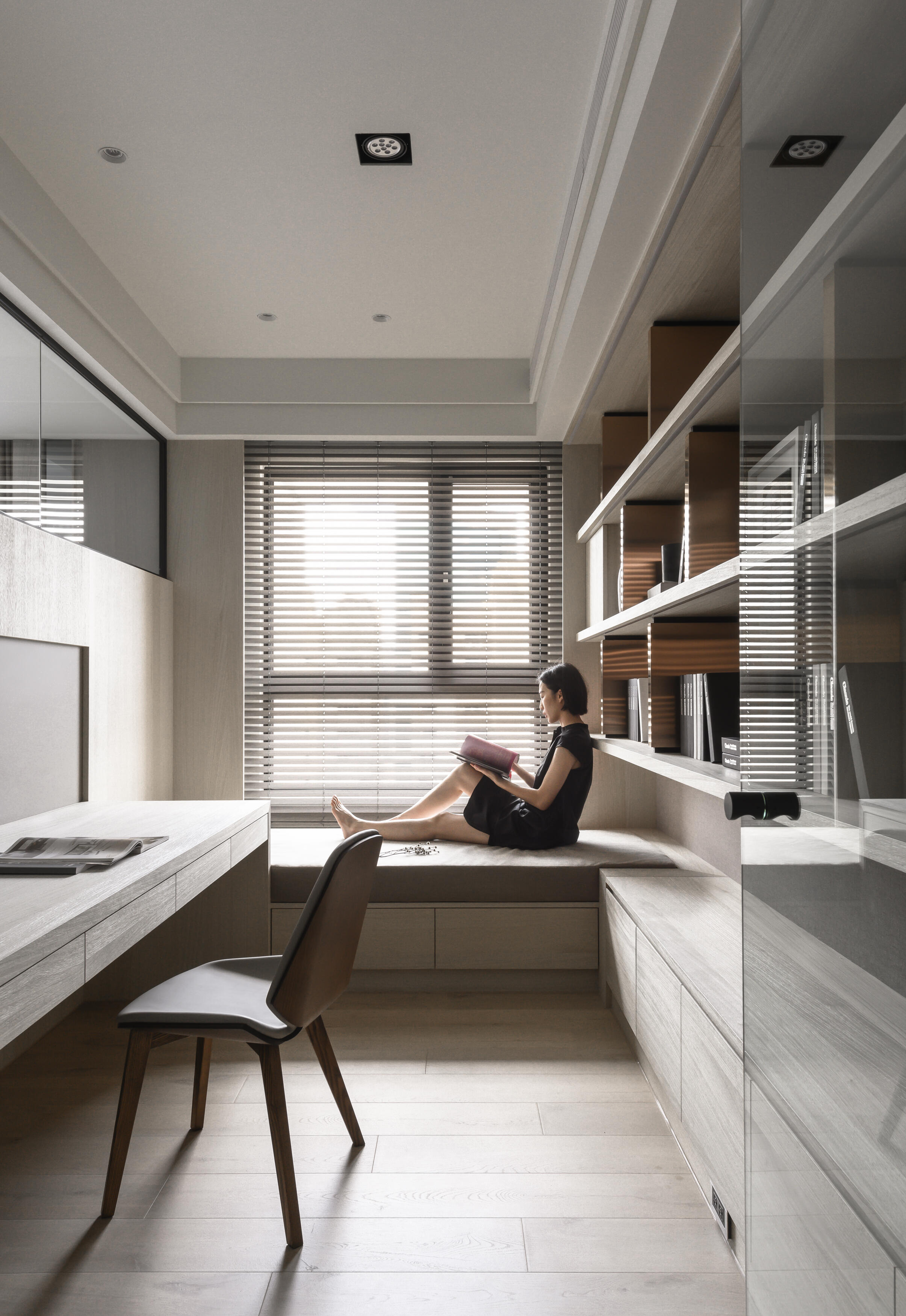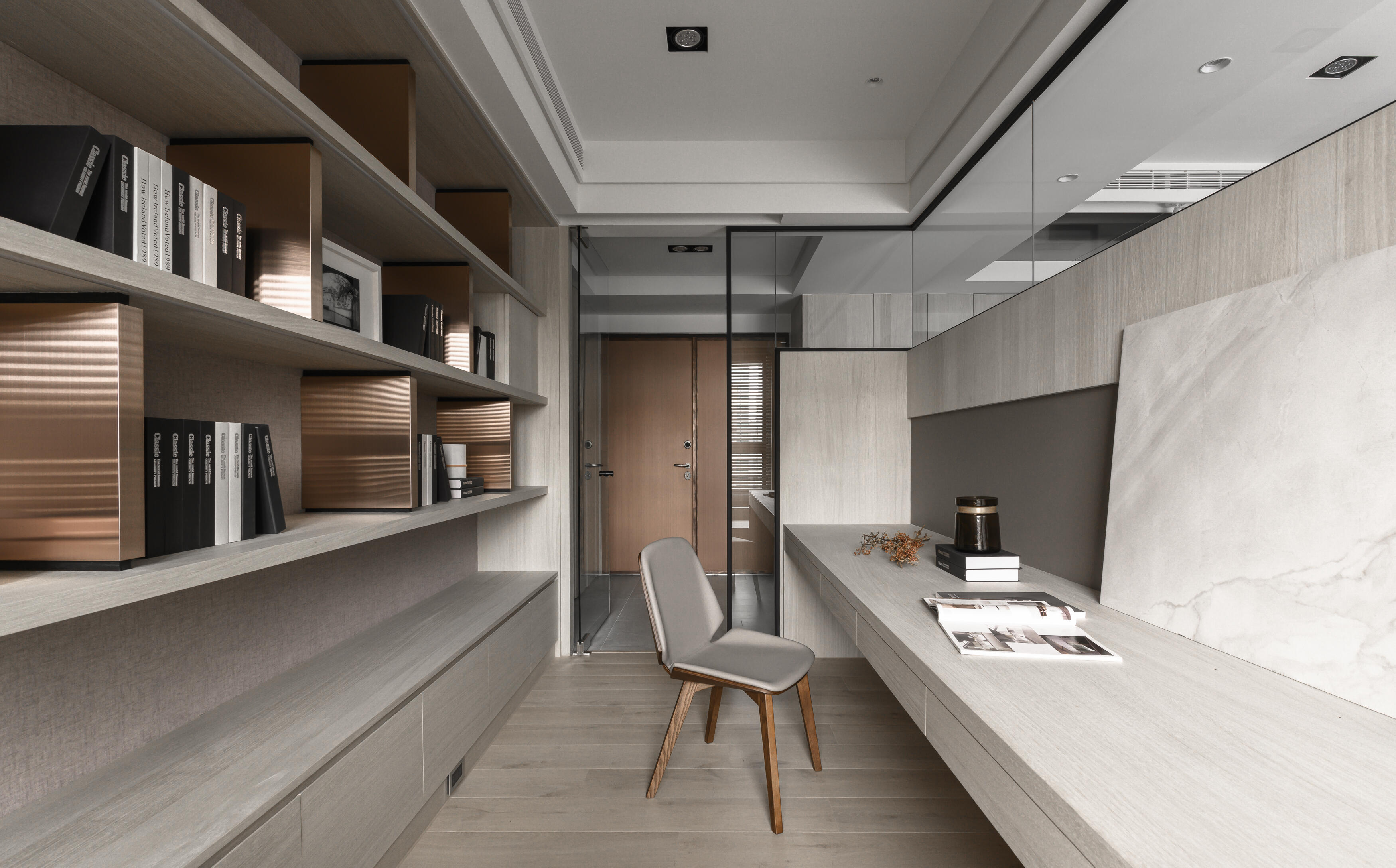 『想像一家人圍坐在溫暖的壁爐旁,分享著一天的故事;或是孩子們在明亮的書房裡,專注地閱讀著喜歡的書籍,父母在旁輕聲陪伴…』我們大膽地展開空間,放大生活的尺度,將業主期待的親子共讀書房,配置於入門的區域,以虛實結合的手法處理立面,使書房既能保有靜謐感,又能同時具有穿透性。在格局上將書房、客廳、餐廳依序排列,以玻璃、上懸吊櫃等通透材質提升空間穿透感,讓功能區域也清楚地被標明。