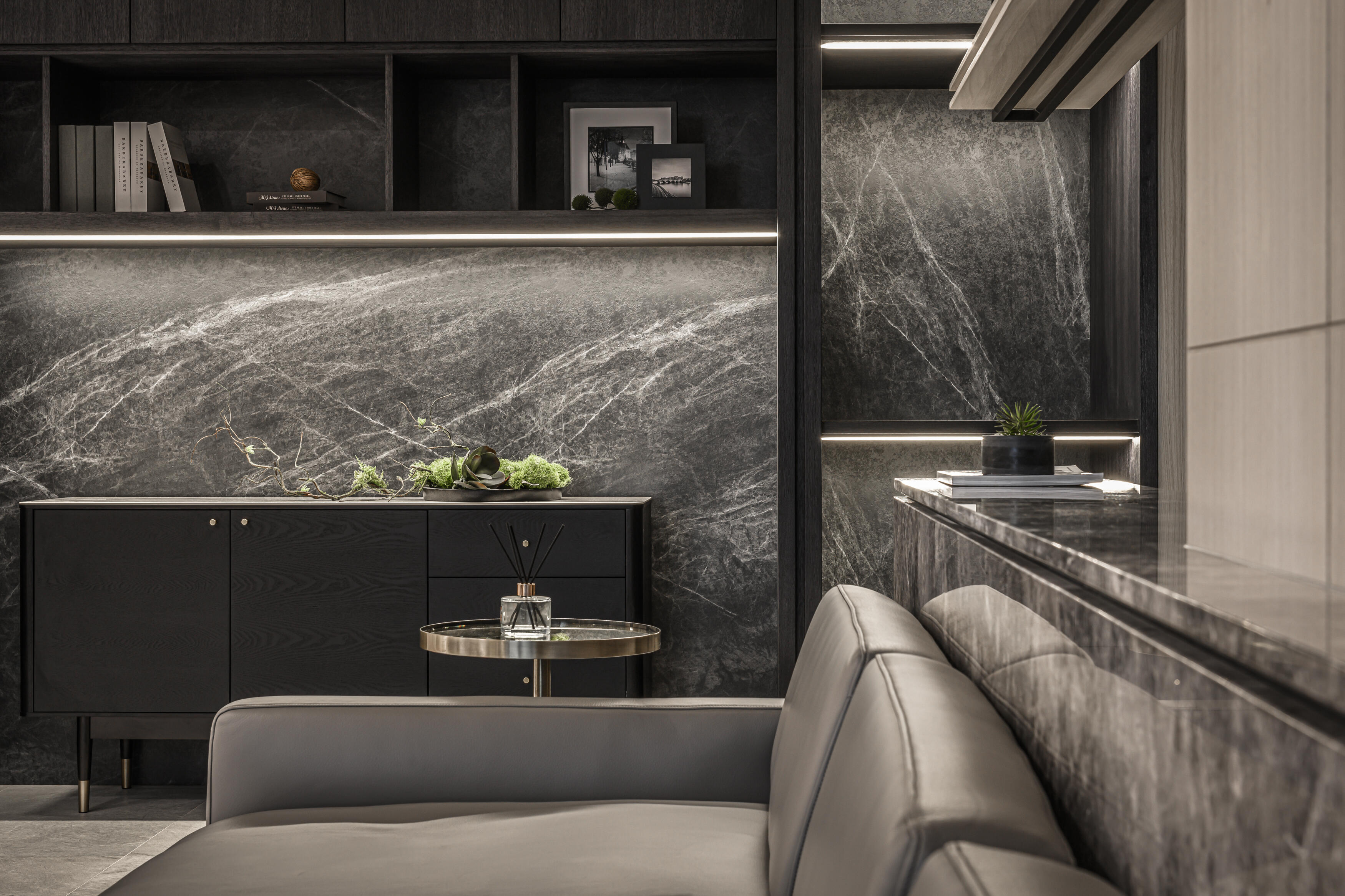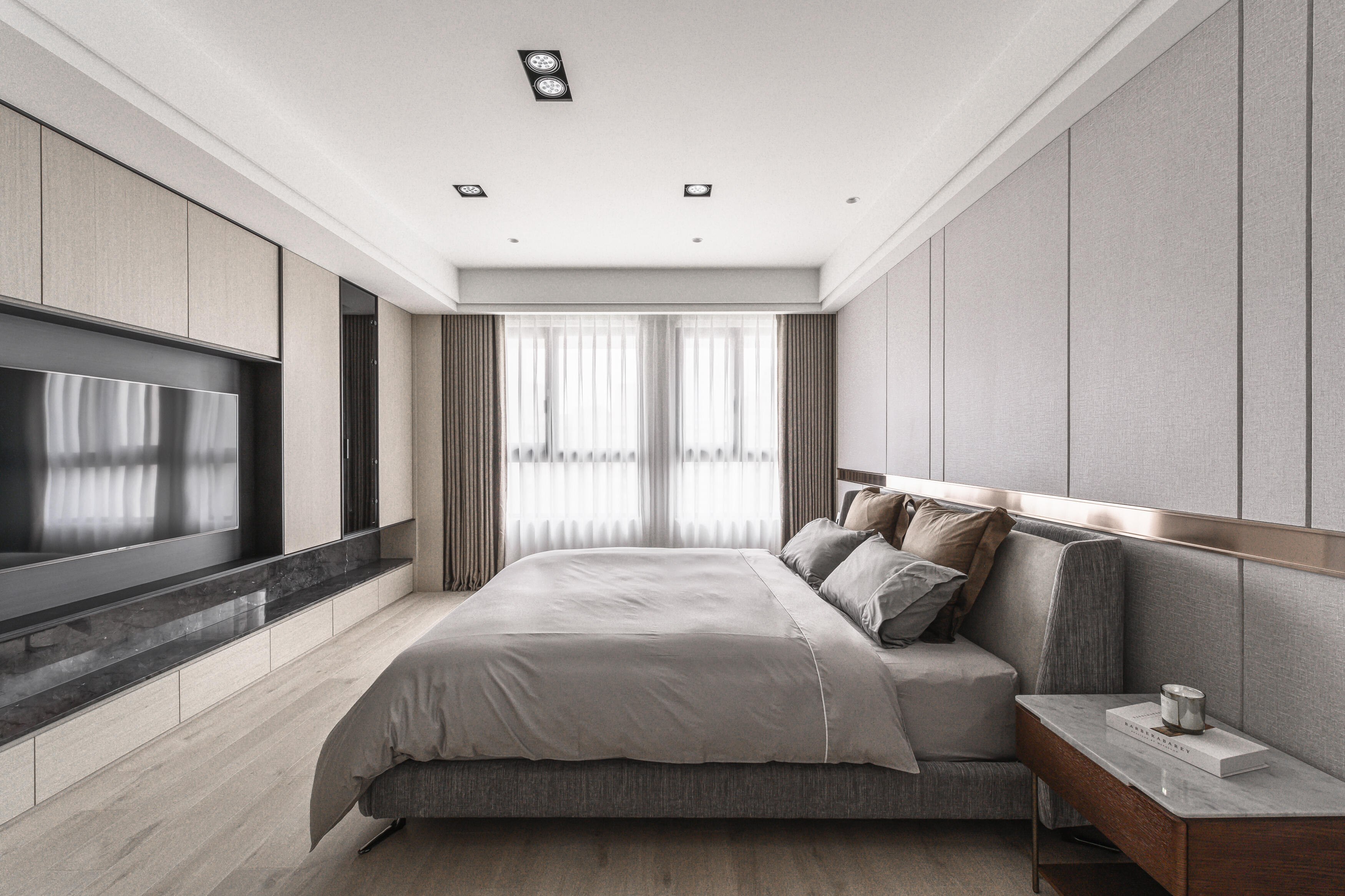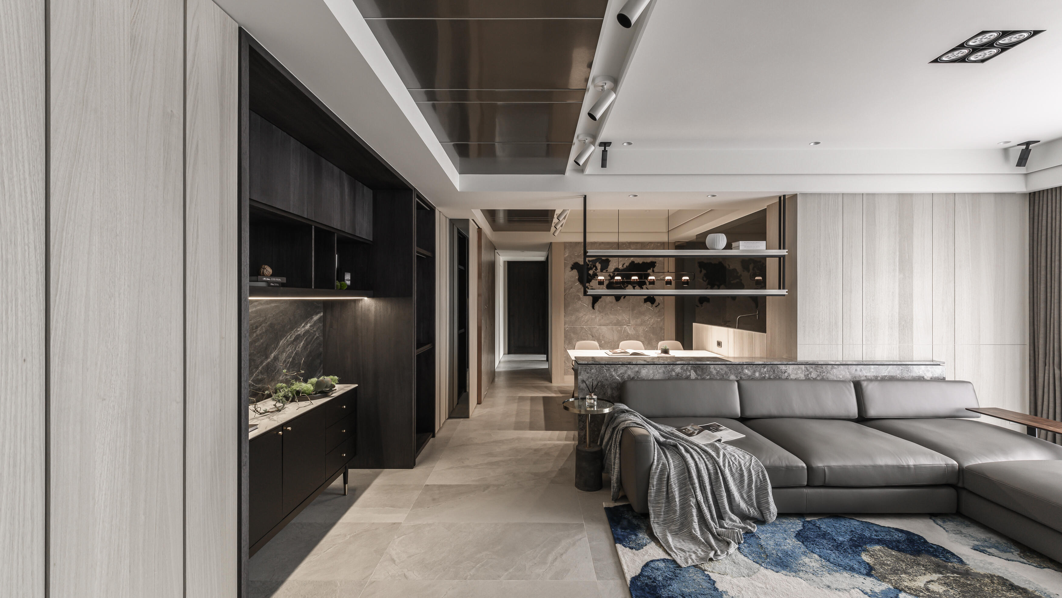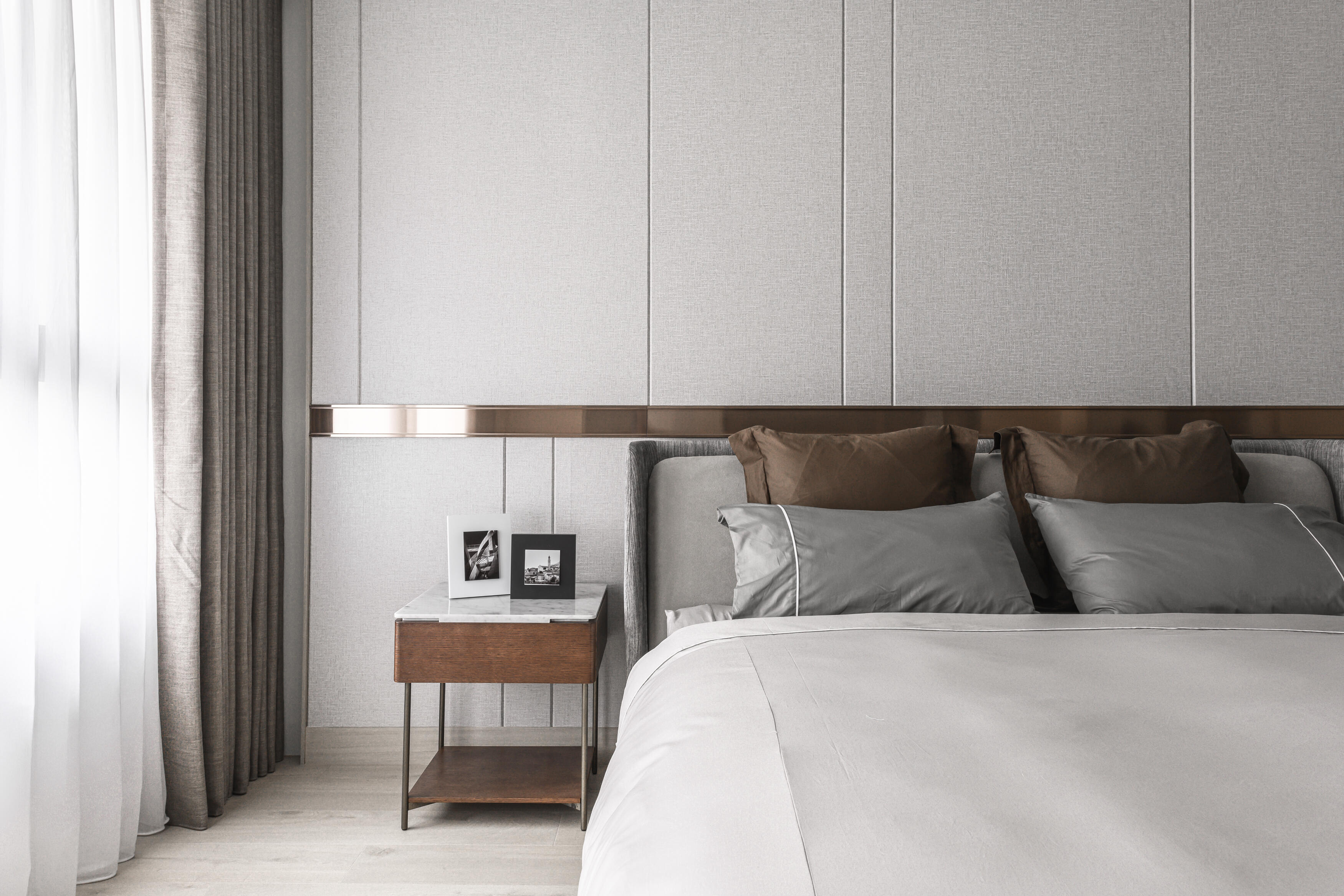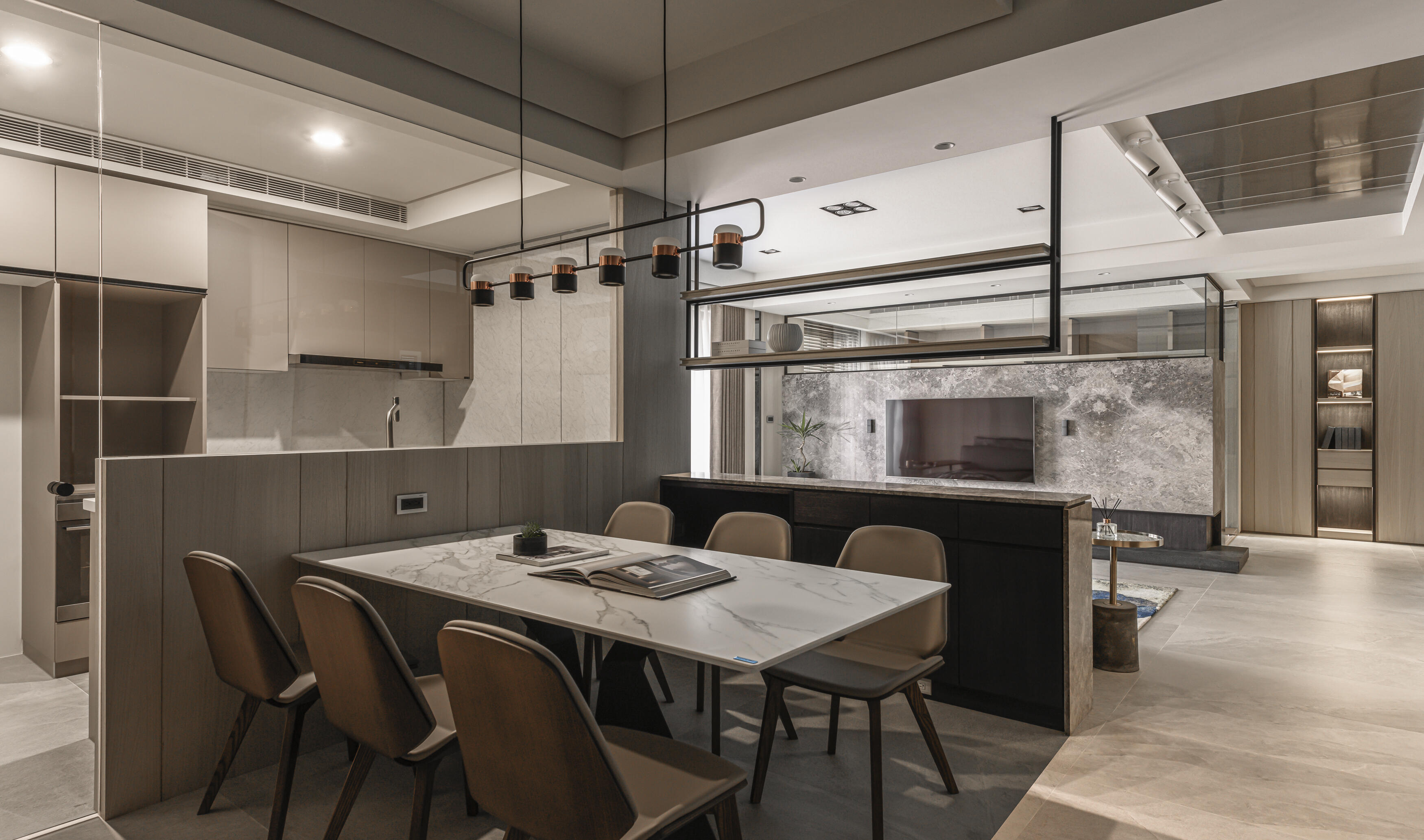 在整體色調上以自然元素為出發,運用大理石與木材的深淺對比,營造出明亮、沉穩且溫潤的氛圍,綴以鈦金屬讓立面多了更豐富的表情,為空間提升整體的精緻感。此外,在收納部分,運用了隱藏工法強化收納機能,將並壁面材質延伸至門片,維持立面視覺的俐落感,讓設計不僅具有功能與實用性,更為空間增添藝術與美感。私密的臥室空間也延伸公共領域的色系,加入鈦金屬腰帶,勾勒出就寢空間的輕奢氛圍,立面使用象徵柔軟織品的布紋板材,增添臥室的閒適氣息。我們認為,設計空間的目的,不僅是為業主一家四口打造溫馨的居所,更是為他們的幸福生活提供舞台。