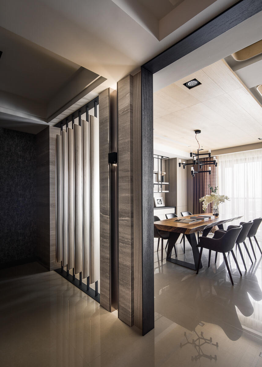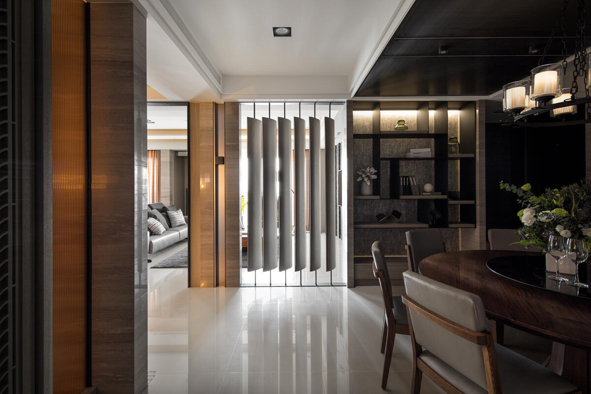 從玄關步入客廳,以鐵件與木作格柵搭配鍍鈦金屬飾邊,讓視線得以隱蔽又穿透,營造出豐富的空間轉折層次,光線經由格柵灑落於餐區與走道,輔以壁燈與間接照明,賦予空間多變的光影氛圍。