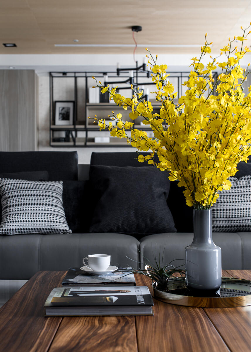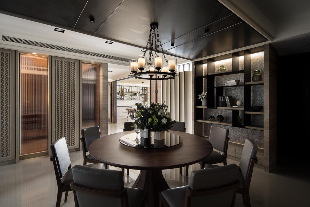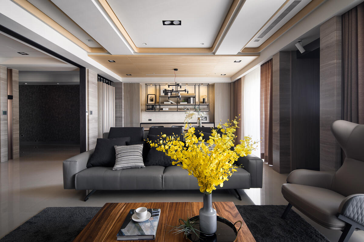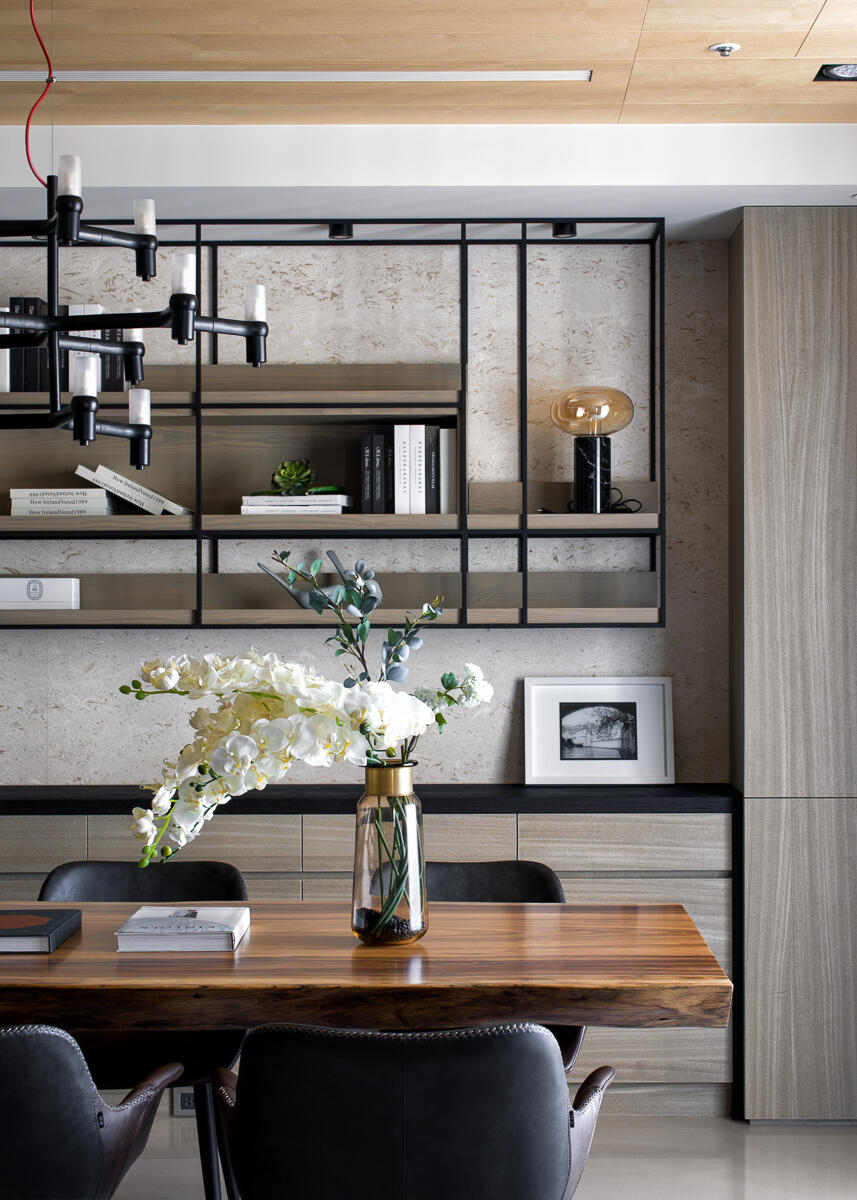 客廳的天花設計亦是巧思所在。為保有挑高感並巧妙隱藏不置中的樑體,天花採格狀錯落的對稱造型,將結構問題化為設計語彙。餐廳則以小吧台連結廚房,並善用鍍鈦金屬、實木建材以簡約線條勾勒出用餐空間的低奢氛圍。