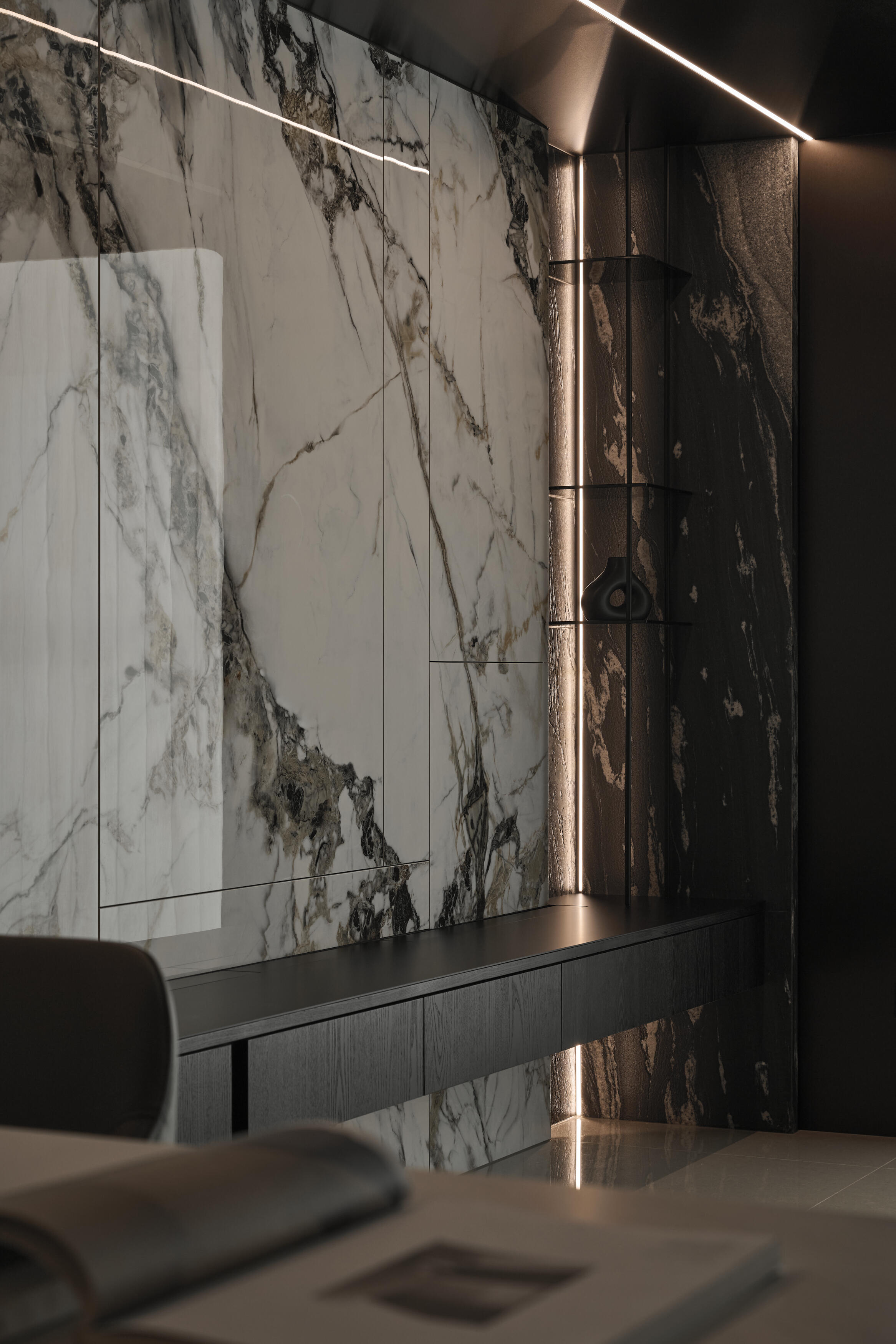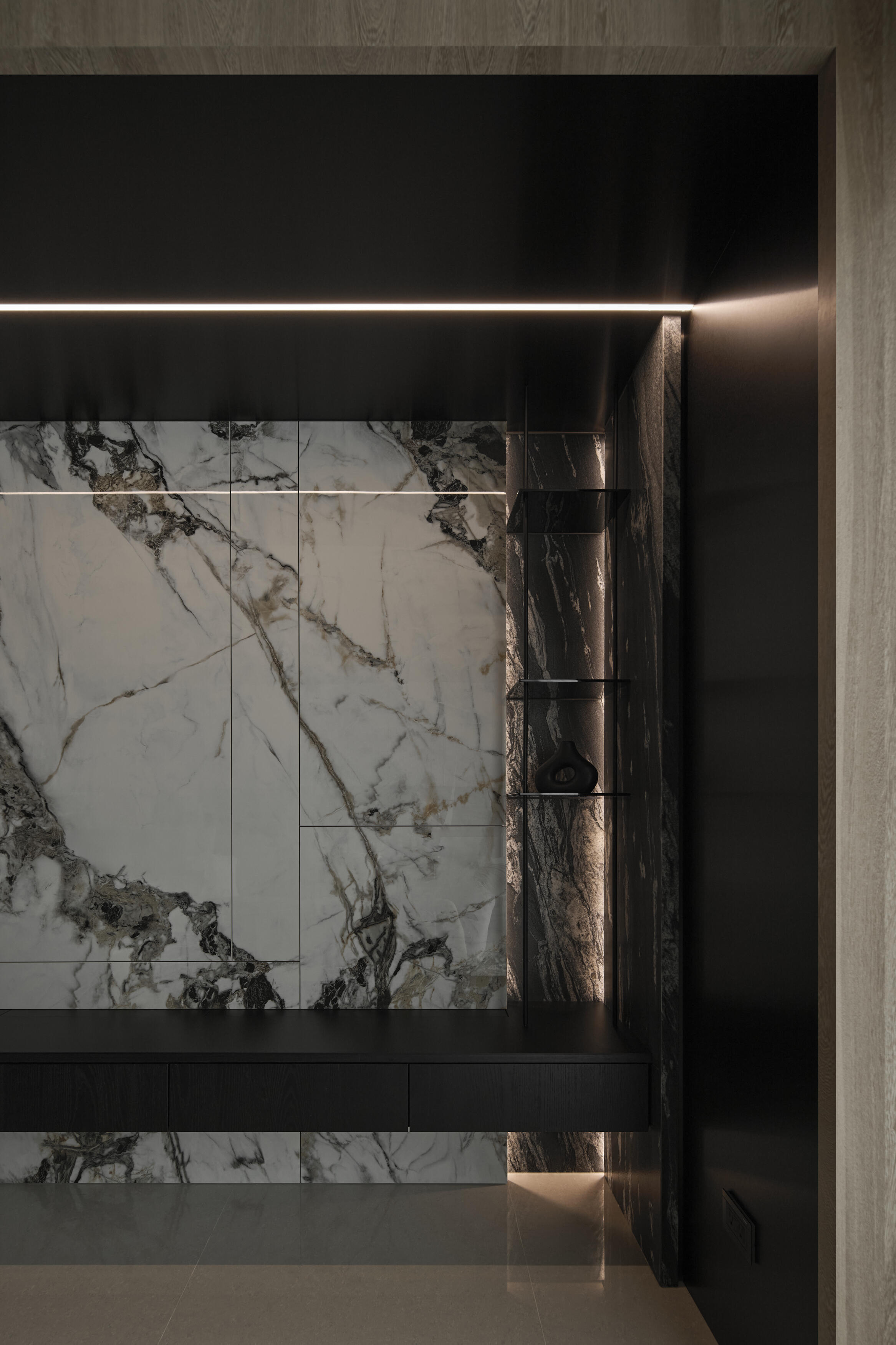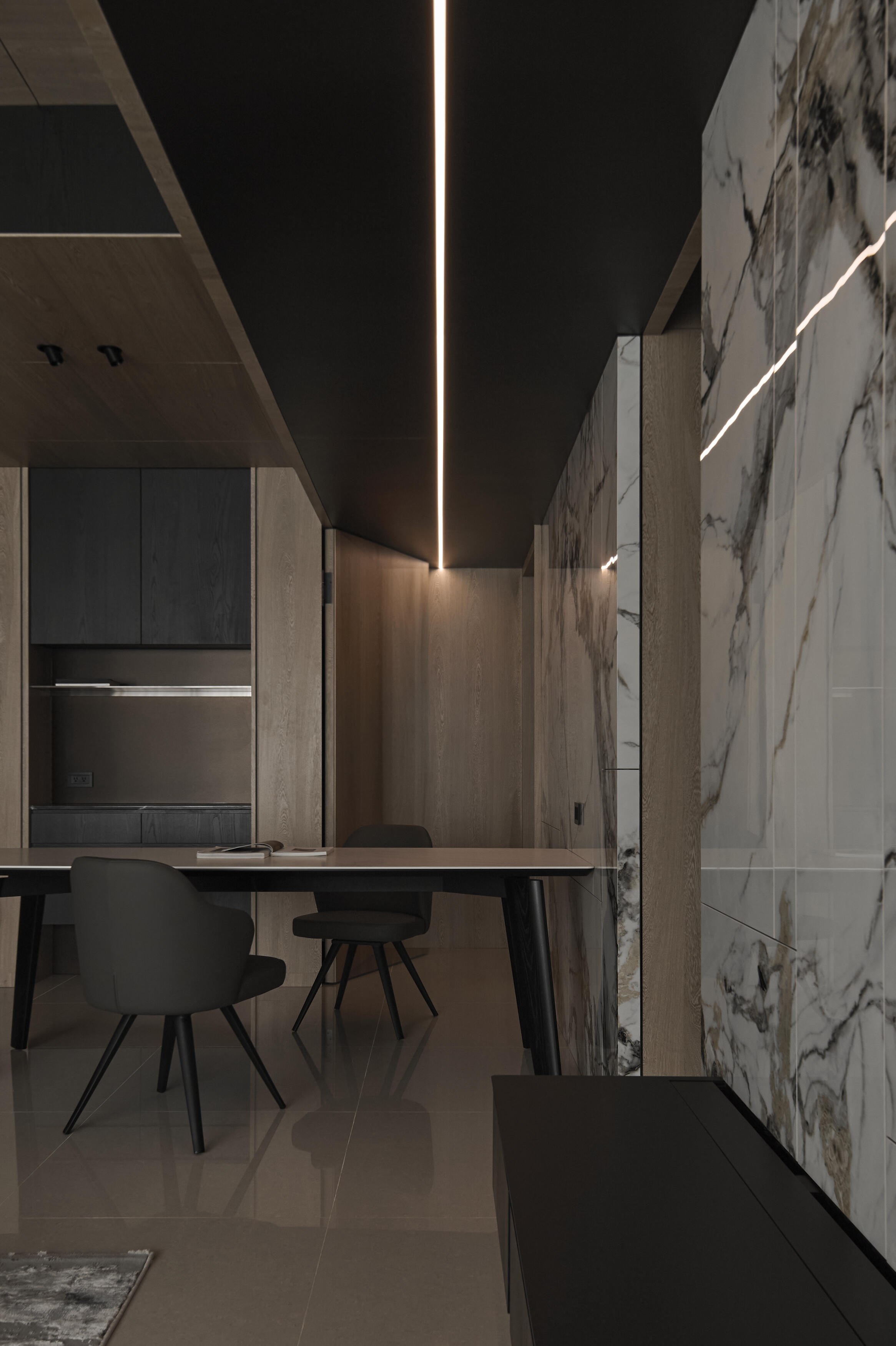 公共空間採開放式設計,立面選擇灰調石材紋理的薄板,錨定空間的主視覺,為場域增添個性,透過分割與排列等手法,以工藝與設計豐富立面表情,同時串聯客餐廳的空間,並使視覺向外延伸,讓公領域顯得更加寬闊。